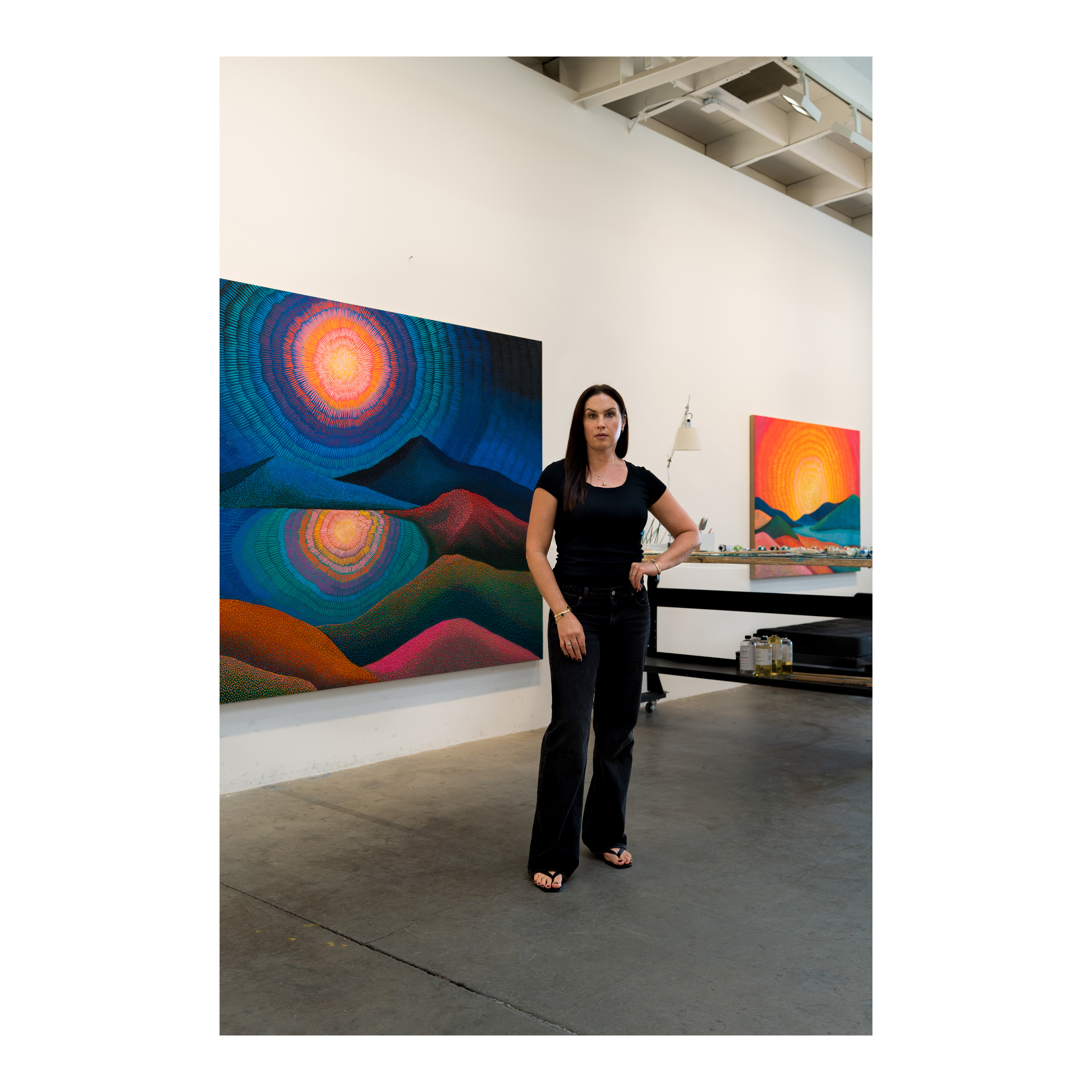 Jennifer Guidi’s work is an in-depth exploration of ritual and the passing of time. Known for mixing sand into her paints and creating mandala-like patterns in her compositions, Guidi’s artwork radiates with light, color and energy. Guidi meticulously incorporates pointillist dots, brilliant color gradients, and textured layers to create imagined landscapes that are inspired by both the natural and spiritual world.