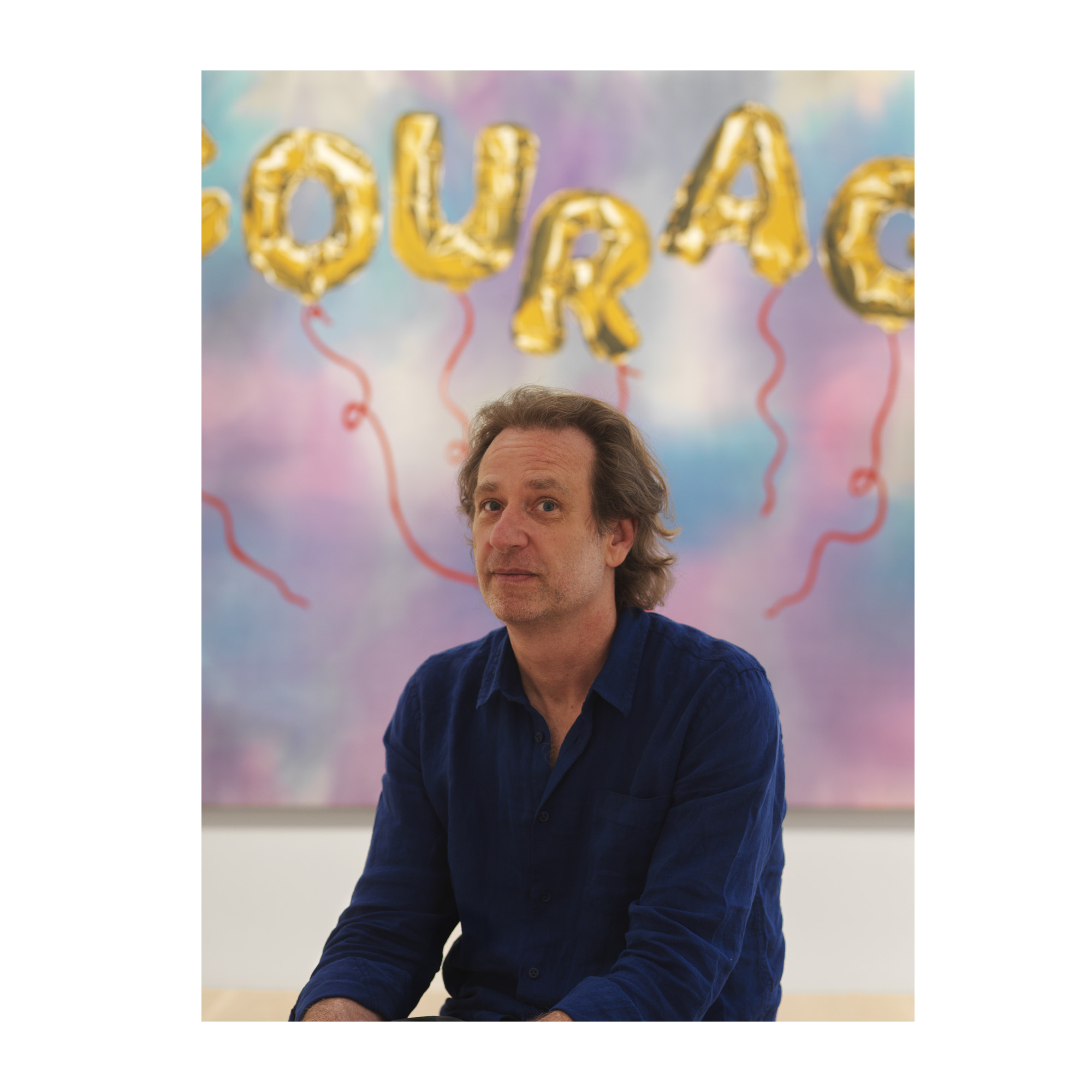 Deploying words and images, Joel Mesler draws from childhood memories and life experiences to create paintings that meld his private impressions with cultural touchstones. Often evoking his youth in 1980s Los Angeles, his signature artistic style is characterized by bold colors, stylized patterns, bright figuration, and unique calligraphic scripts. Calling to mind diverse influences—from the imagined jungles of Henri Rousseau to forms found in 20th-century decorative arts—Mesler’s canvases offer a wry, vulnerable examination of the place where personal and popular iconography convene. Events in the artist’s life, both joys and personal traumas, form his greatest artistic inspiration. The motifs he employs recall his upbringing in Southern California—such as the patterned banana leaf wallpaper of the Beverly Hills Hotel, swimming pools, beach balls, balloons, disco balls, and donuts. His visually polished works undergird his connection to the legacy of Pop art, while his use of text places him in a lineage of artists including Ed Ruscha and Christopher Wool.