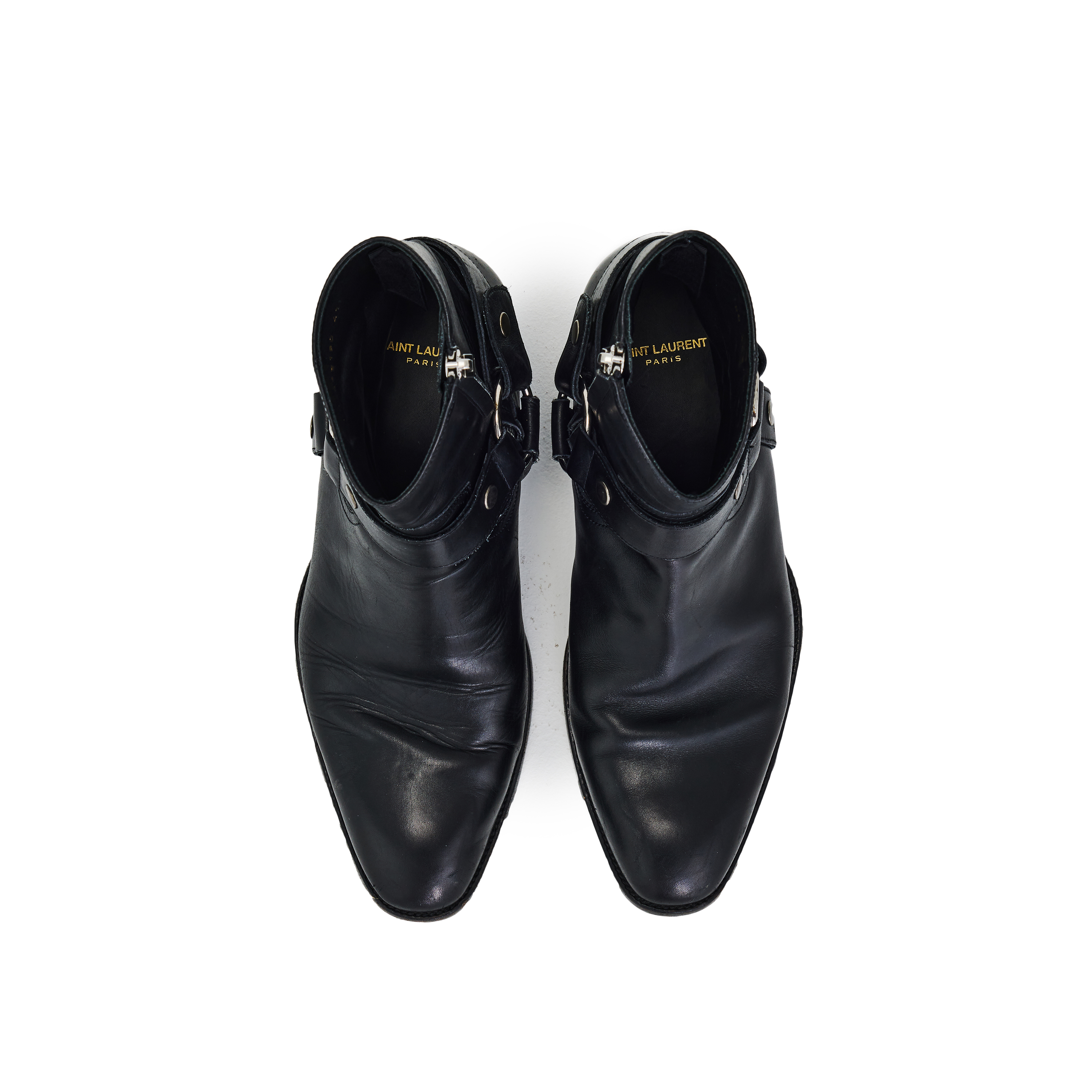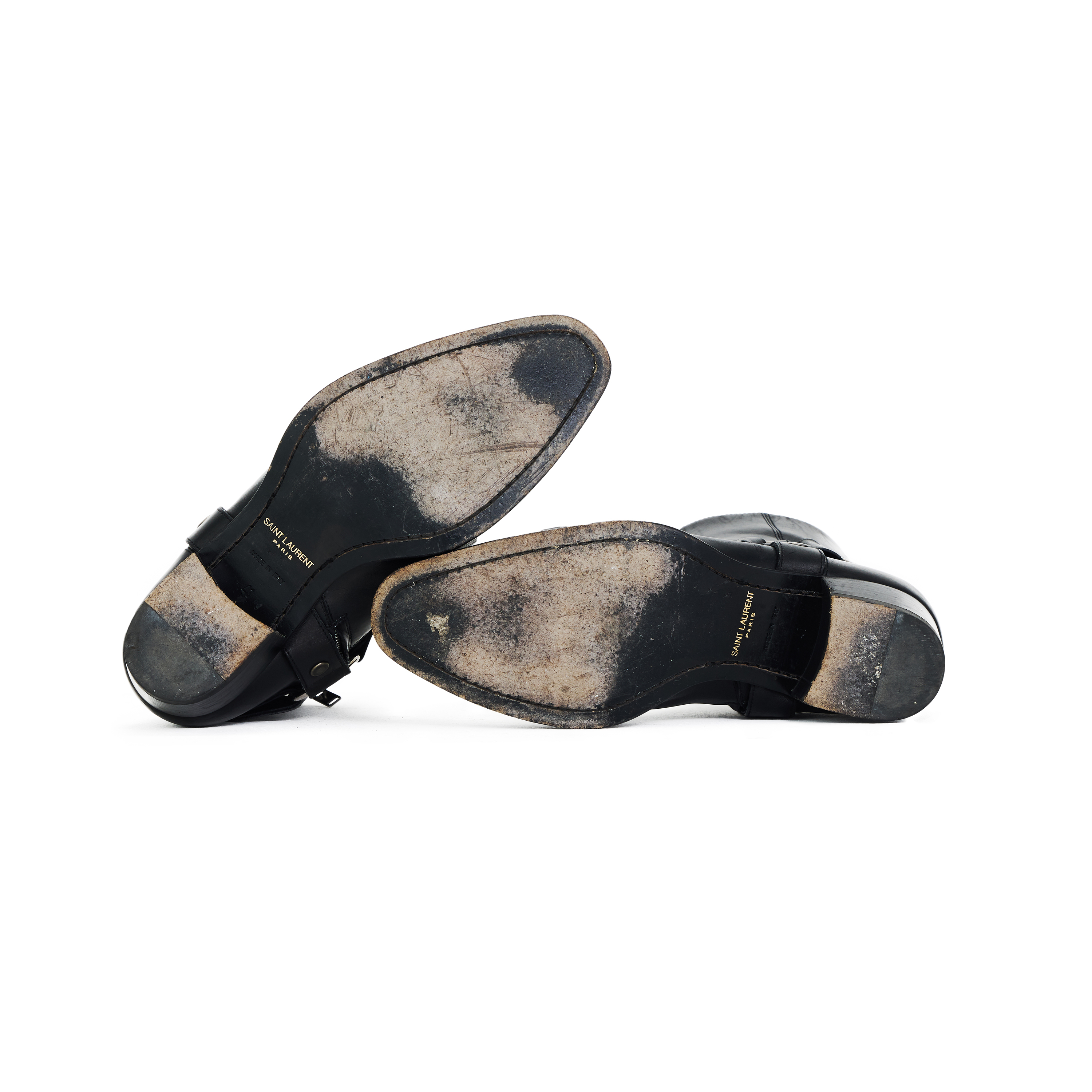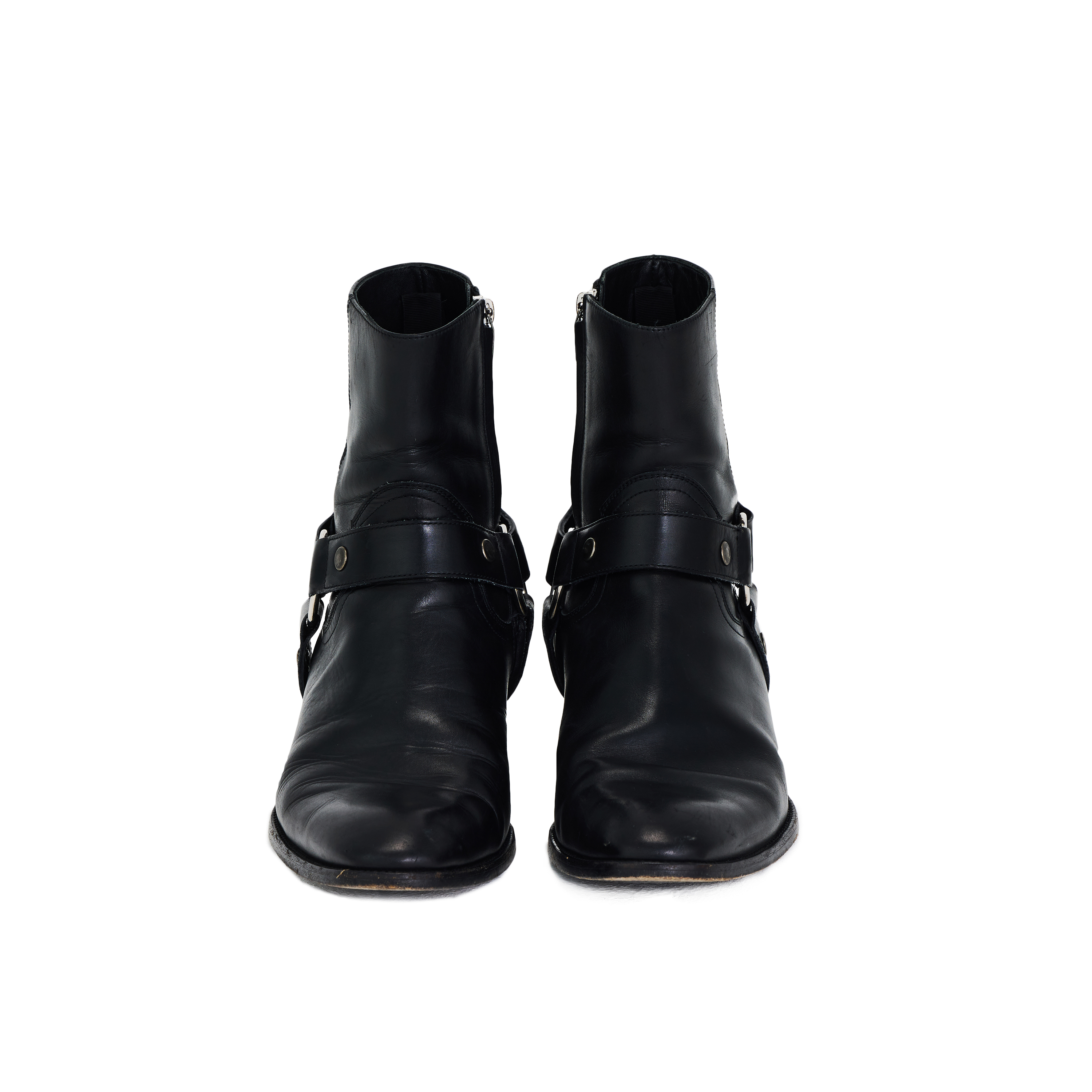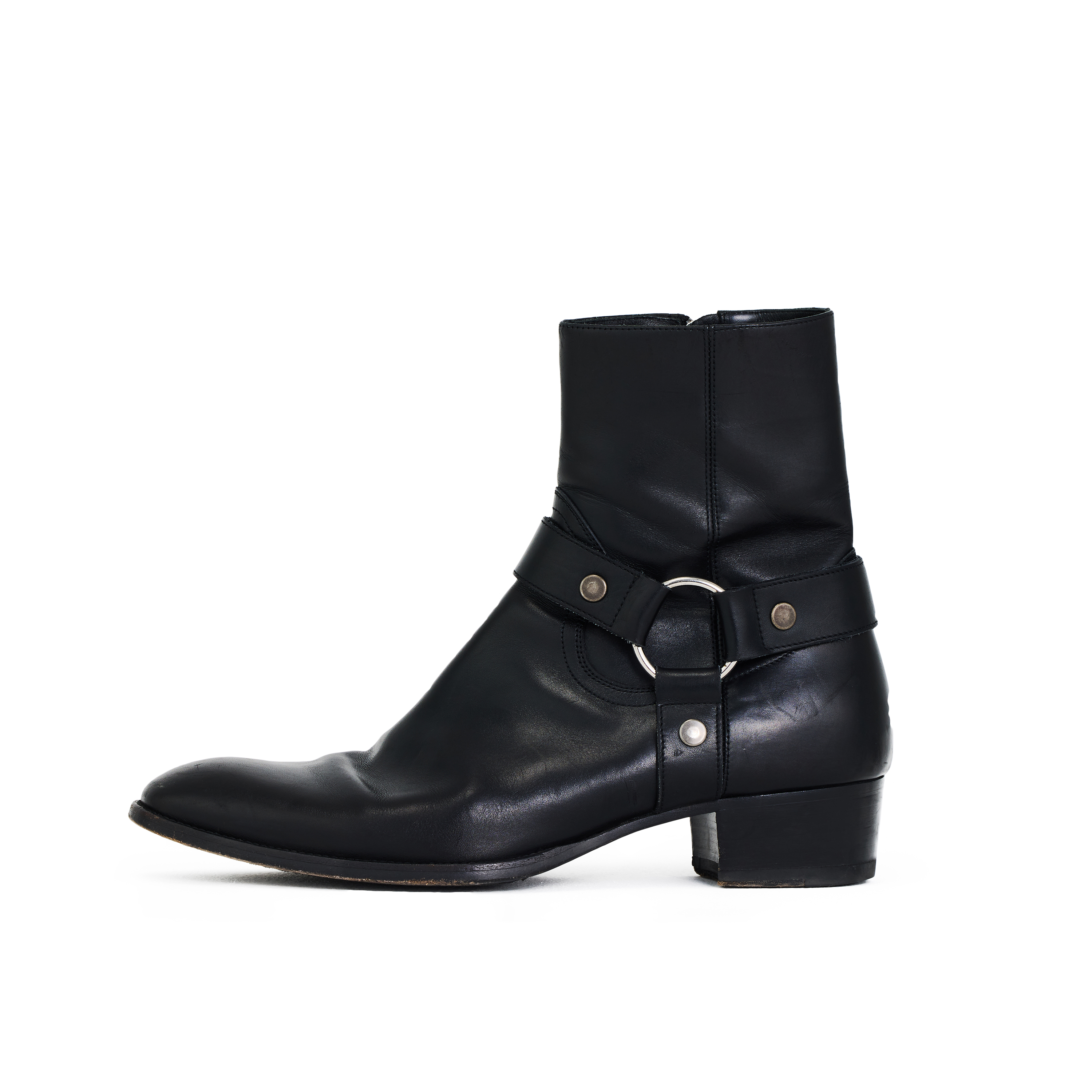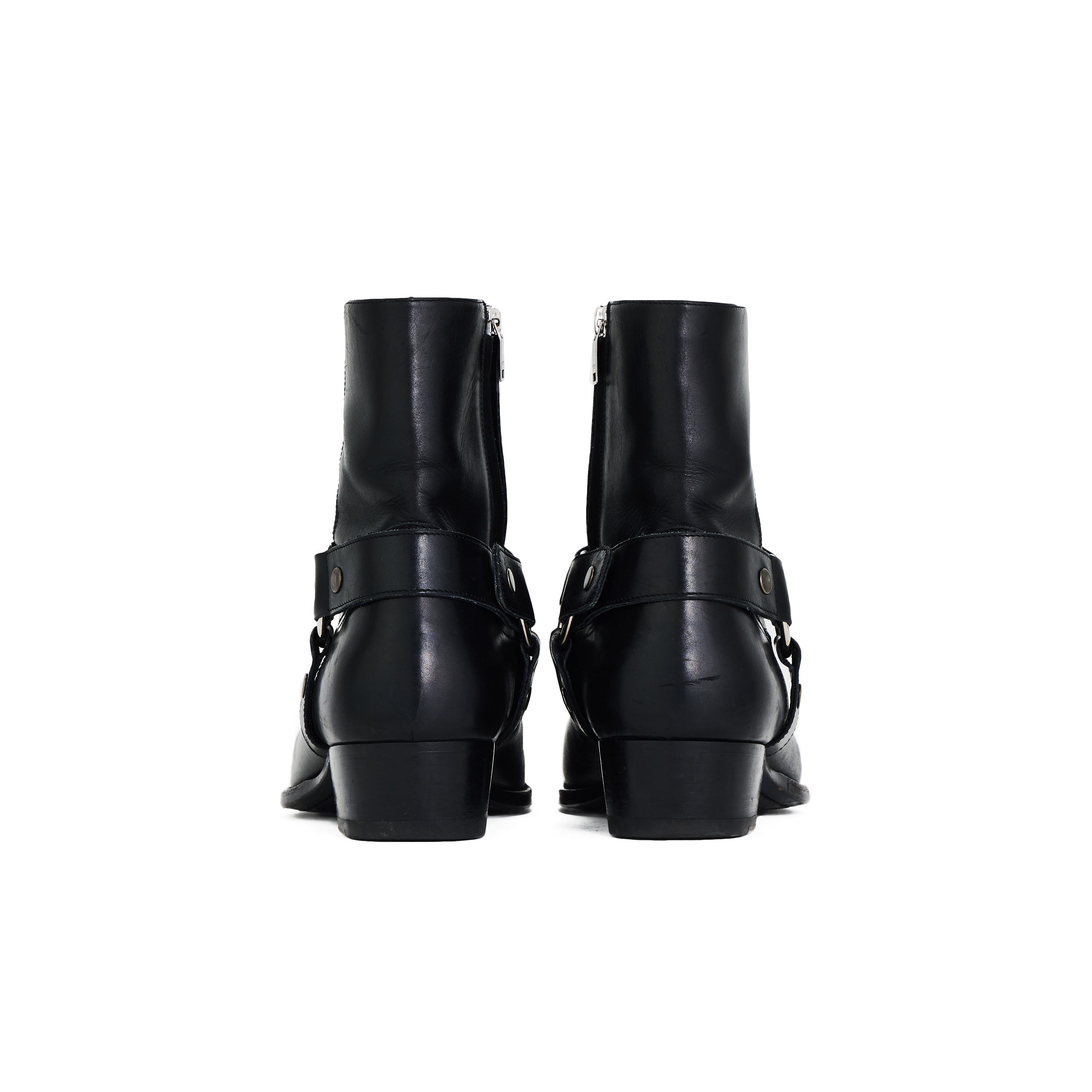 This pair of Saint Laurent Wyatt Harness Boots in supple black leather are distinguished by their elongated silhouette, pointed toe, and the house’s iconic harness strap. First introduced as part of Hedi Slimane’s vision for Saint Laurent, the Wyatt has since become a modern classic that is synonymous with rock-inspired sophistication and Parisian edge.