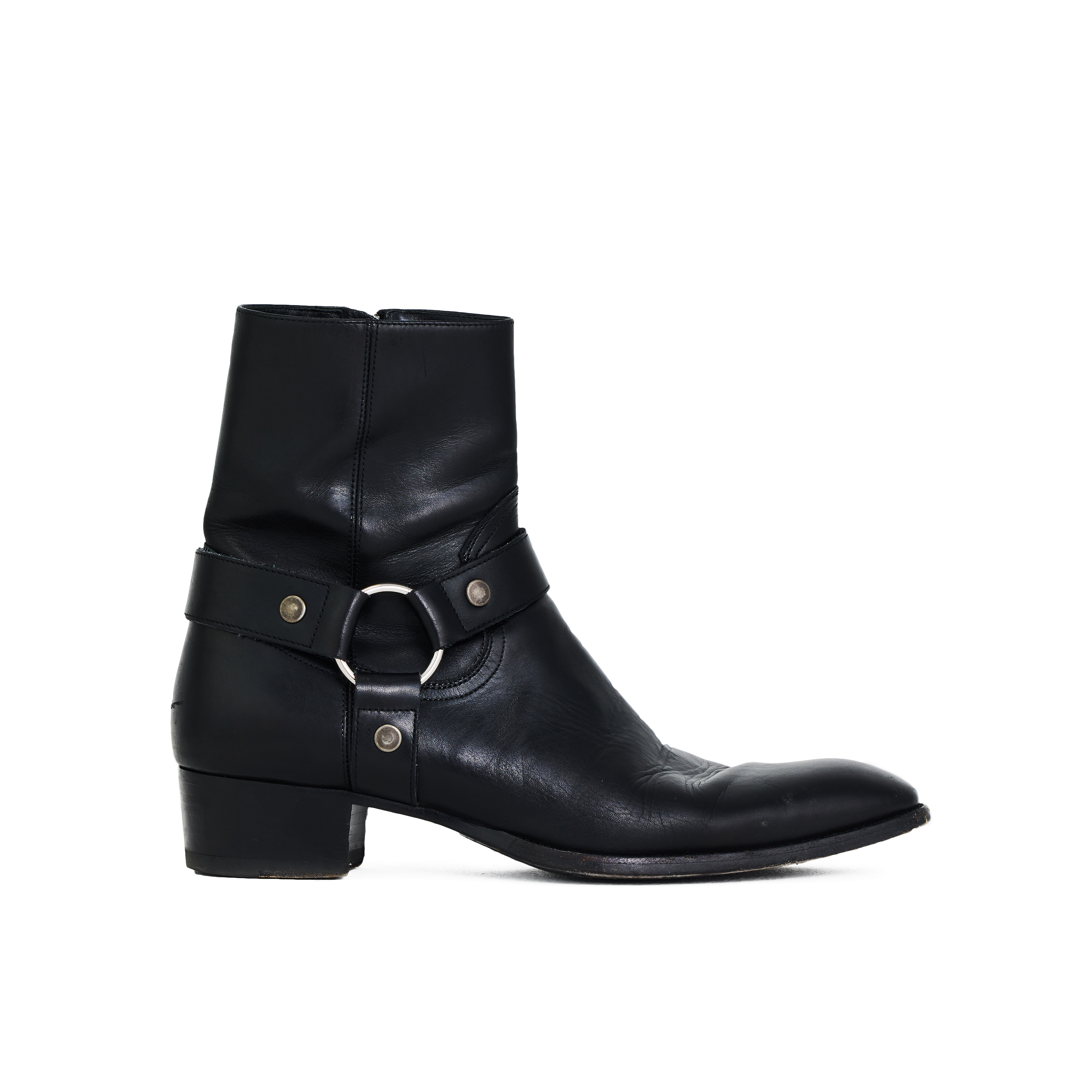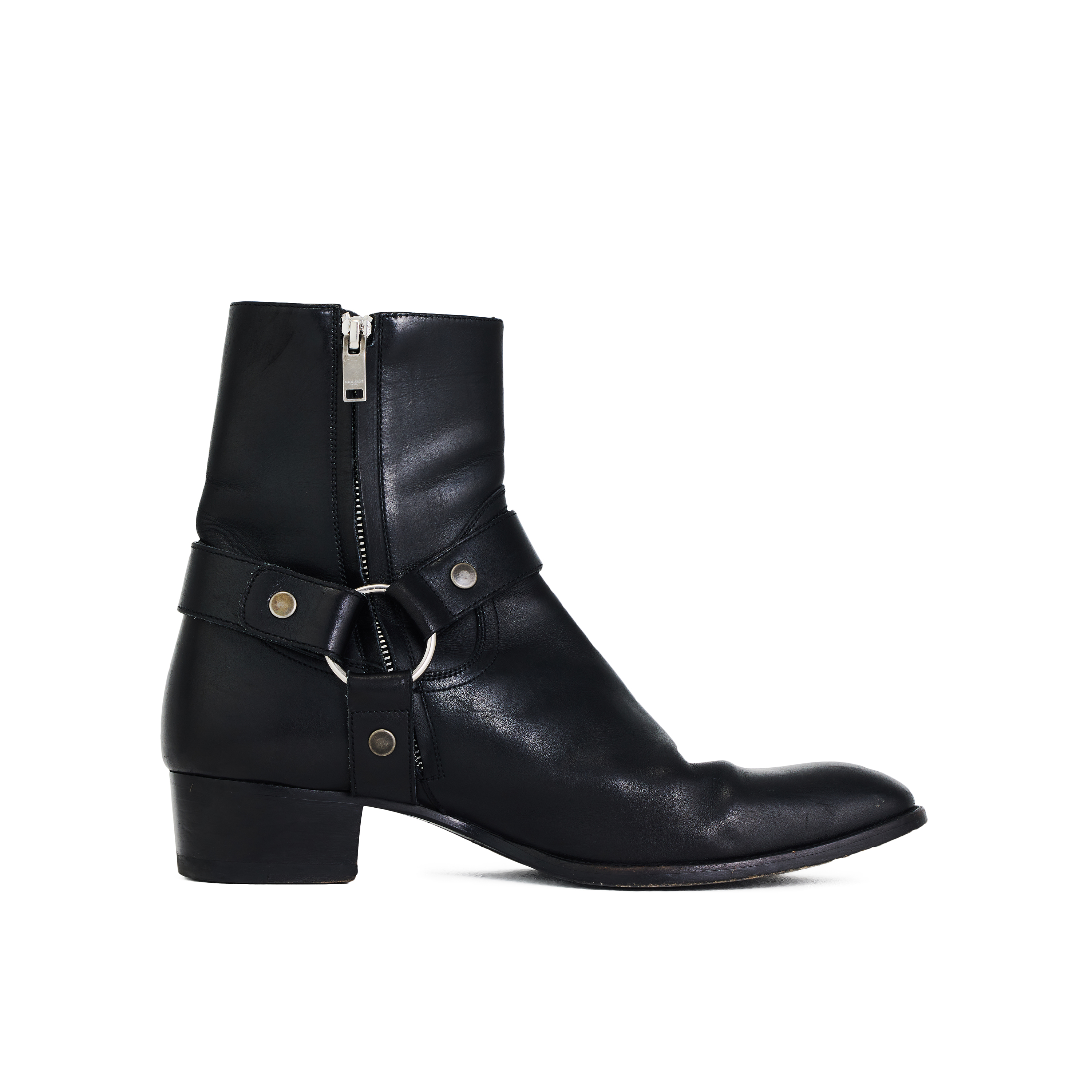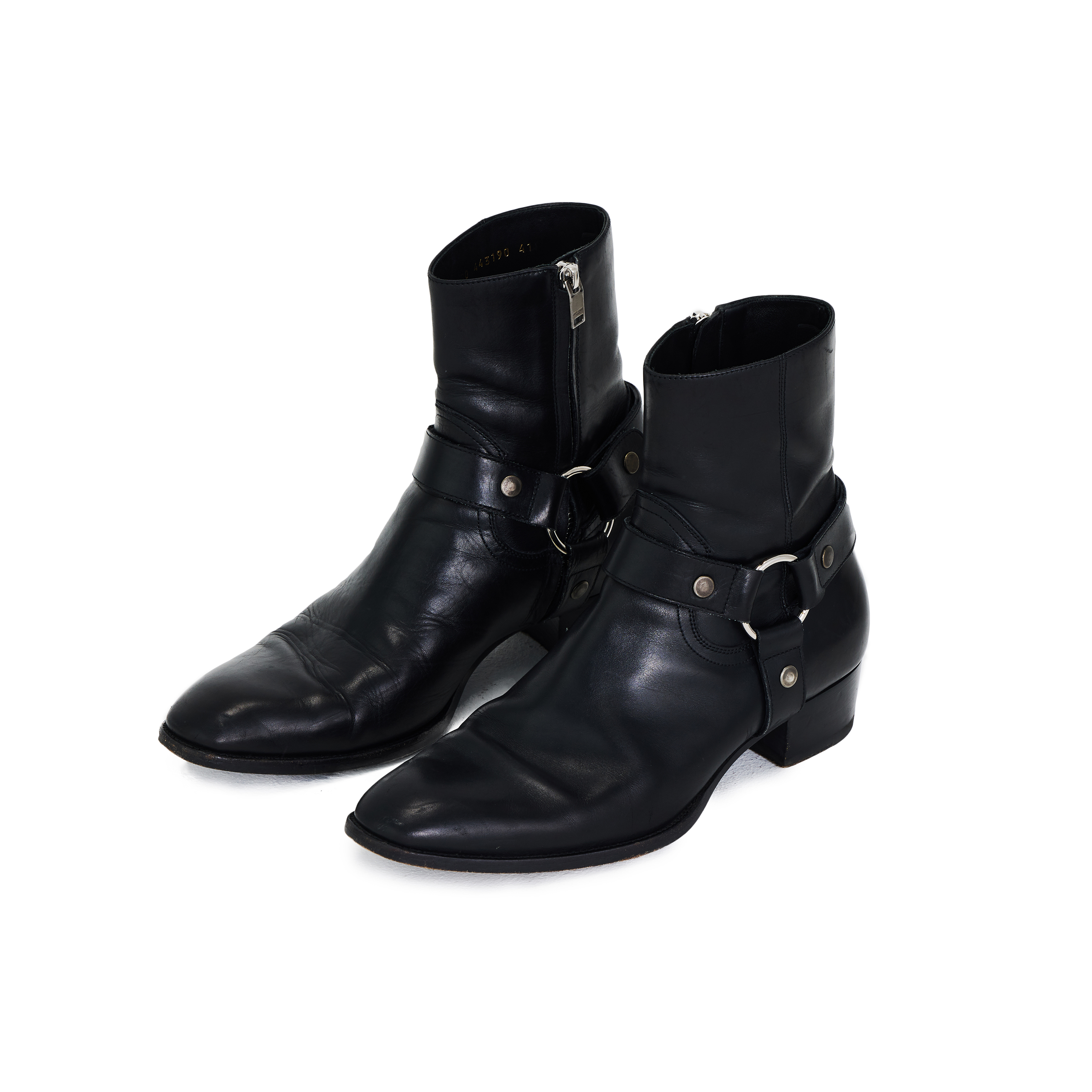부드러운 블랙 가죽 소재의 생 로랑 와이엇 하네스 부츠(Saint Laurent Wyatt Harness Boots)는 부드러운 블랙 가죽으로 제작되었으며, 길쭉한 실루엣, 뾰족한 토, 패션 하우스의 아이코닉한 하네스 스트랩이 특징입니다. 헤디 슬리메인(Hedi Slimane)이 생 로랑을 위해 처음 선보인 Wyatt 부츠는 록의 영감이 어린 세련됨과 파리 감성의 엣지를 상징하는 현대적인 클래식 아이템으로 자리 잡았습니다.