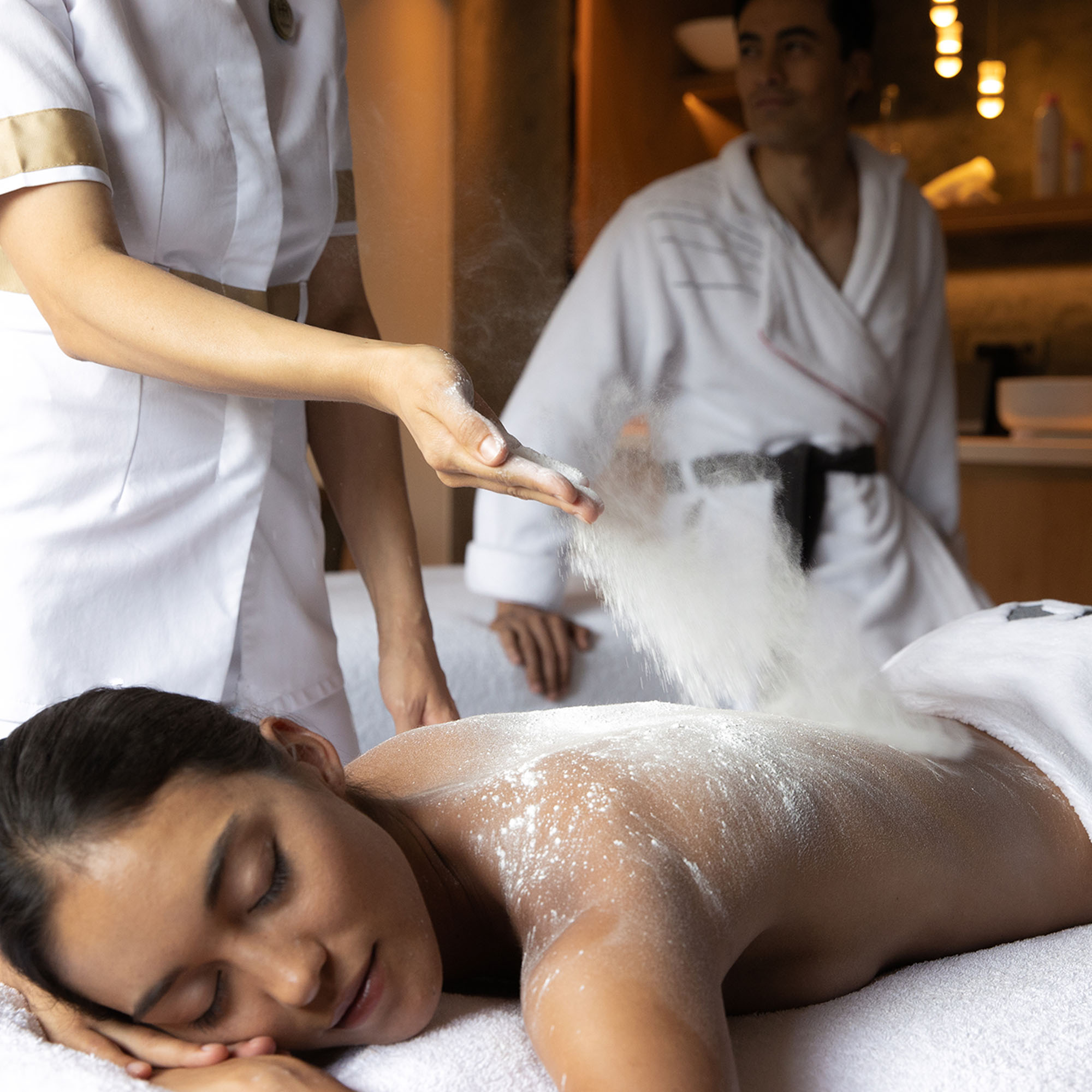 A full 100 minutes, this bespoke therapy begins with a restorative steam room session, followed by a softening foot bath and gentle pumice stone foot massage. Then, the essence of the experience unfolds: a one-of-a-kind body massage performed with this silky, mineral powder. Its smooth texture allows for deep, flowing movements that blend Western techniques, muscle kneading, and stretching. The result is a profound sense of balance, relief from joint discomfort, and the incomparable sensation of softness and purity against the skin. Le Minéral is more than a massage, it is an immersion into evian®SPA well-being, a delicate harmony between precision, purity, and serenity.