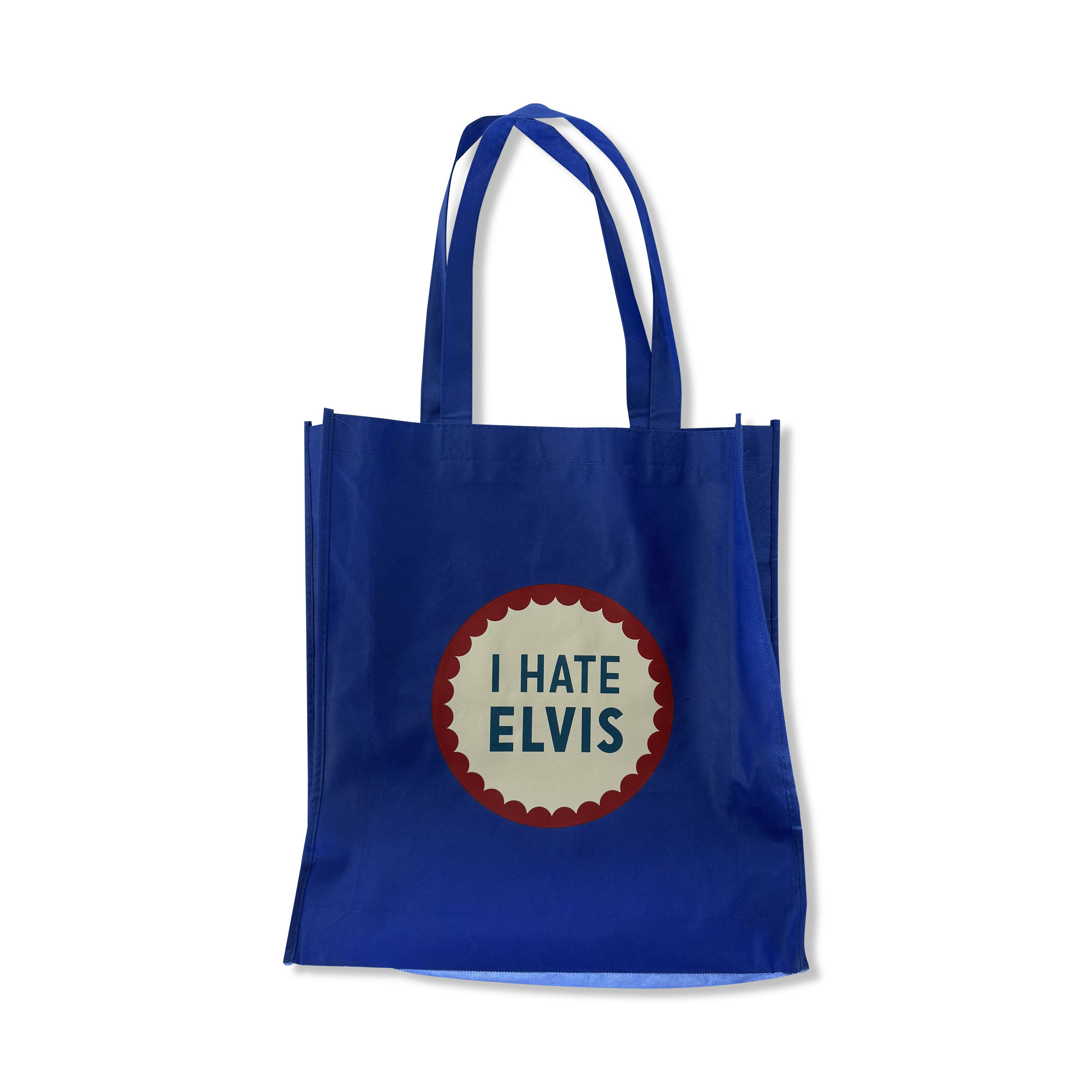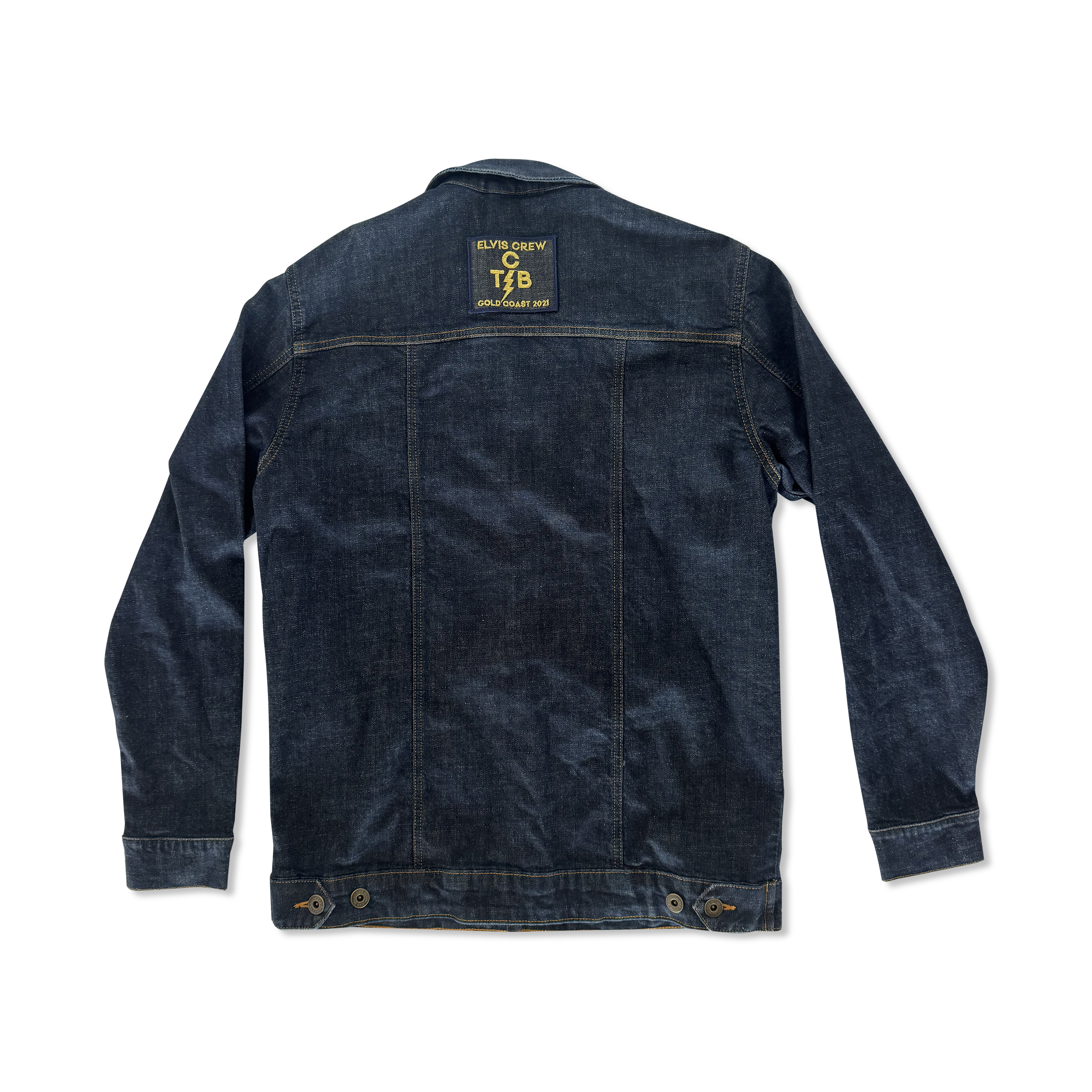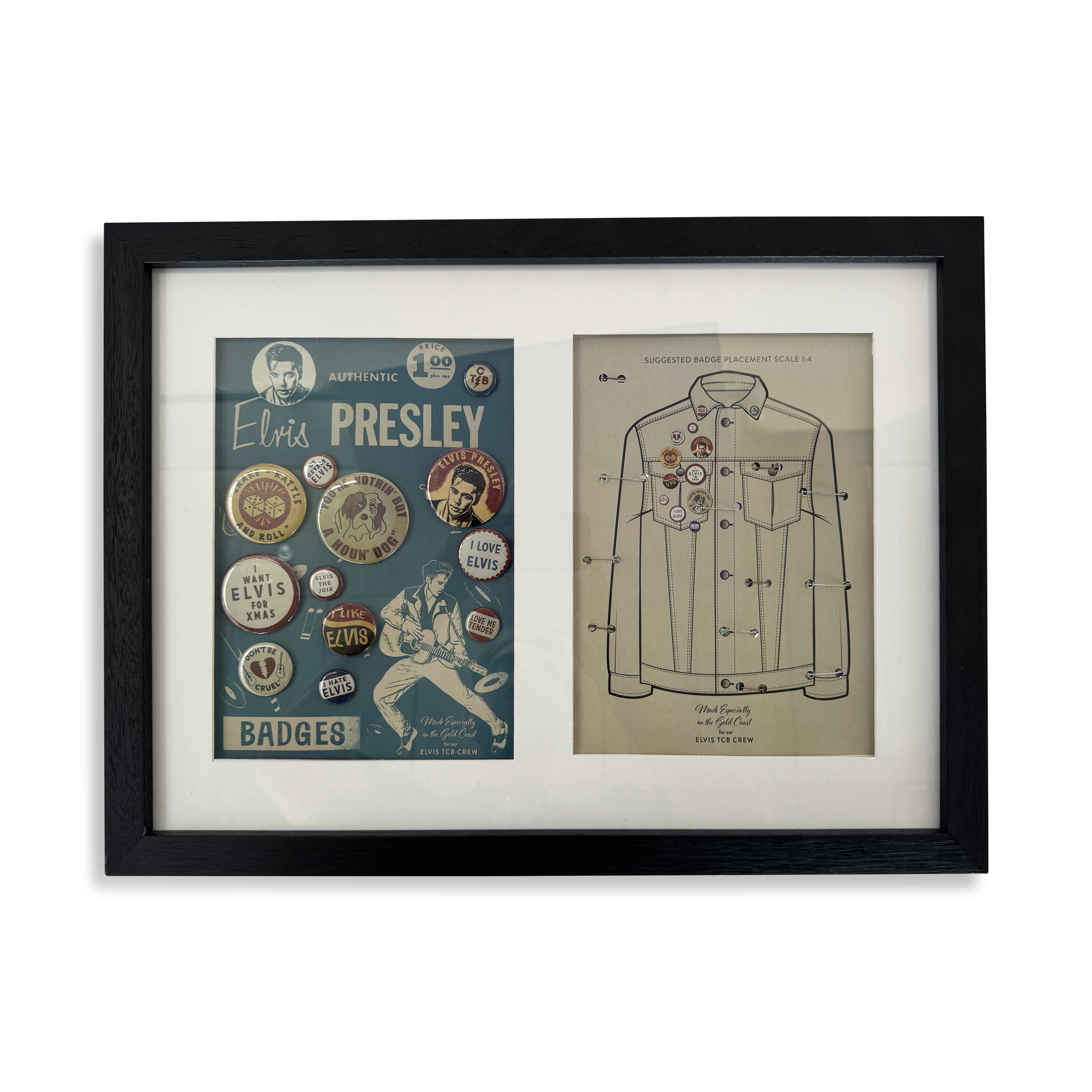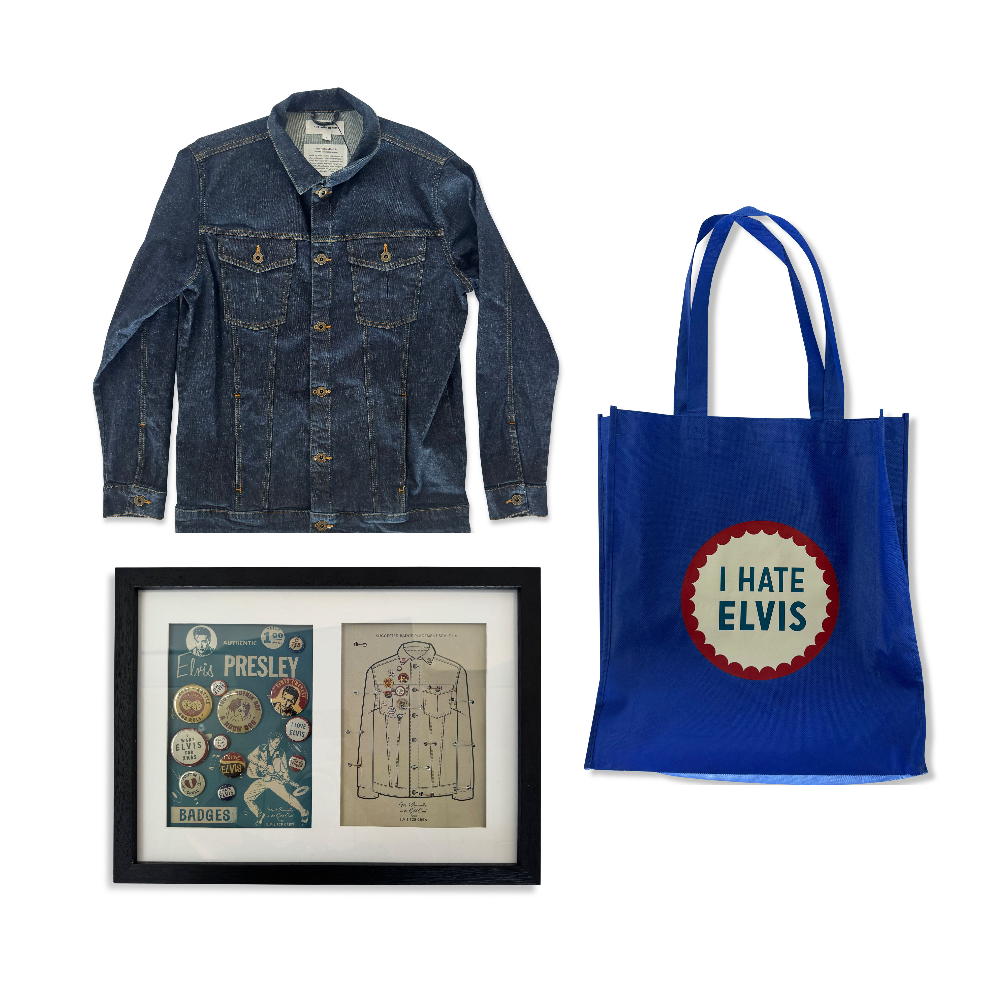 A collection of exclusive crew gifts from the production of Baz Luhrmann’s Elvis (2022), comprised of custom-designed pins, a bespoke Outland denim jacket, and a tote bag. The denim jacket bears a patch on the reverse embroidered with “Elvis Crew Gold Coast 2021” encircling the iconic “TCB” logo. The set of custom pins is accompanied by a diagram suggesting their placement on the jacket, while the blue tote features the tongue-in-cheek slogan “I Hate Elvis.”