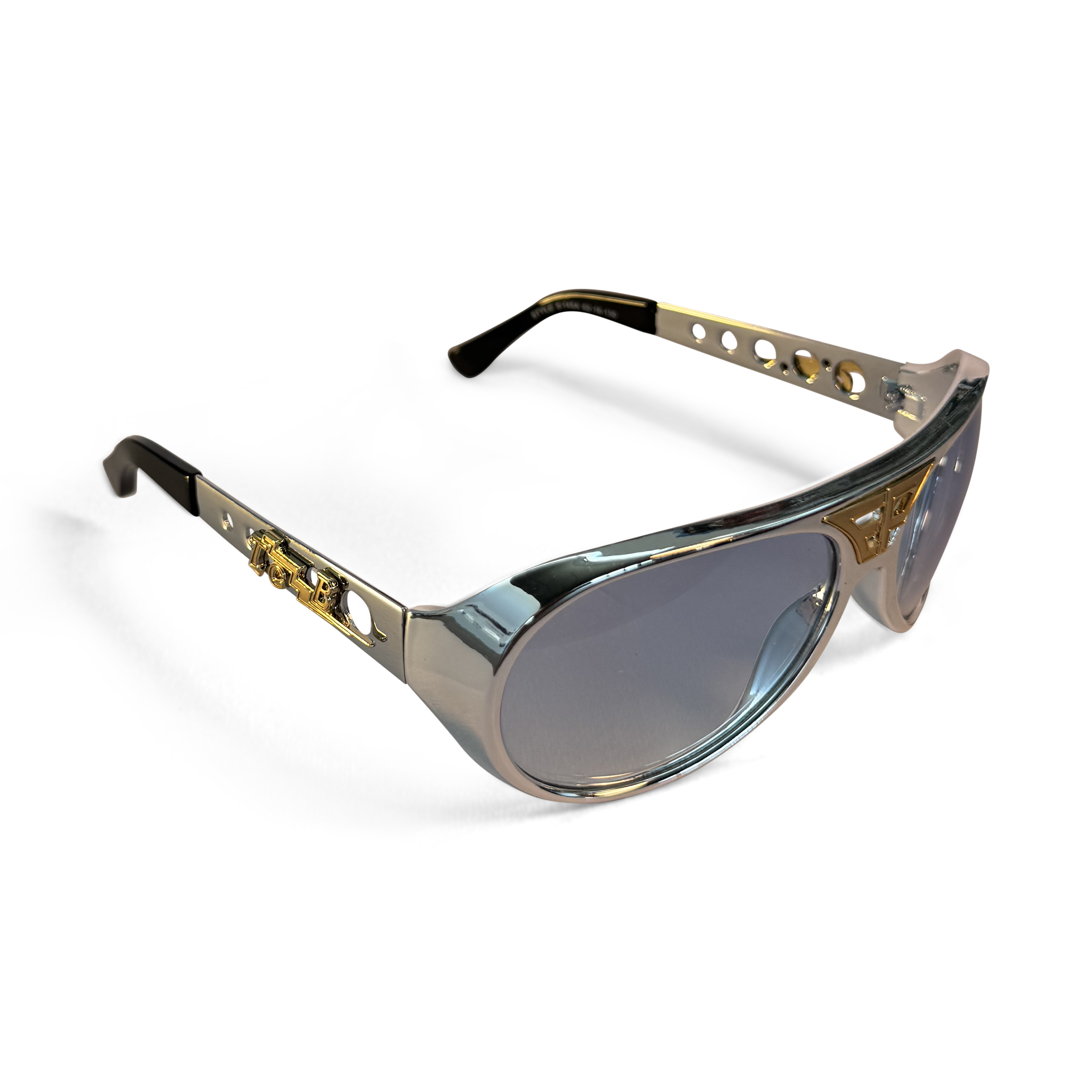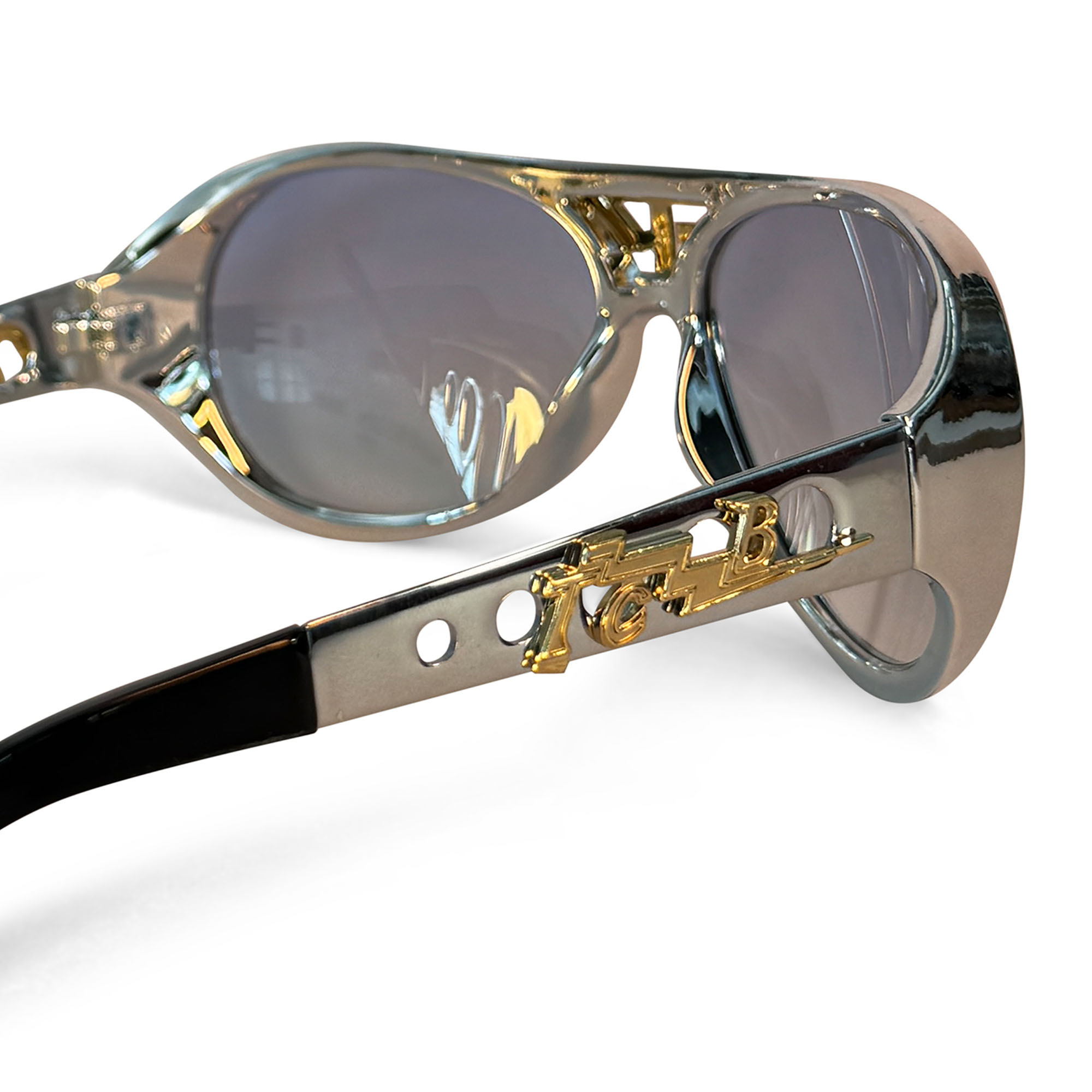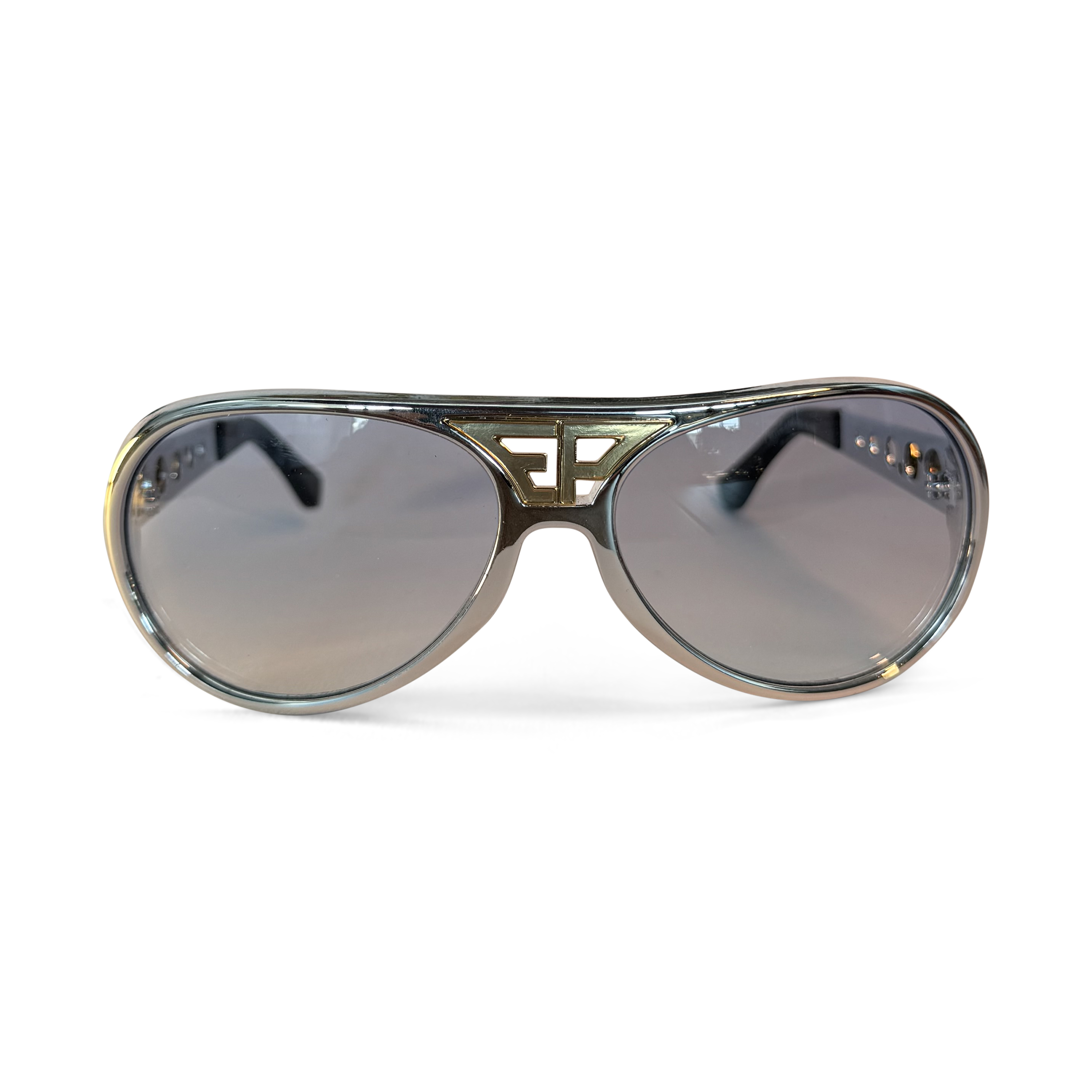 This distinctive pair of sunglasses was created for Austin Butler in his Academy Award–nominated portrayal of Elvis Presley in Baz Luhrmann’s Elvis (2022). Featuring a gold-toned “EP” monogram at the bridge, silver-toned frames, and temples accented with circular cut-outs, the glasses evoke Elvis’s signature style while reflecting the meticulous costume design overseen by Catherine Martin. Both a striking accessory and a significant cinematic artifact, they embody the artistry and detail that brought the King’s world vividly to life on screen.