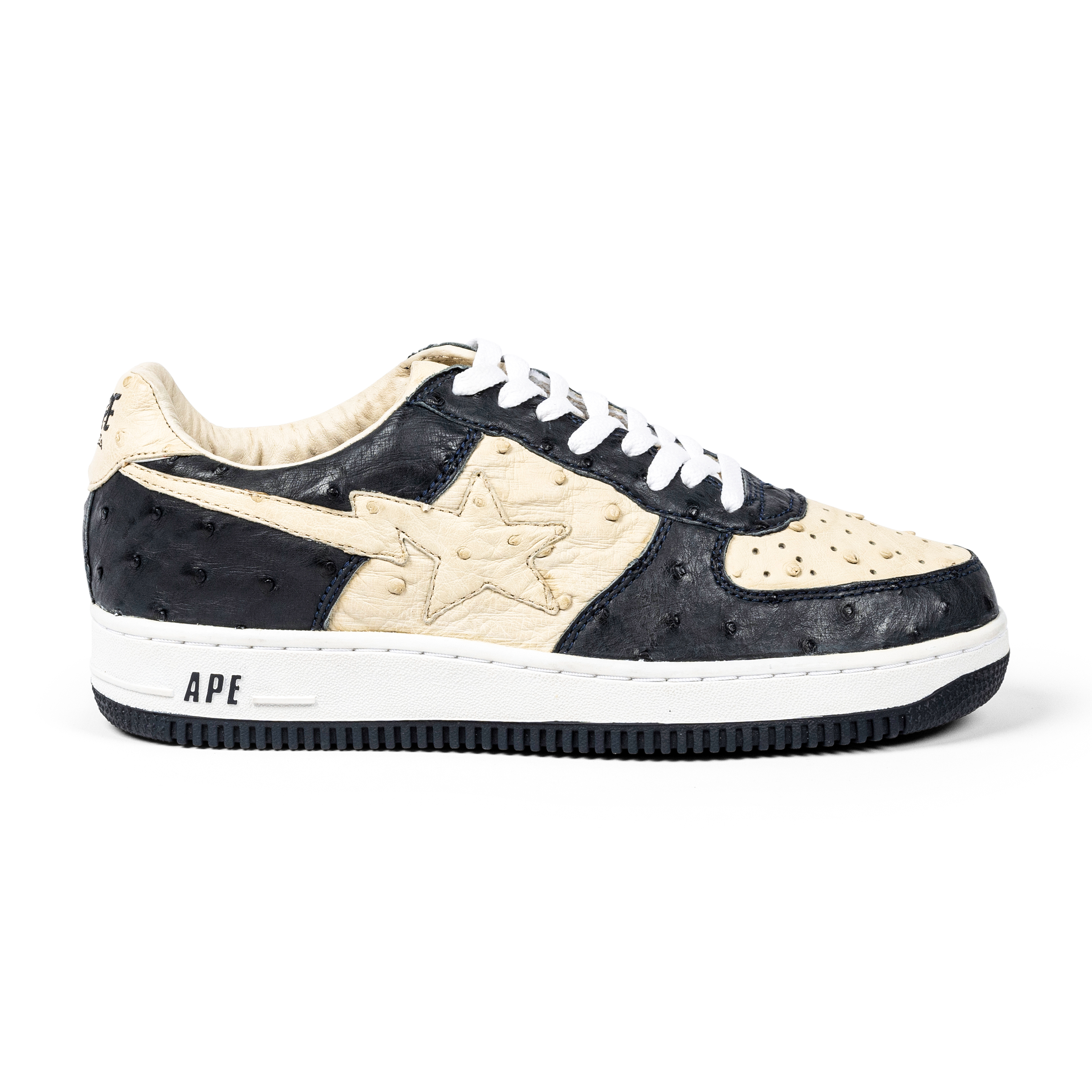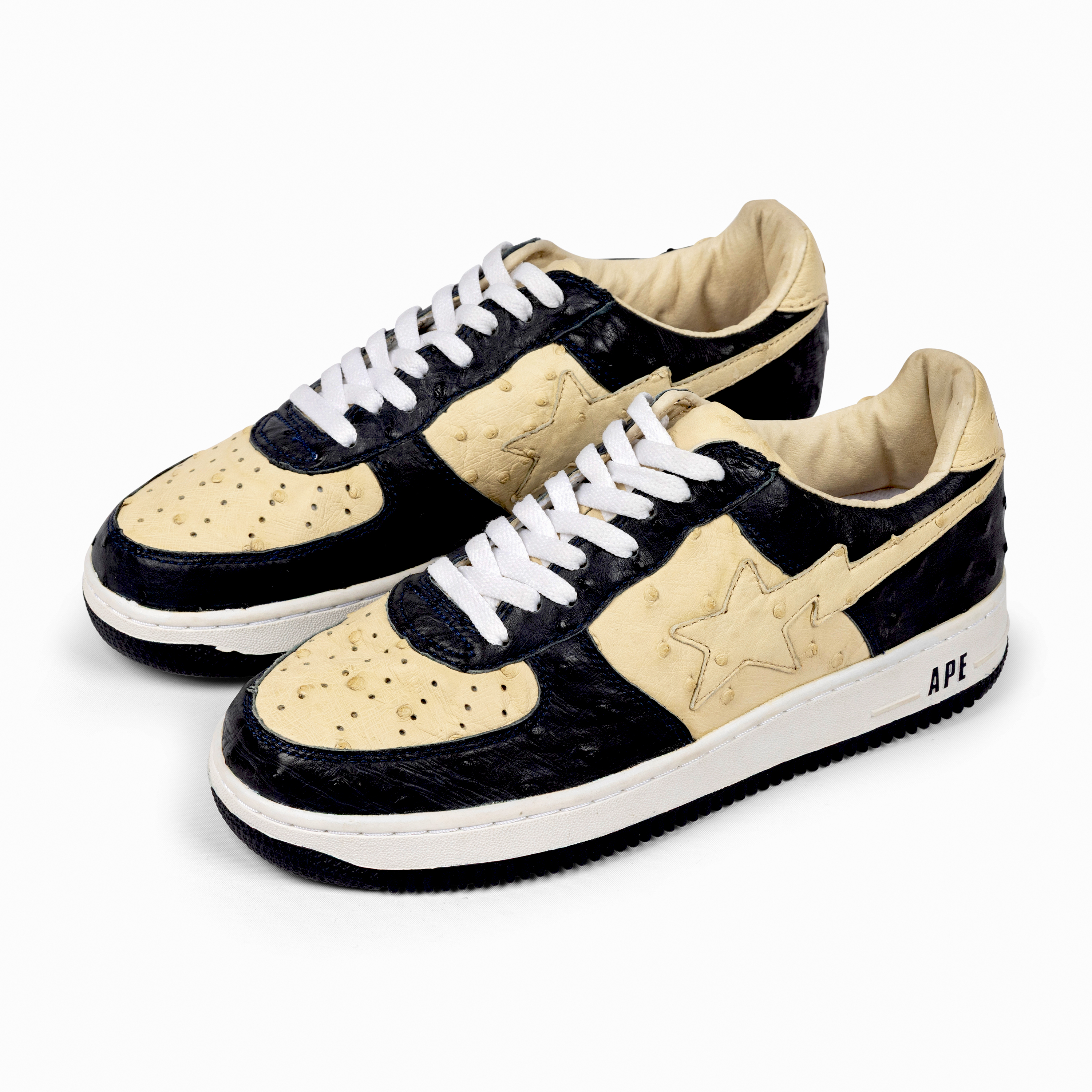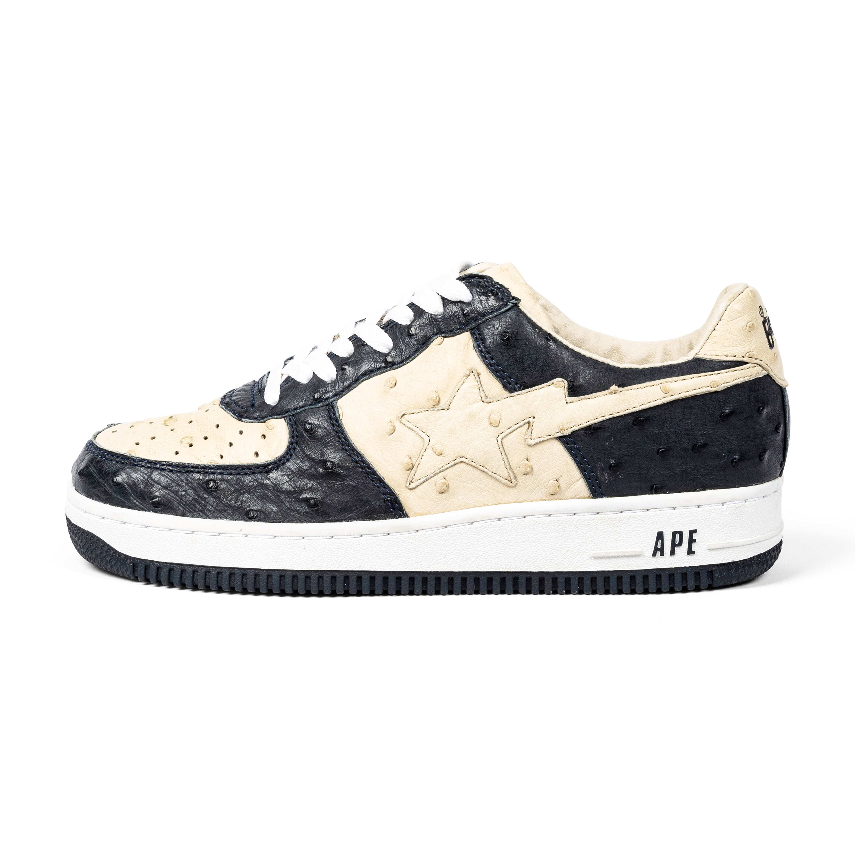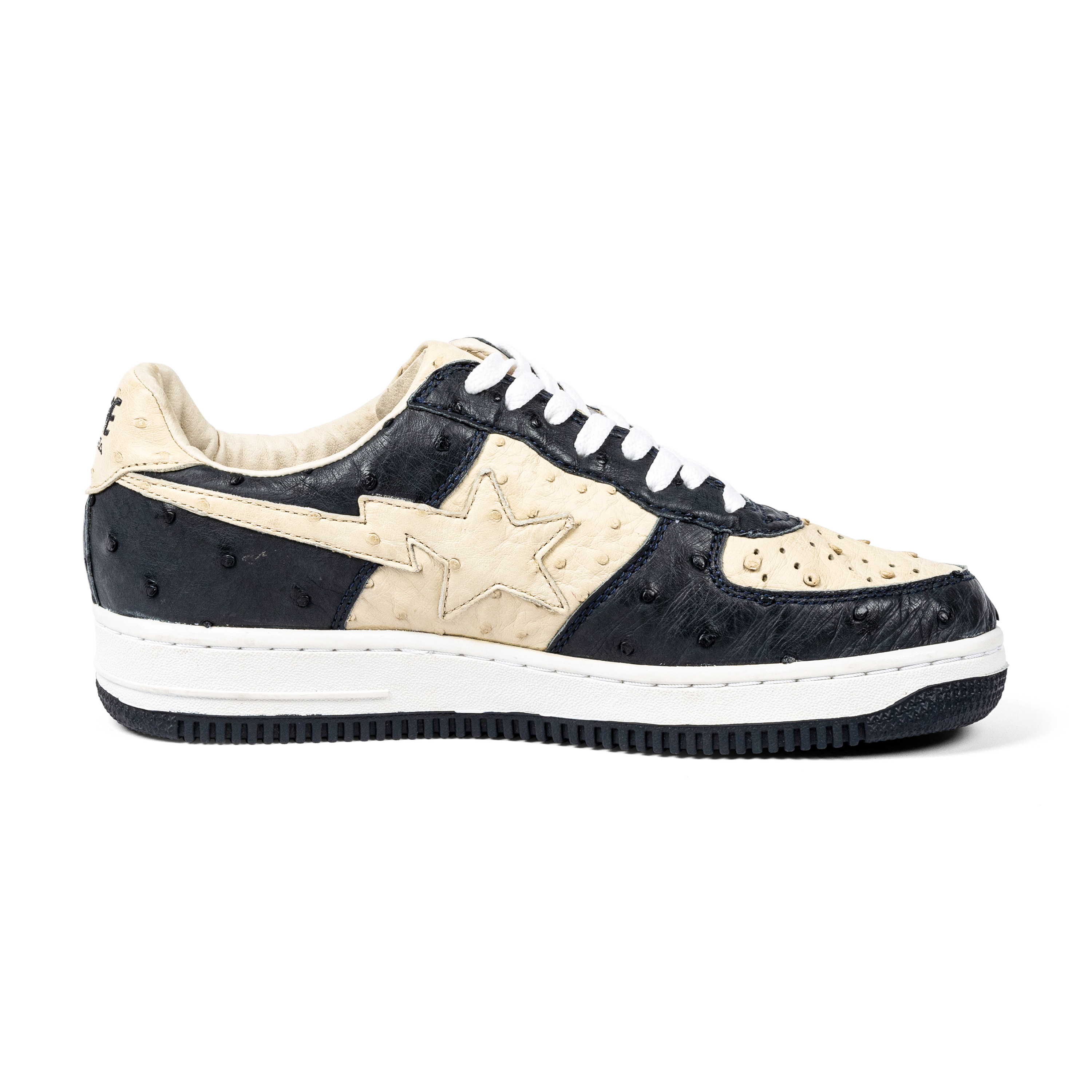 This pair features faux ostrich leather uppers in beige and navy with matching beige star logos—an unmistakable combination that embodies early-2000s street luxury. The materials and playful palette highlight Nigo’s innovative approach to blending pop culture, music, and fashion.