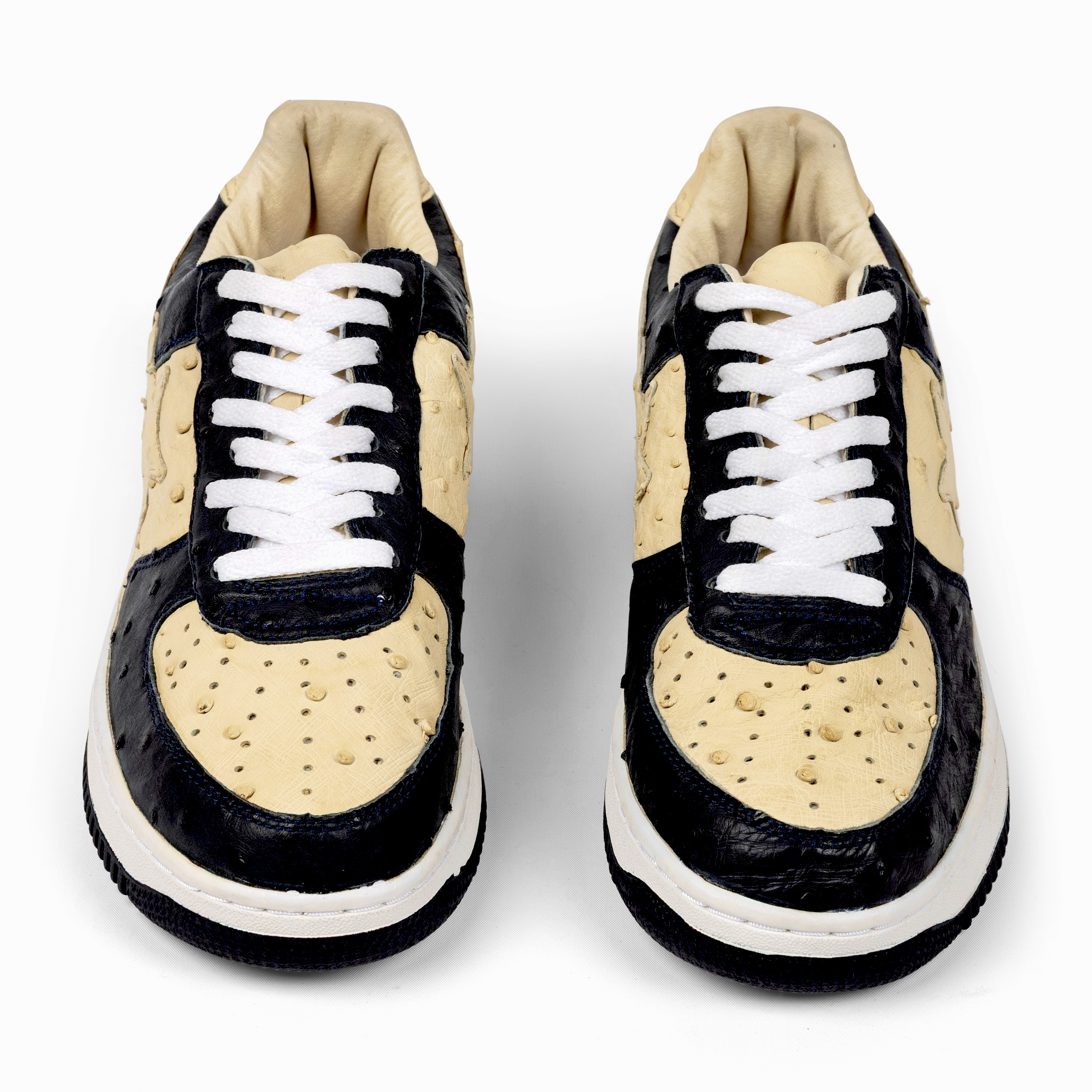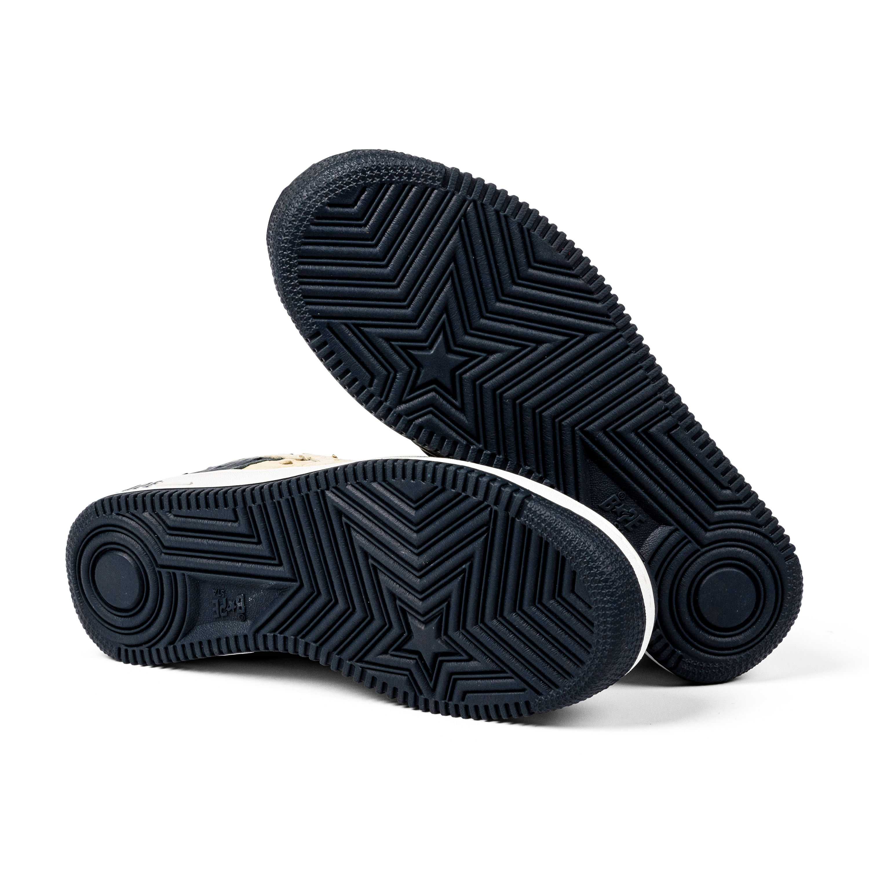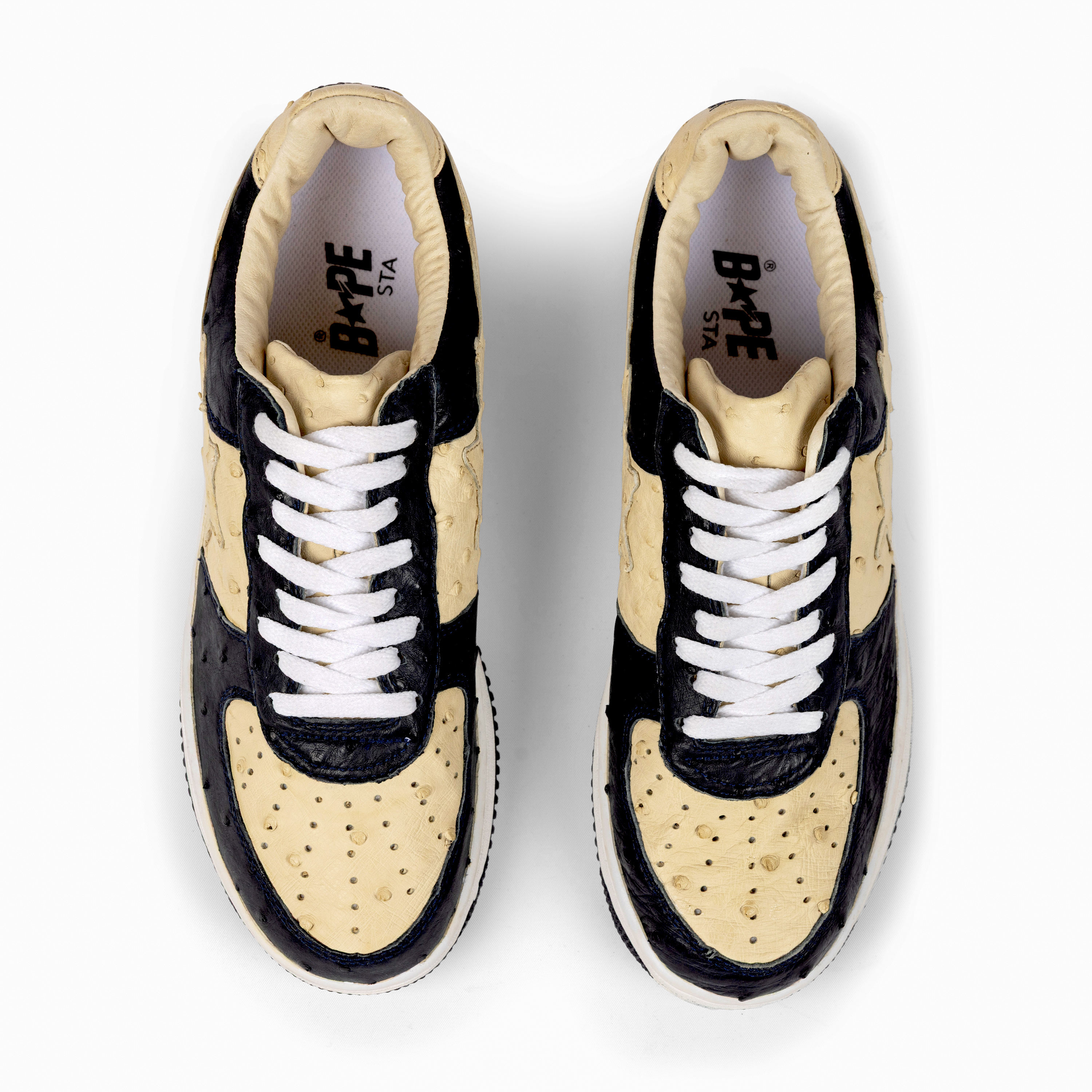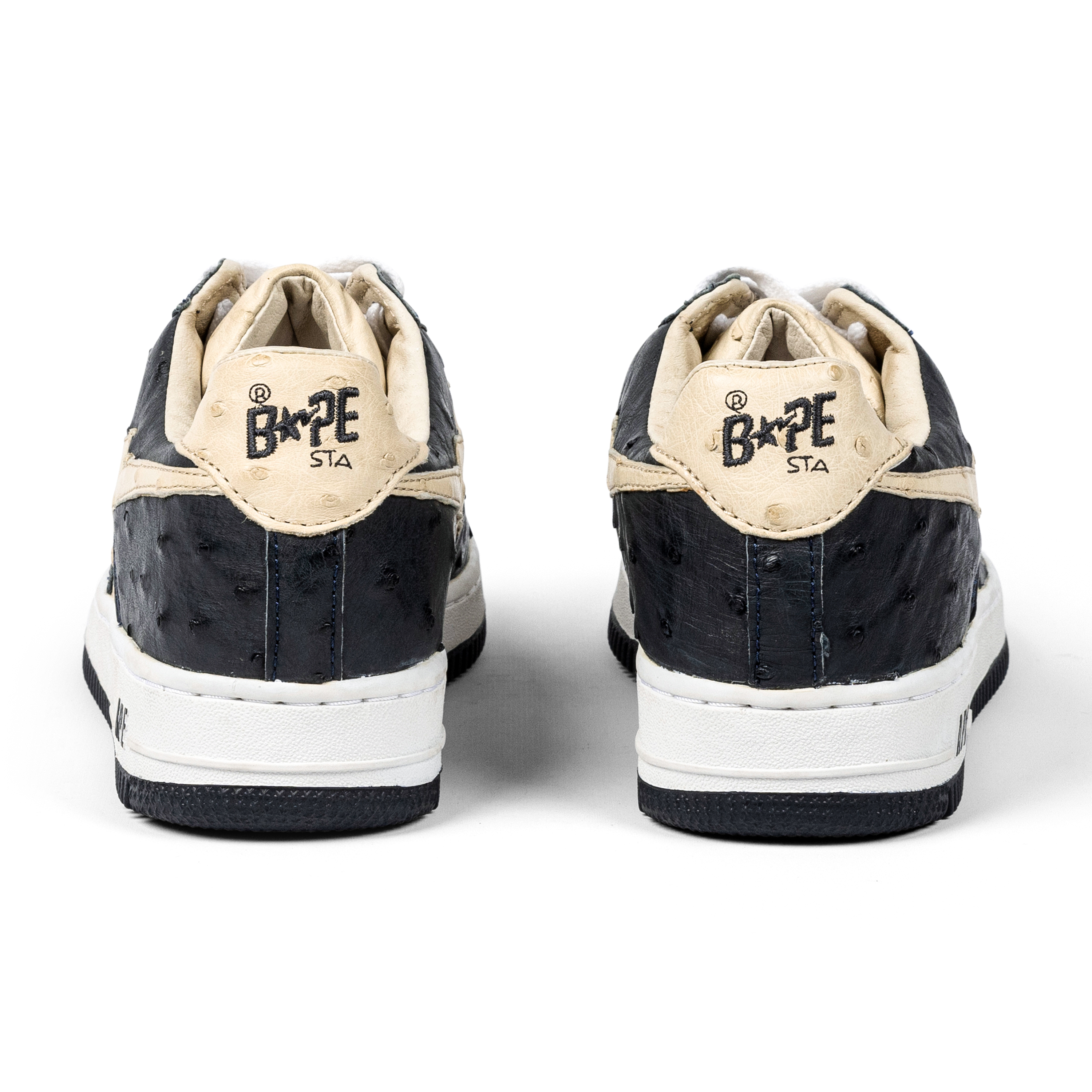 This pair features faux ostrich leather uppers in beige and navy with matching beige star logos—an unmistakable combination that embodies early-2000s street luxury. The materials and playful palette highlight Nigo’s innovative approach to blending pop culture, music, and fashion.