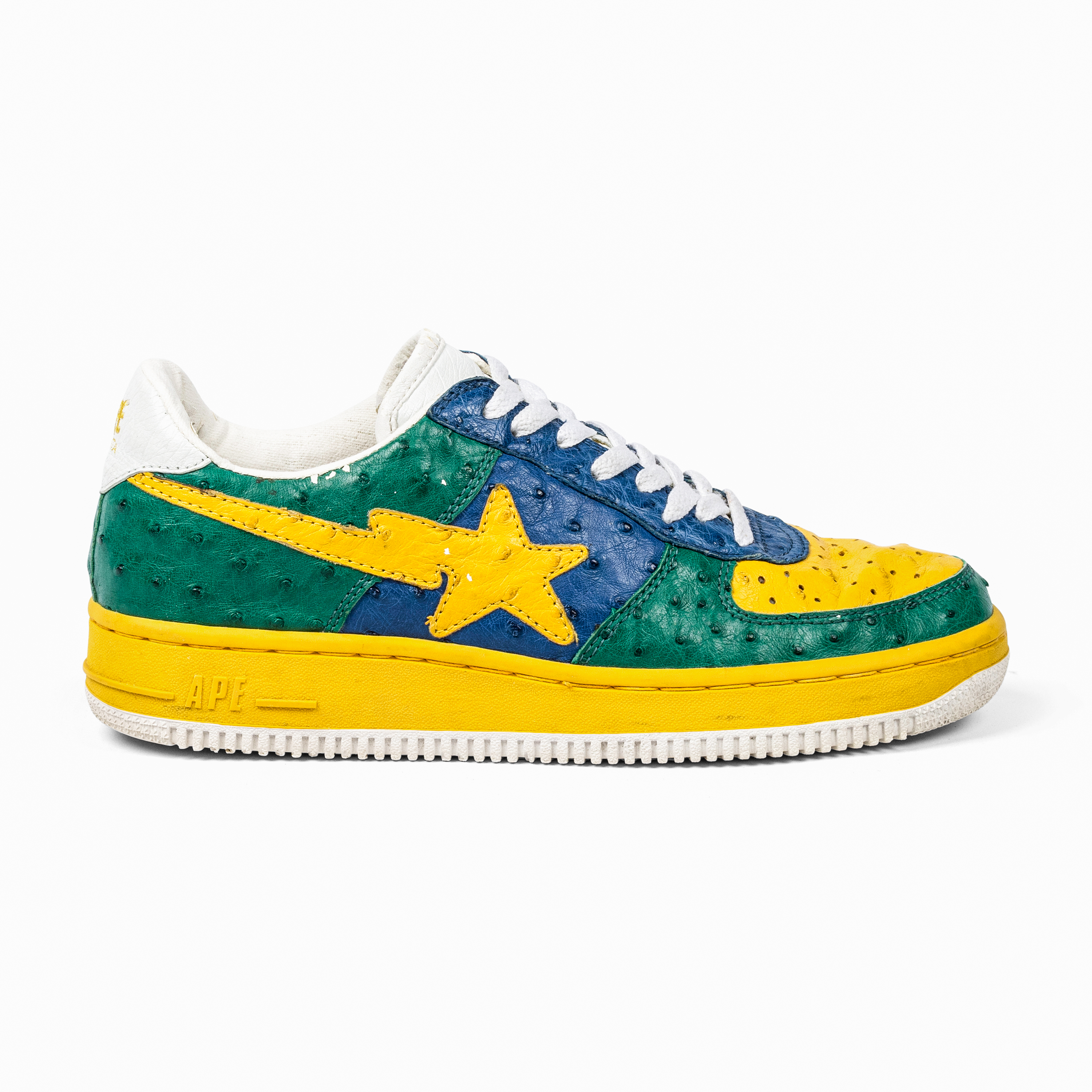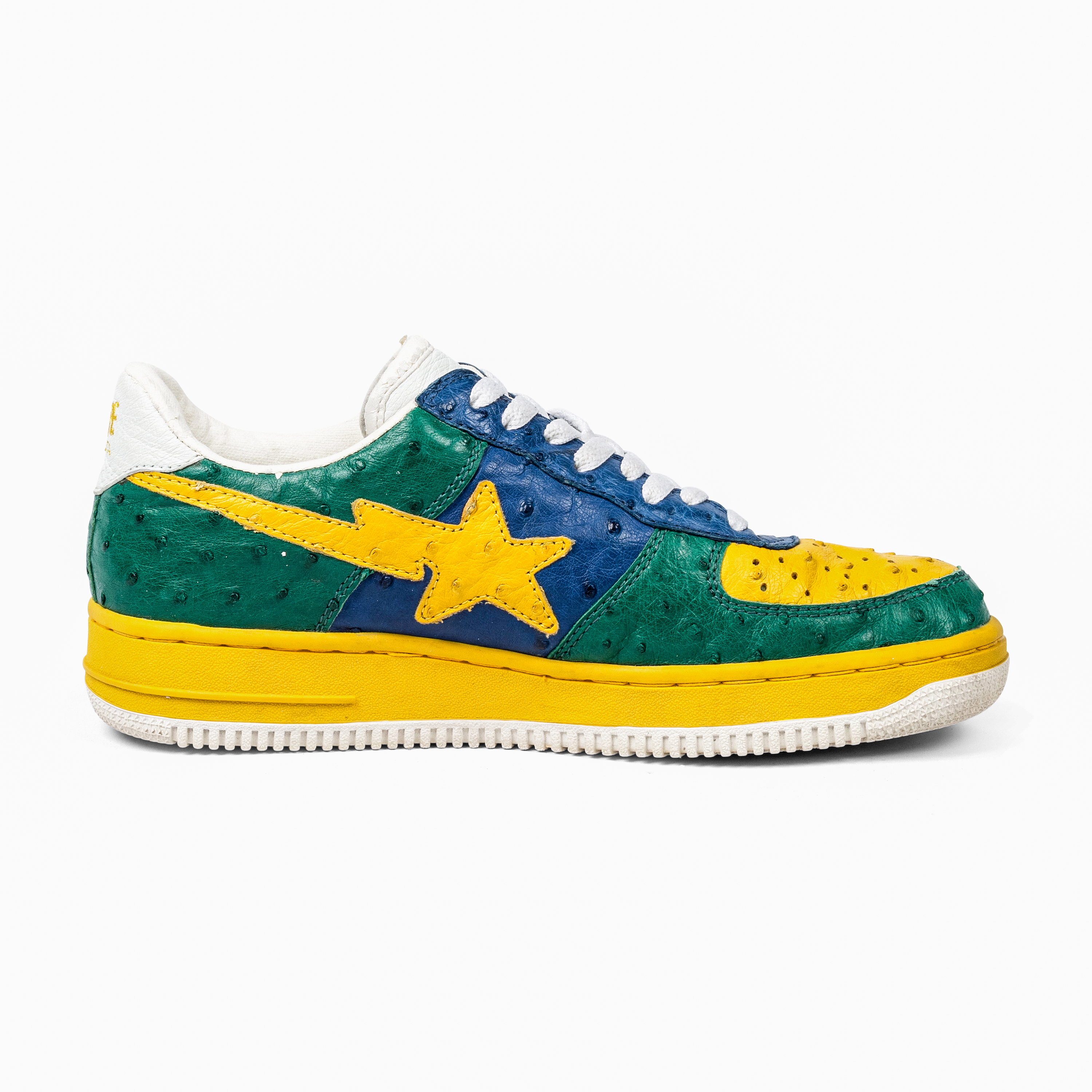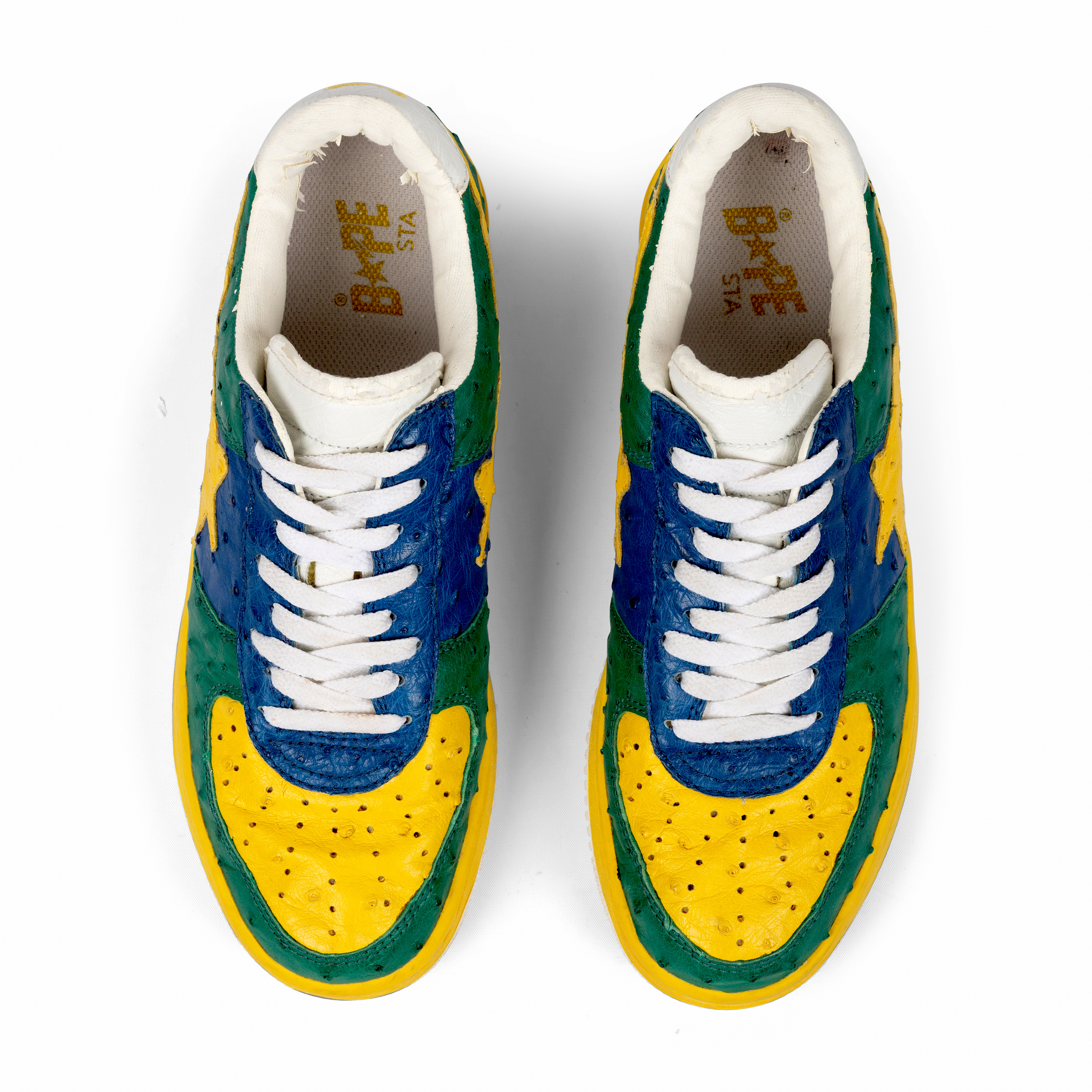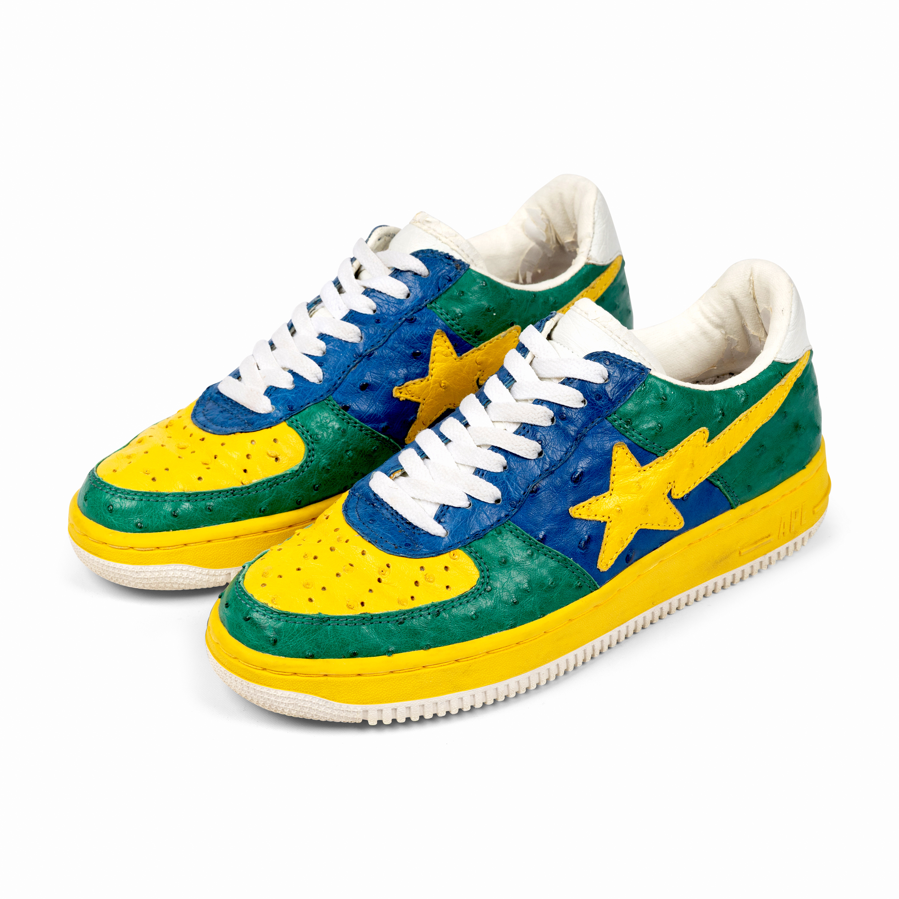 This pair features faux ostrich leather uppers in vibrant green, yellow, and blue with matching yellow star logos—an unmistakable combination that embodies early-2000s street luxury. The materials and playful palette highlight Nigo’s innovative approach to blending pop culture, music, and fashion.