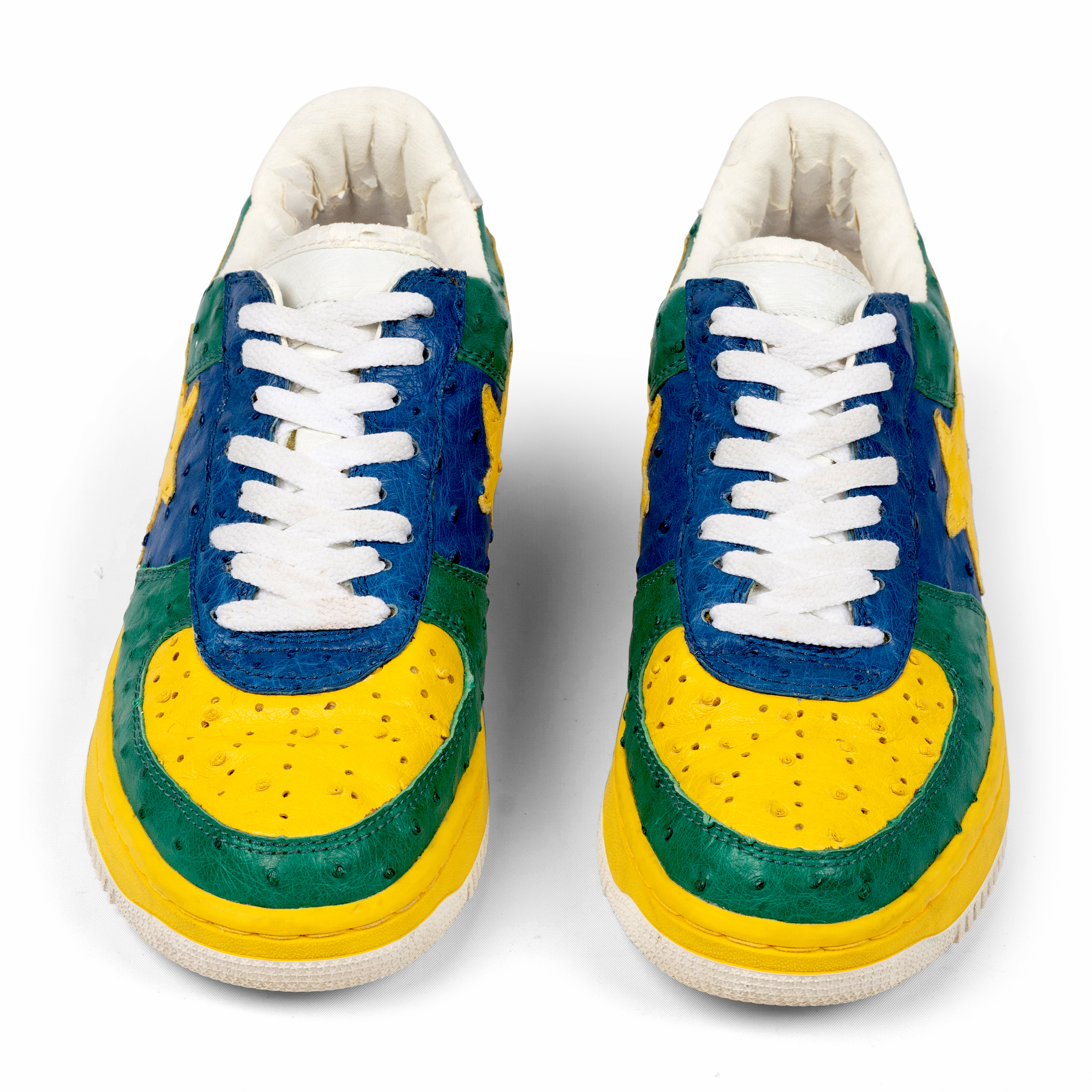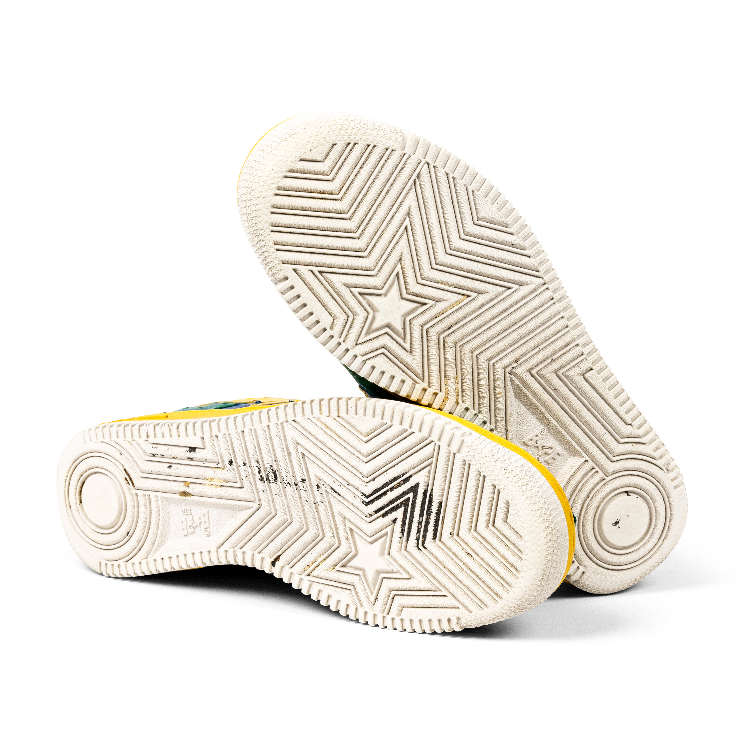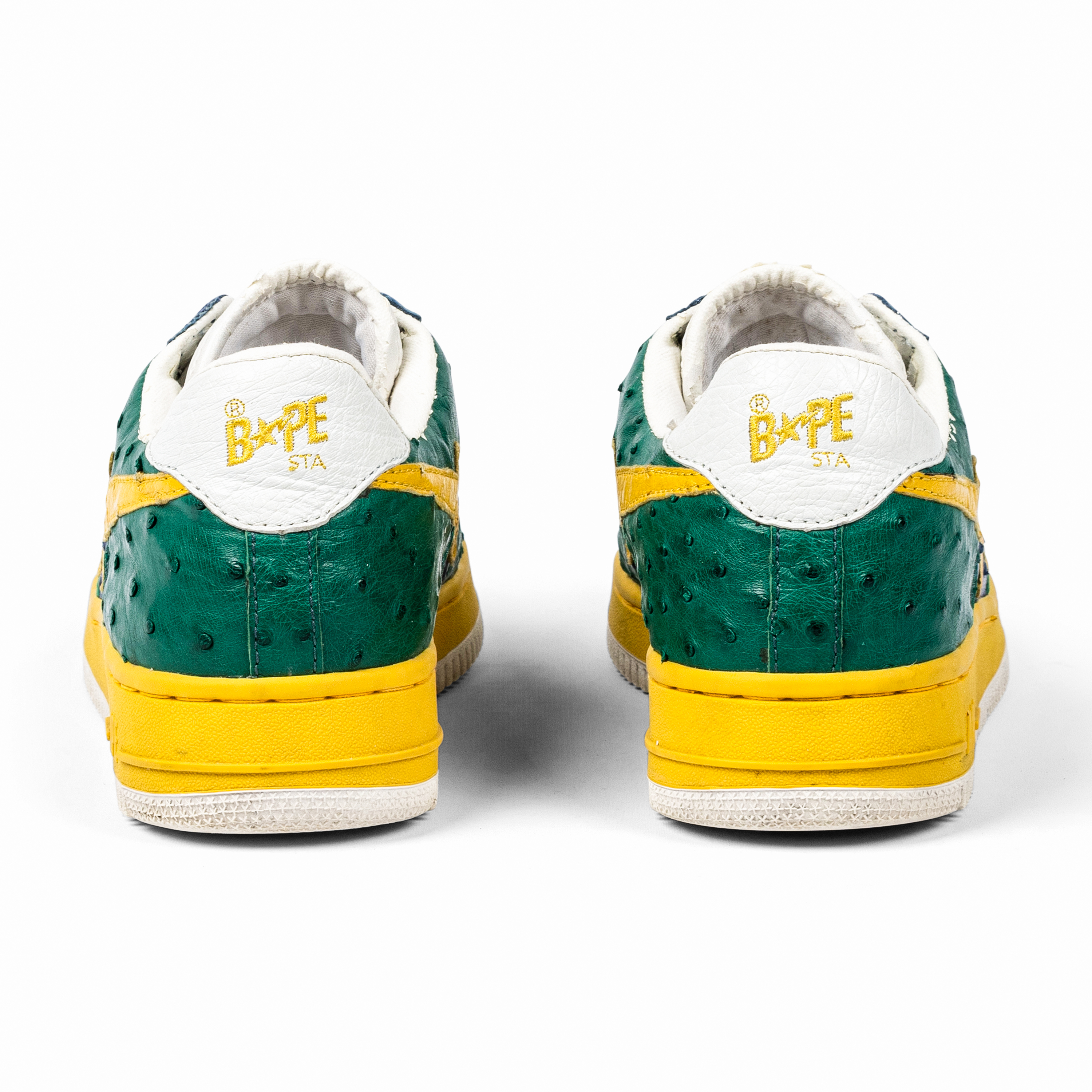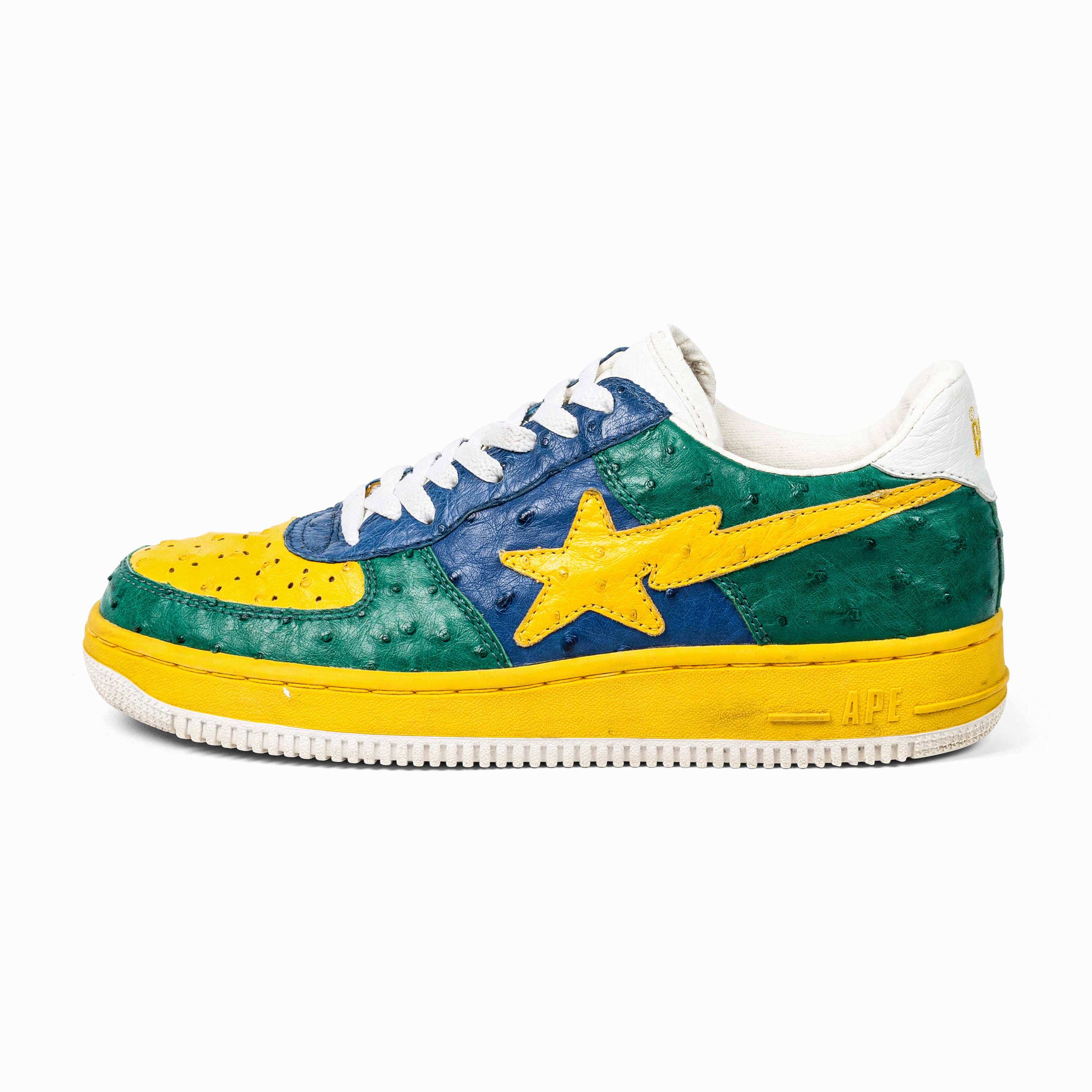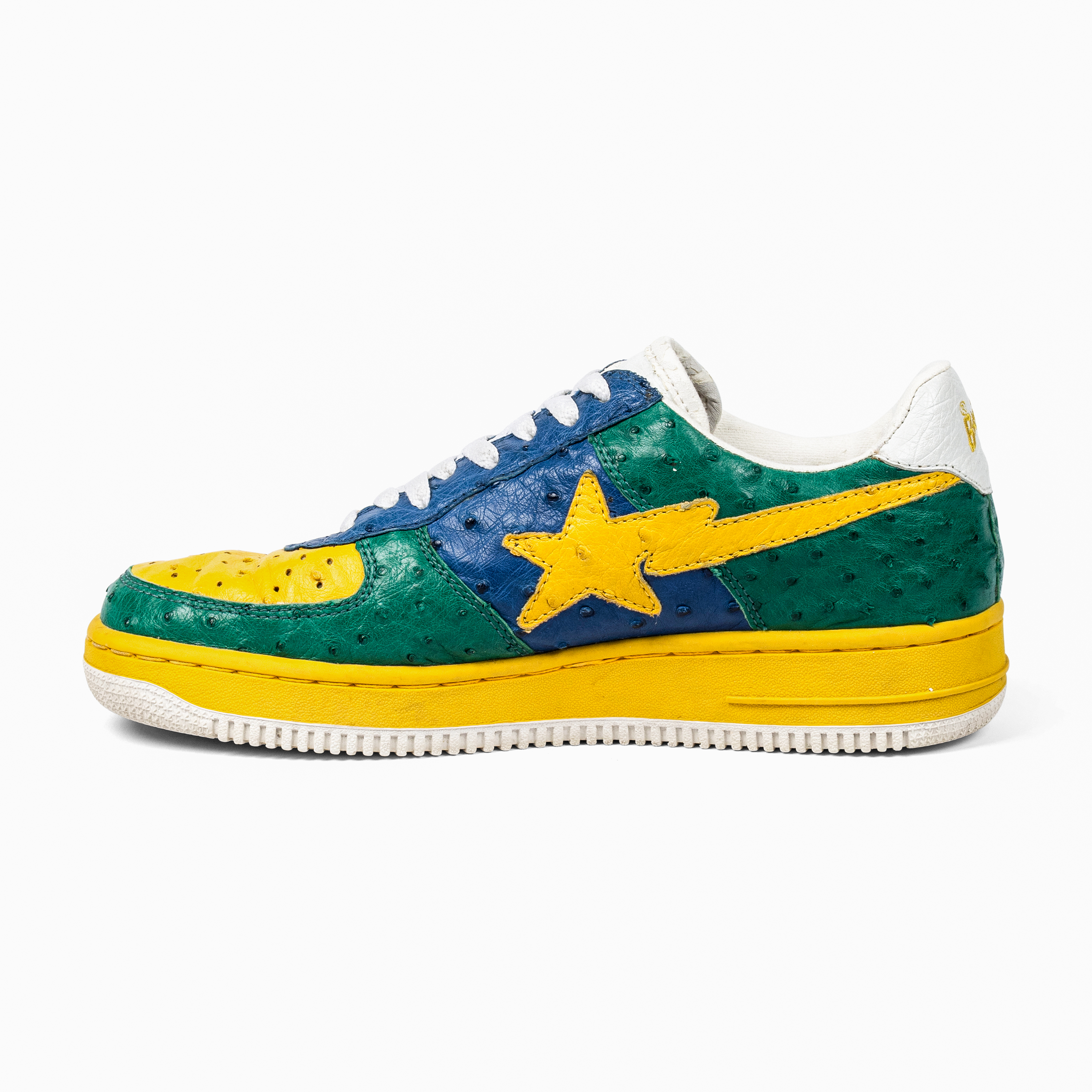 This pair features faux ostrich leather uppers in vibrant green, yellow, and blue with matching yellow star logos—an unmistakable combination that embodies early-2000s street luxury. The materials and playful palette highlight Nigo’s innovative approach to blending pop culture, music, and fashion.