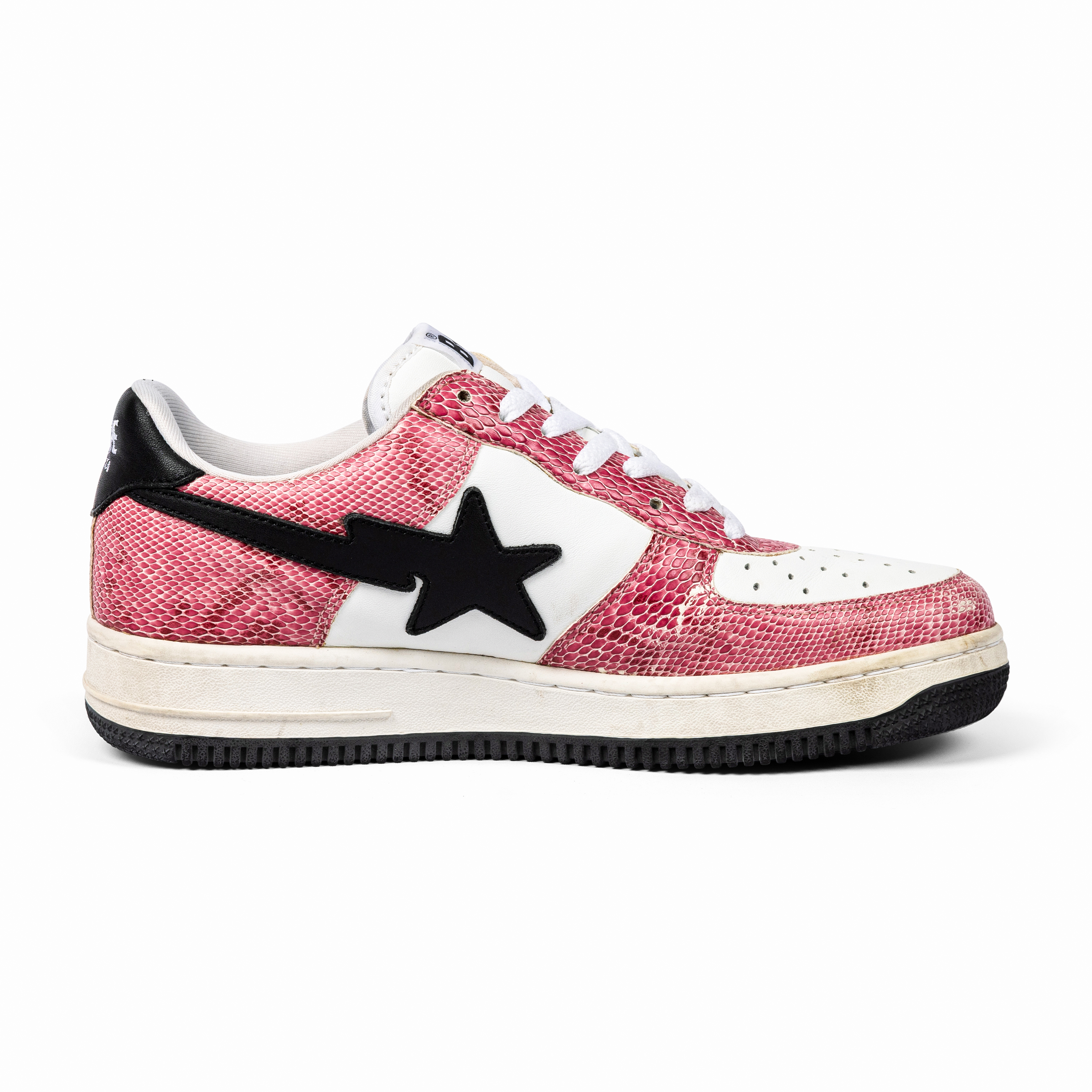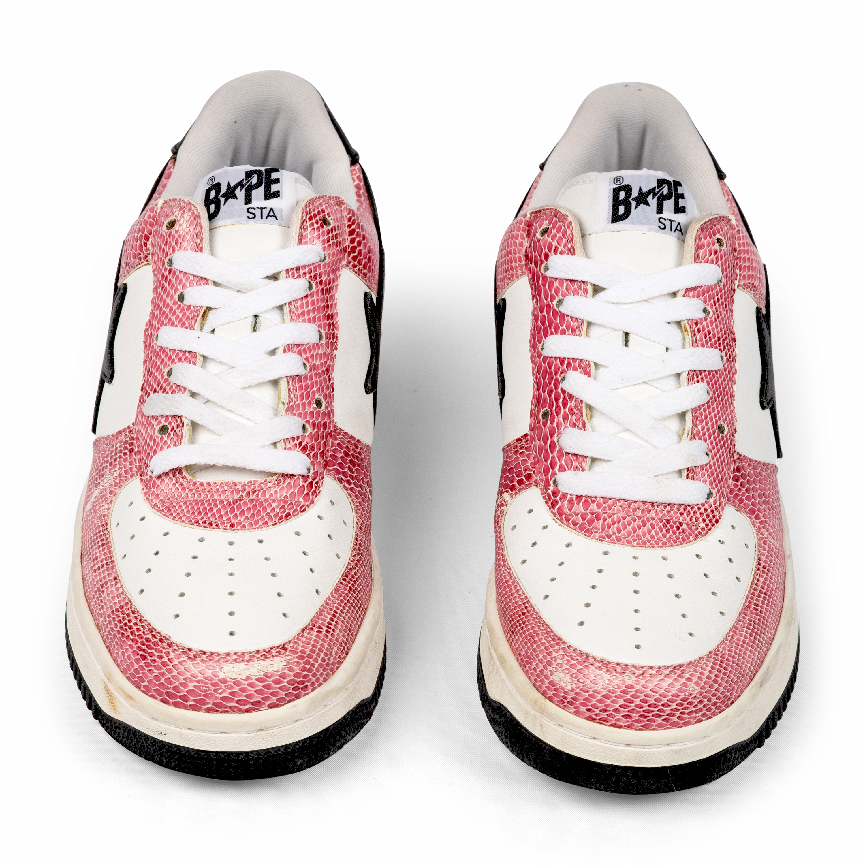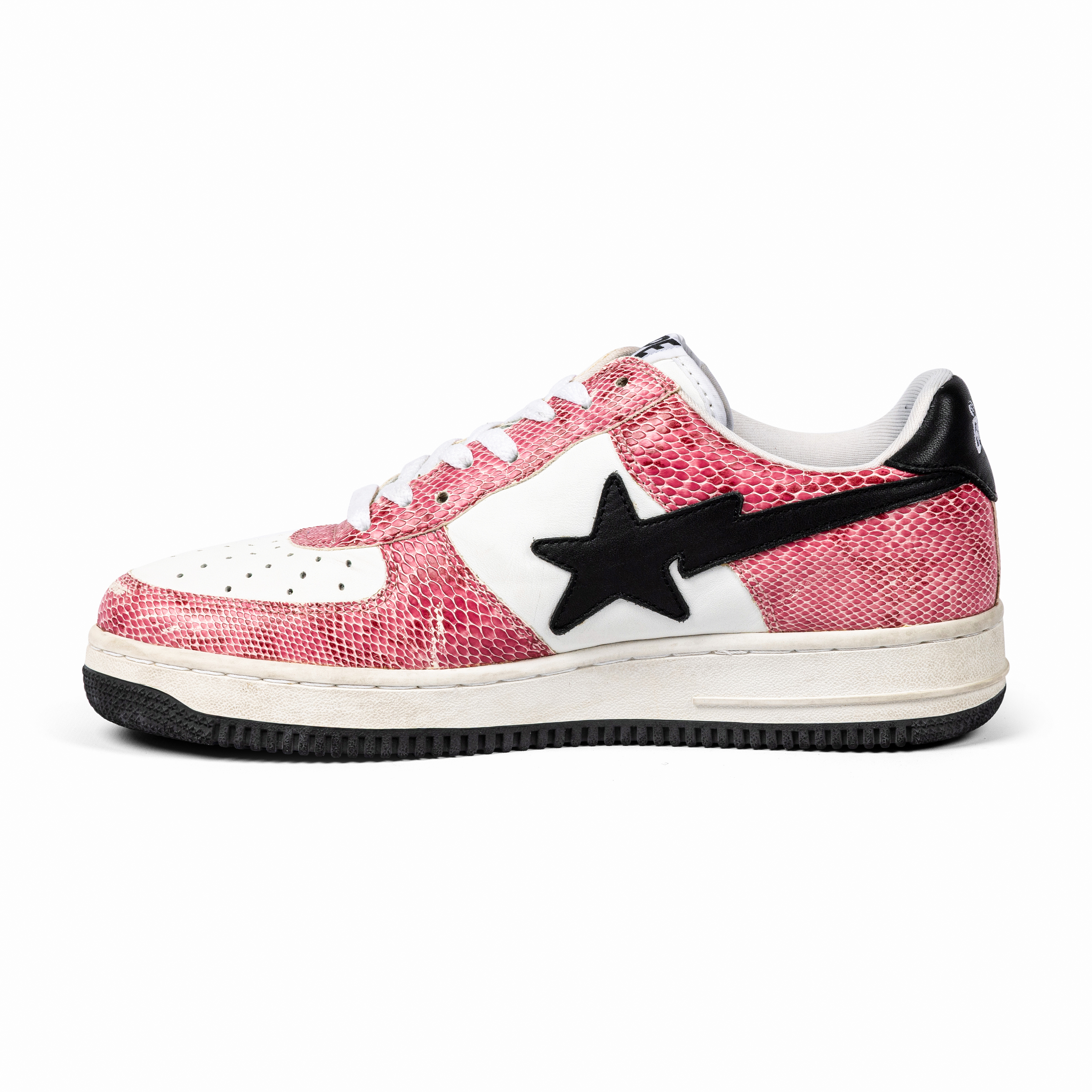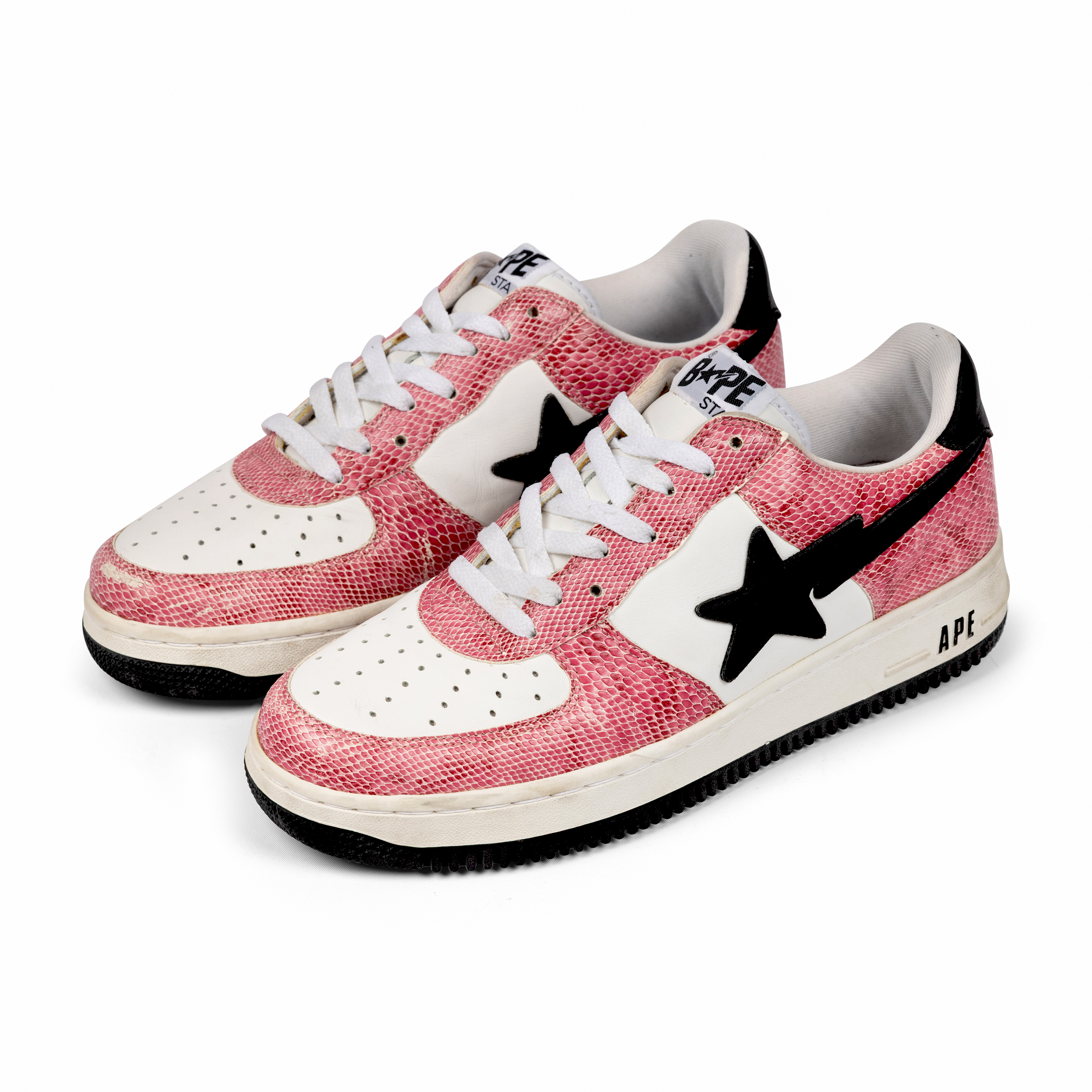 This pair features white leather and pink faux snakeskin leather uppers with black star logos—an unmistakable combination that embodies early-2000s street luxury. The materials and playful palette highlight Nigo’s innovative approach to blending pop culture, music, and fashion.
