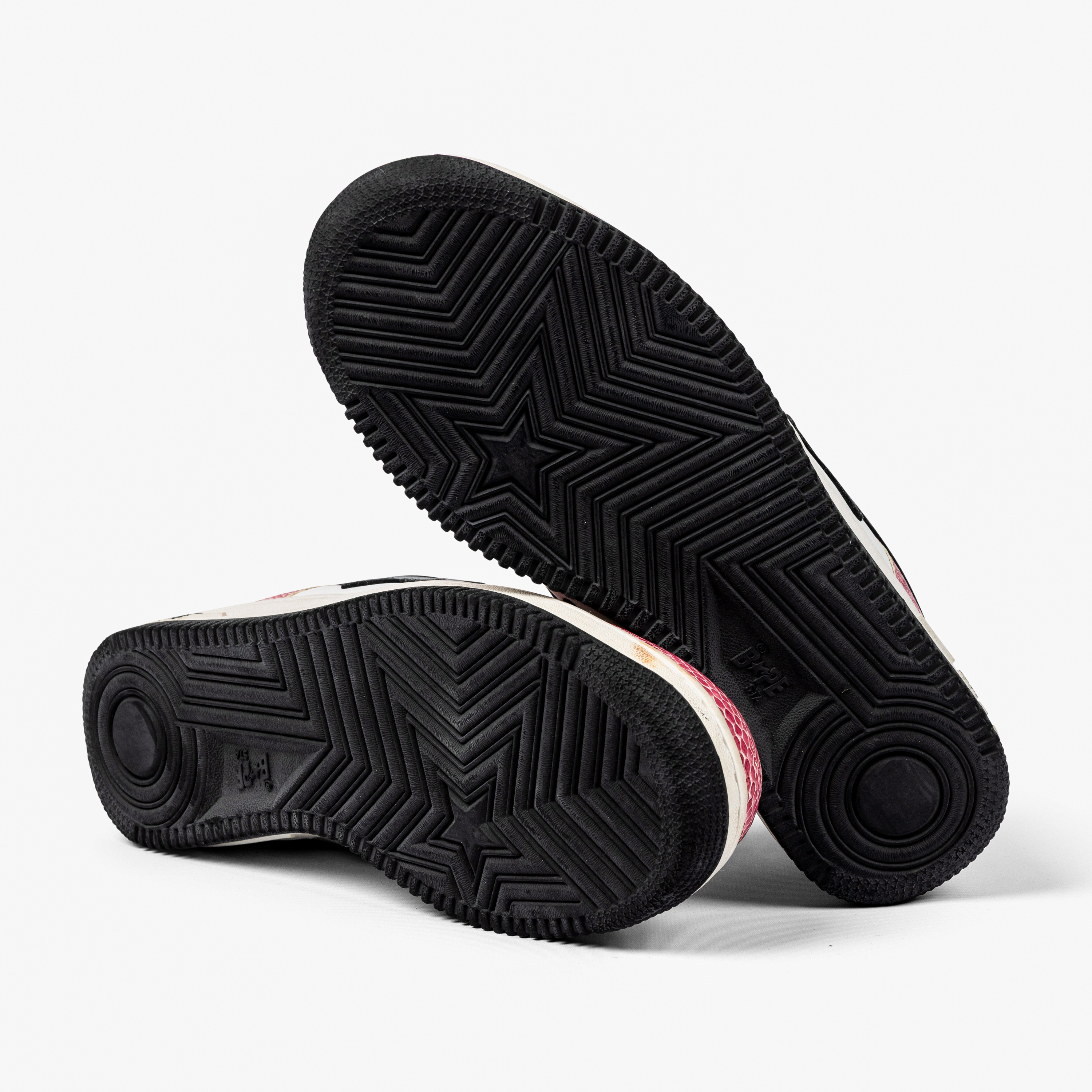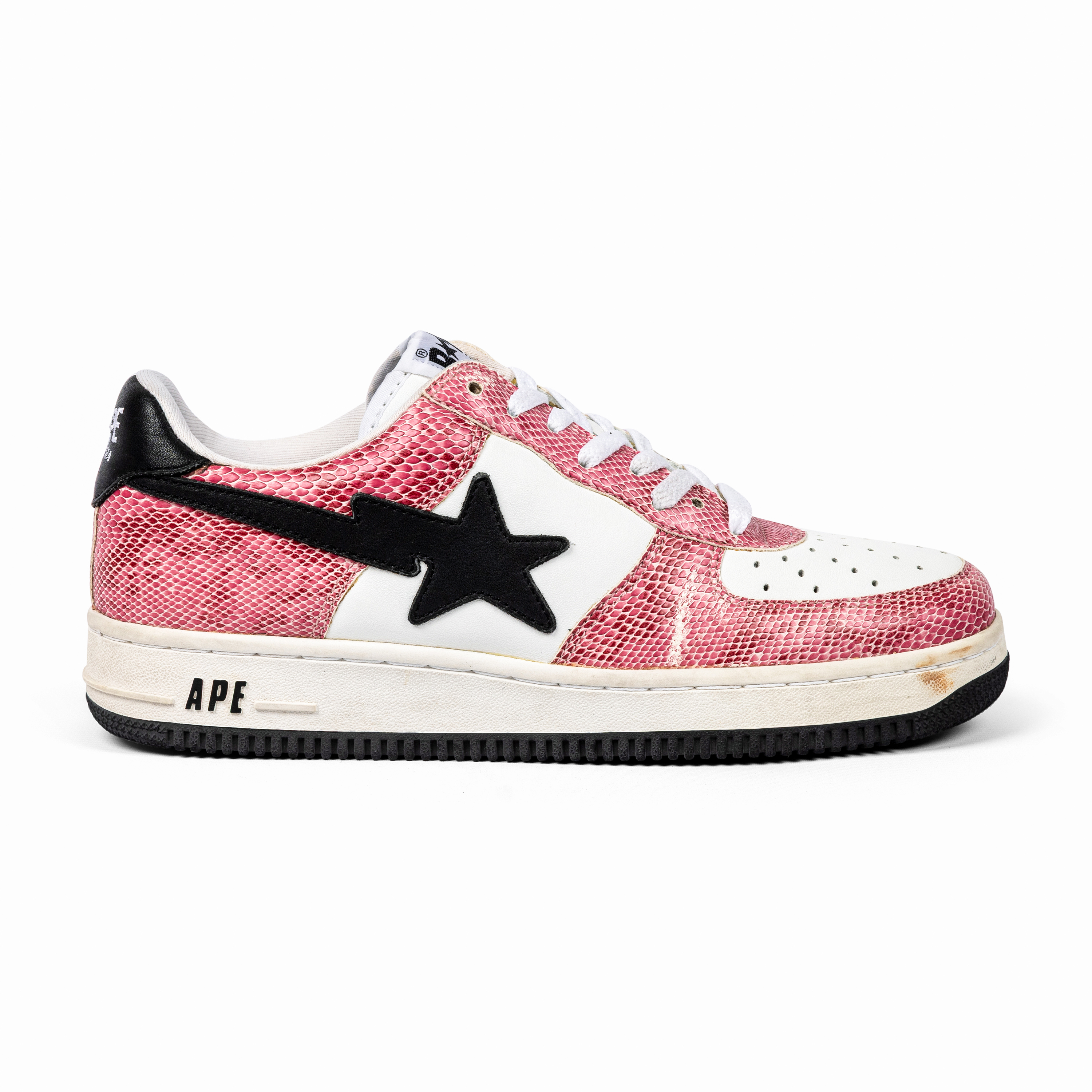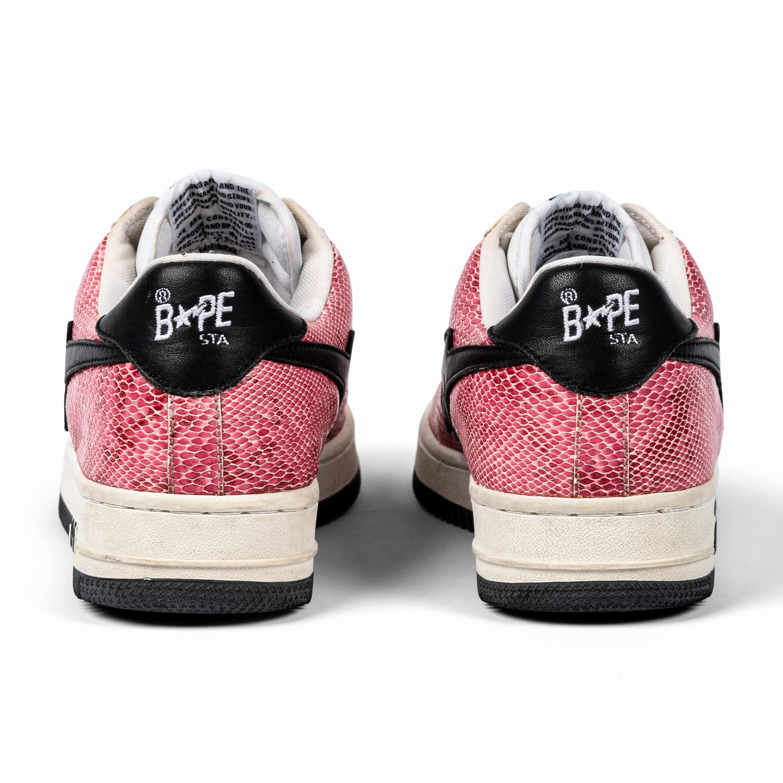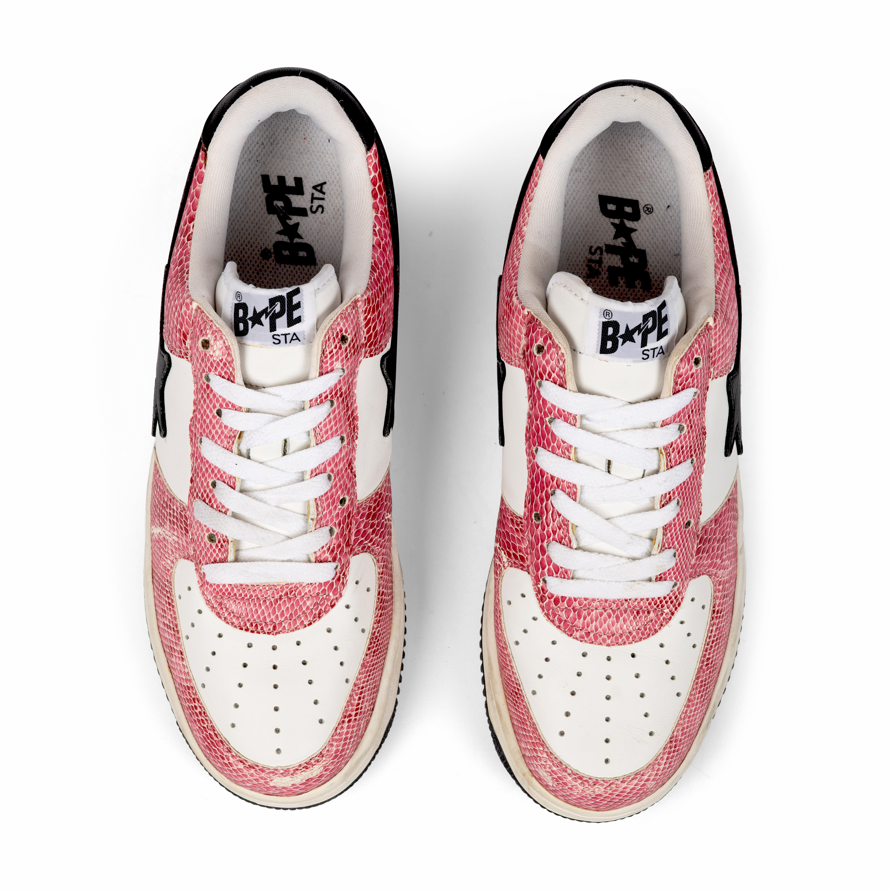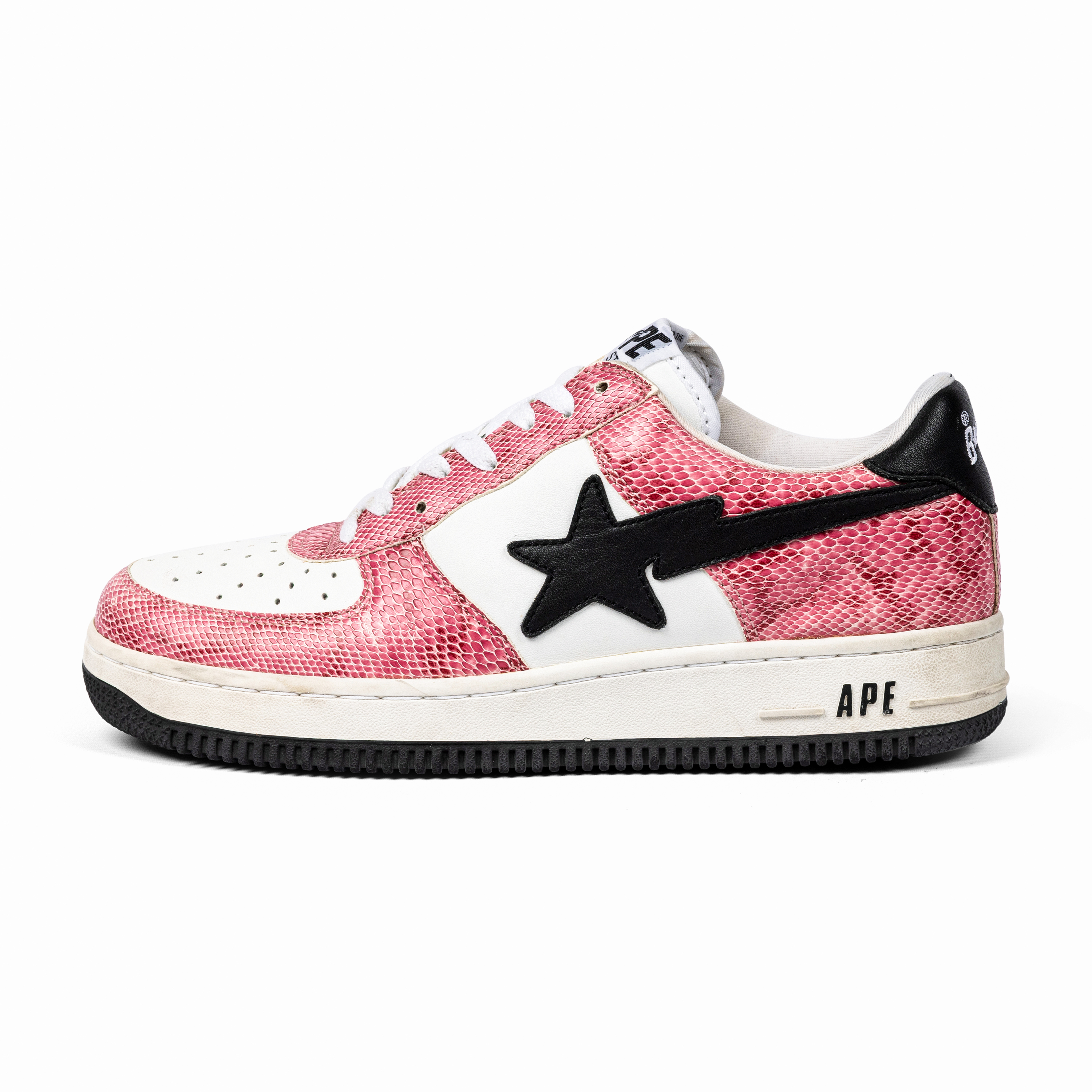 This pair features white leather and pink faux snakeskin leather uppers with black star logos—an unmistakable combination that embodies early-2000s street luxury. The materials and playful palette highlight Nigo’s innovative approach to blending pop culture, music, and fashion.