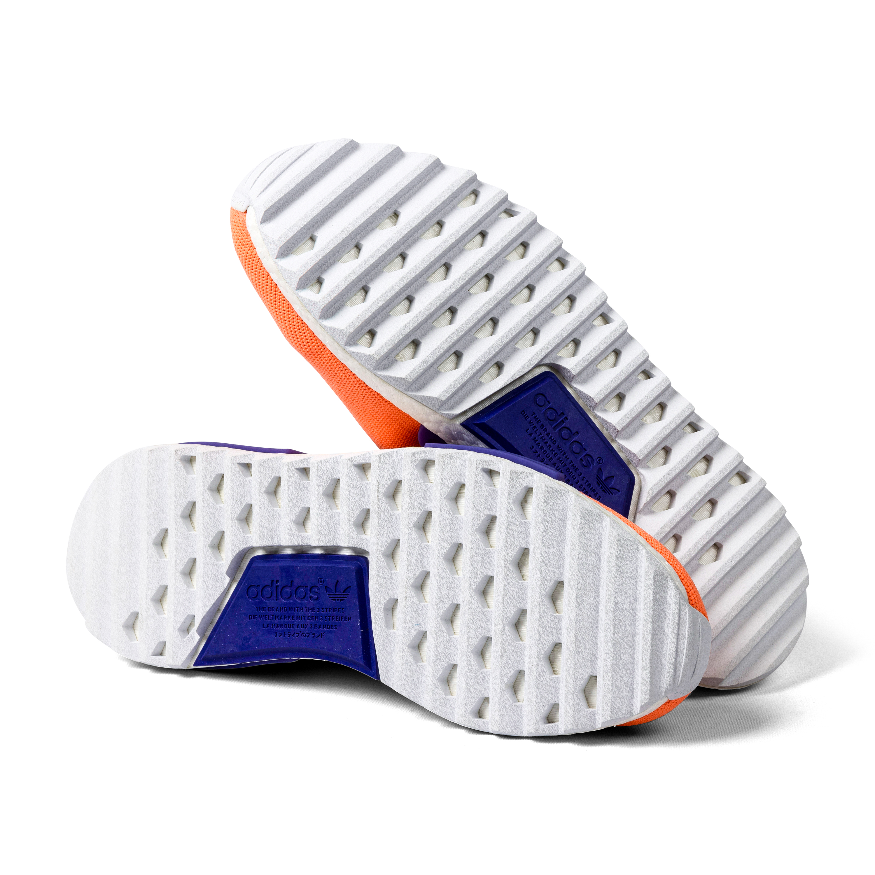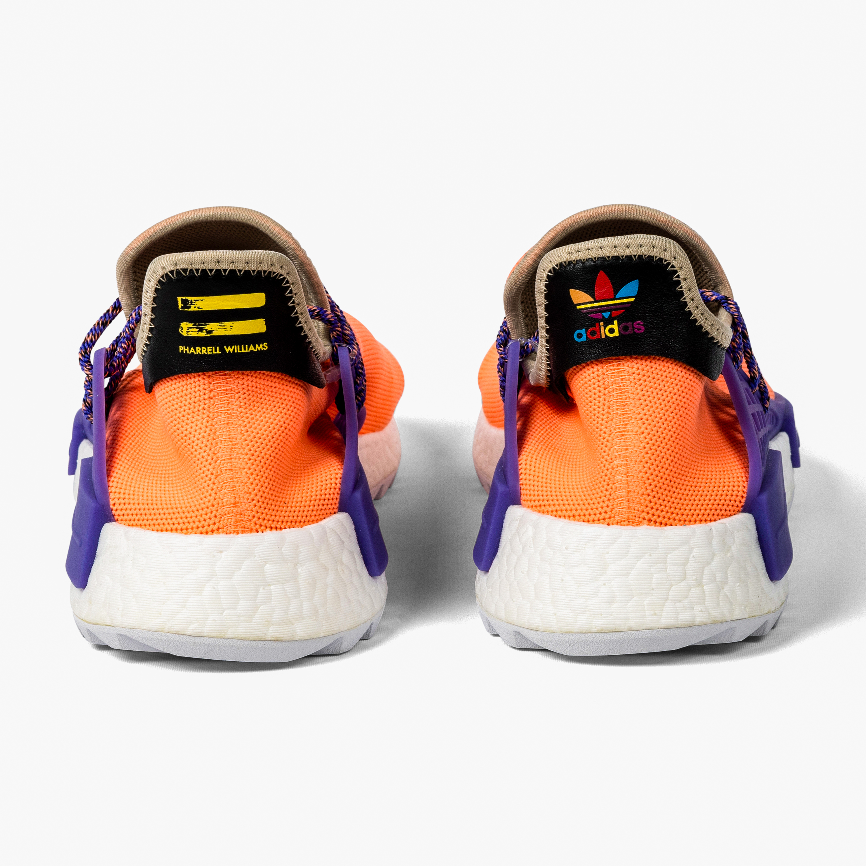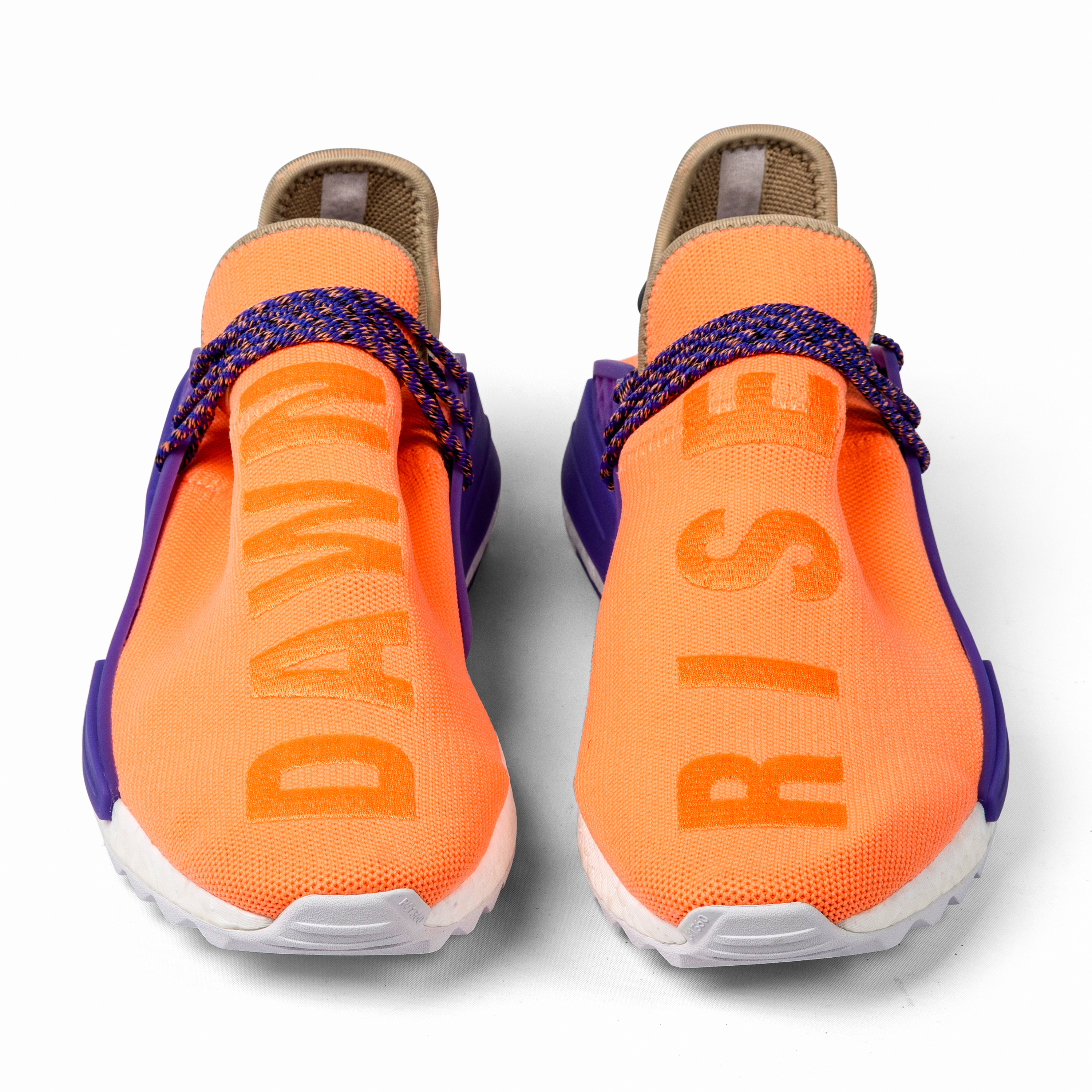 The design features a vivid orange Primeknit upper with purple accents. Embroidered across the right shoe is the word “DAWN,” while the left reads “RISE,” a pairing that reflects the uplifting, optimistic ethos central to Pharrell’s creative philosophy.