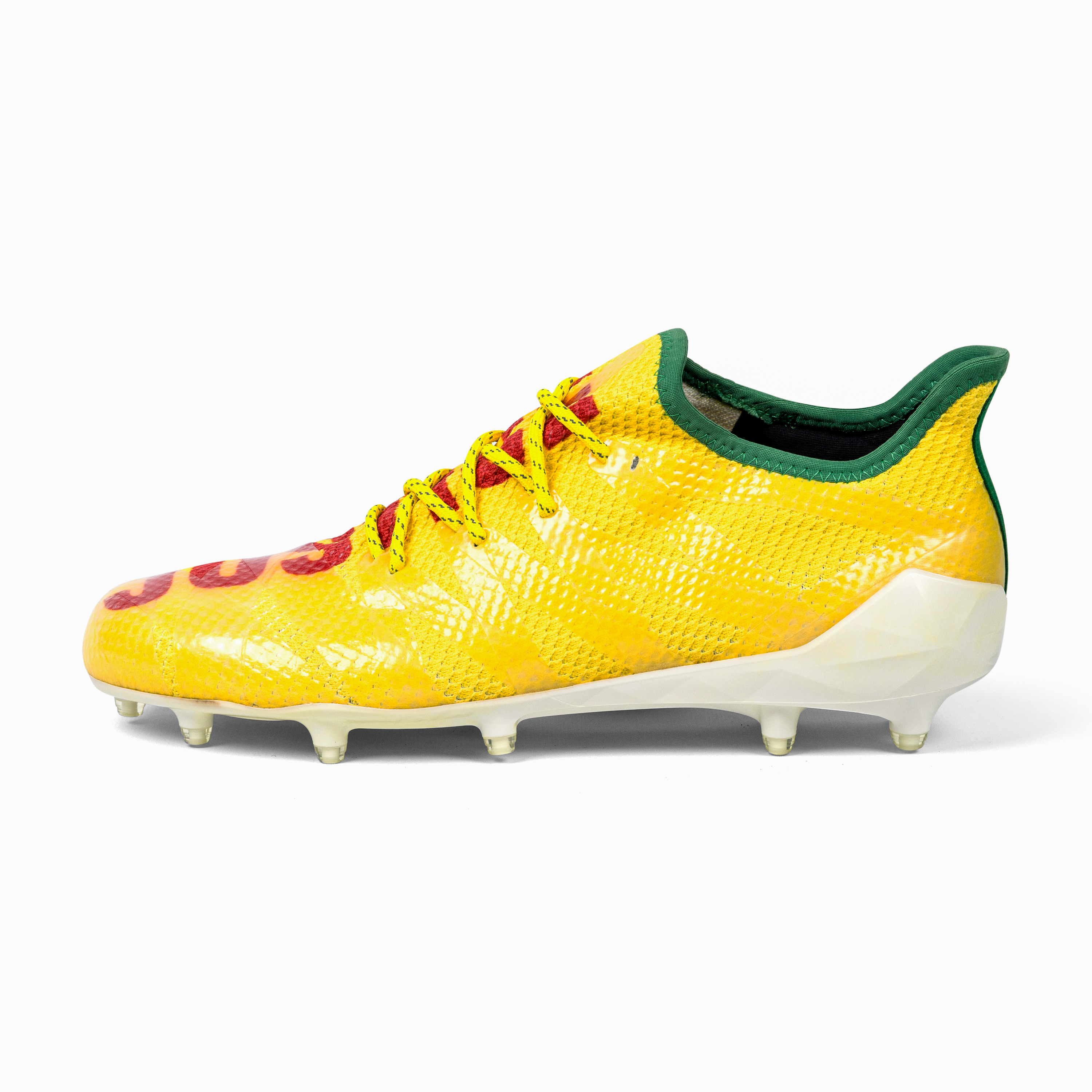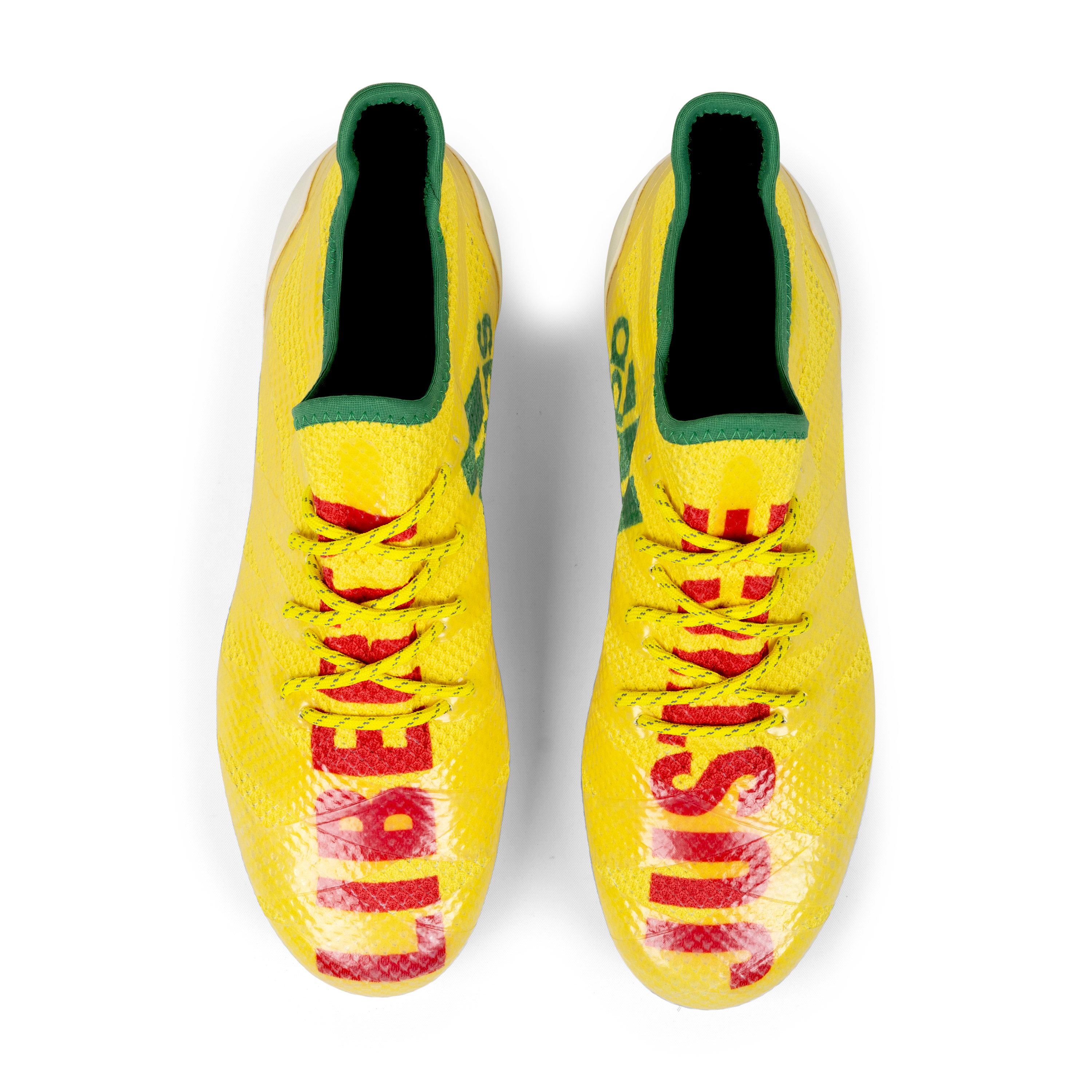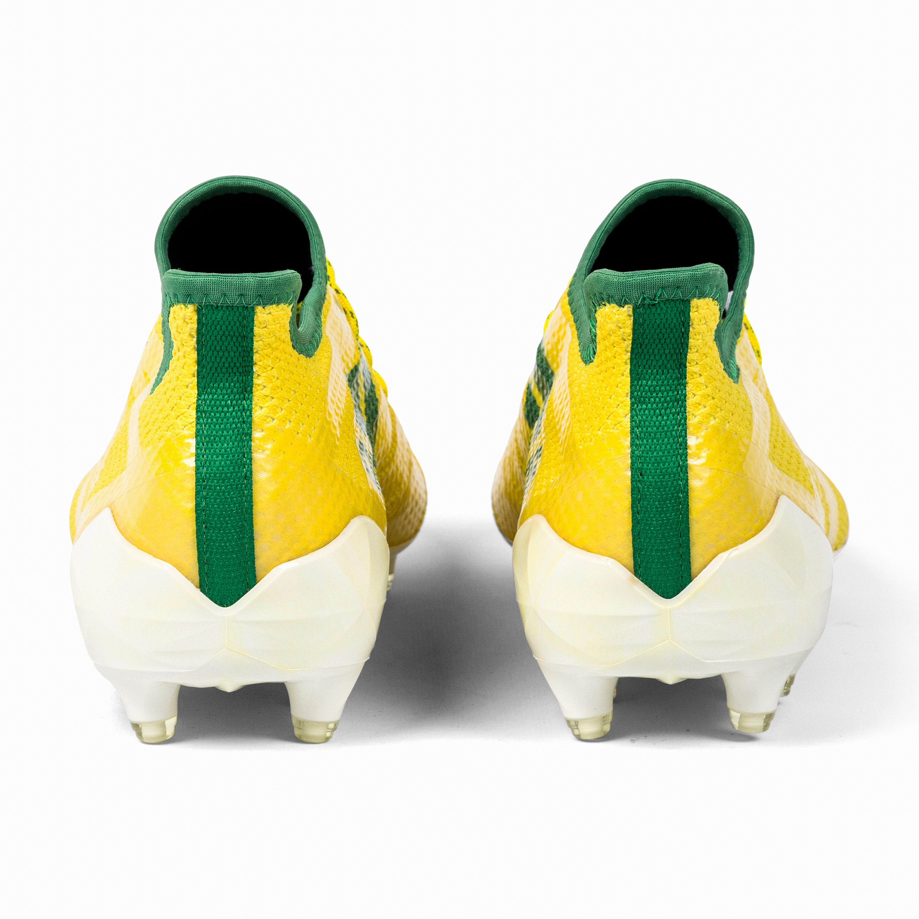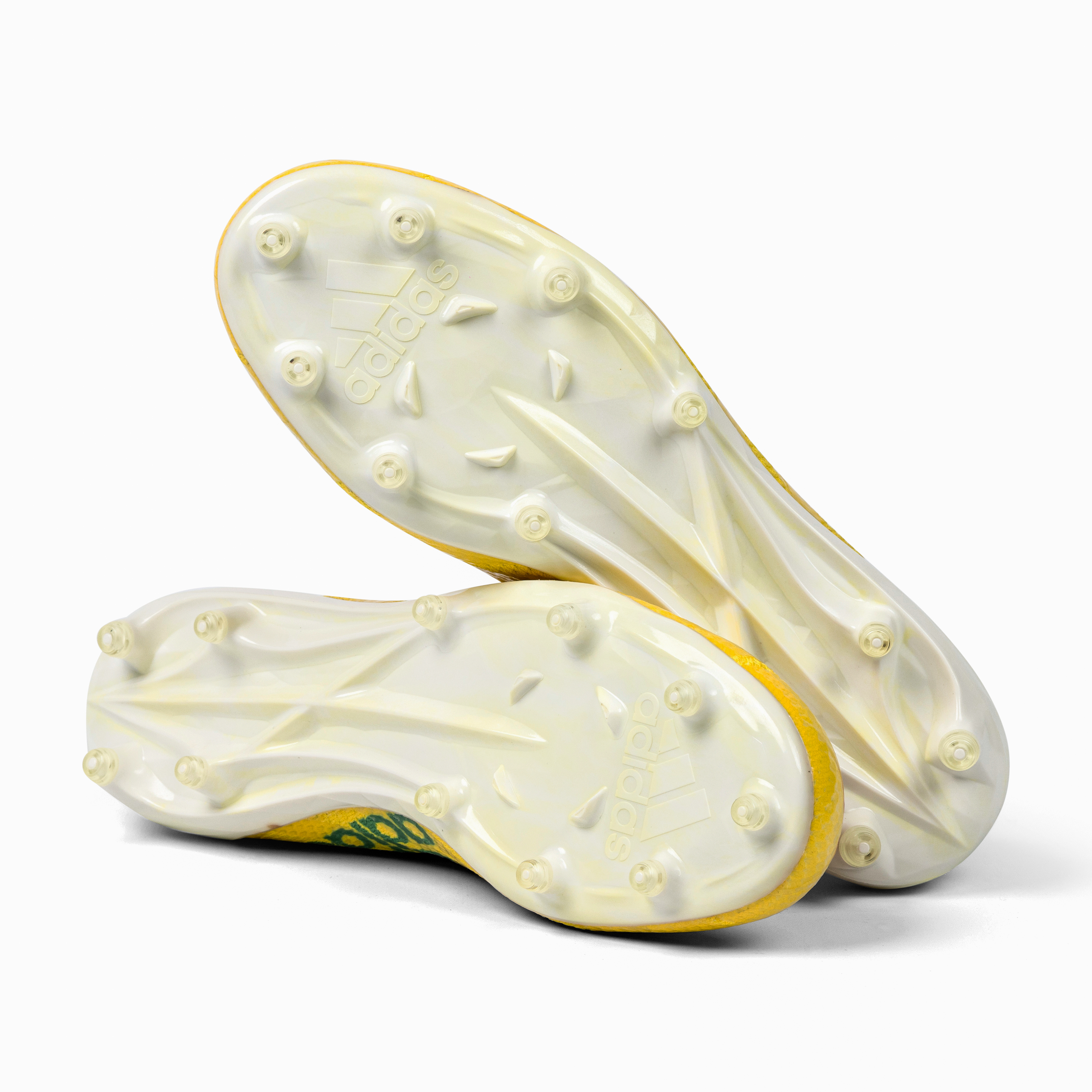 Produced through adidas’s innovative Speedfactory program, these football cleats showcase Pharrell Williams’s signature approach to color and message-driven design. The uppers are primarily yellow, accented by vivid red and green details that infuse the silhouette with visual energy and symbolic meaning.