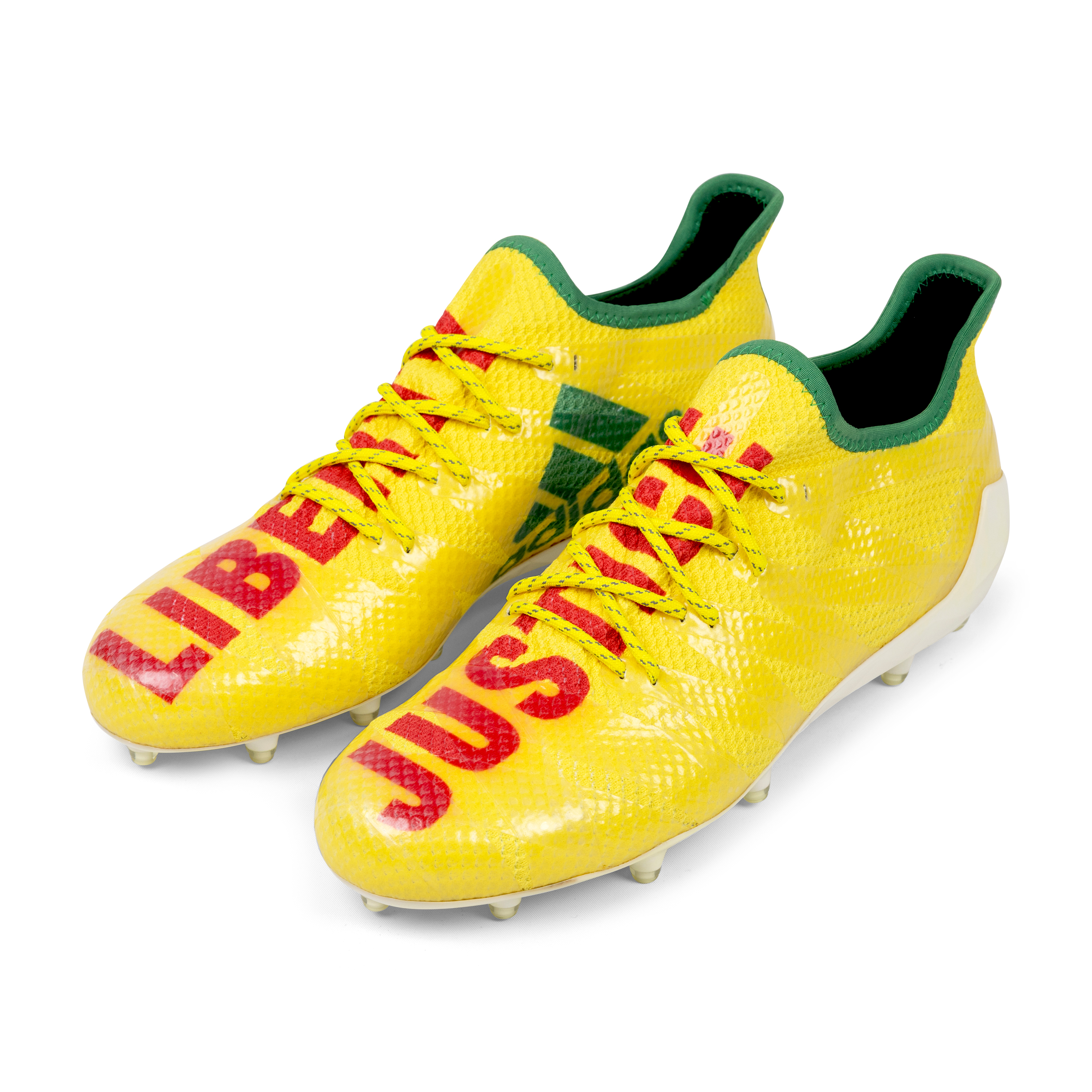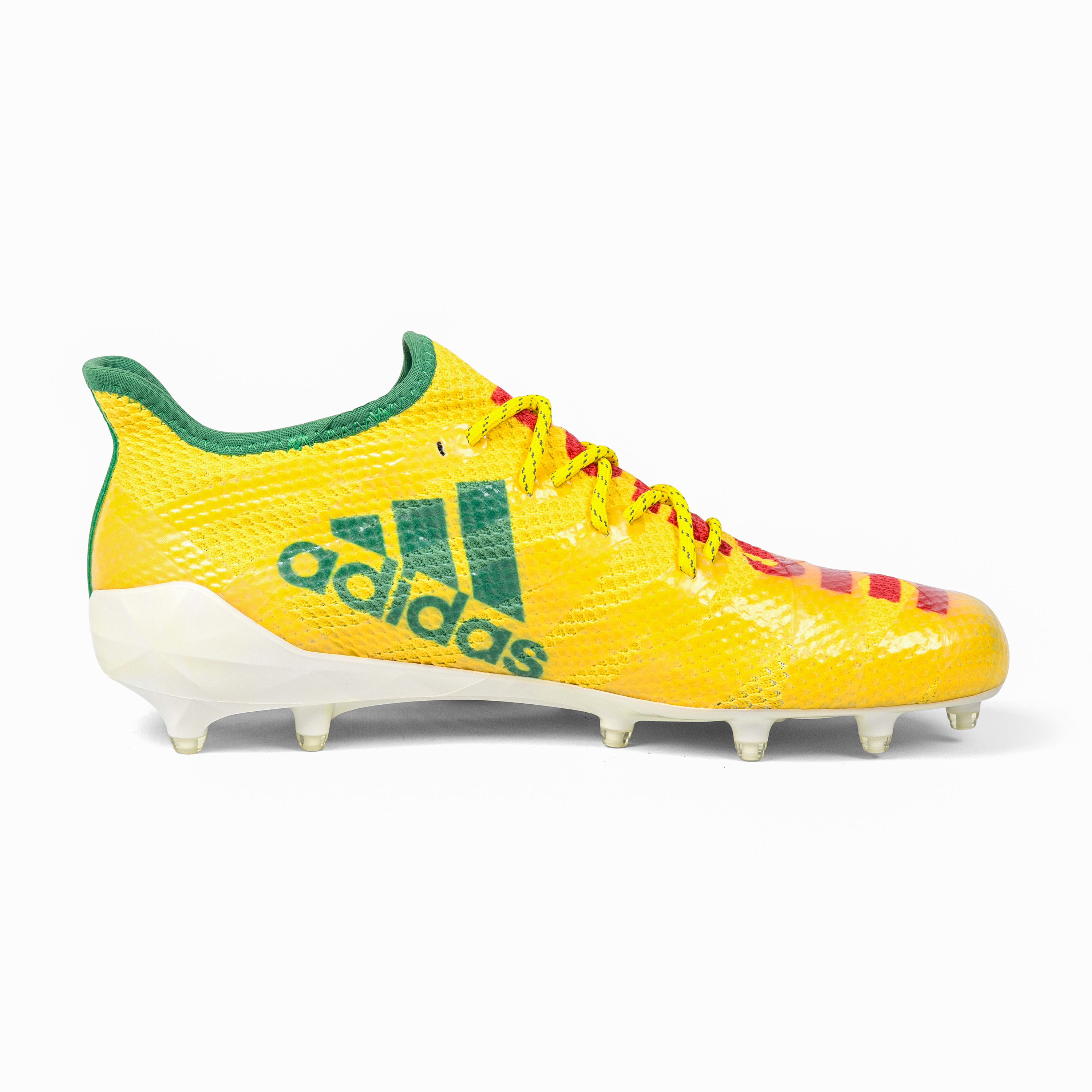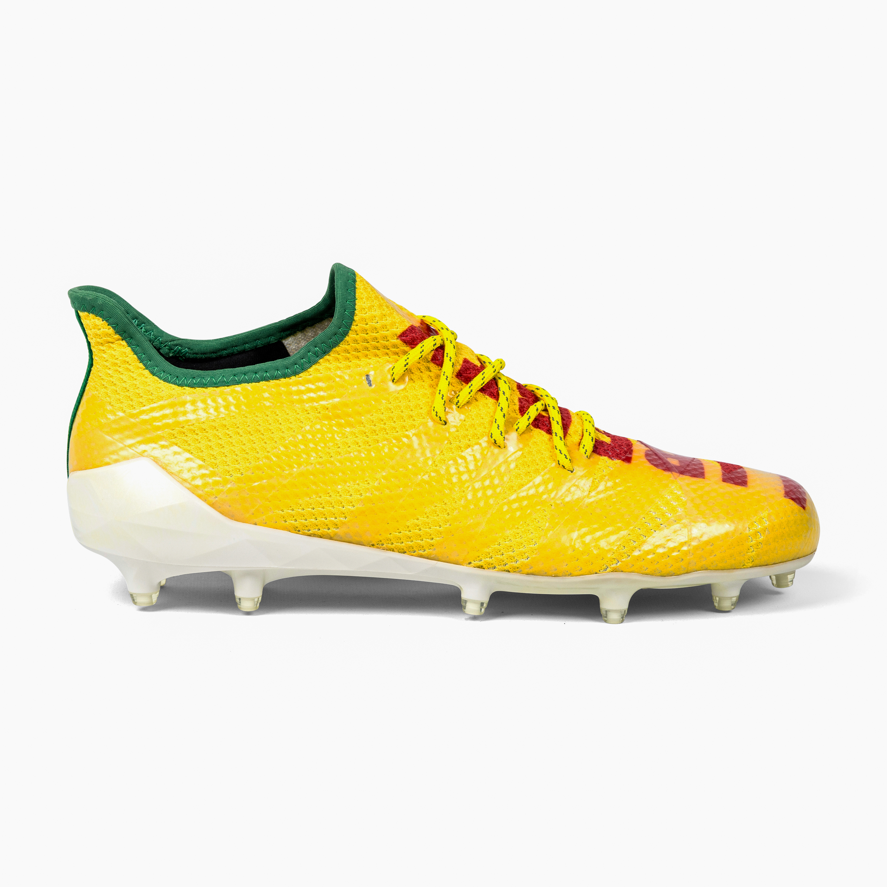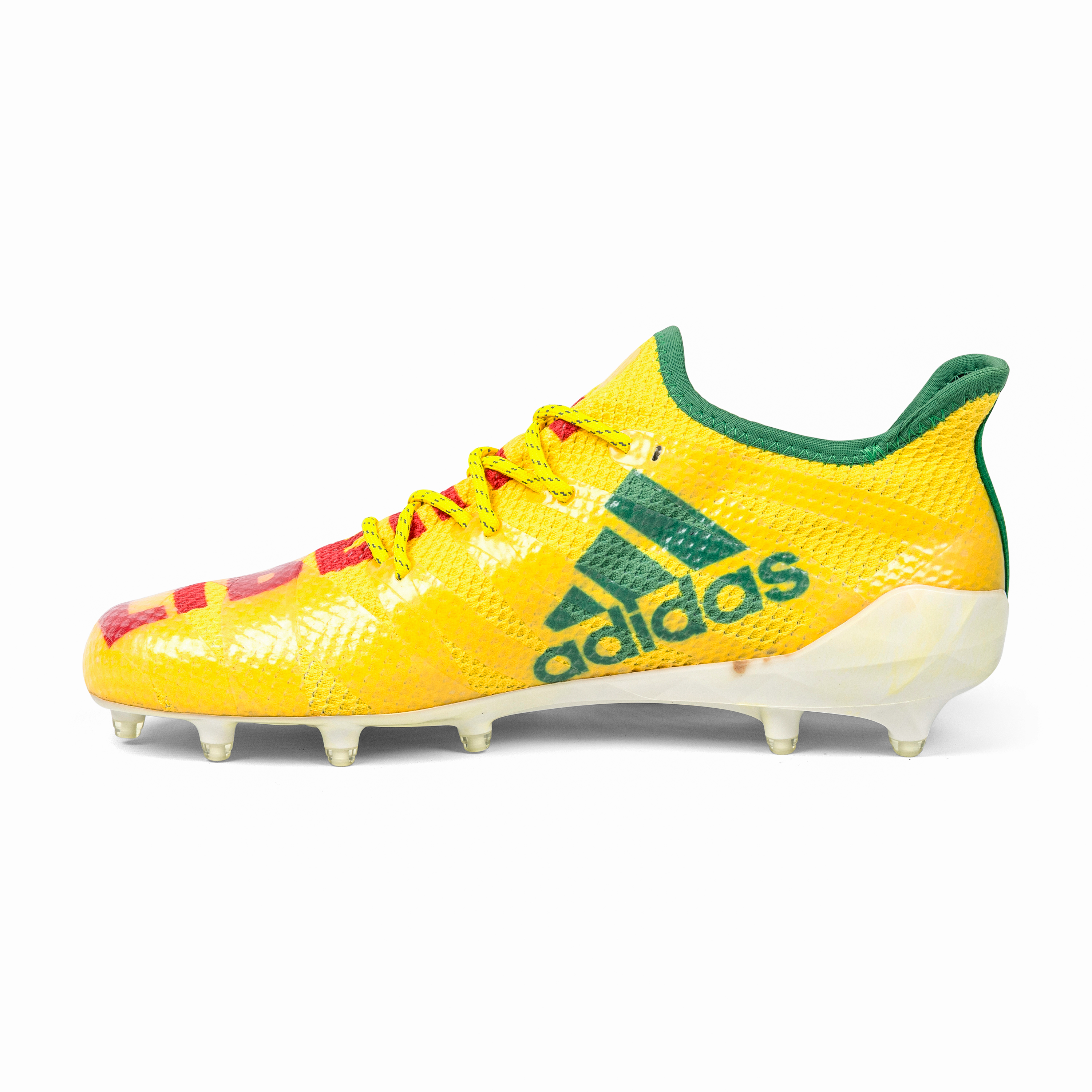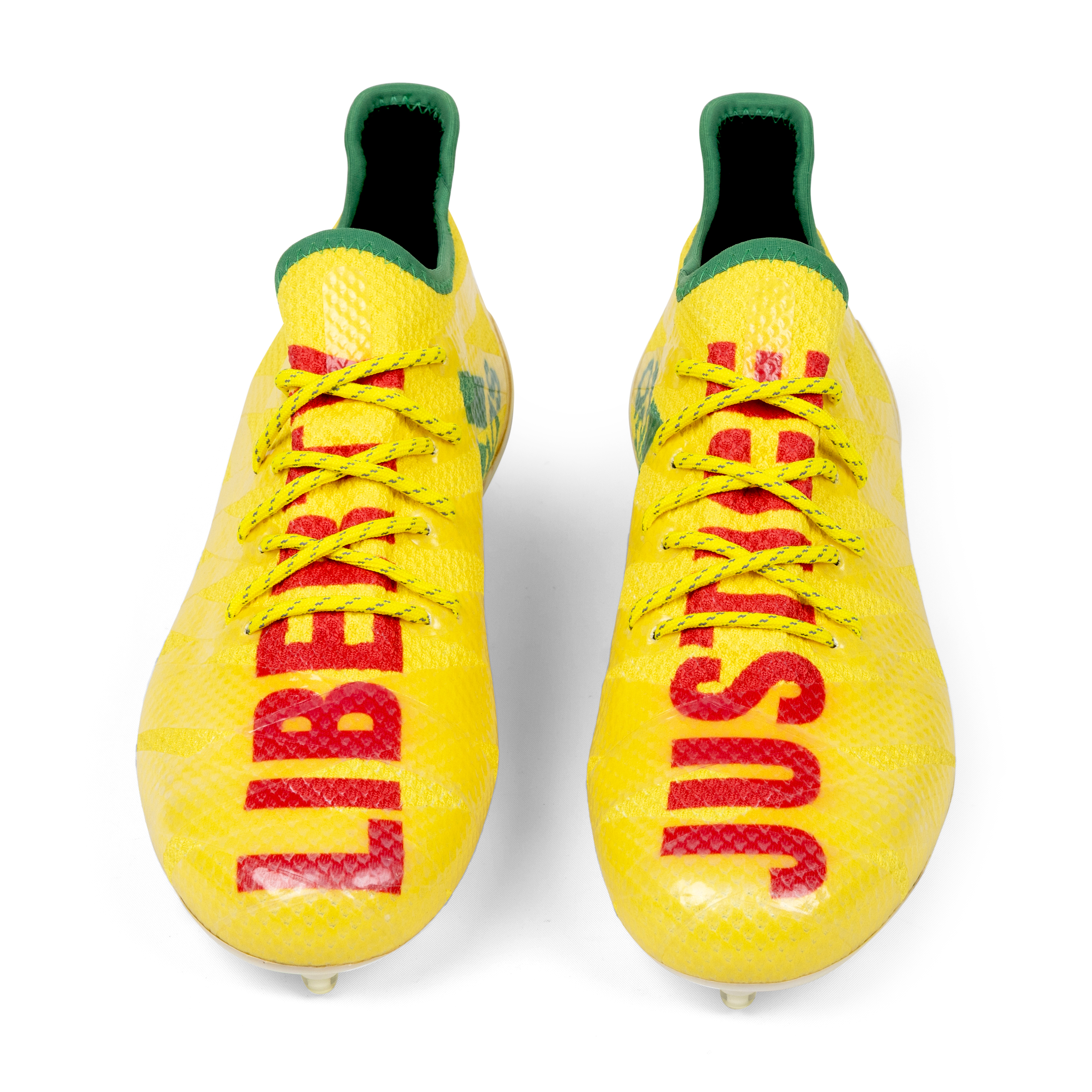 Produced through adidas’s innovative Speedfactory program, these football cleats showcase Pharrell Williams’s signature approach to color and message-driven design. The uppers are primarily yellow, accented by vivid red and green details that infuse the silhouette with visual energy and symbolic meaning.