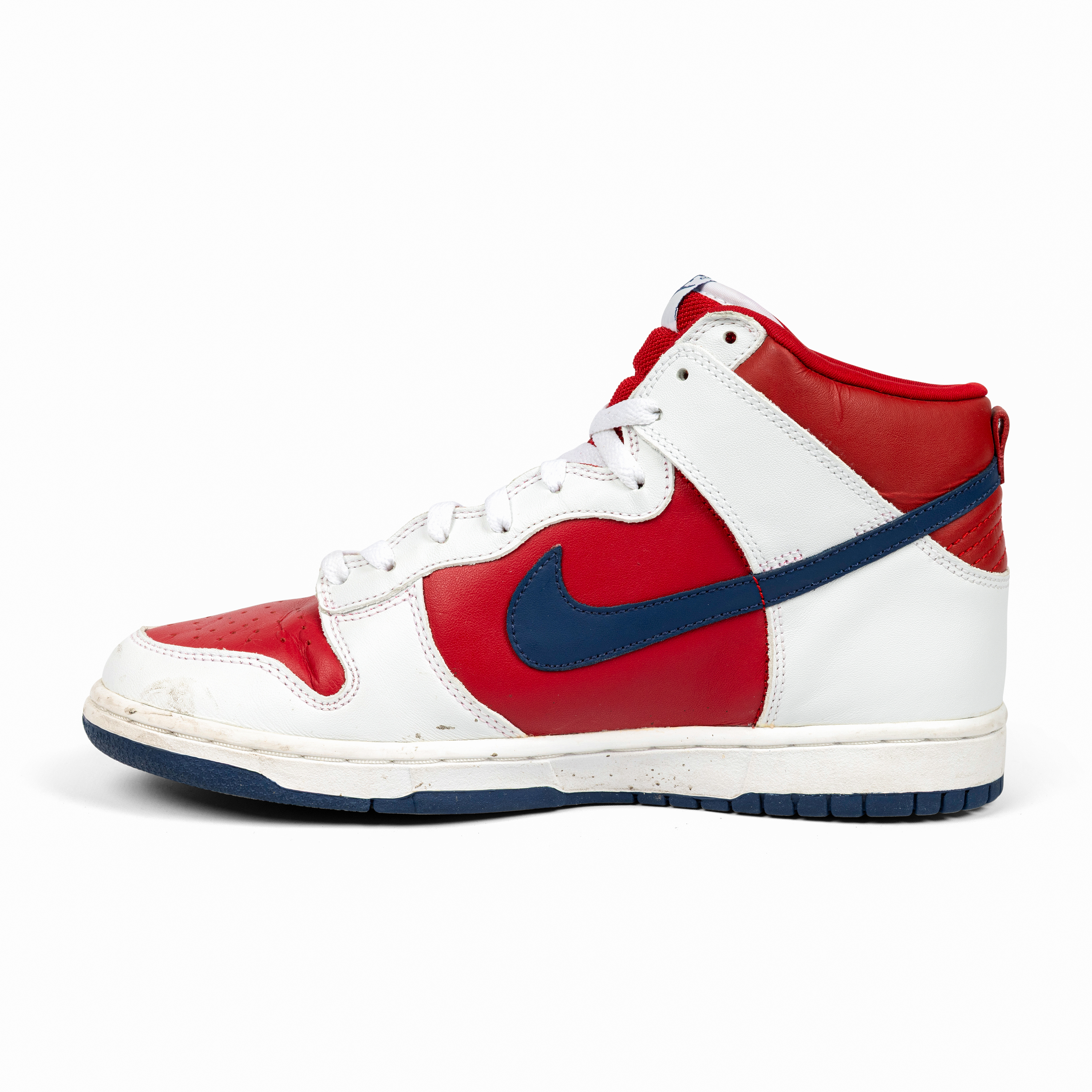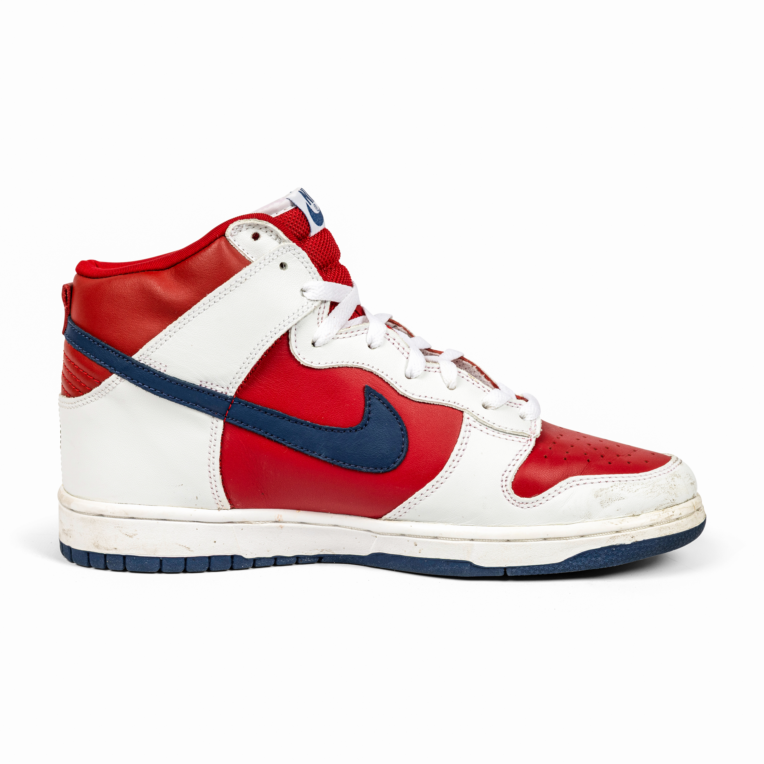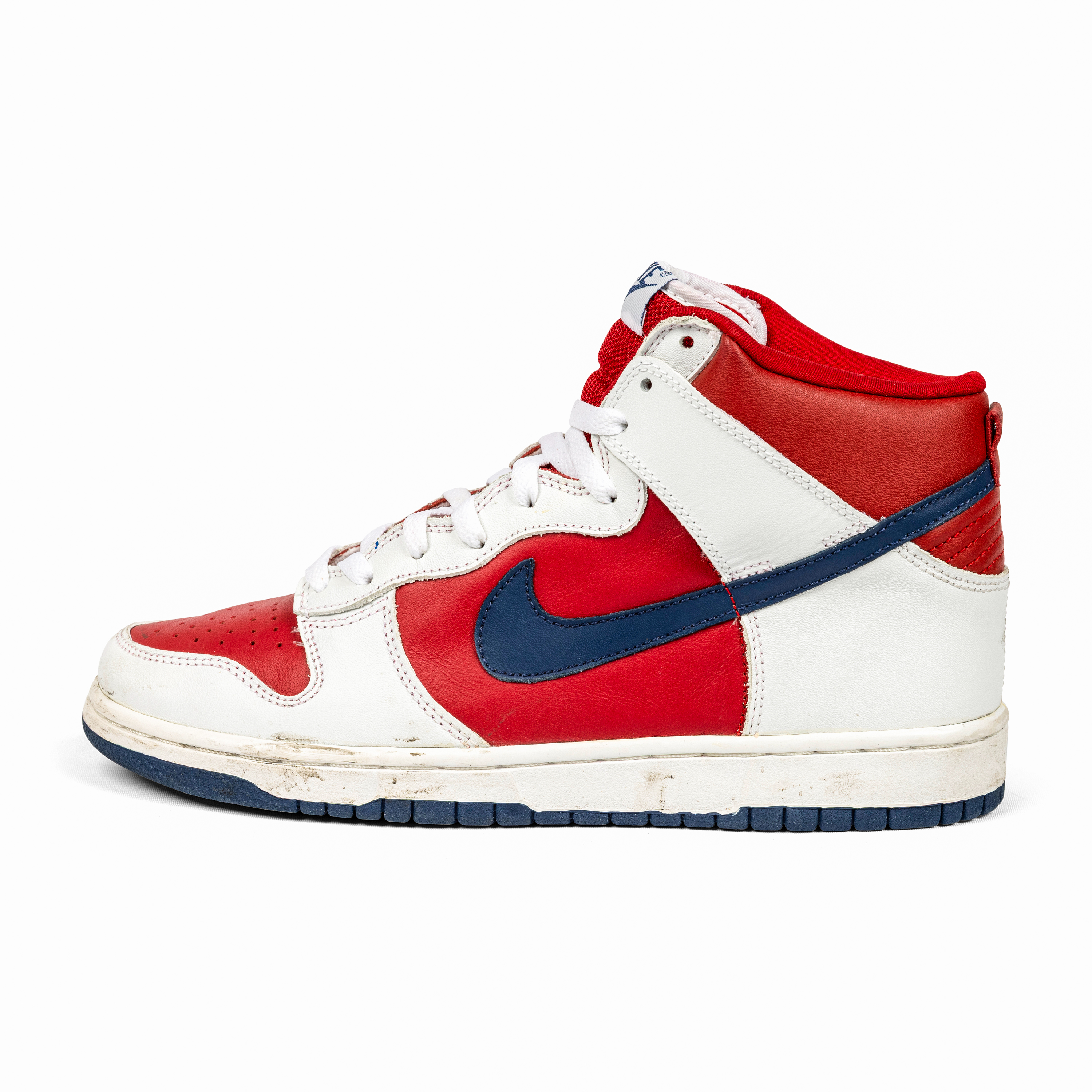 Released in 2002, the Nike Dunk High “Rapid Varsity Red” captures the energetic, experimental spirit of early-2000s colorways. The combination of red and white leather uppers, accented by blue swooshes and outsoles, gives this pair a vibrant, athletic appeal rooted in Dunk heritage.