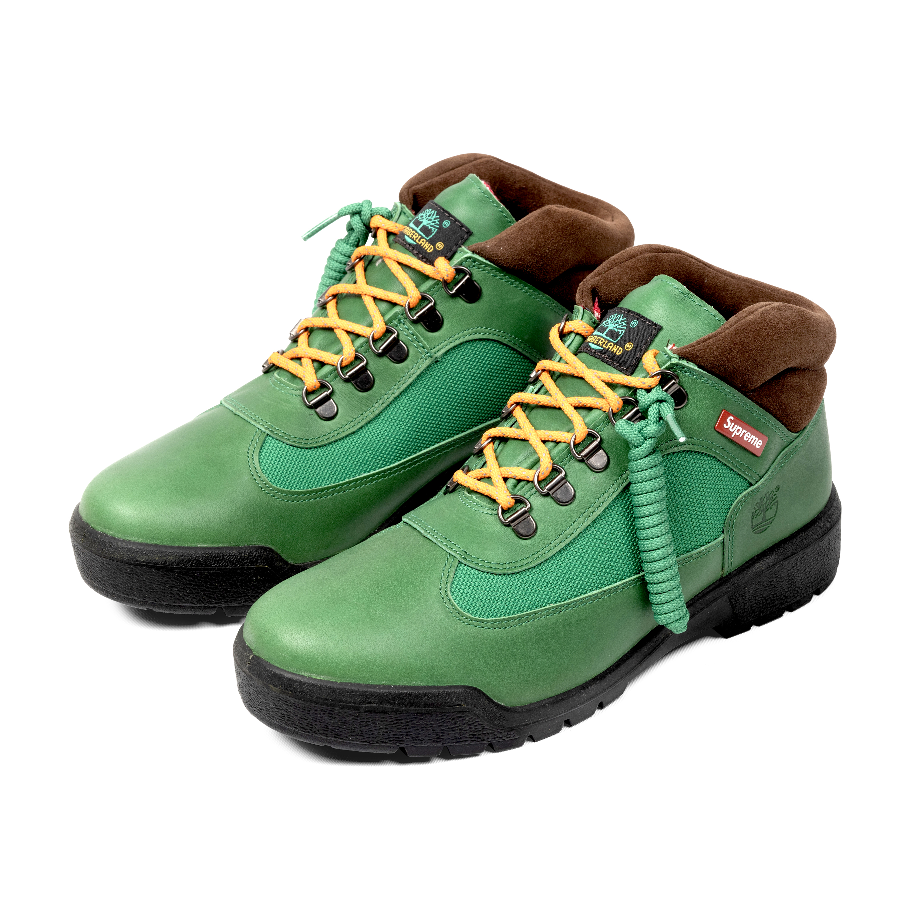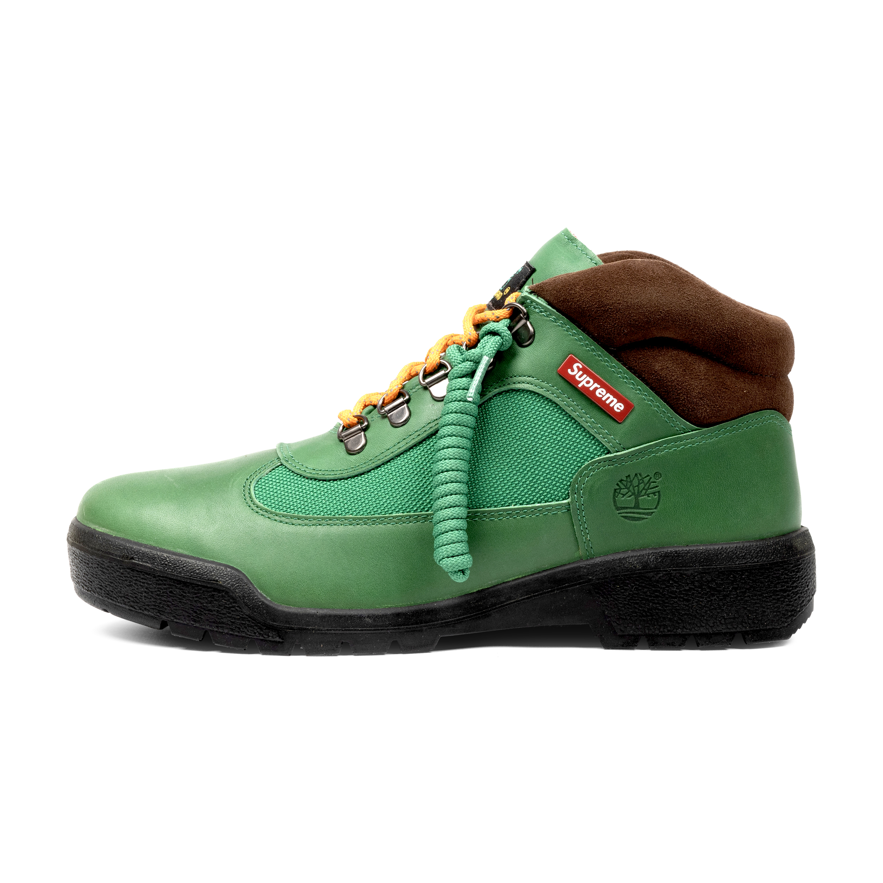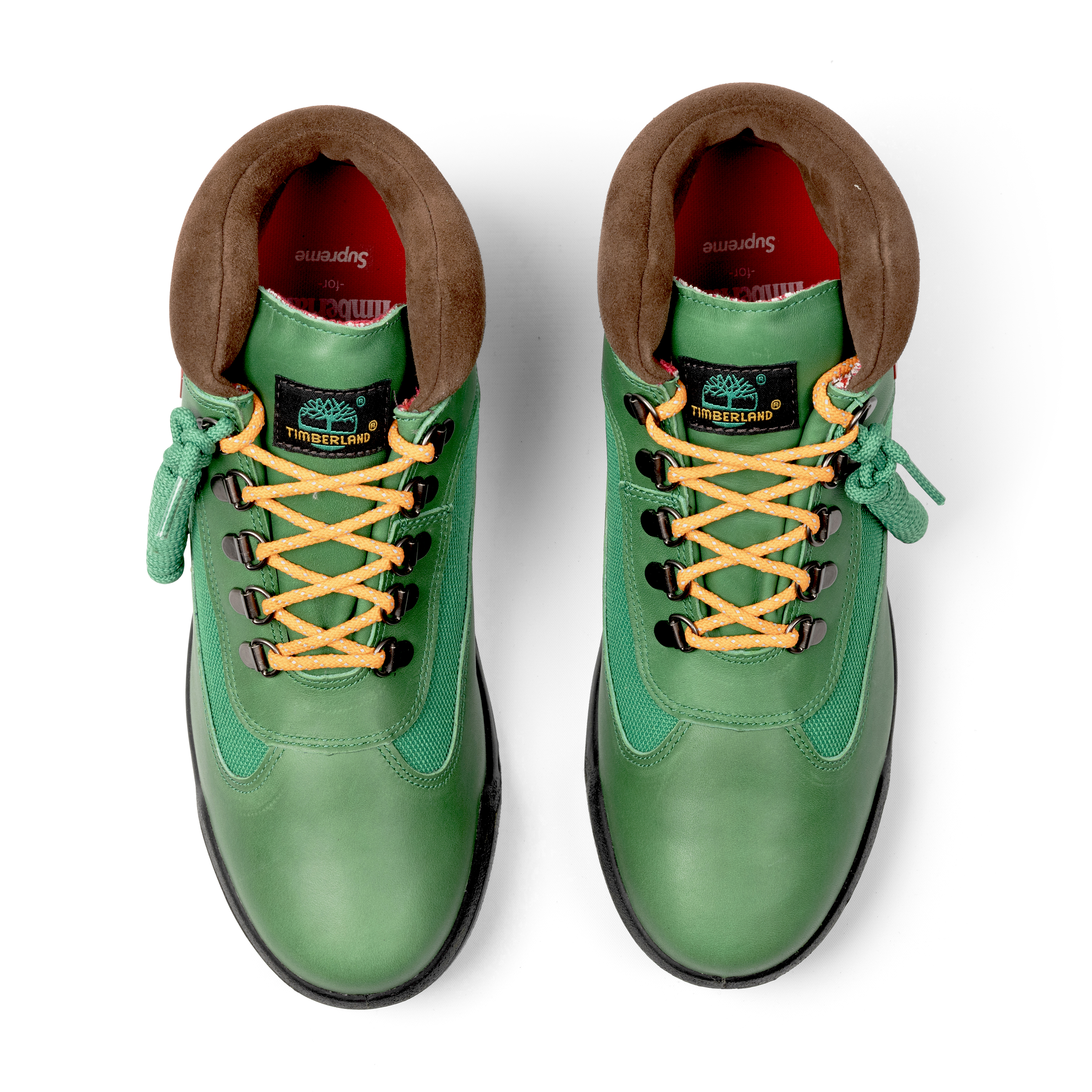 A bold reinterpretation of Timberland’s heritage hiking silhouette, this Supreme collaboration features a vivid green leather upper contrasted by orange laces and a deep brown padded collar. Blending utilitarian craftsmanship with streetwear flair, the design preserves Timberland’s rugged DNA while infusing it with Supreme’s unmistakable color-forward, urban sensibility. The result is a hard-to-find release that perfectly captures the intersection of function, fashion, and cultural influence.