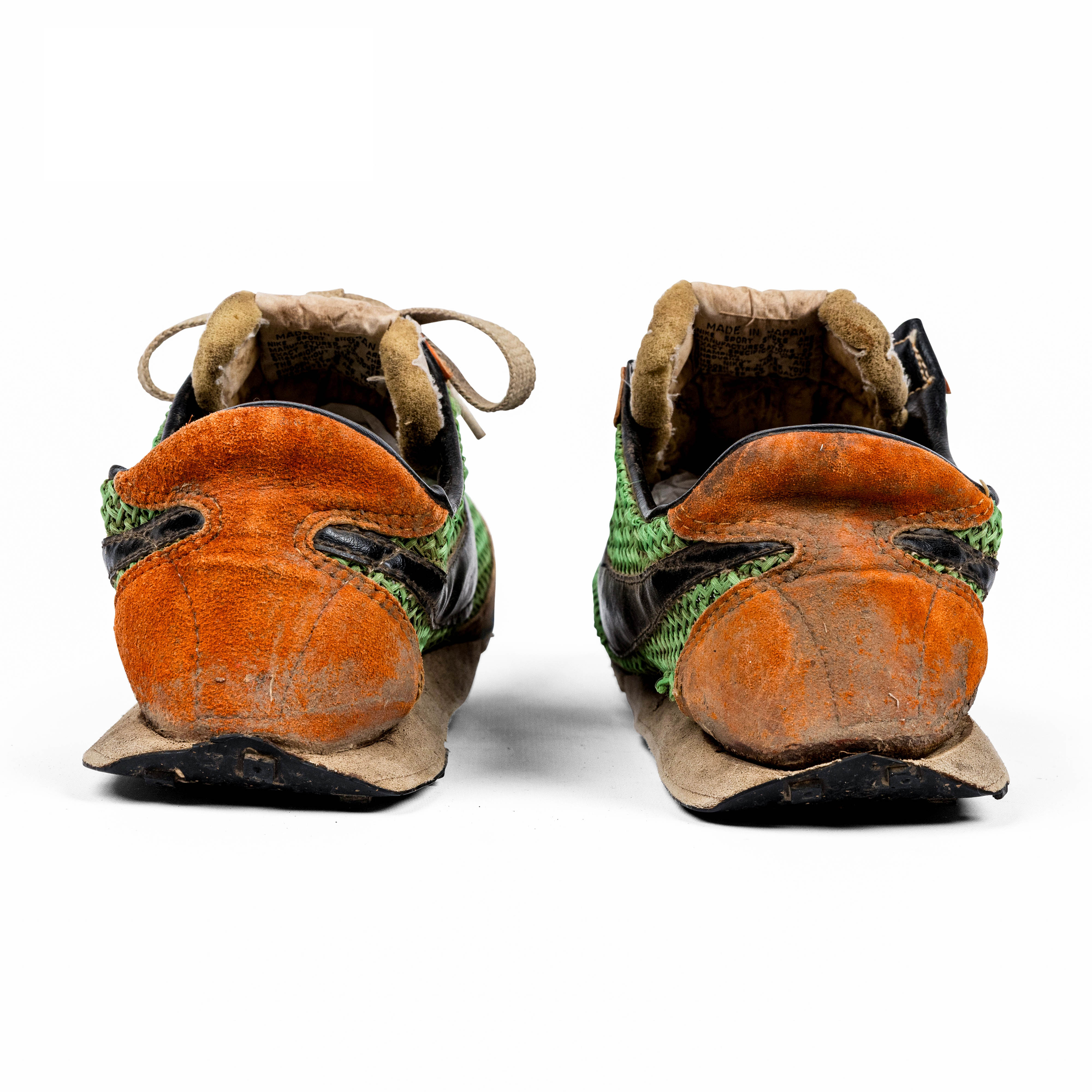 Rendered in green and orange with black Swooshes, the spikes feature lightweight mesh uppers designed for breathability and speed. The tongues retain Nike’s original lowercase cursive logo, a hallmark of the brand’s earliest production era. One shoelace is absent from the right shoe. The soles are especially significant: track spikes at the forefoot are paired with Nike’s pioneering waffle tread at the heel, representing the company’s first major technological innovation.