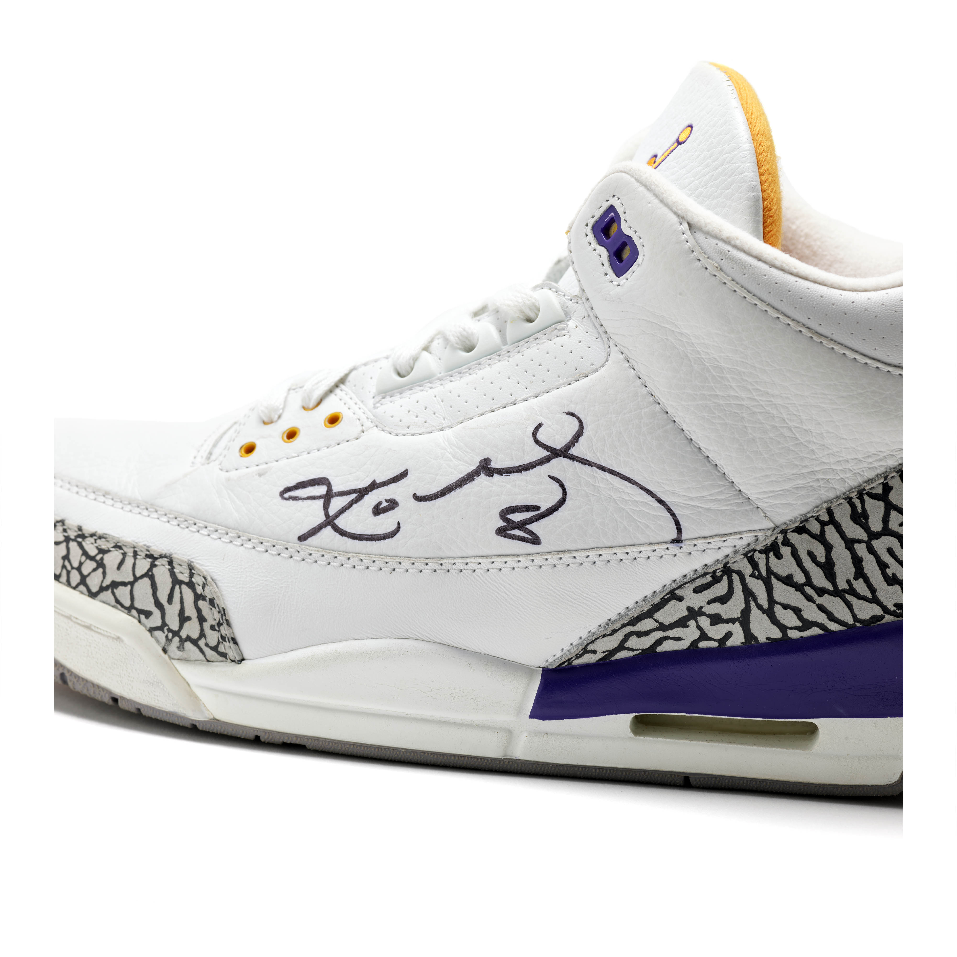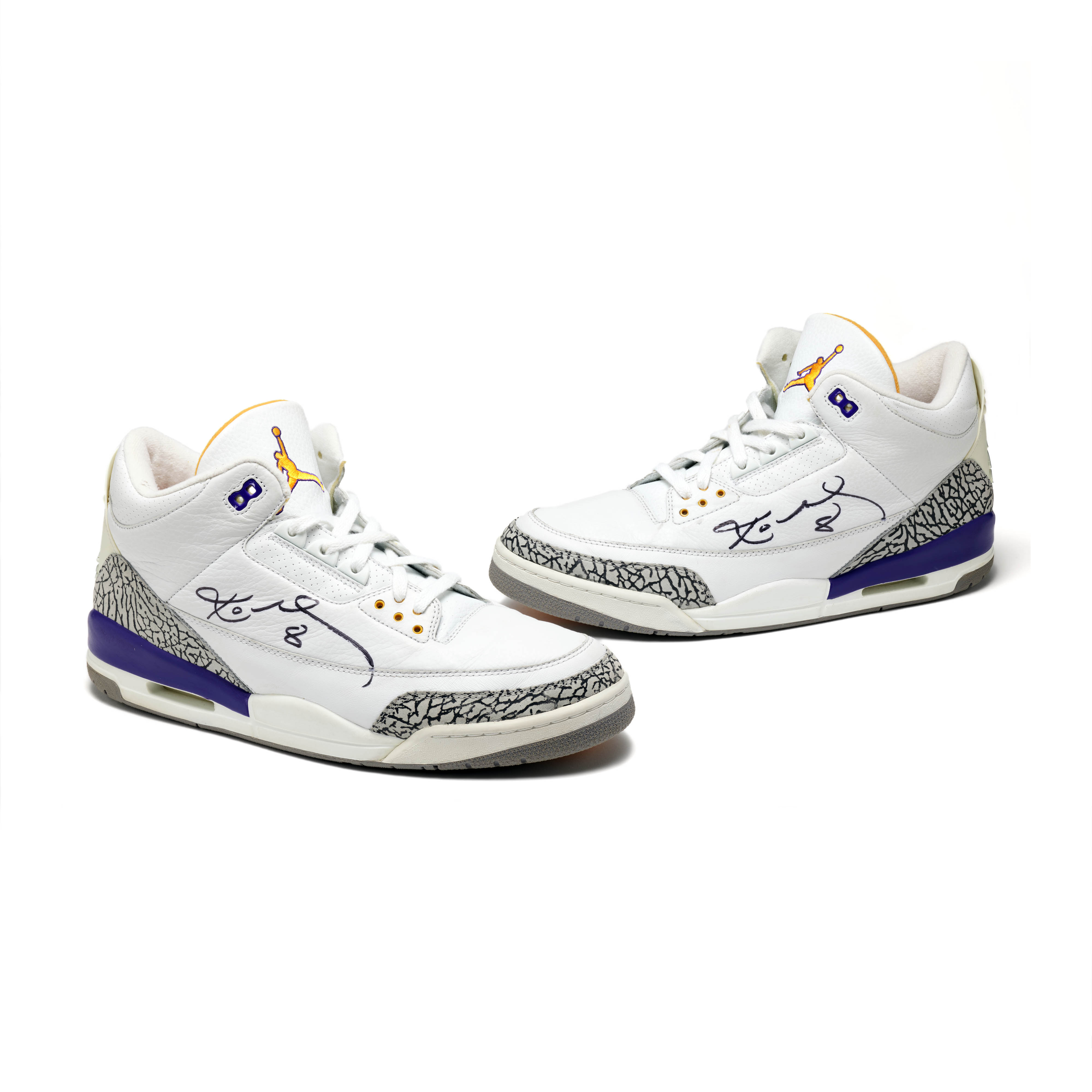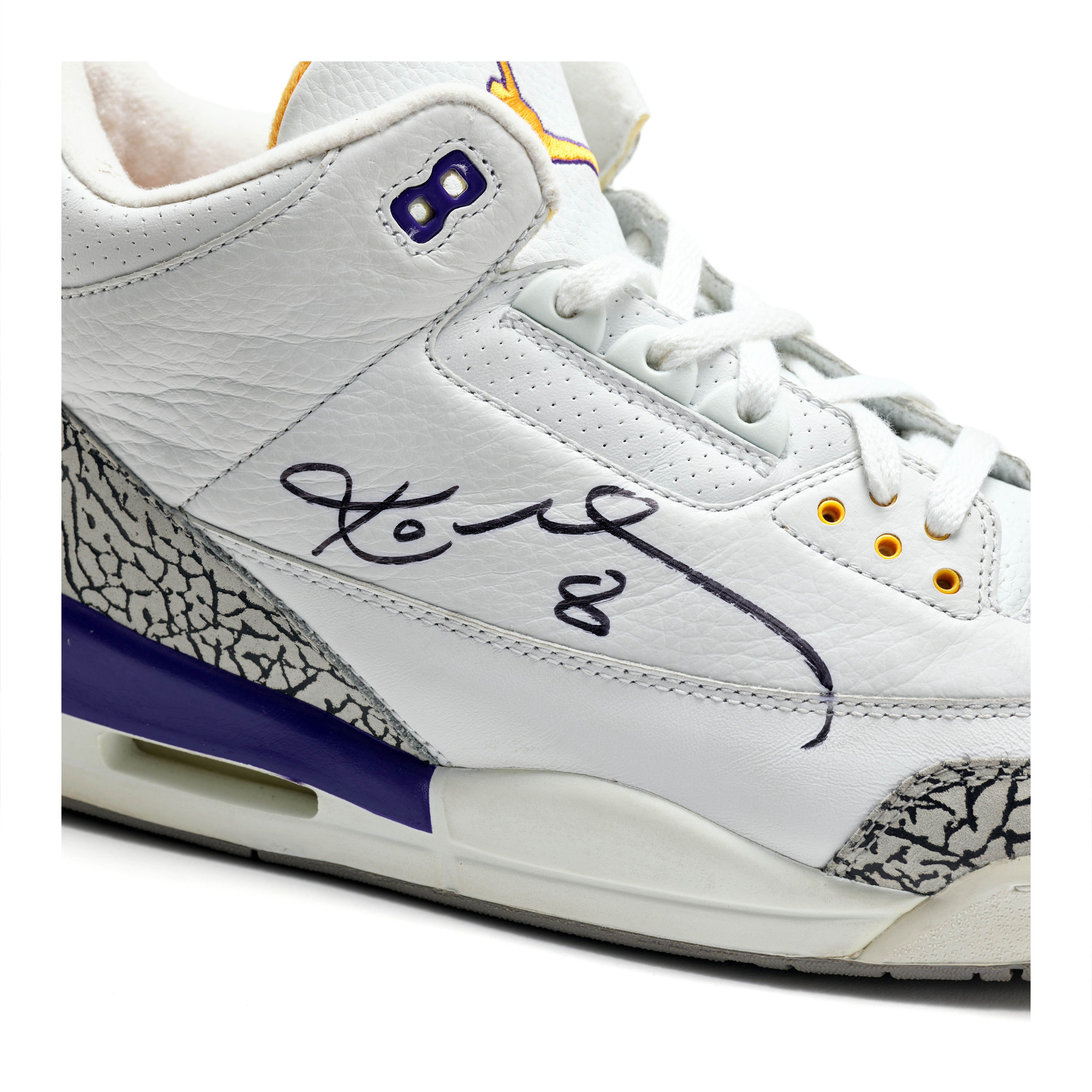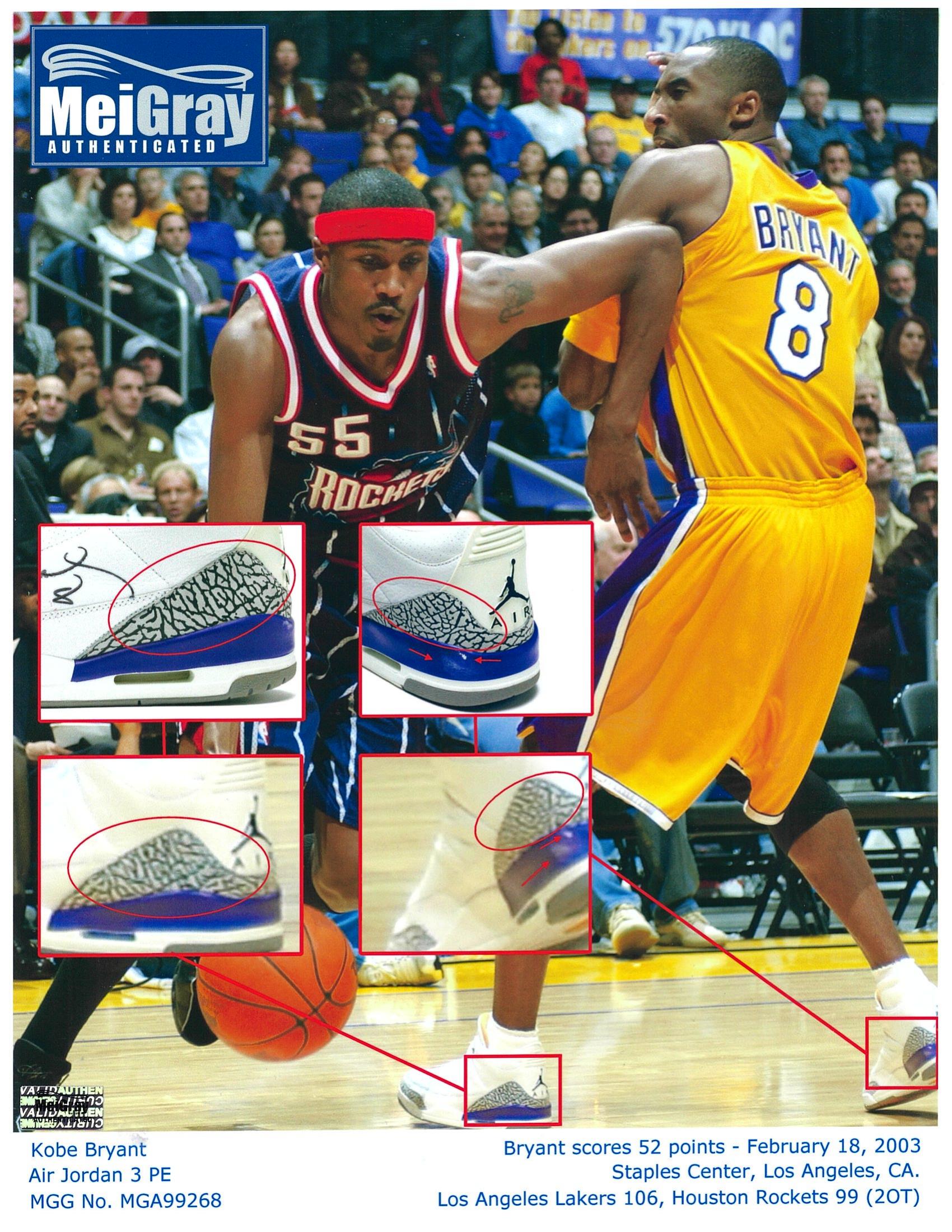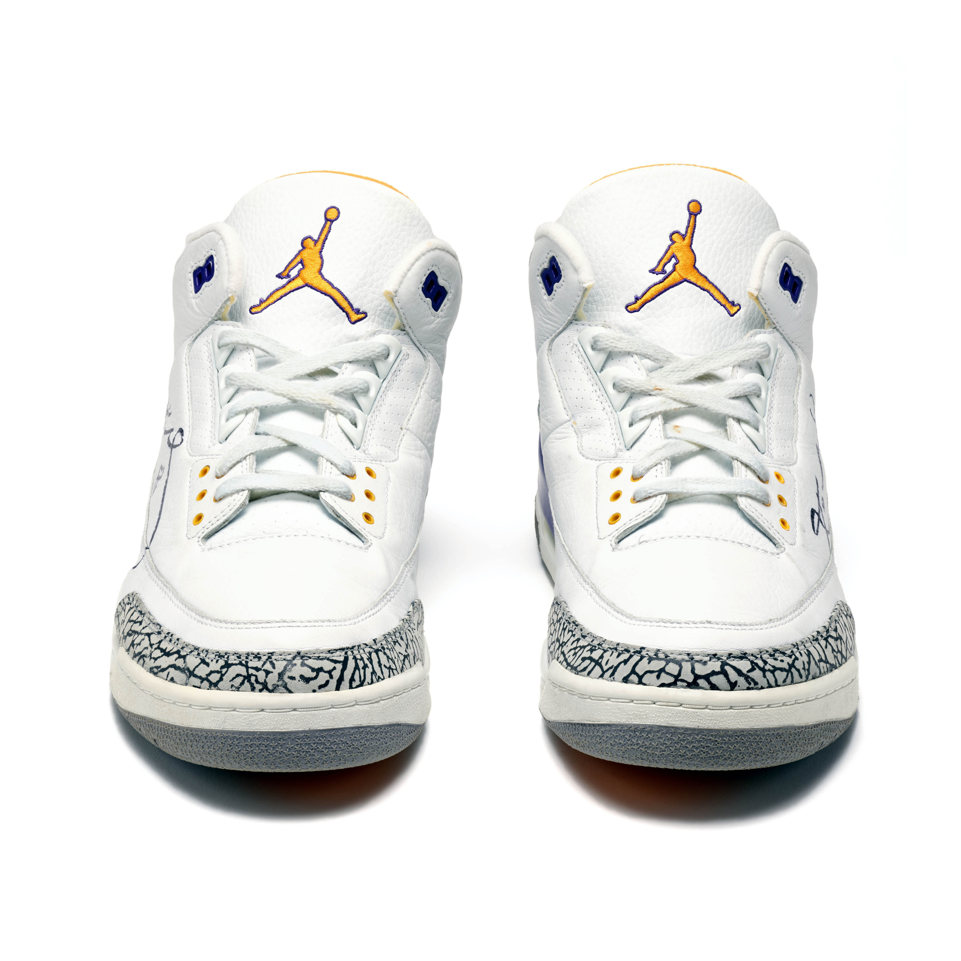 Bryant wore Air Jordan III Player Exclusives in eight home games at Staples Center between February 14 and April 24, 2003. The pair offered here was worn during the first two games of that sequence, including the historic 52-point double-overtime performance.