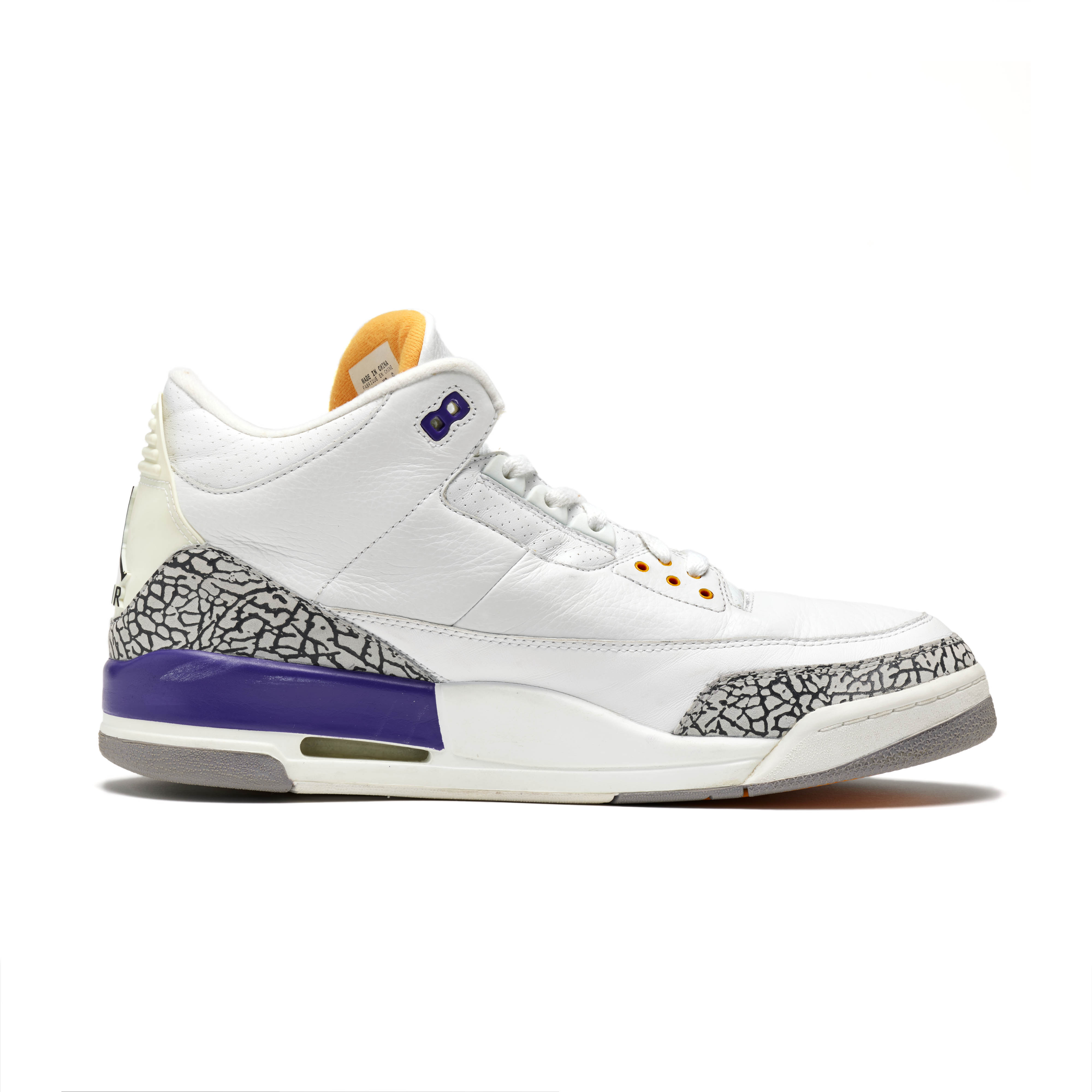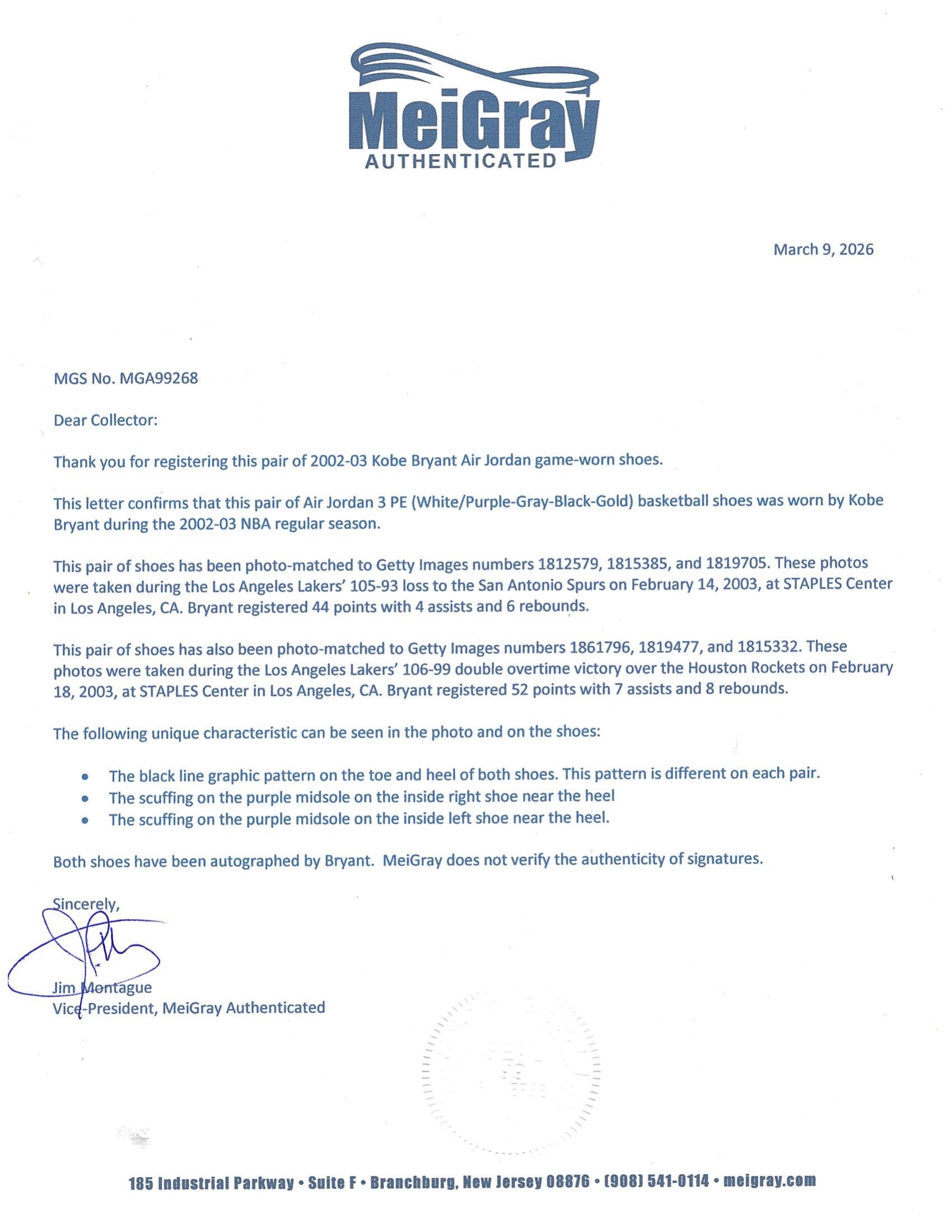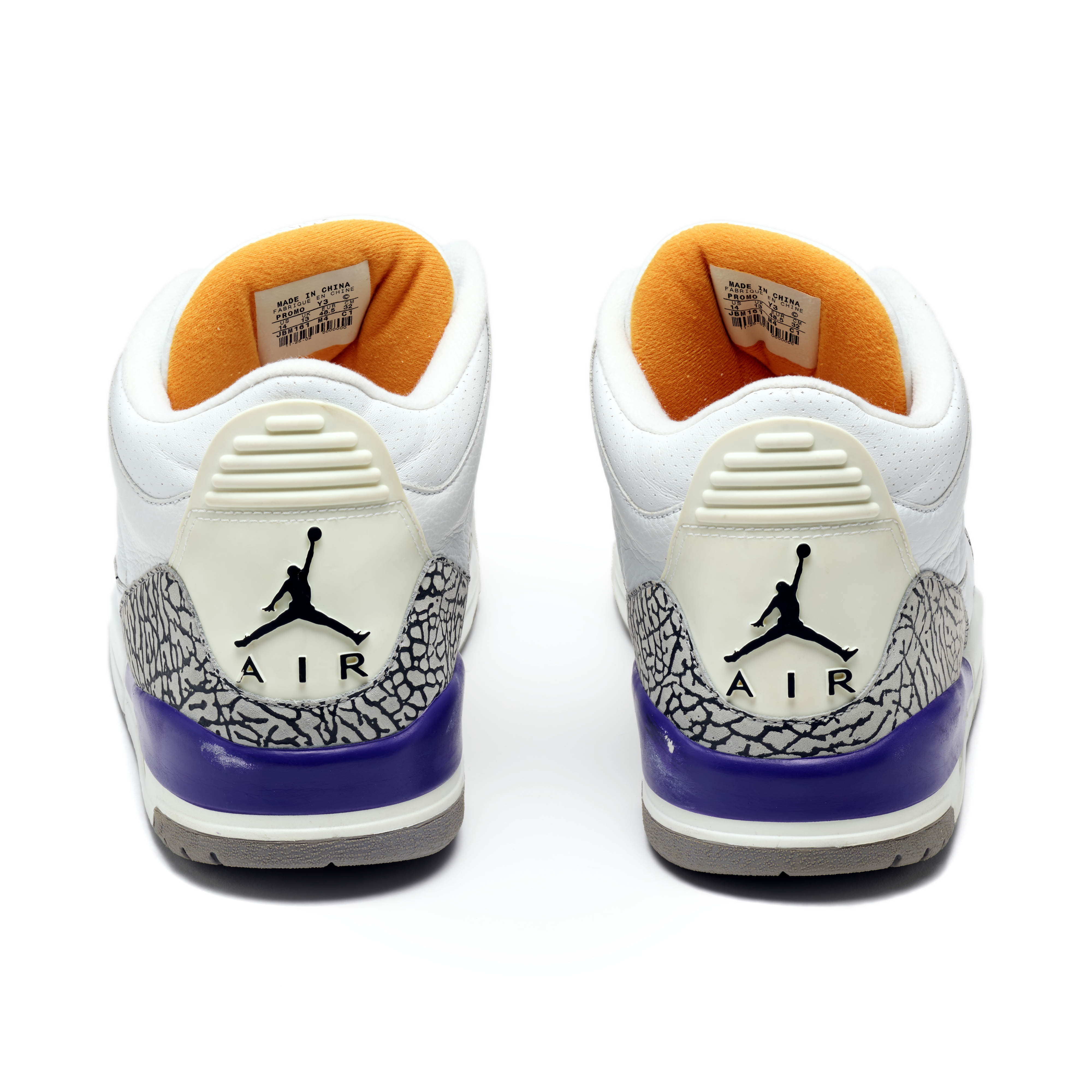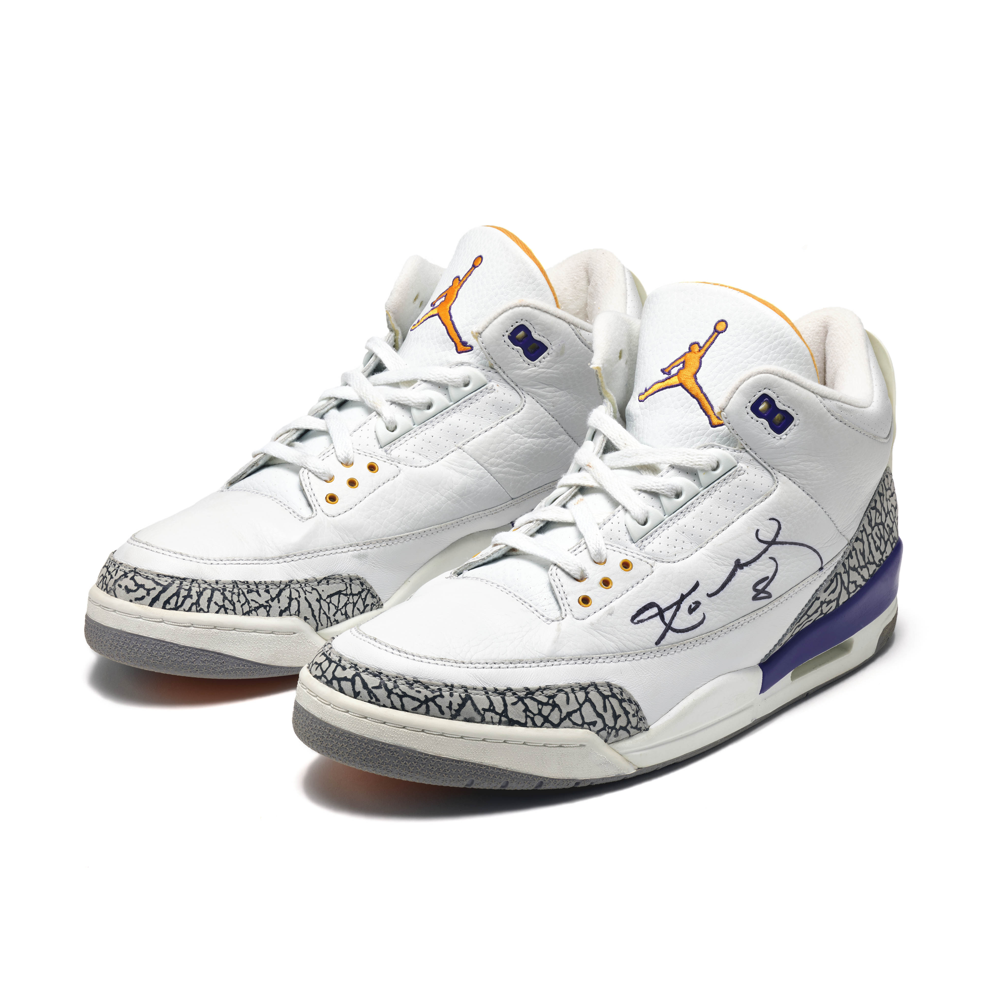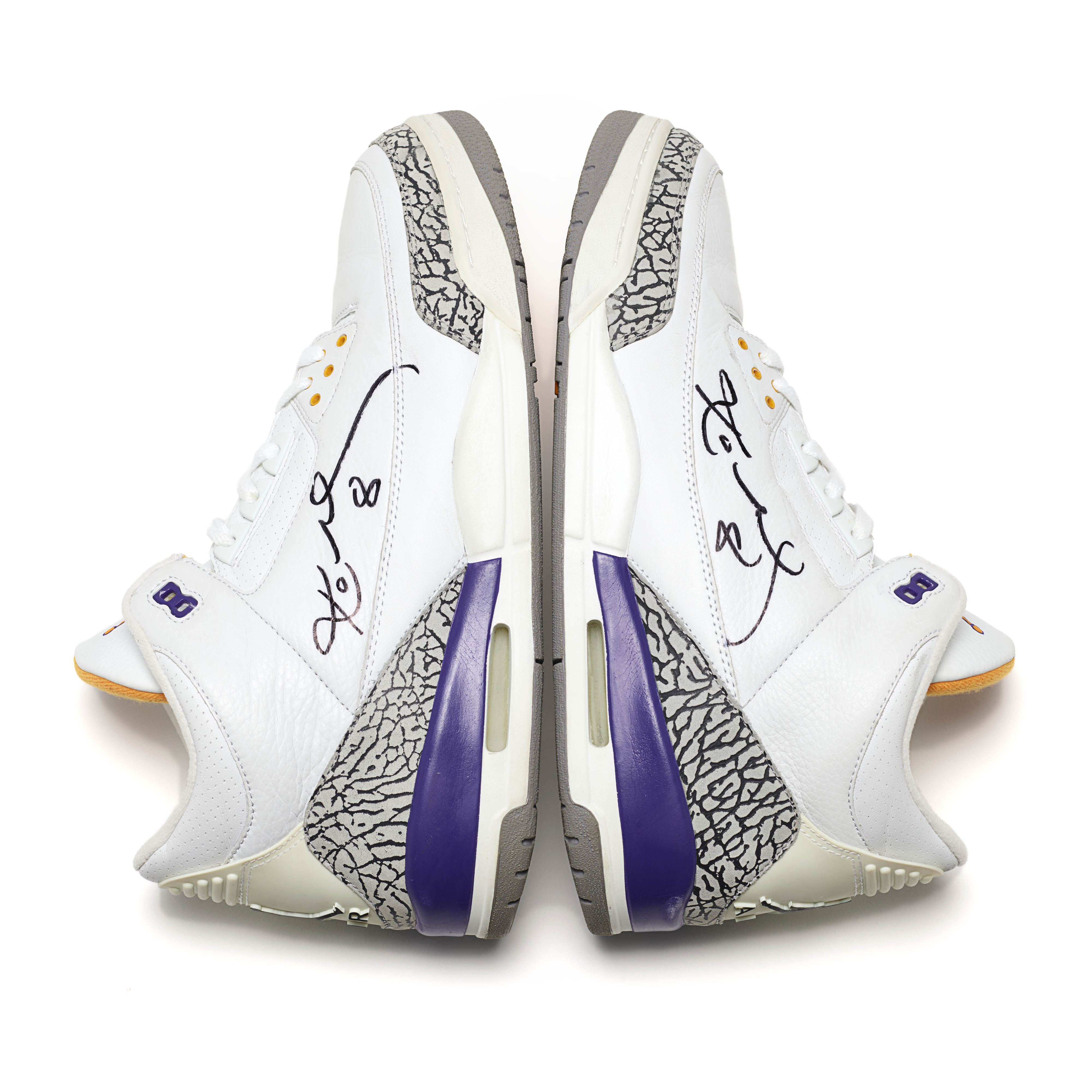 Bryant wore Air Jordan III Player Exclusives in eight home games at Staples Center between February 14 and April 24, 2003. The pair offered here was worn during the first two games of that sequence, including the historic 52-point double-overtime performance.