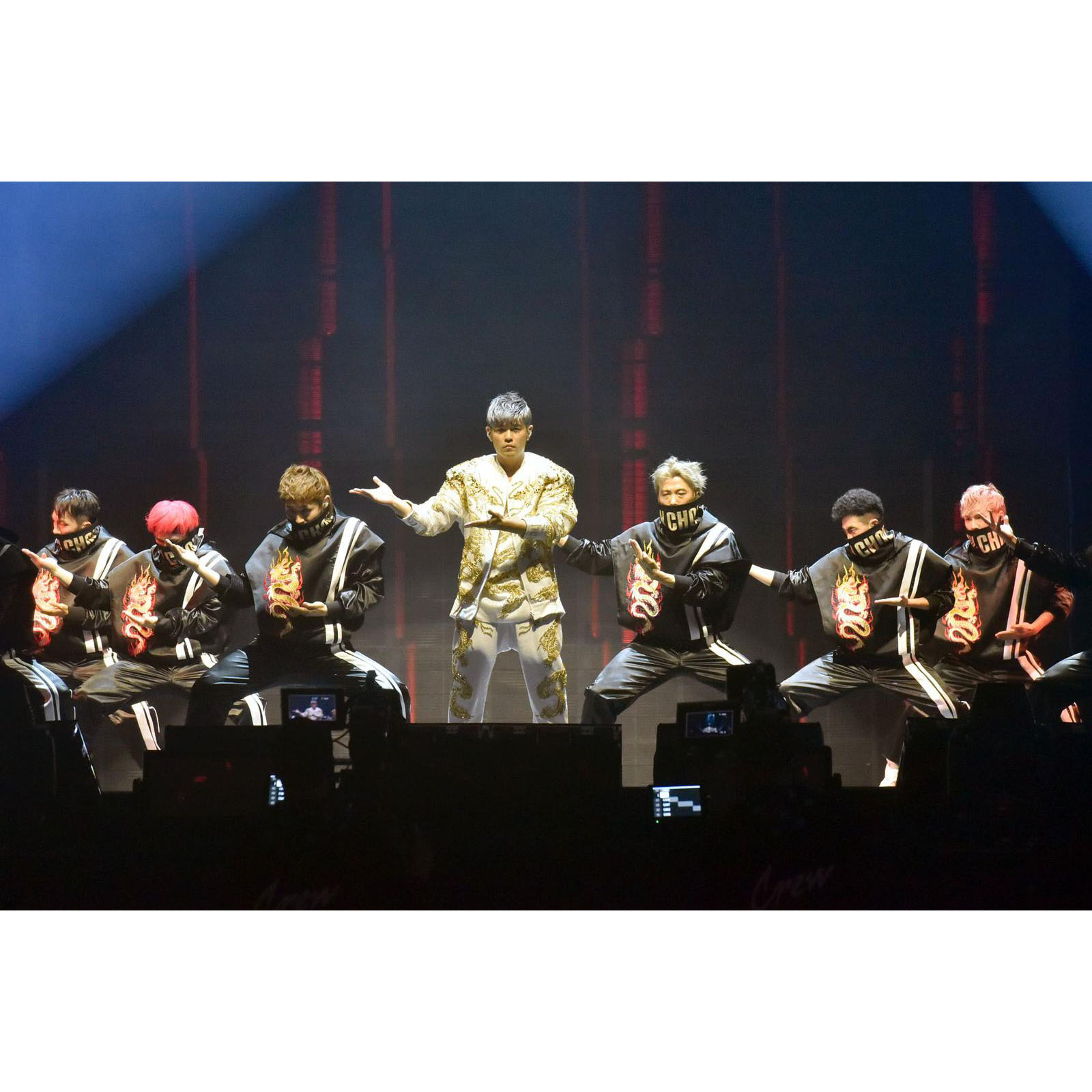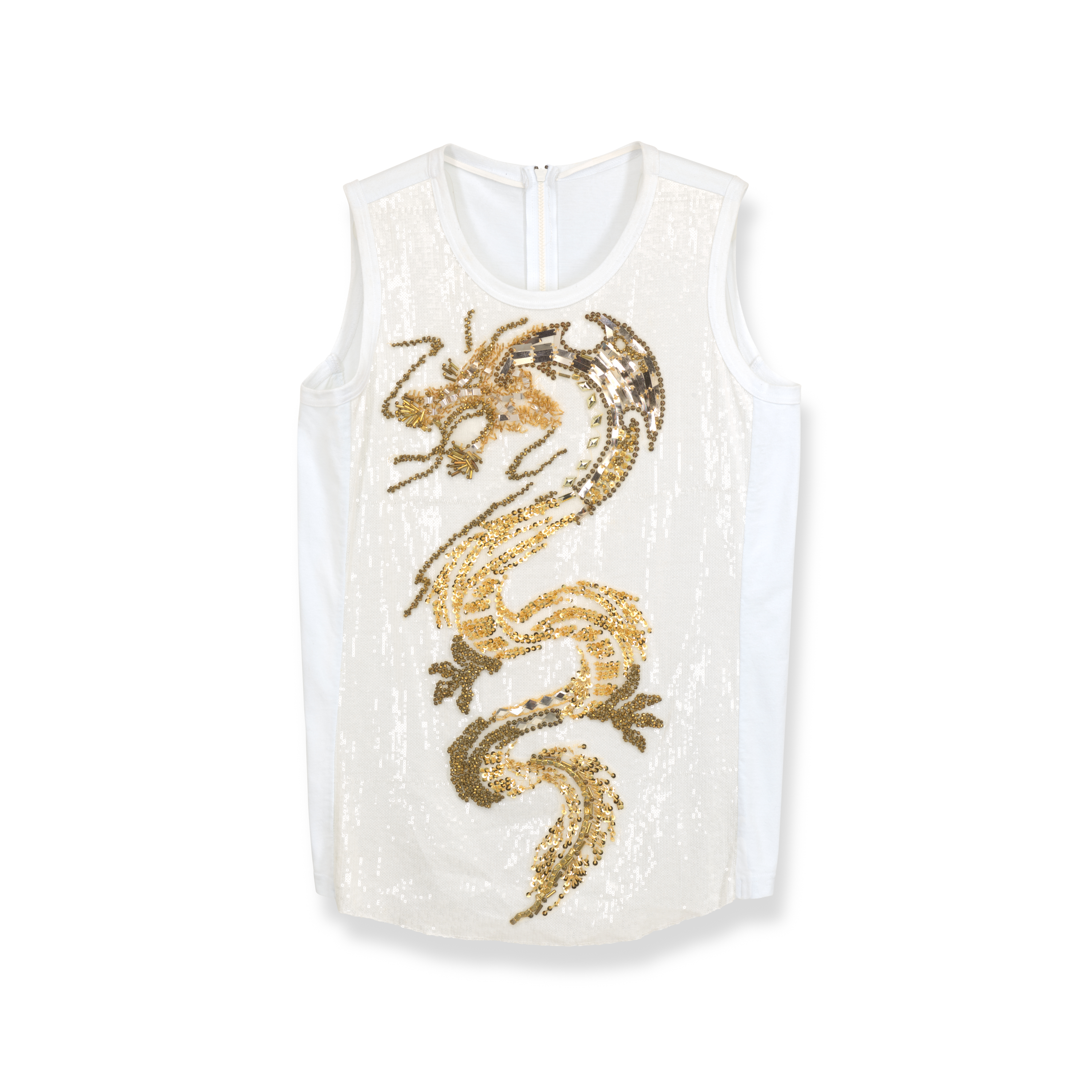This custom designed sleeveless performance top captures the bold elegance and theatrical flair characteristic of Jay Chou’s stage attire. Made in shimmering white sequins, the front is adorned with a singular gold sequin dragon at its center, a striking emblem of strength and artistry. The back, crafted in soft cotton, provides contrast and comfort, allowing freedom of movement under stage lights. A full length zipper runs down the back, designed for quick changes during performance. Worn by Chou during the first phase of the Carnival World Tour (2019-2020), this piece balances brilliance with practicality, embodying the refined craftsmanship and commanding presence that define his performances.