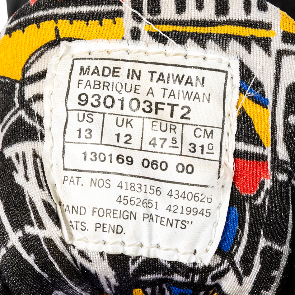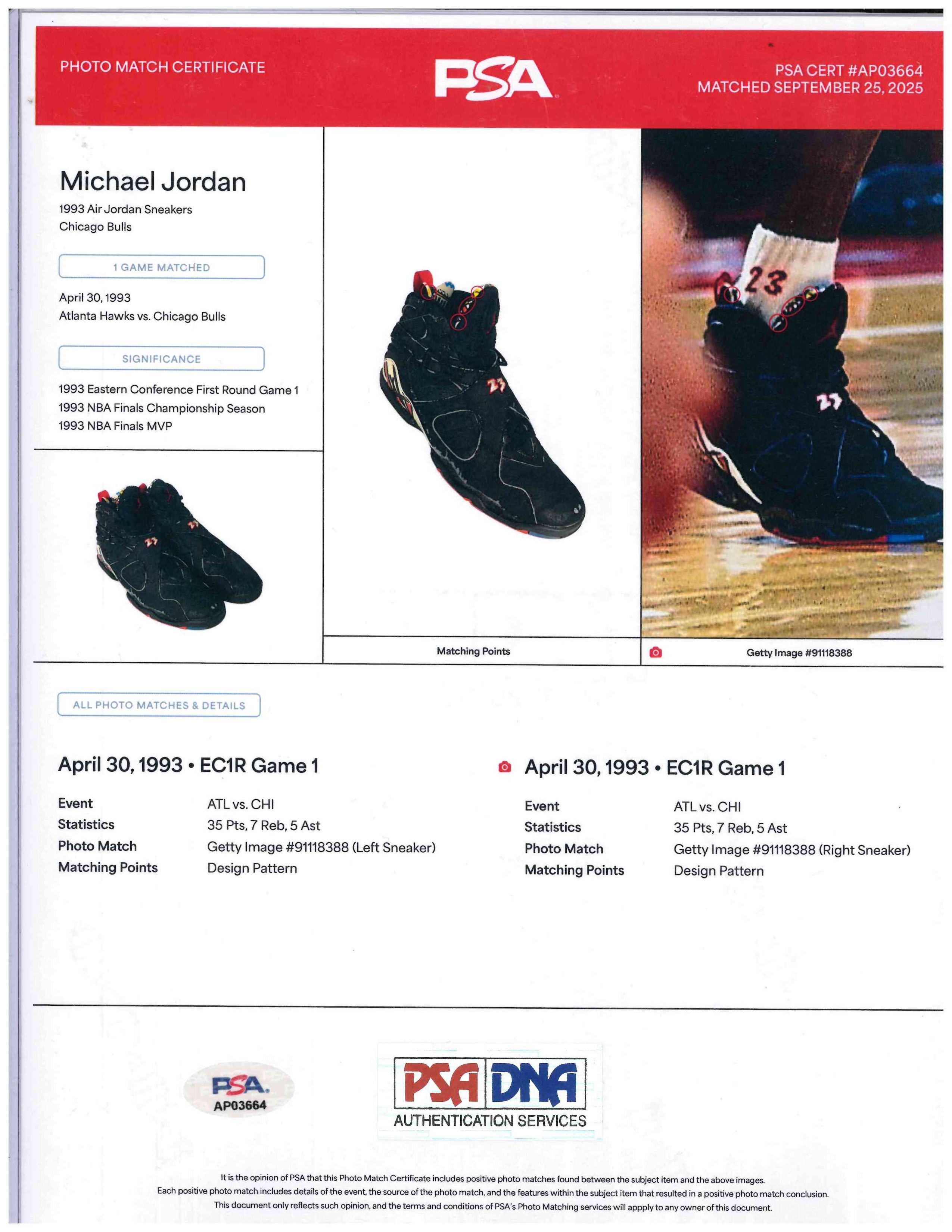 Designed by Tinker Hatfield, the Air Jordan 8 is distinguished by its iconic criss-cross straps, designed to lock Jordan’s feet in place. The shoes feature Michael Jordan’s number “23” across the midfoot and “Air Jordan” on the Velcro closures. The shoes display chenille Jumpman logos on circular carpet patches atop the tongues with nubuck uppers, and white mudguards with black and red geometric detailing. Though the midsoles have deteriorated and the outsoles were reglued to the uppers, the size 13 shoes remain visually striking and well-preserved from Jordan’s 1993 postseason campaign. The shoes are accompanied by a card reading “With the Compliments of Michael Jordan” and have been conclusively photomatched by PSA based on the unique pattern on the underside of the tongues and heels. It is exceptionally rare to find a pair of Michael Jordan’s shoes conclusively photomatched to postseason play.