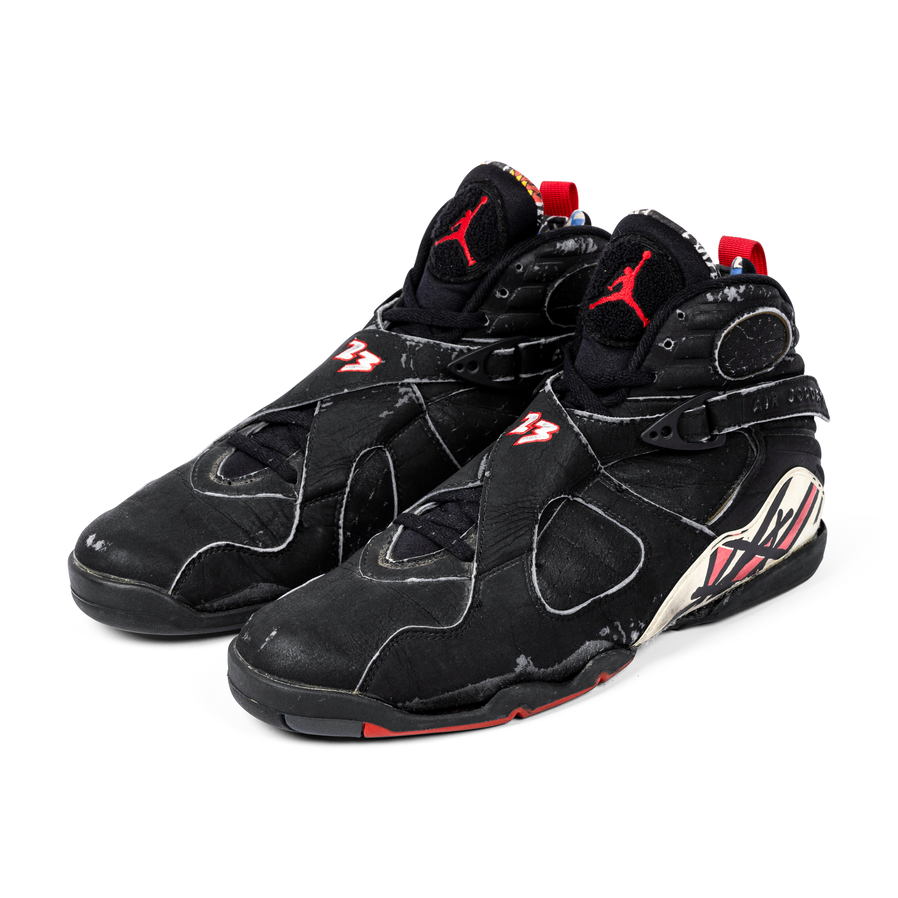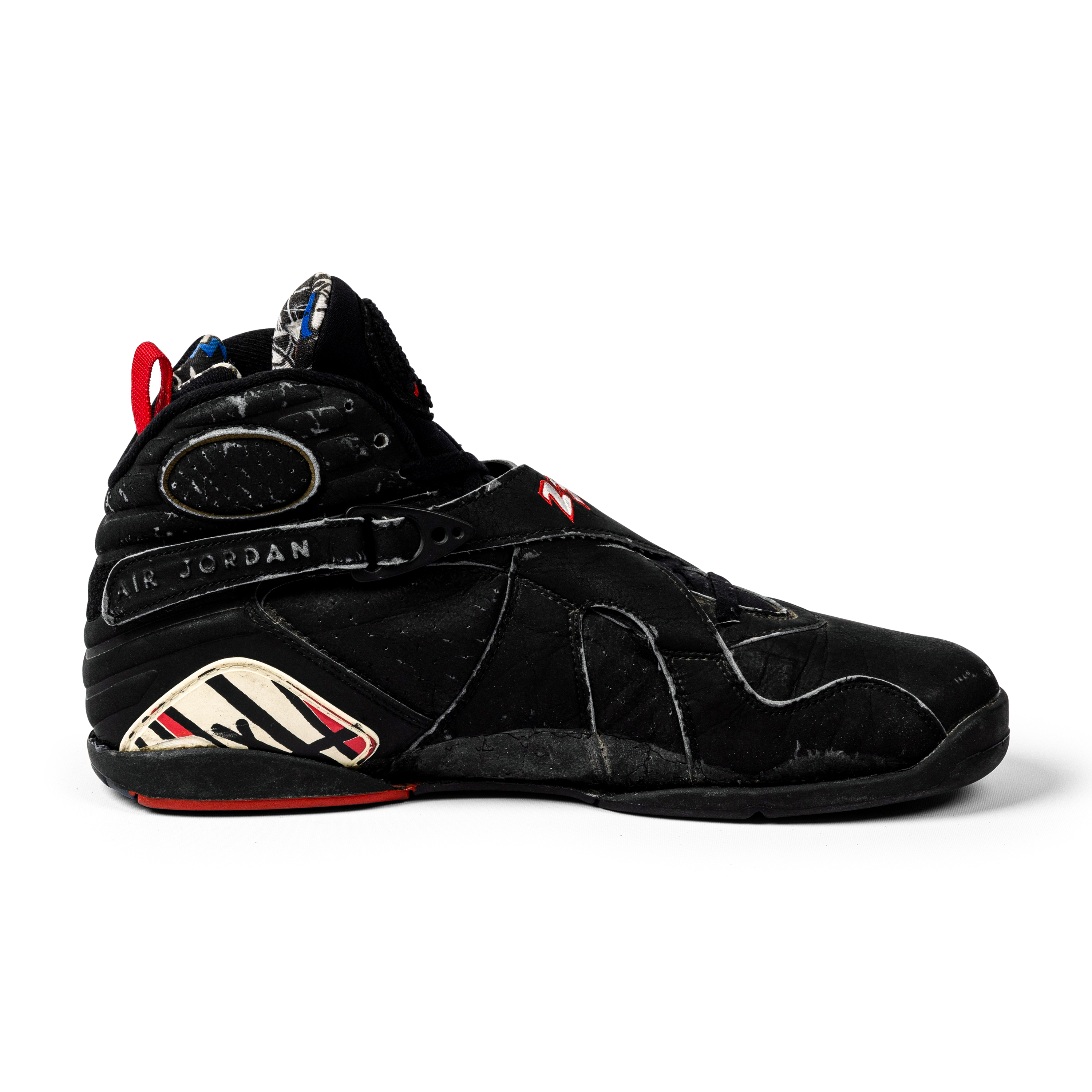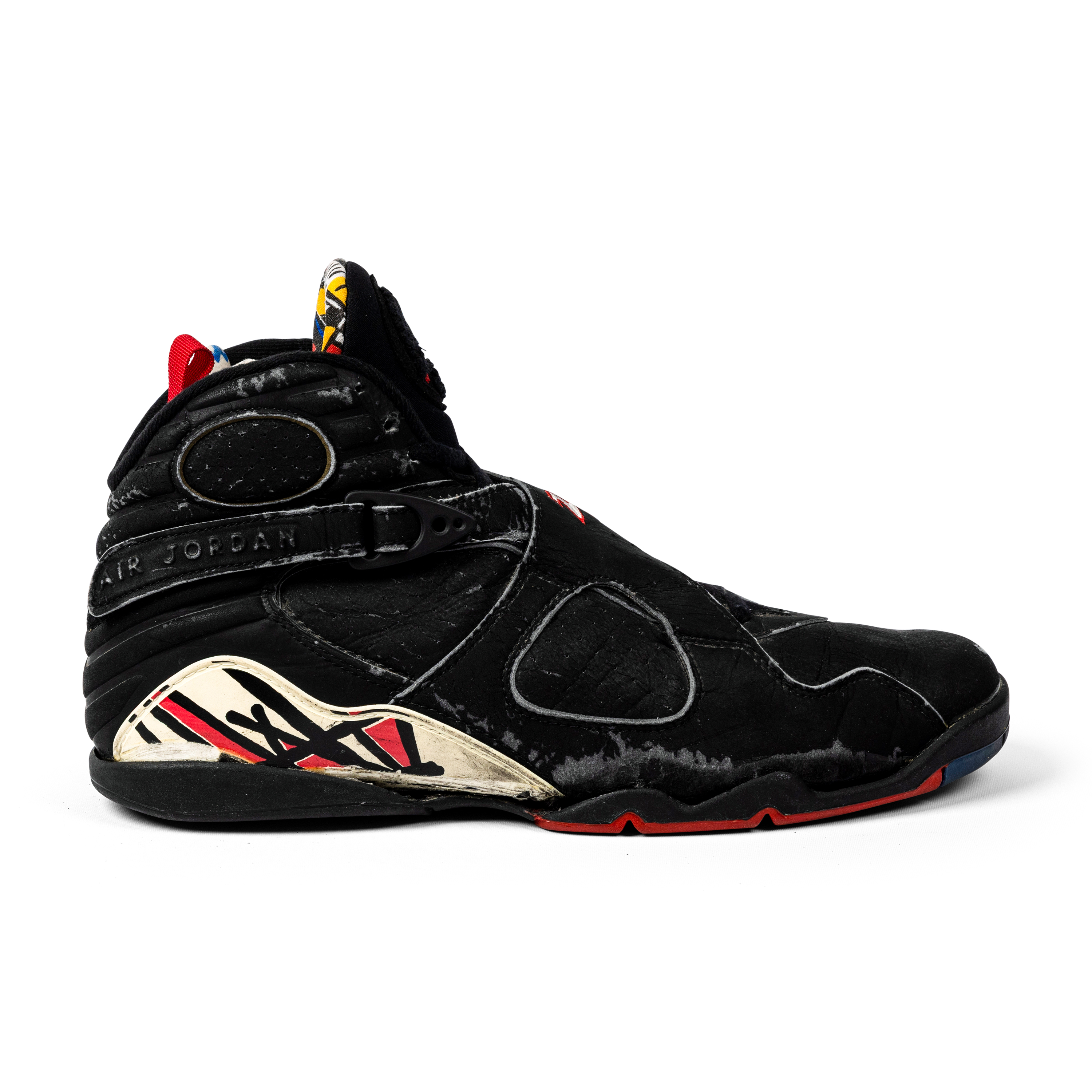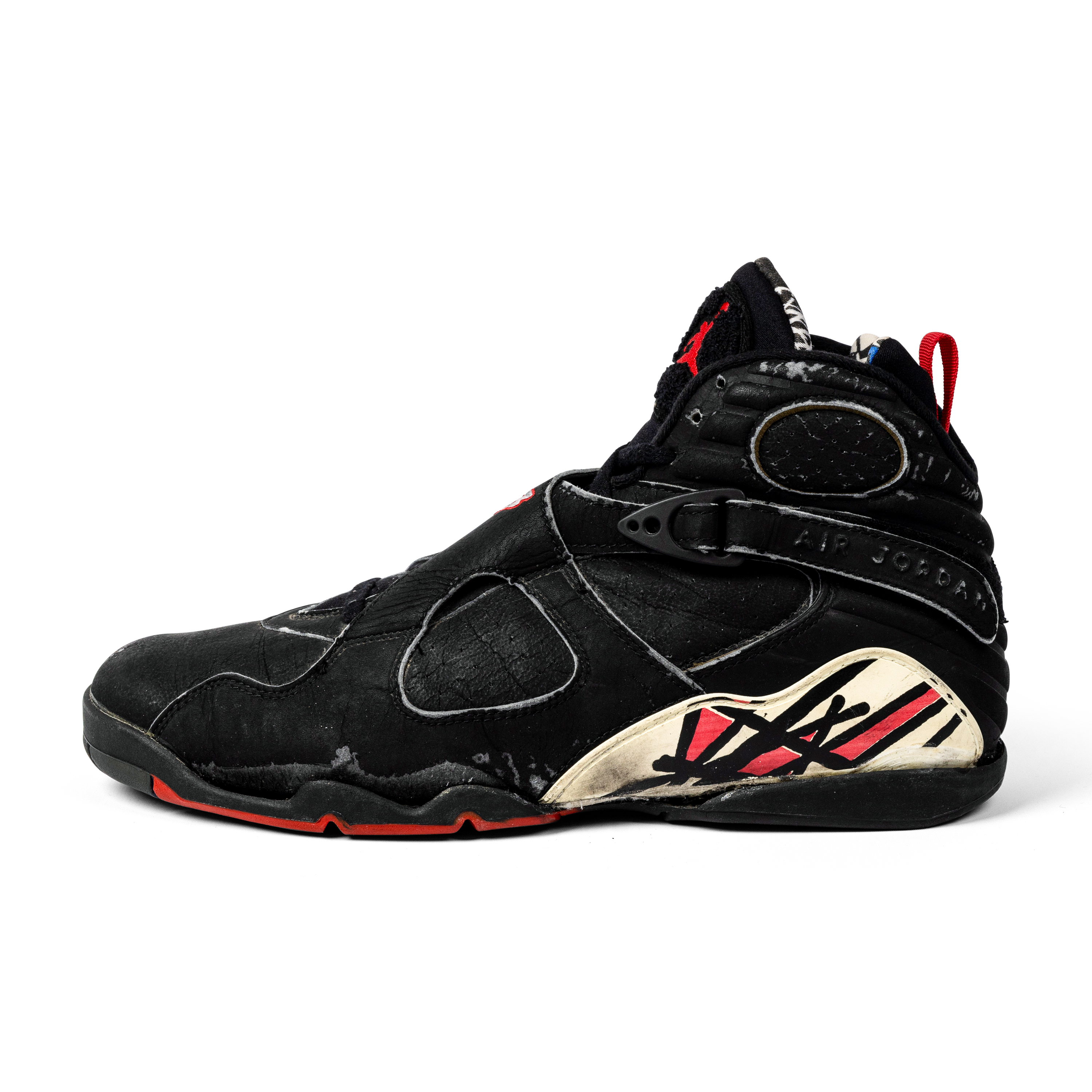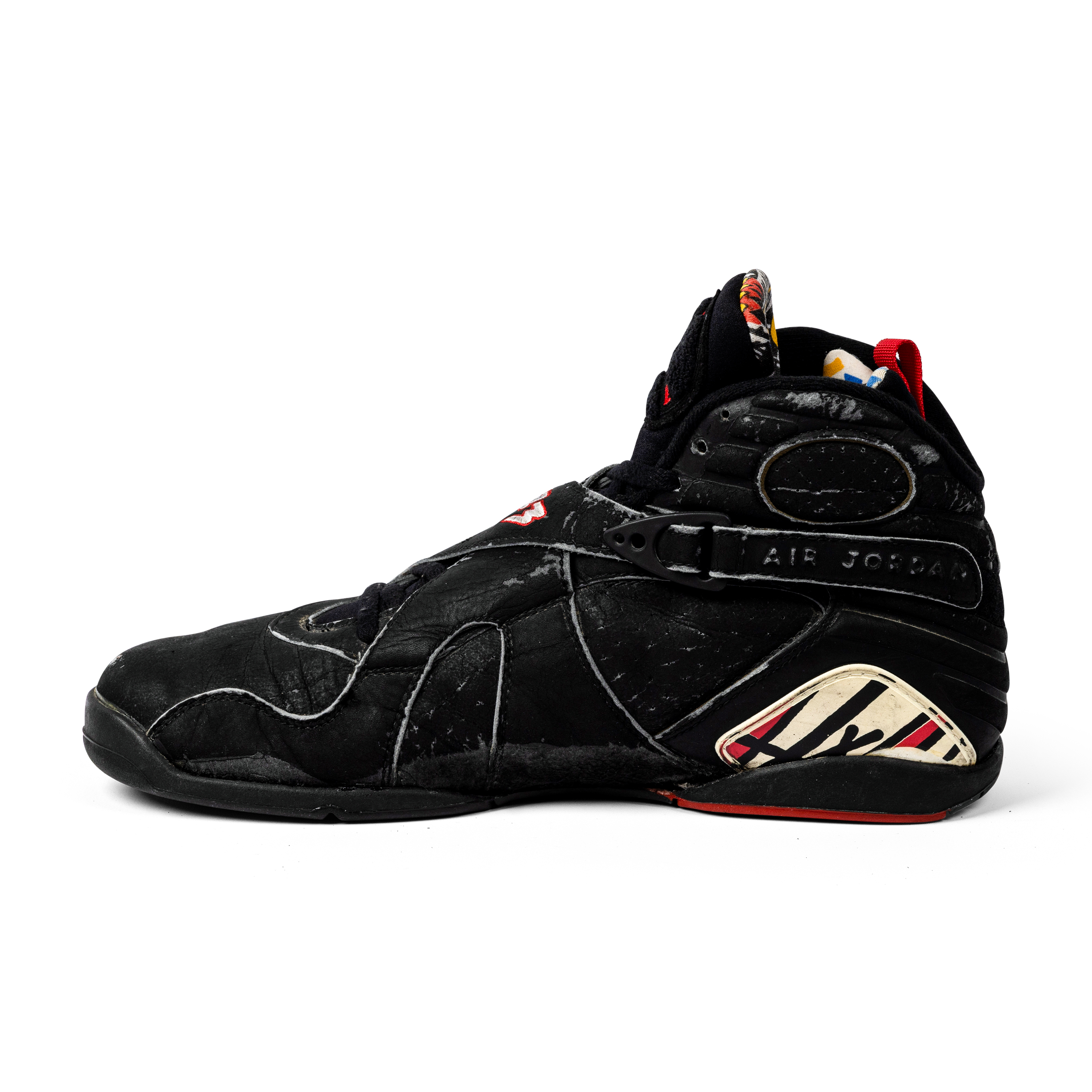 Michael Jordan wore this pair of black Nike Air Jordan 8s on April 30, 1993, during Game 1 of the NBA Playoffs, when the Chicago Bulls defeated the Atlanta Hawks 114–90. Jordan delivered an outstanding performance with 35 points, 7 rebounds, and 5 assists. This game marked Jordan's debut of black Air Jordan 8s on court, continuing the Bull's tradition, dating back to 1989, to wear black shoes during the Playoffs to symbolize unity and solidarity and to intimidate opponents. The Bulls went on to win the 1993 NBA Championship—securing their historic first three-peat—after which Jordan stunned the world by retiring from basketball.
