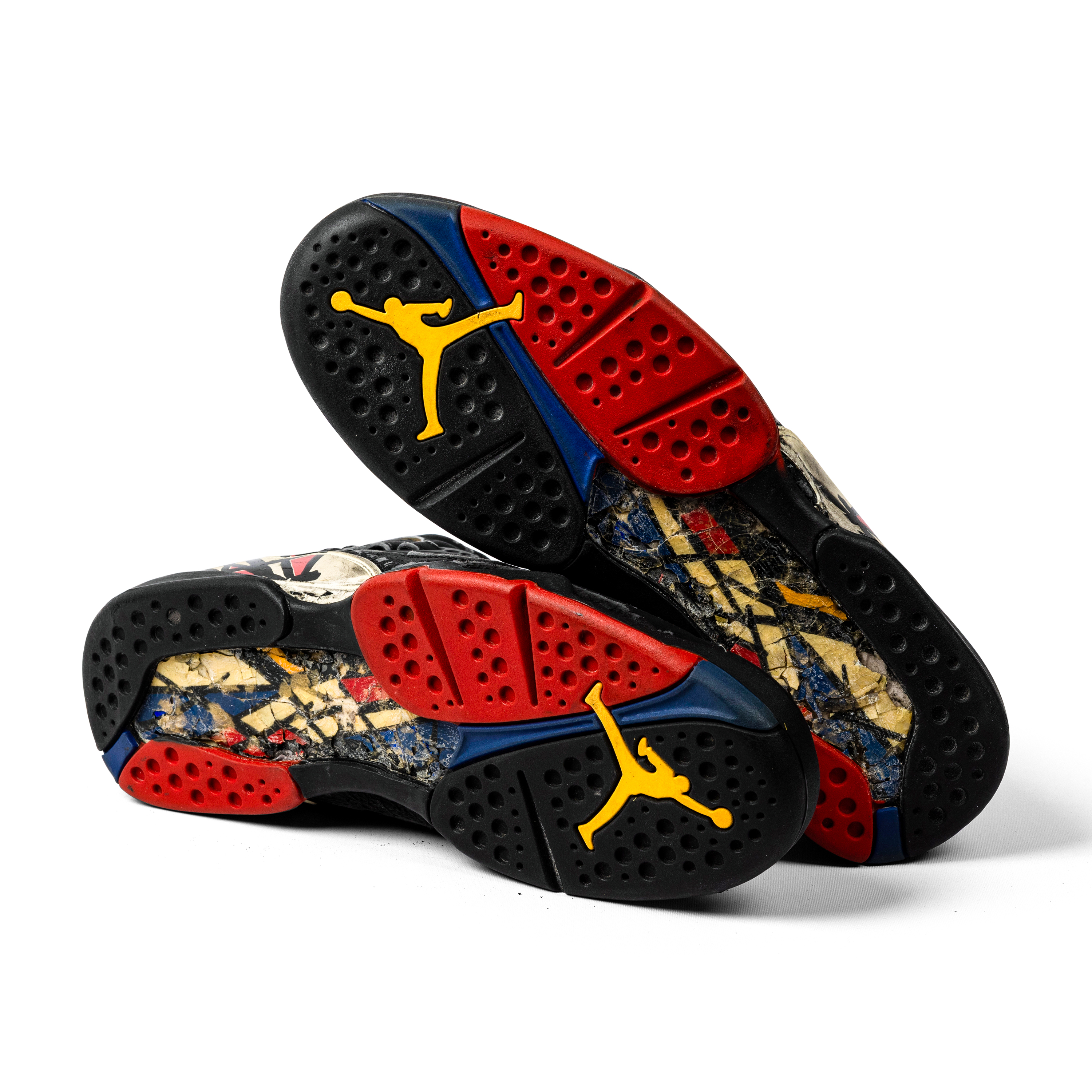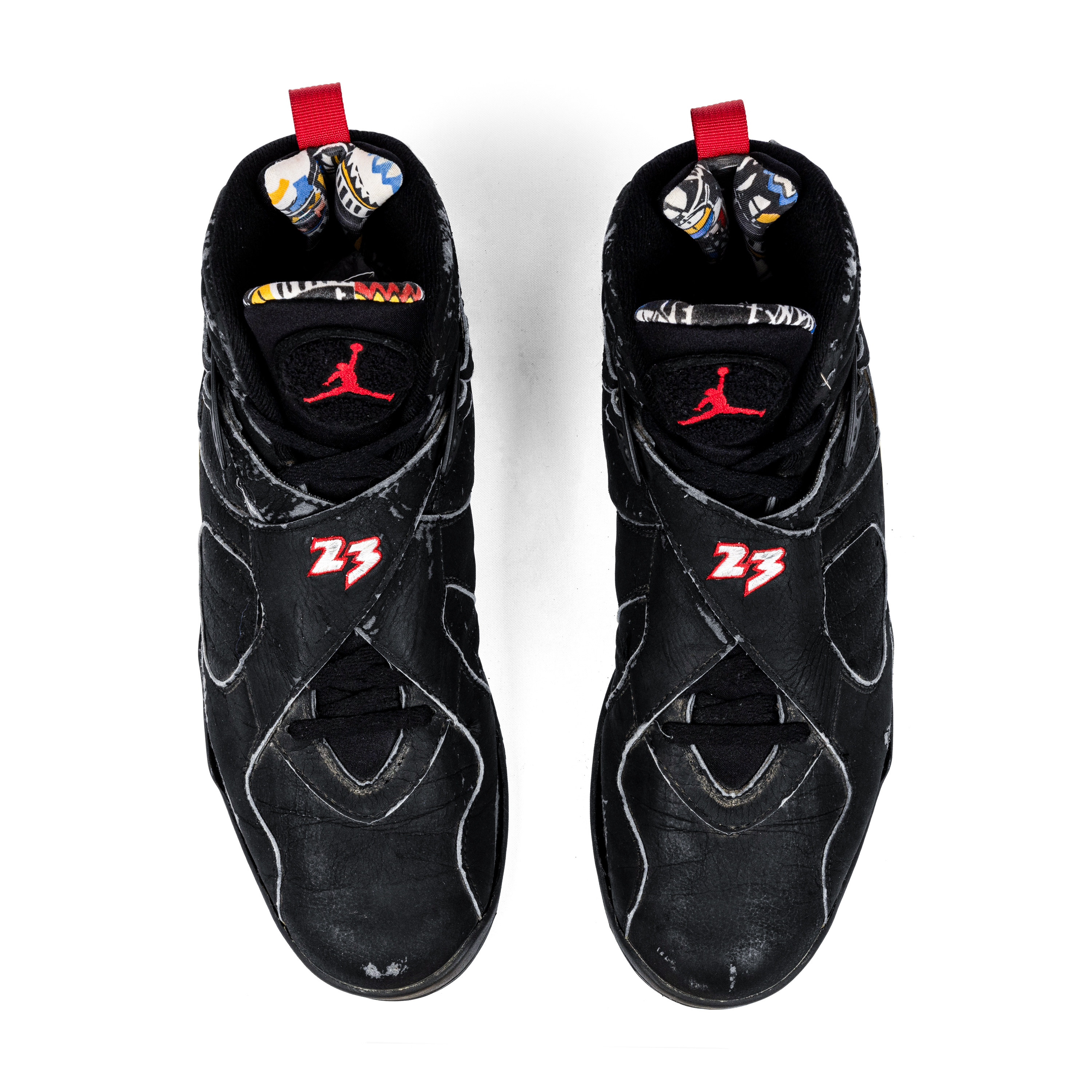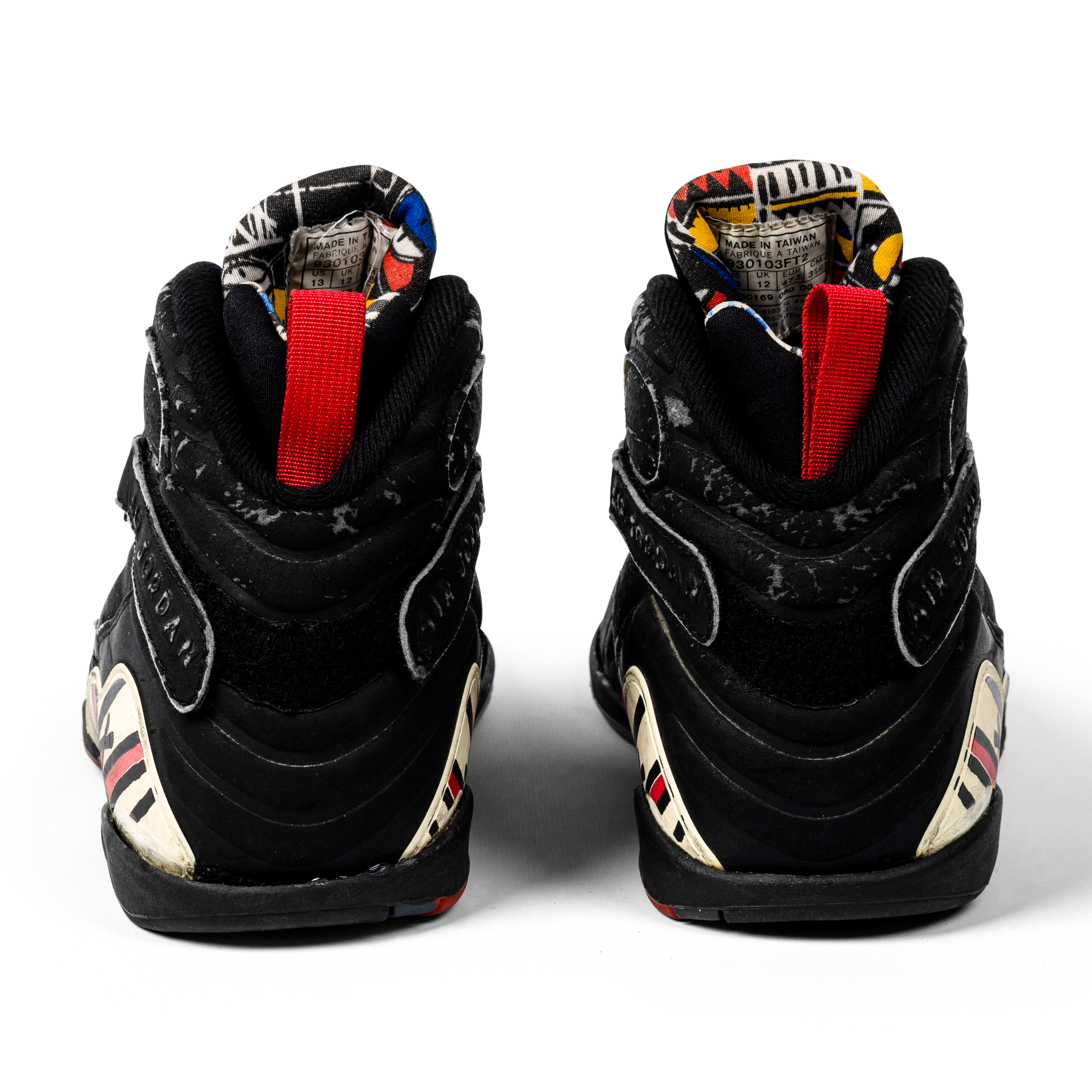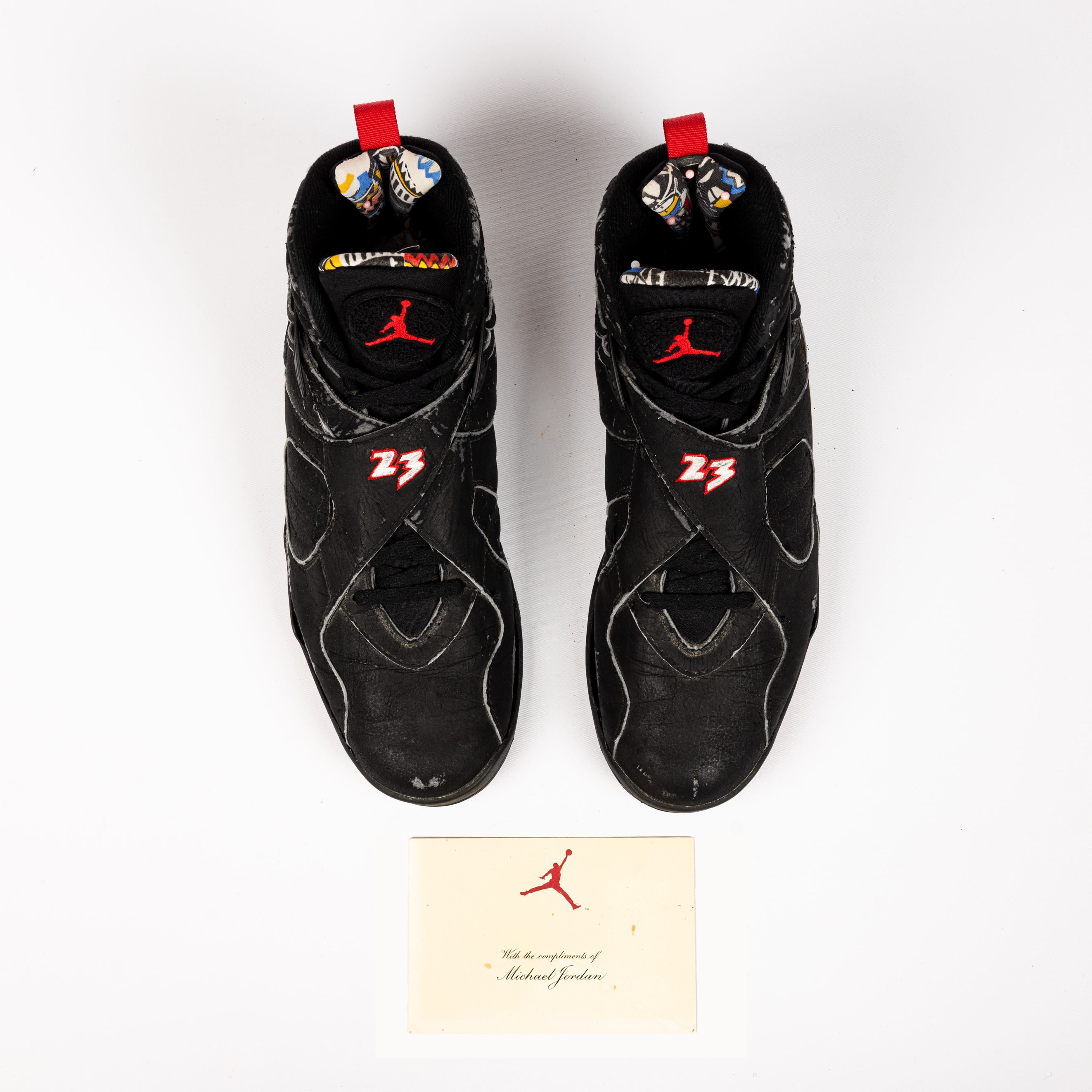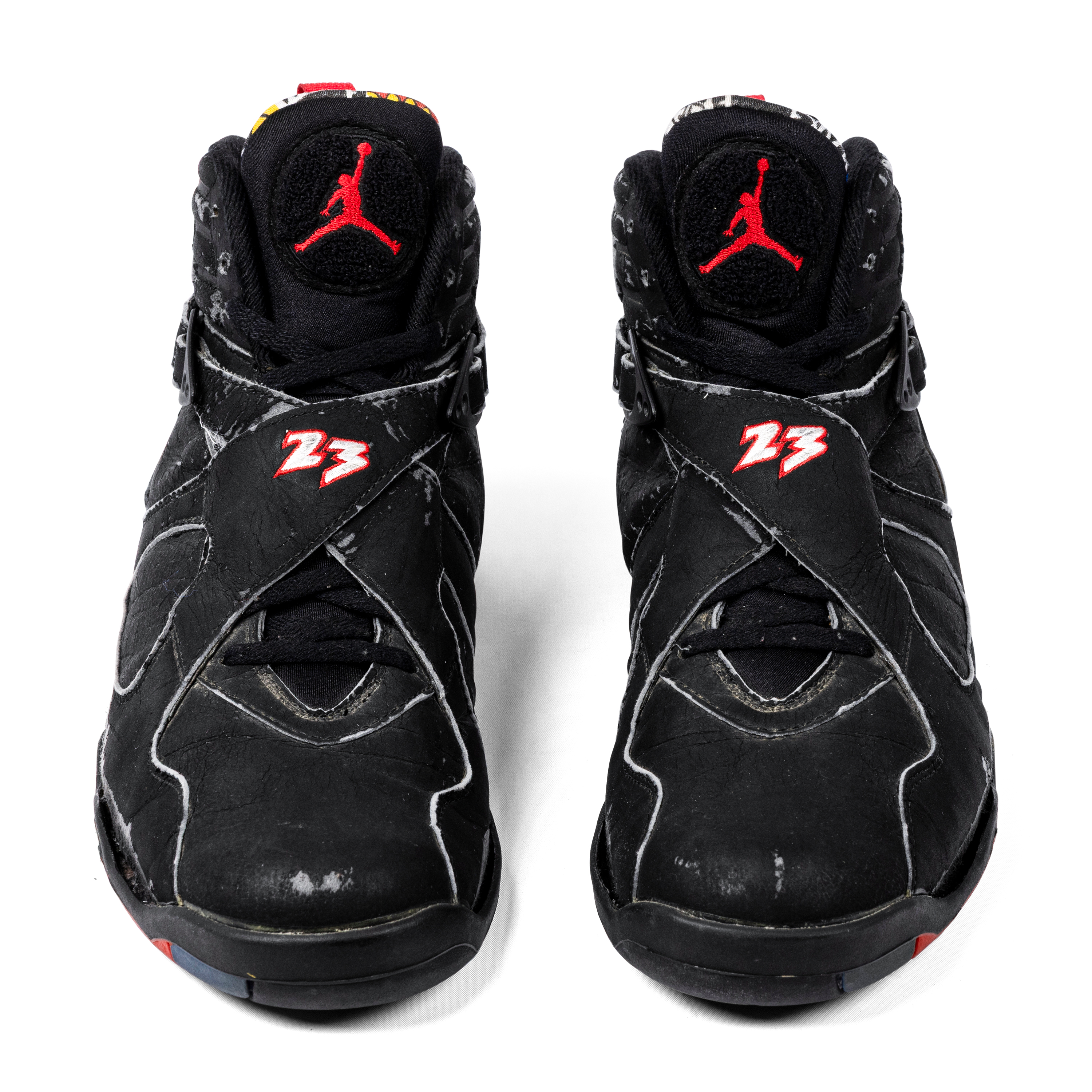 Michael Jordan wore this pair of black Nike Air Jordan 8s on April 30, 1993, during Game 1 of the NBA Playoffs, when the Chicago Bulls defeated the Atlanta Hawks 114–90. Jordan delivered an outstanding performance with 35 points, 7 rebounds, and 5 assists. This game marked Jordan's debut of black Air Jordan 8s on court, continuing the Bull's tradition, dating back to 1989, to wear black shoes during the Playoffs to symbolize unity and solidarity and to intimidate opponents. The Bulls went on to win the 1993 NBA Championship—securing their historic first three-peat—after which Jordan stunned the world by retiring from basketball.