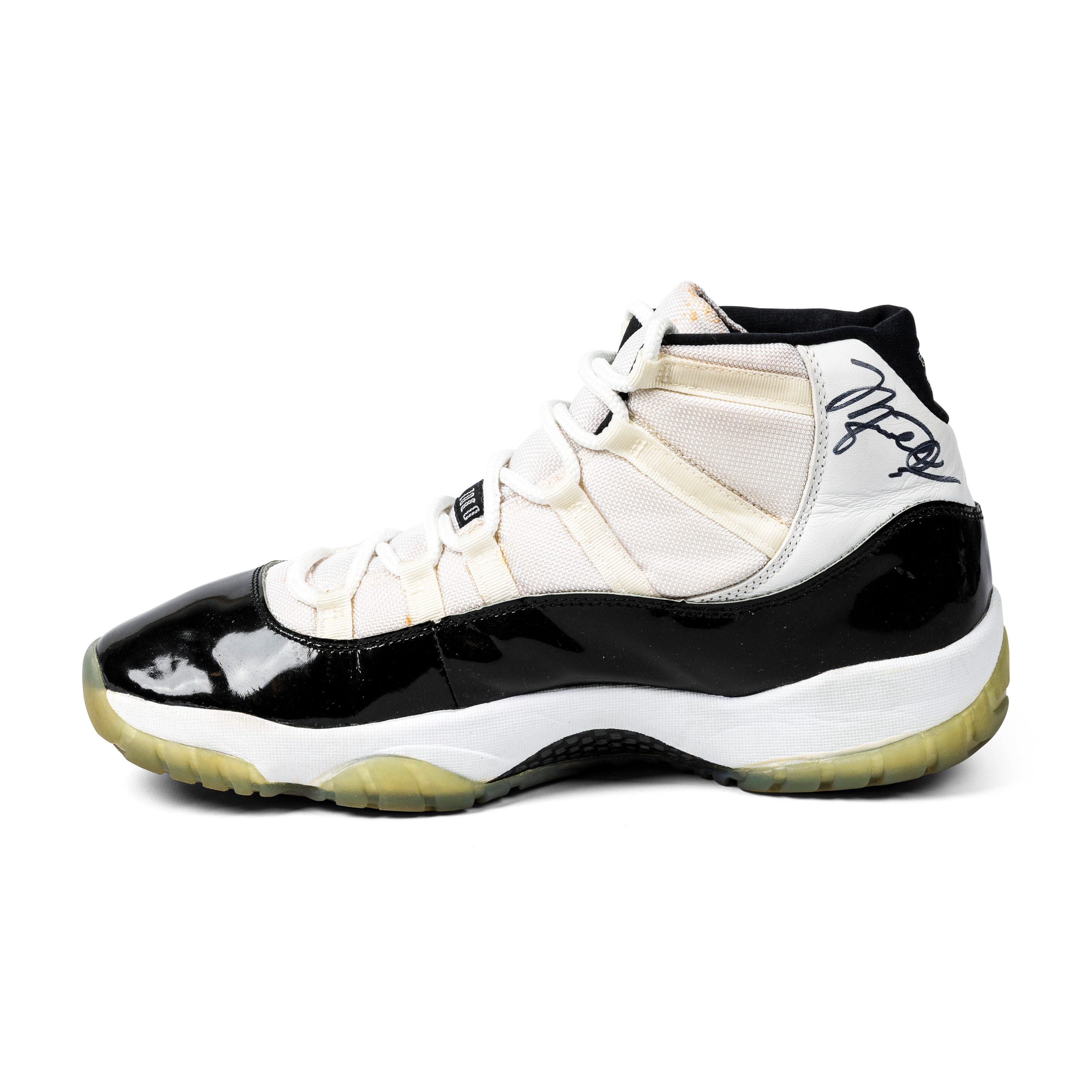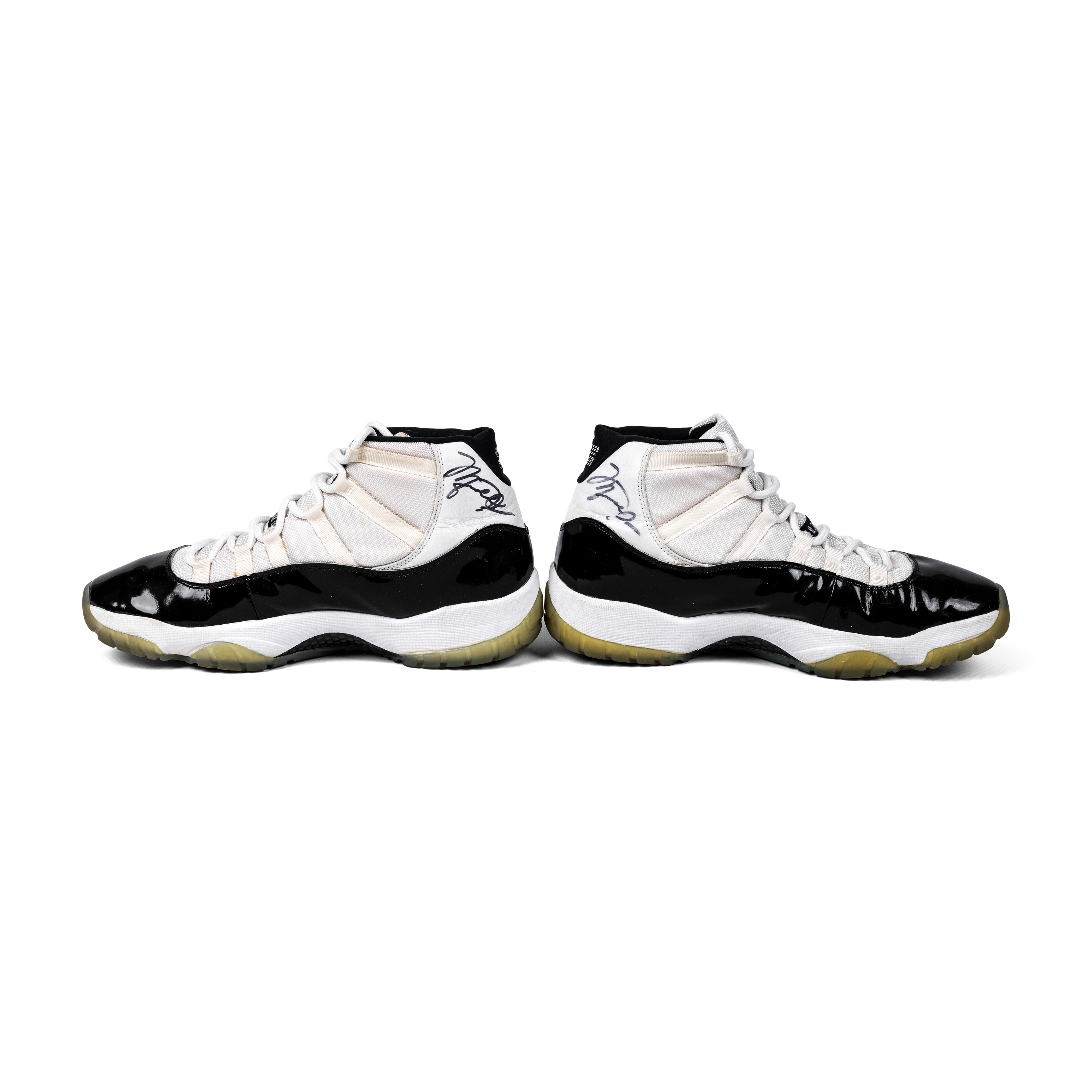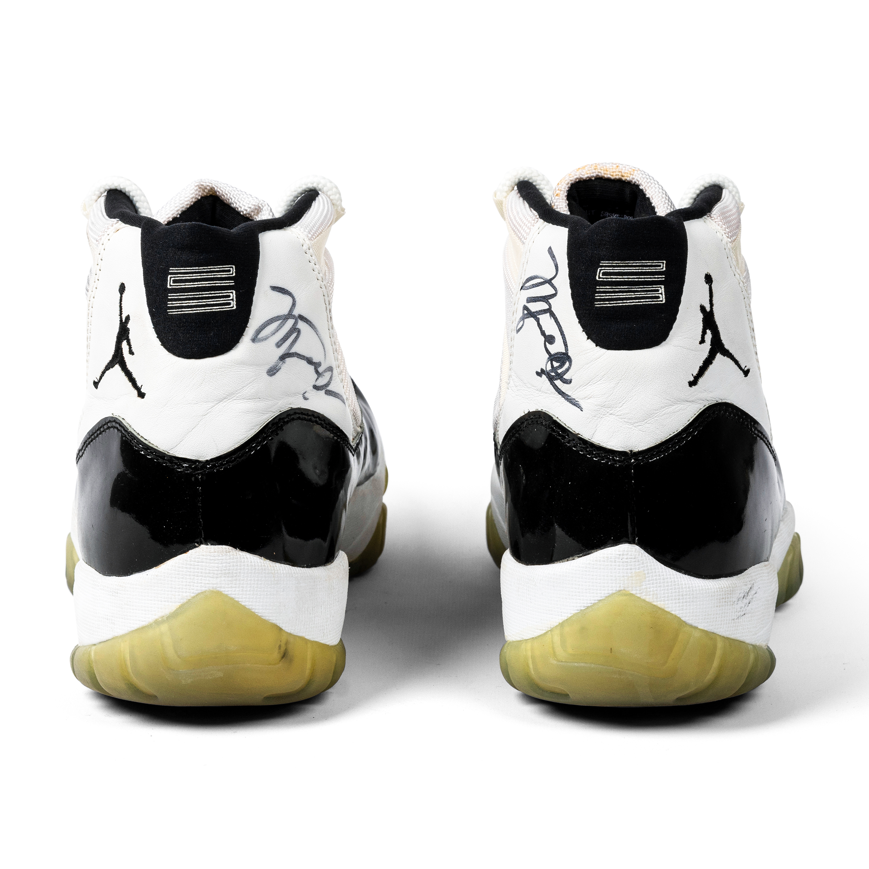 These Concord Air Jordan 11s were worn by Michael Jordan during the 1995-96 season, when the Chicago Bulls achieved a historic 72–10 record and won their fourth NBA Championship. This was the first Championship of their second three-peat. The 95-96 Bulls are widely considered one of the greatest teams in NBA history. That season, Michael Jordan averaged 30.4 points, 6.6 rebounds, 4.3 assists, 2.2 steals, and 0.5 blocks per game, leading the league in scoring while earning MVP, All-Star MVP, Finals MVP, and NBA All-Defensive First Team honors. After winning the Championship MJ collapsed to the floor in tears while clutching the basketball. These size 13.5 Player Samples are dual-signed by Michael Jordan in black permanent marker.