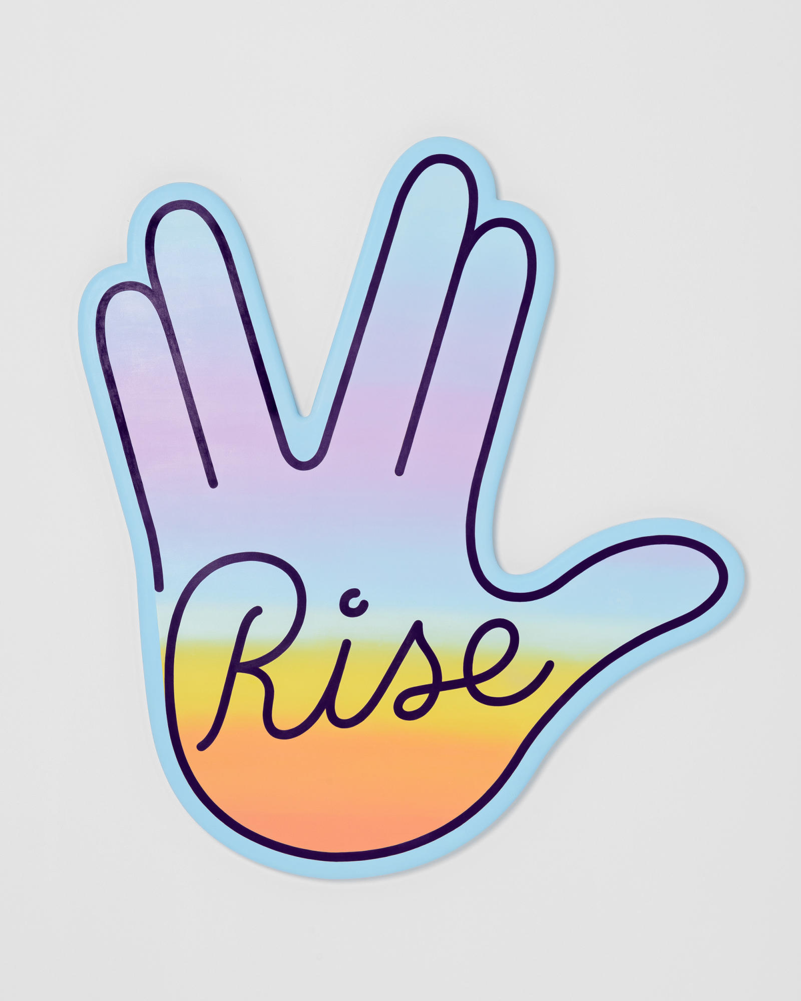 Shaped 'Vulcan Hand Salute' painting. Pharrell and his associates are frequently seen on photos and videos throwing up the Vulcan salute. This hand gesture was popularized in the 1960s television Star Trek. The 'Vulcan salute' was often accompanied by the words 'Live Long and Prosper'. Pharrell brought this salute back from the past representing positivity and his futuristic 'out of this world' vision. Paris-based & Amsterdam-raised artist Pieter Ceizer painted his interpretation of the Vulcan sign. The hand-shaped 'Rise' painting symbolizes a multi-color sunrise, the daily rebirth of earth and every human being. This artwork celebrates Pharrell's growth and evolution as a creative visionary and artist. Background painted with a soft pastel gradient, on top a deep purple line work reading 'Rise'.