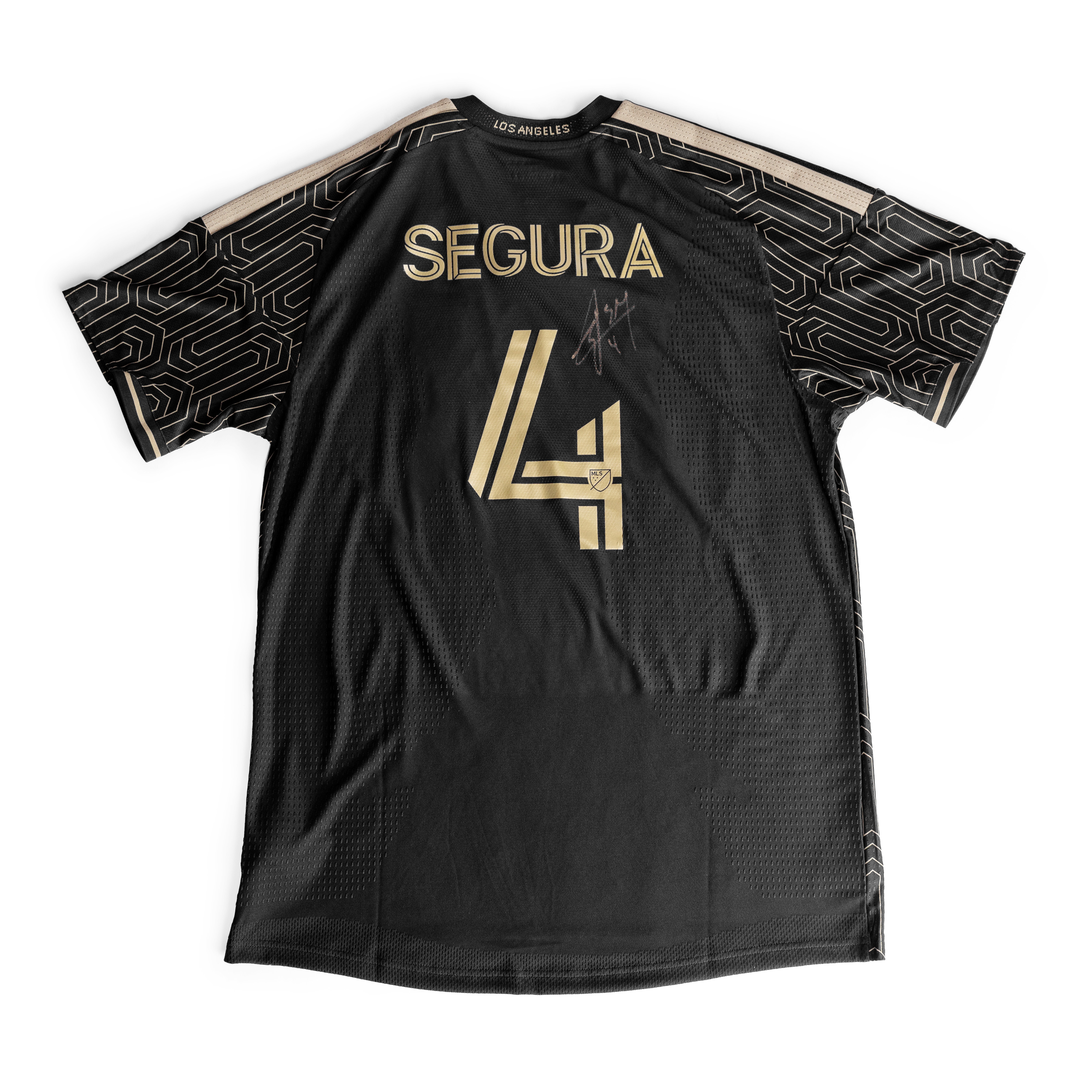 Design details include an Art Deco pattern drawn from the Grand Lobby entrance, “Los Angeles” woven into the back neck, a BMO Stadium aerial view on the jock tag, and the embroidered “Shoulder to Shoulder” message inside the collar. The adidas logo and LAFC crest appear in a first-ever lenticular, holographic finish, with stars honoring U.S.-based MLS clubs during the 2026 World Cup. Signed by Eddie Segura.