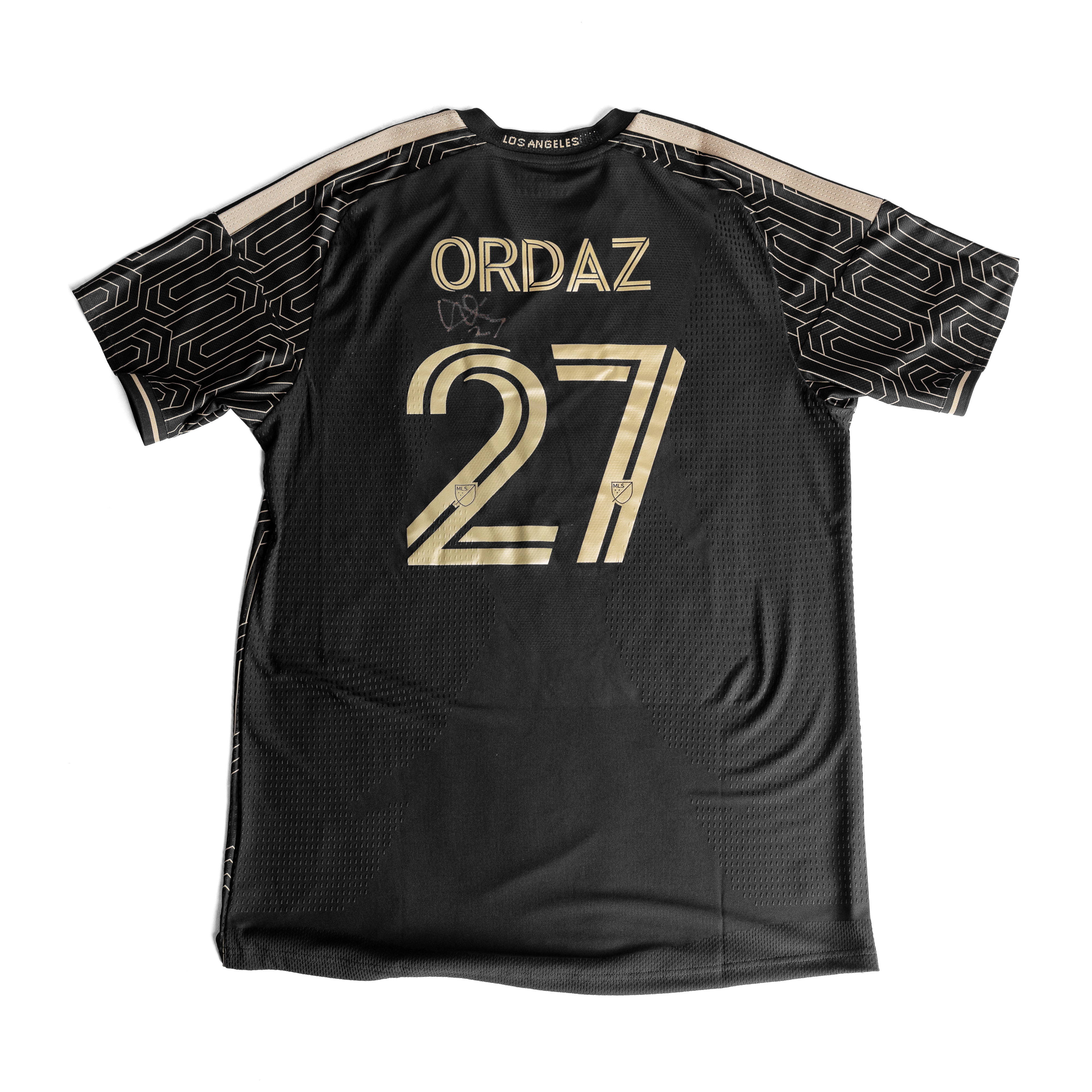 Design details include an Art Deco pattern drawn from the Grand Lobby entrance, “Los Angeles” woven into the back neck, a BMO Stadium aerial view on the jock tag, and the embroidered “Shoulder to Shoulder” message inside the collar. The adidas logo and LAFC crest appear in a first-ever lenticular, holographic finish, with stars honoring U.S.-based MLS clubs during the 2026 World Cup. Signed by Nathan Ordaz.