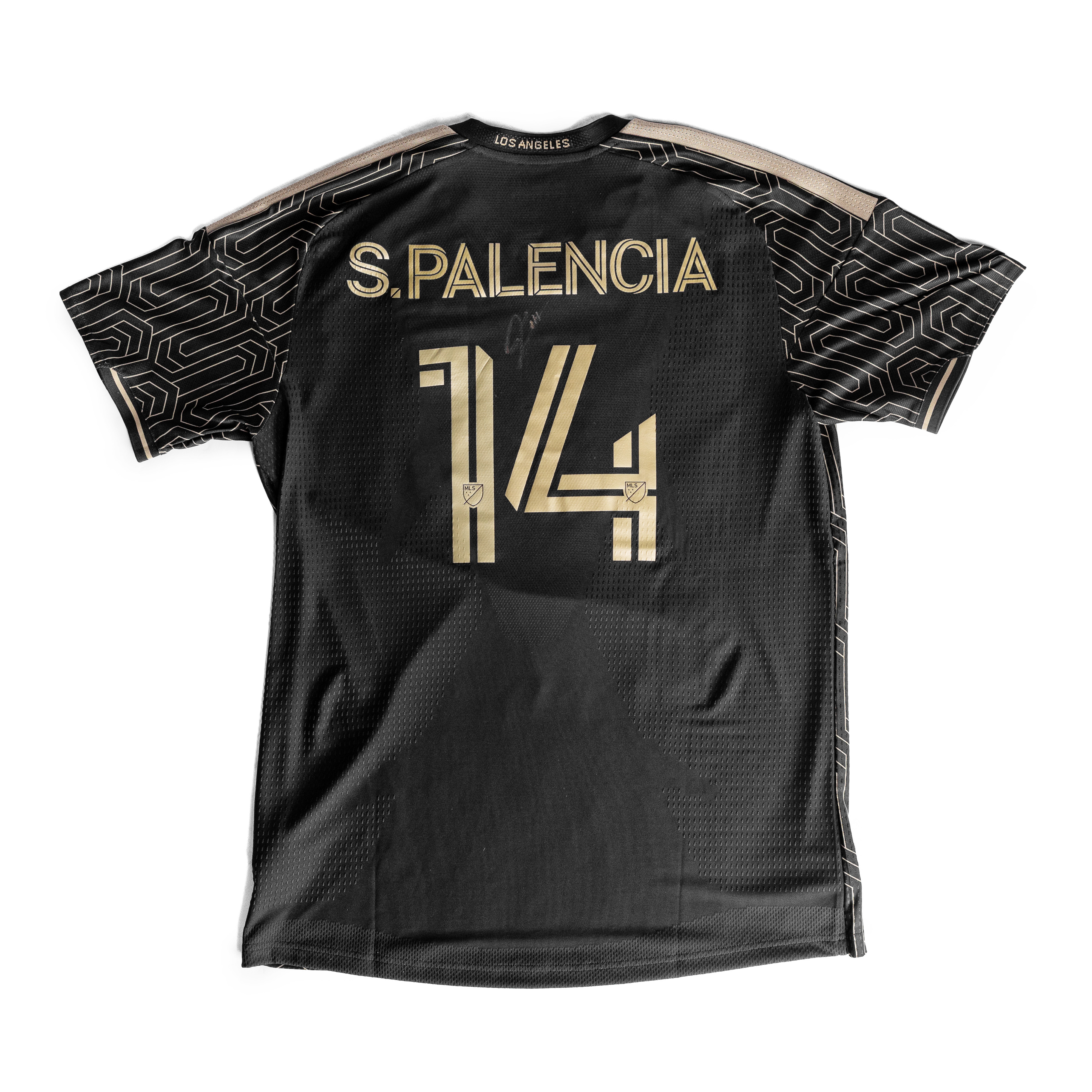 Design details include an Art Deco pattern drawn from the Grand Lobby entrance, “Los Angeles” woven into the back neck, a BMO Stadium aerial view on the jock tag, and the embroidered “Shoulder to Shoulder” message inside the collar. The adidas logo and LAFC crest appear in a first-ever lenticular, holographic finish, with stars honoring U.S.-based MLS clubs during the 2026 World Cup. Signed by Sergi Palencia.