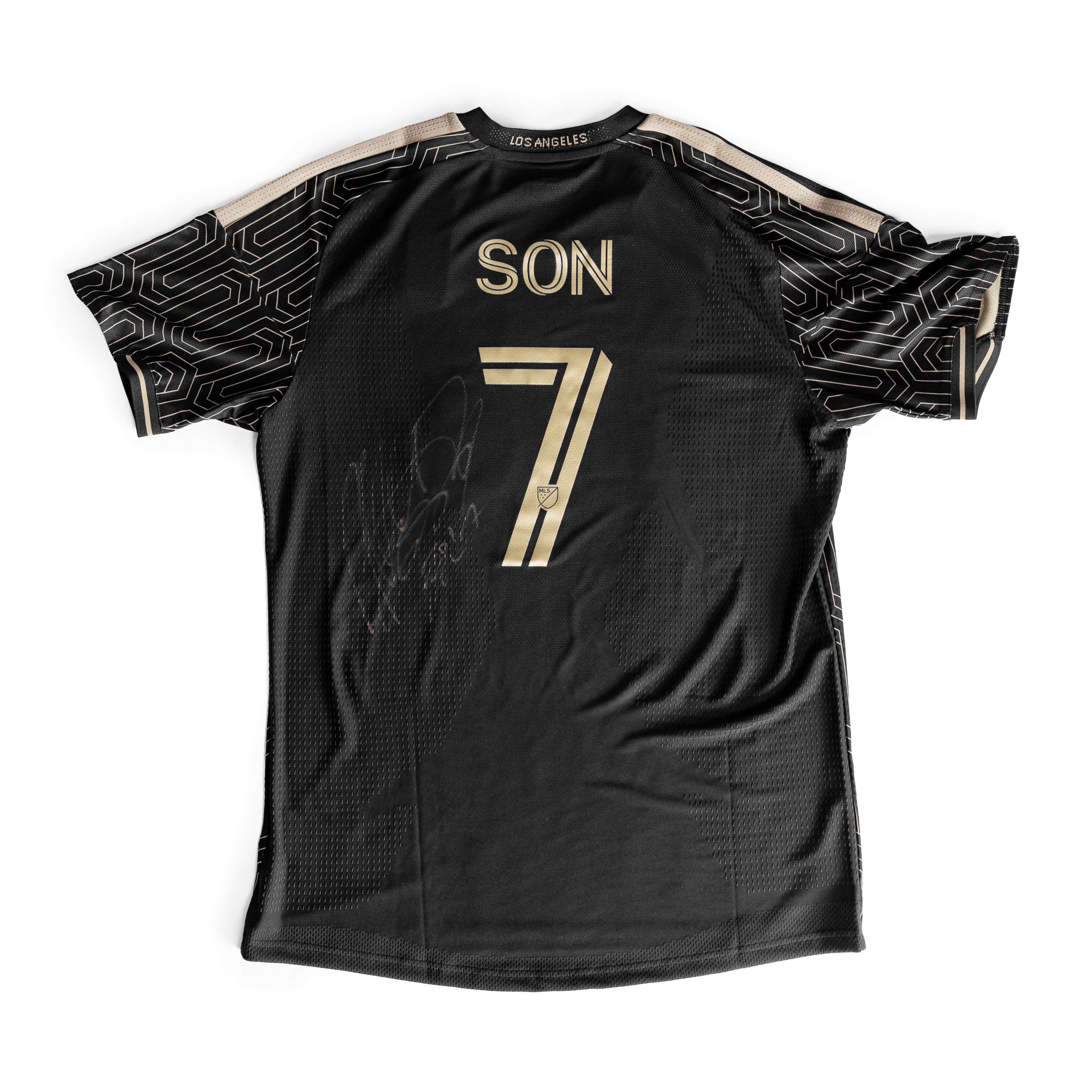 Design details include an Art Deco pattern drawn from the Grand Lobby entrance, “Los Angeles” woven into the back neck, a BMO Stadium aerial view on the jock tag, and the embroidered “Shoulder to Shoulder” message inside the collar. The adidas logo and LAFC crest appear in a first-ever lenticular, holographic finish, with stars honoring U.S.-based MLS clubs during the 2026 World Cup. Signed by Son Heung-Min.