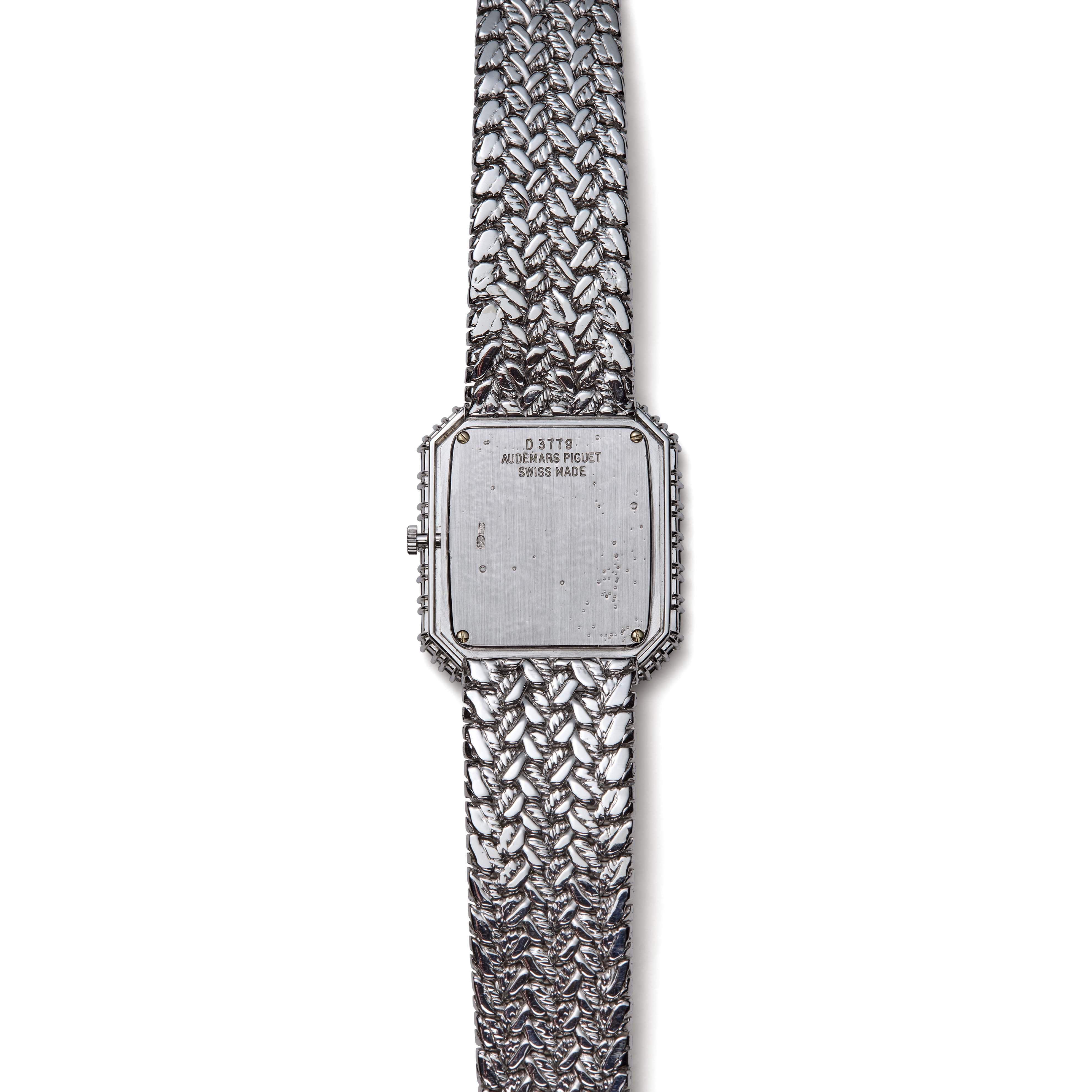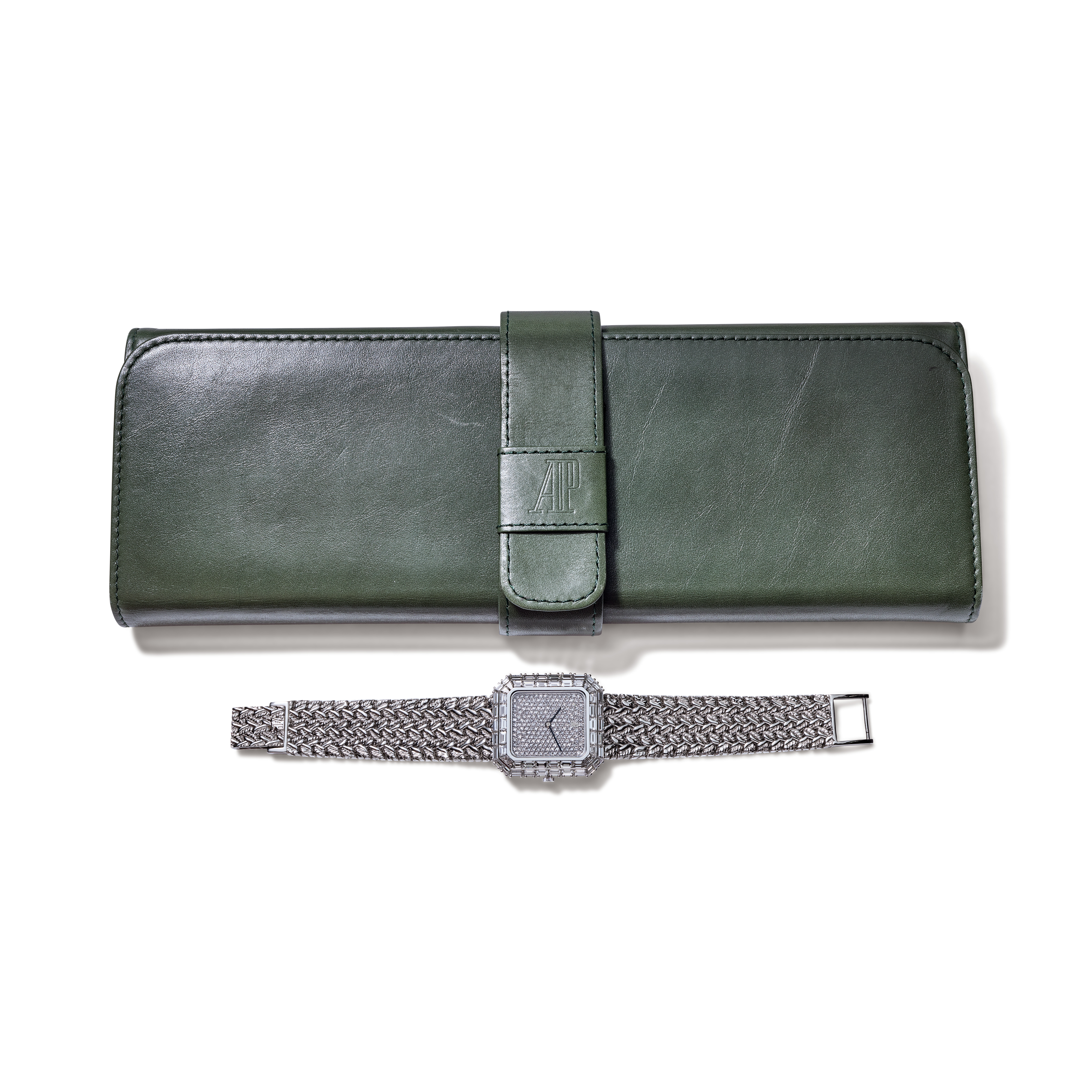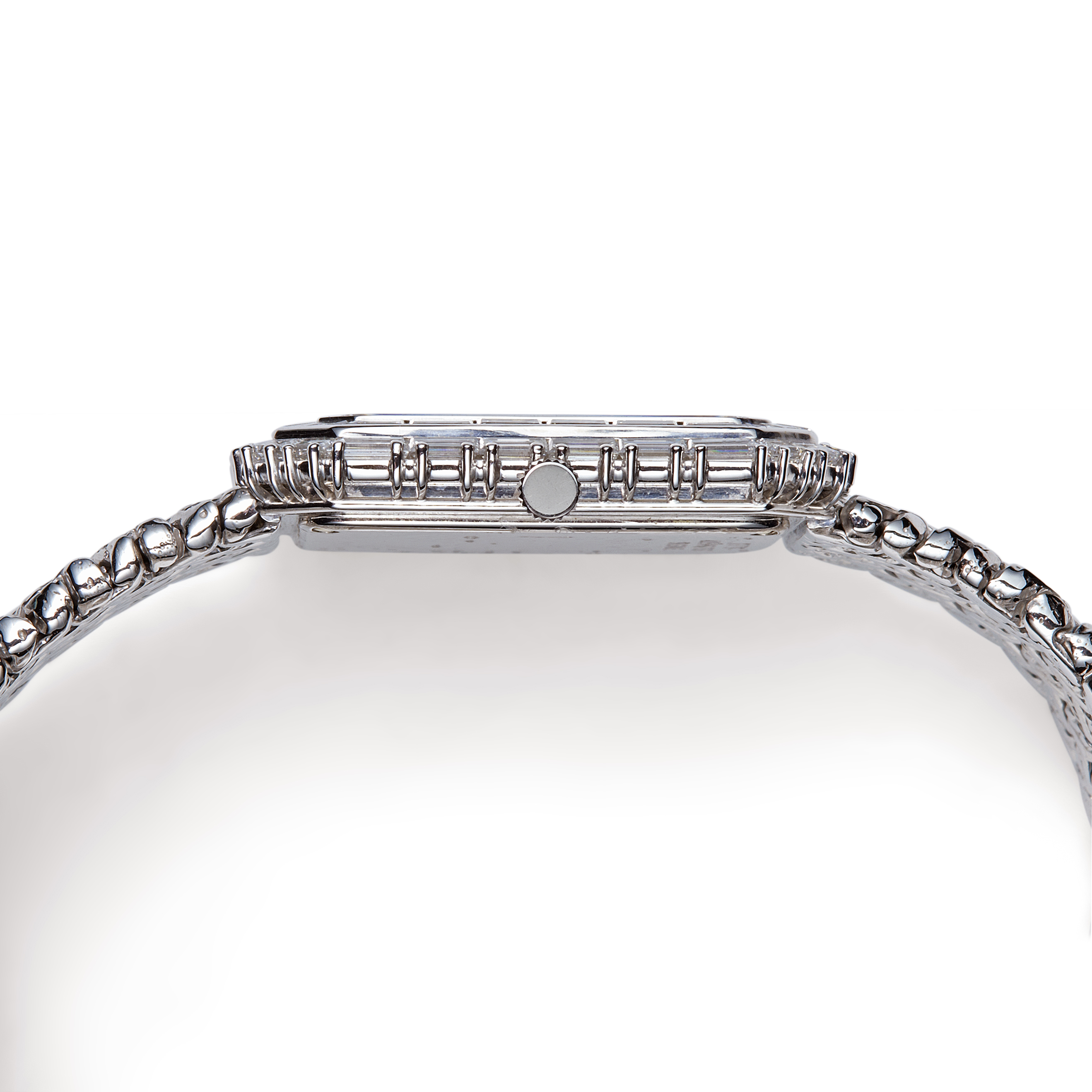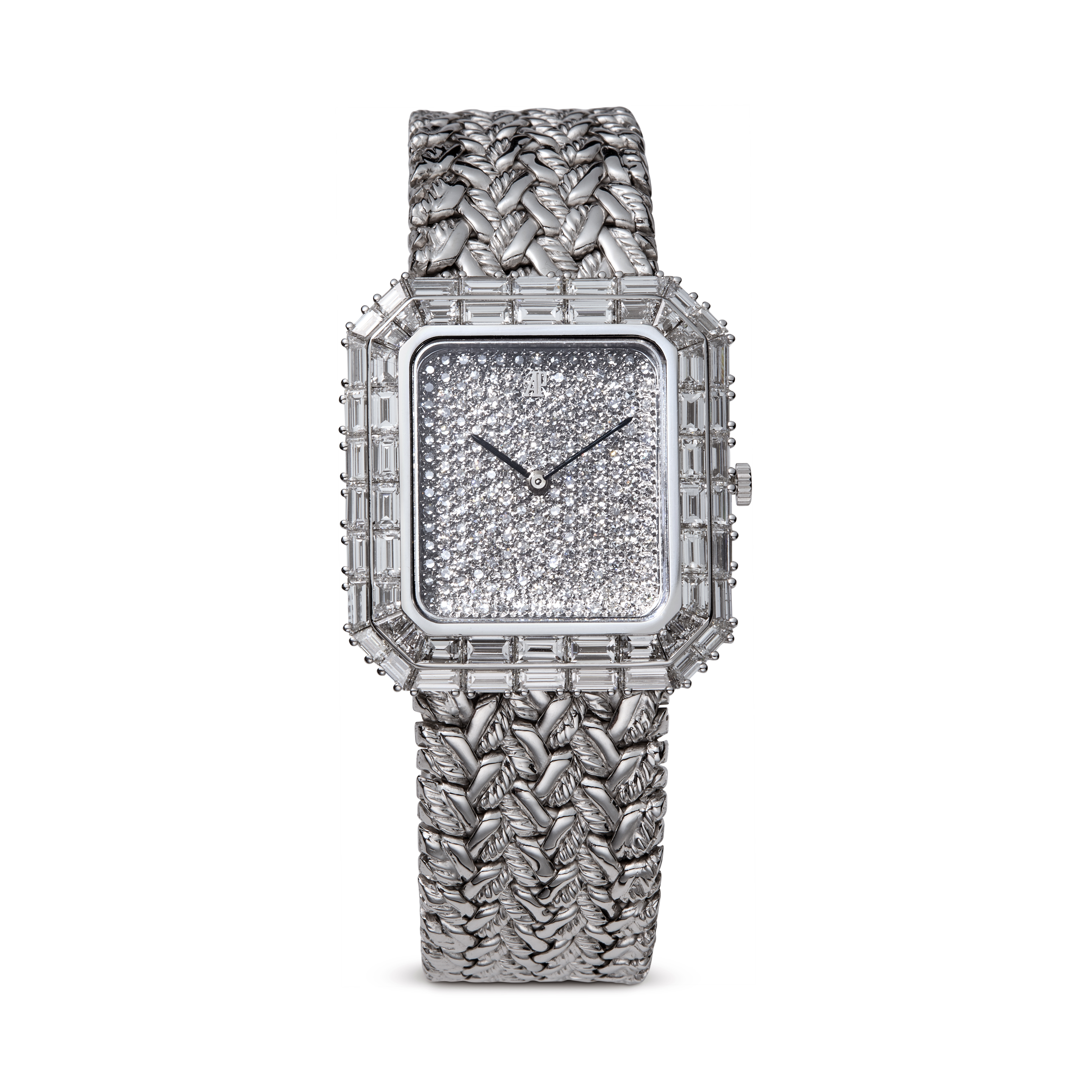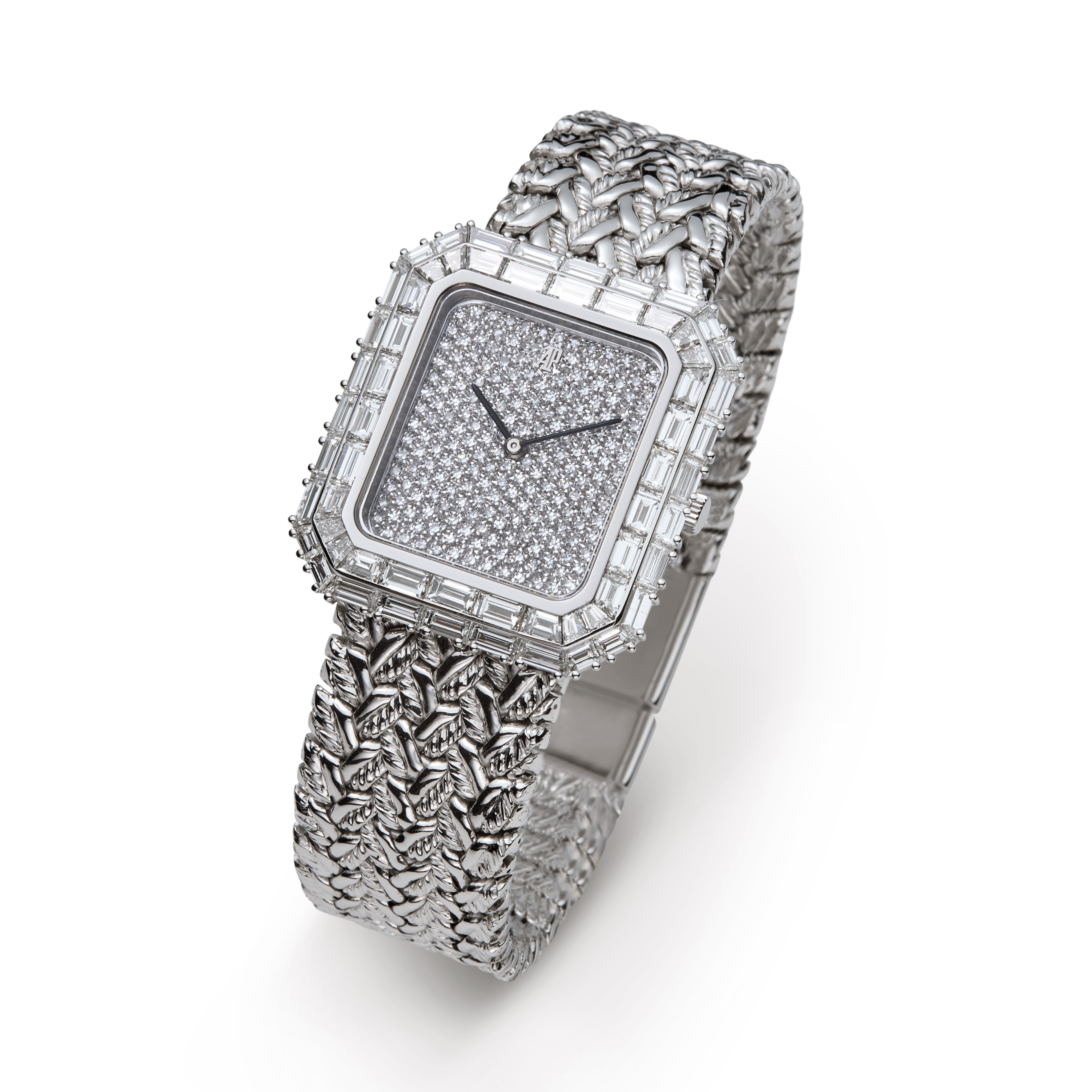 Exquisitely crafted in 18k white gold, this Audemars Piguet 14760BC bracelet watch showcases the maison’s mastery of elegant, gem-set timepieces and dates to the 1990s. Its rectangular 30 x 32 mm case is framed by an exceptional diamond bezel, while the dial is fully adorned with baguette- and single-cut diamonds totaling approximately 15.27 carats, graded D–E color and VVS–VS clarity for extraordinary brilliance. The integrated white gold bracelet flows seamlessly from the case and is secured by a clasp stamped “750 Audemars Piguet.” Powered by a manual-wind calibre 2080 movement and accompanied by its original AP box, this refined jewel-watch blends precision, rarity, and luminous high jewelry craftsmanship in an unmistakably Audemars Piguet execution.