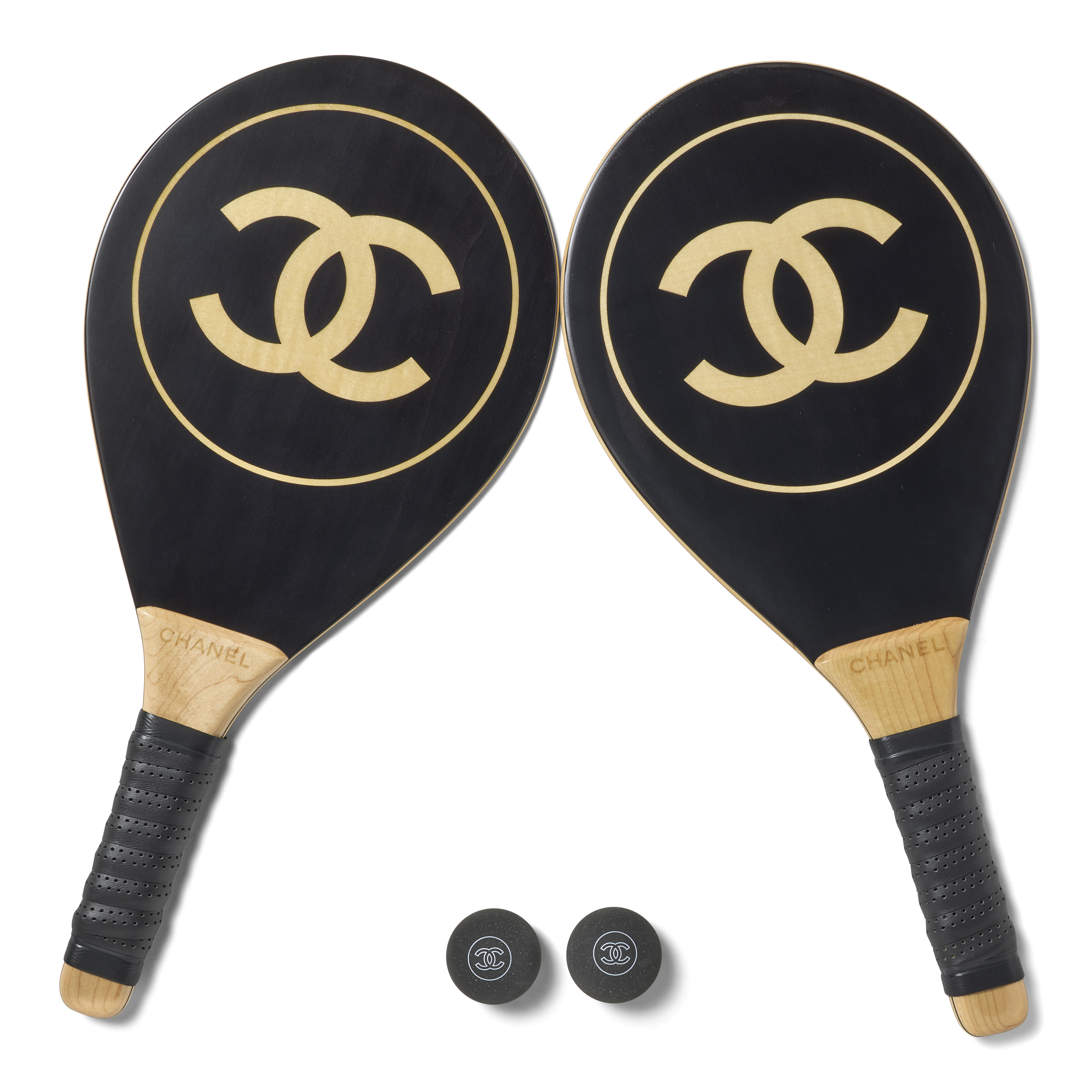 The Chanel Beach Paddle Set brings playful luxury to leisure. The set includes two wooden rackets with sleek black heads adorned with the iconic interlocking CC logo and two black rubber balls, each stamped with the same signature emblem, all elegantly presented in a Chanel box. A rare and stylish collectible, this set elevates a beach day with unmistakable sophistication.