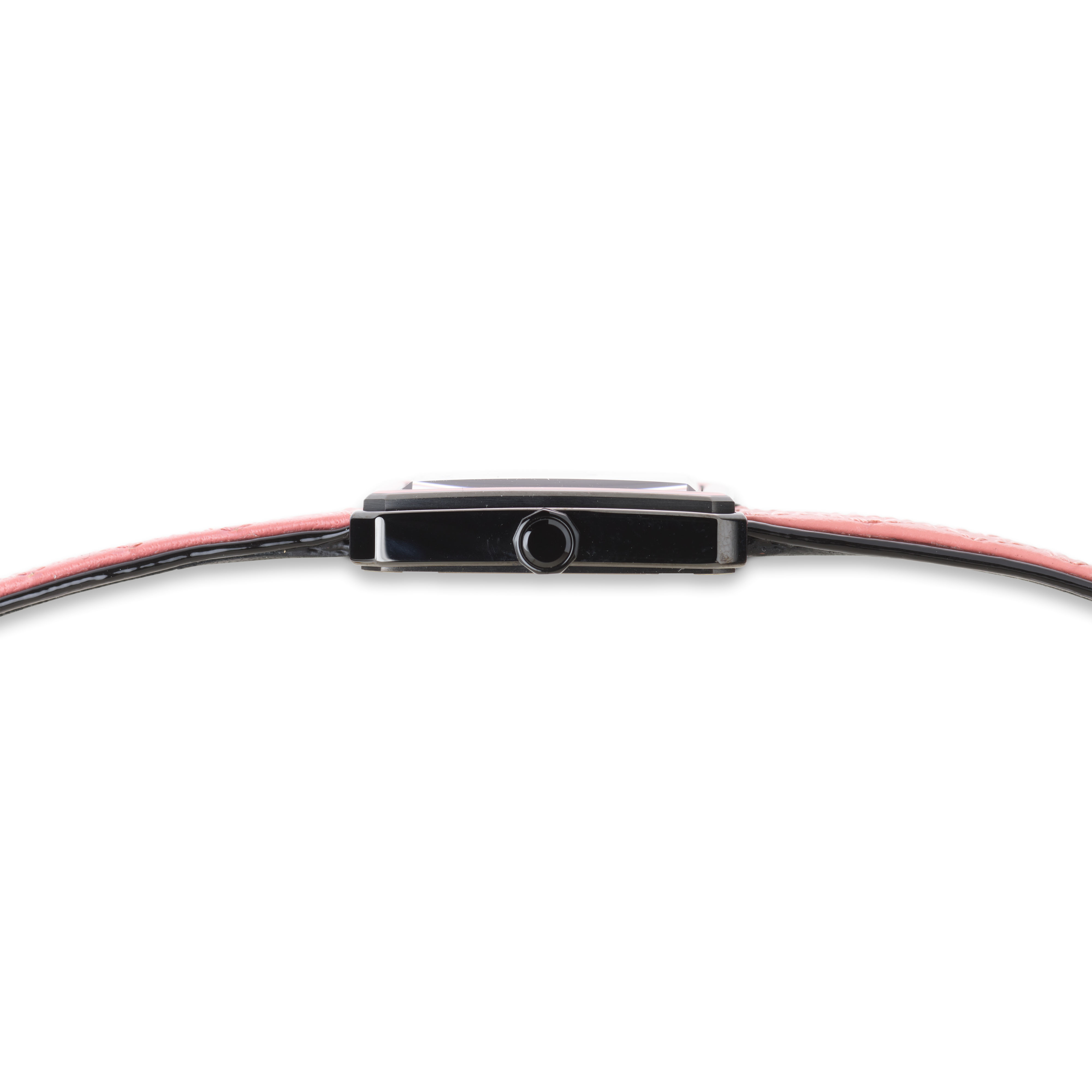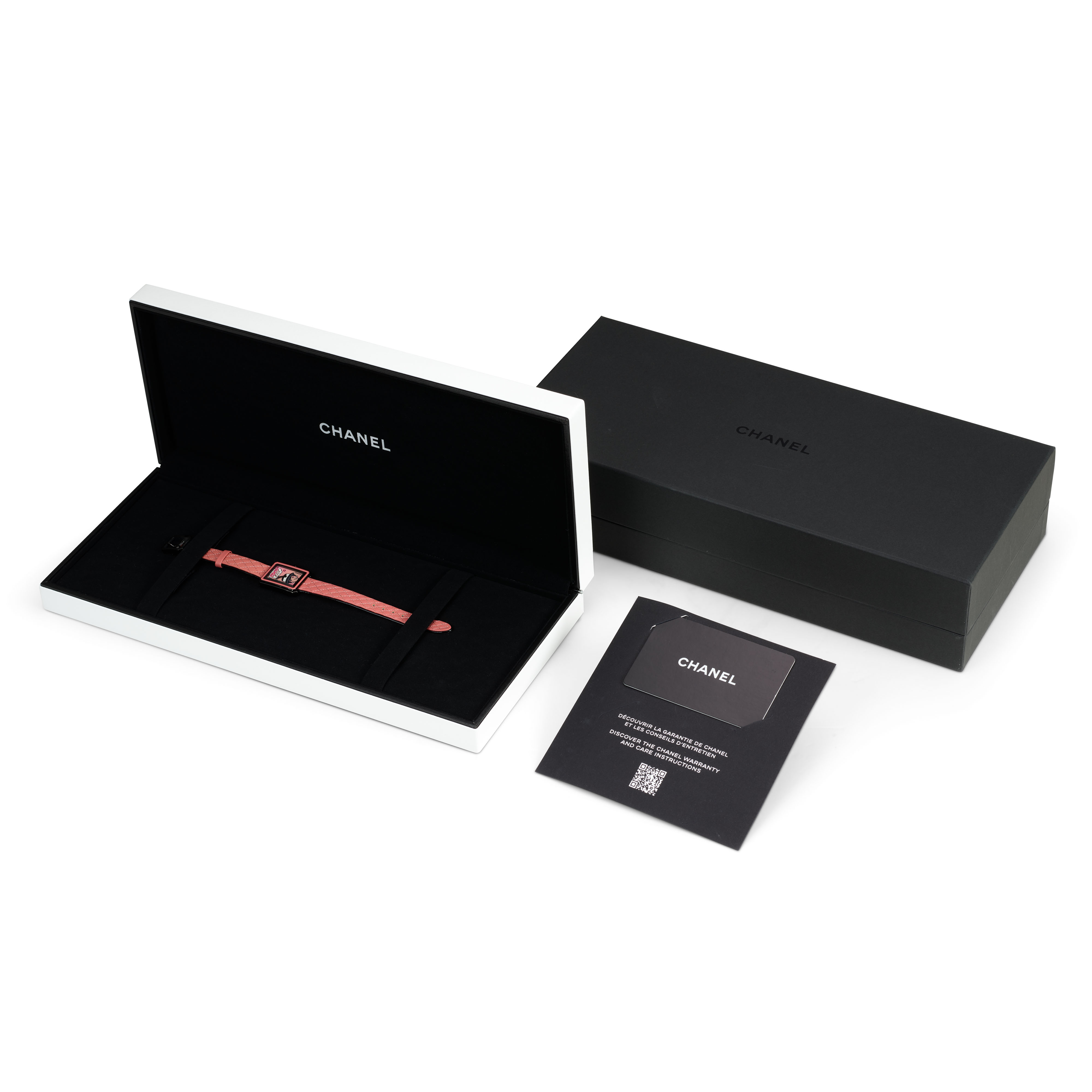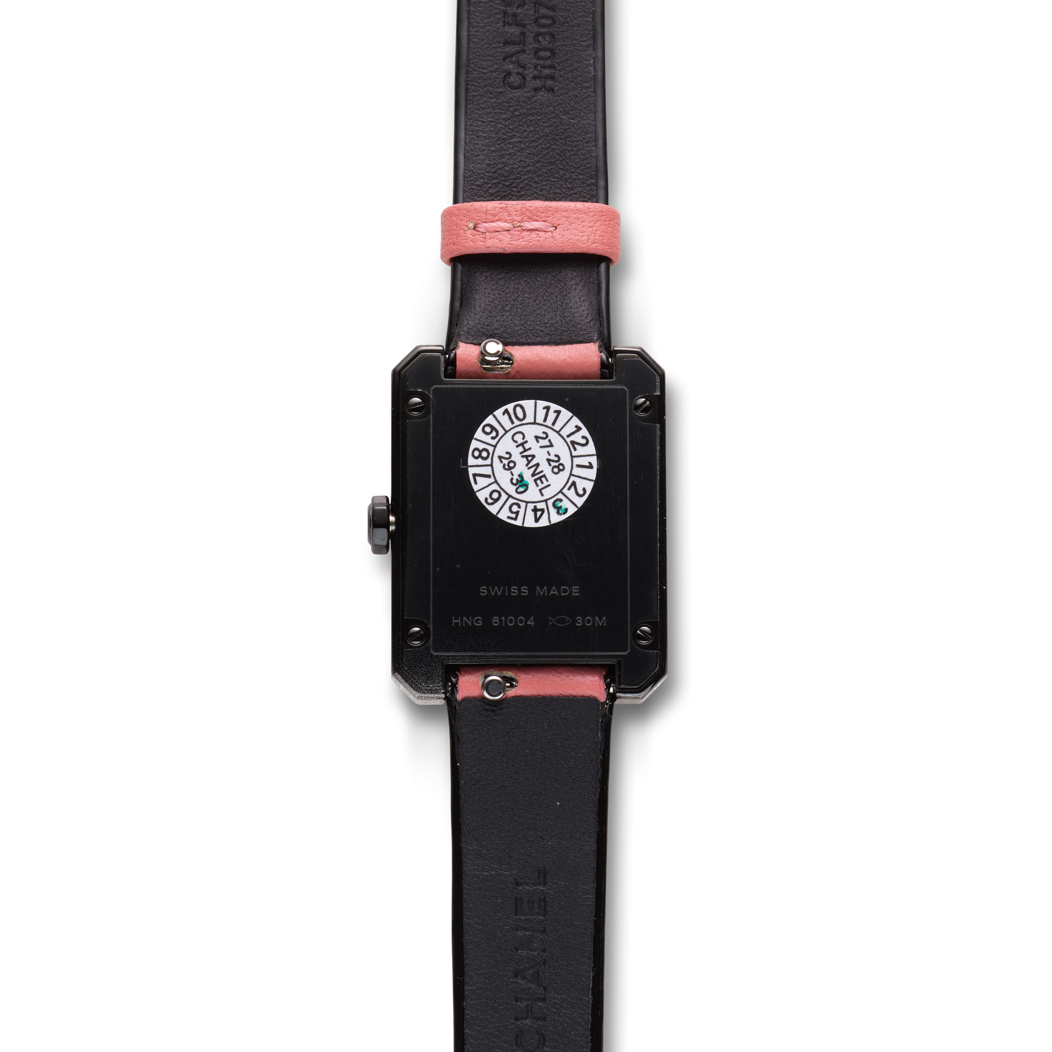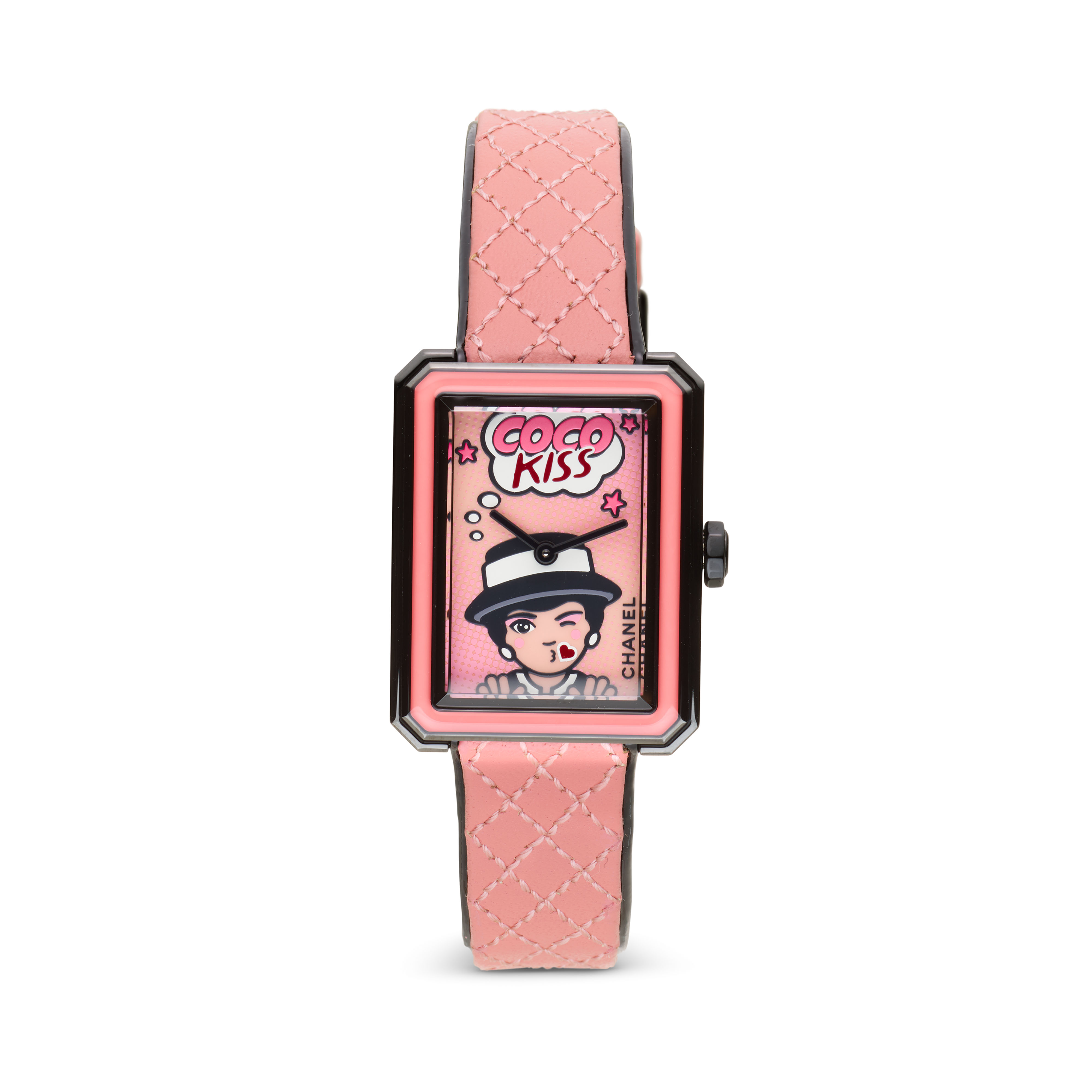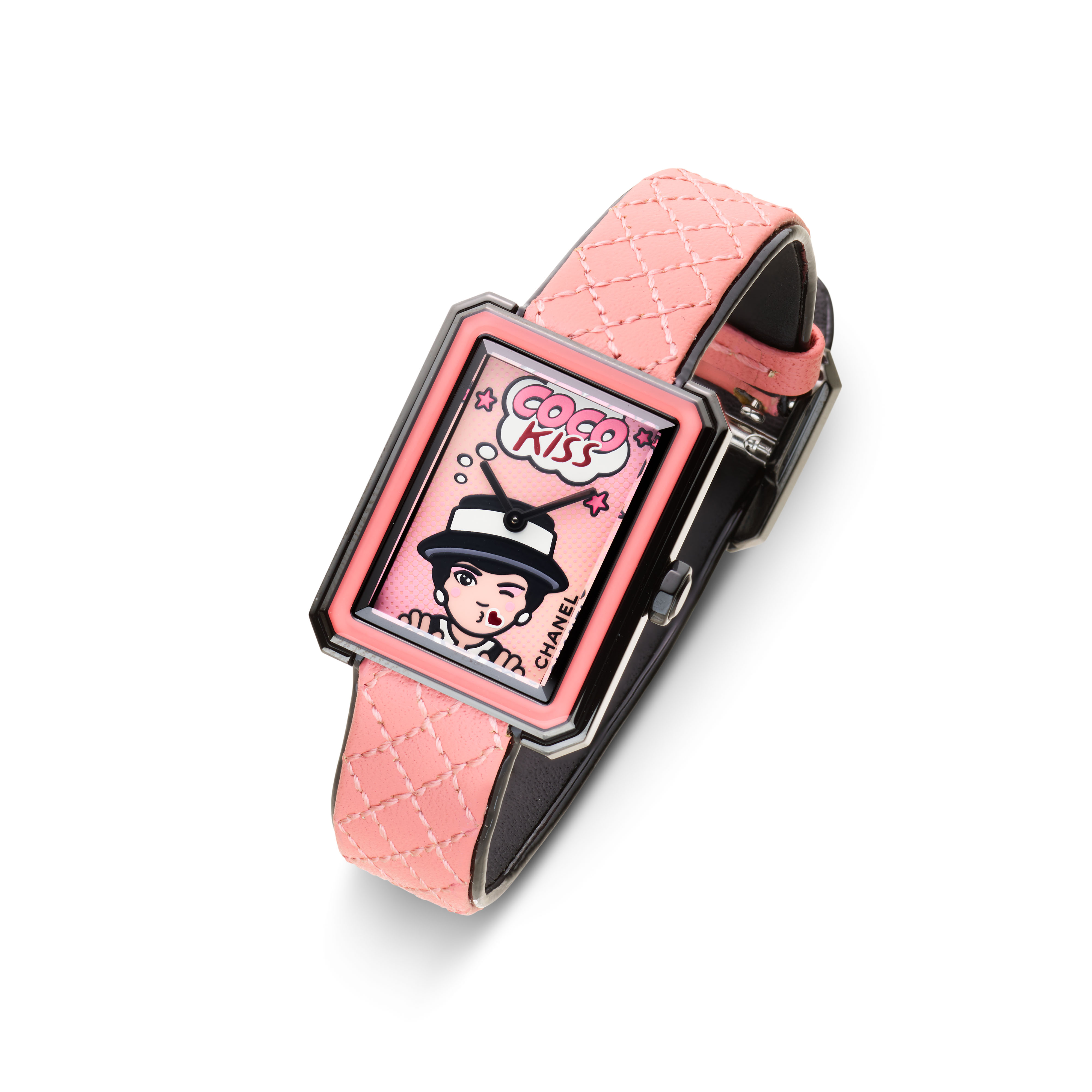 A playful yet impeccably refined expression of Chanel’s watchmaking style, the Boyfriend Blush watch pairs a black-coated steel case and bezel with a vibrant pink lacquer finish that highlights its bold geometry. The blush-toned dial features a charming printed illustration of Mademoiselle Chanel with the whimsical “COCO KISS” thought bubble, rendered in soft shades of pink for a modern, feminine touch. An interchangeable pink quilted calfskin strap with black patent trim and black leather lining echoes the house’s iconic quilting. Powered by a high-precision quartz movement and finished with a black-coated steel crown set with a black spinel cabochon, this small-size model delivers both precision and personality. Chic, collectible and unmistakably Chanel, it seamlessly blends the maison’s heritage codes with a fresh, contemporary spirit.