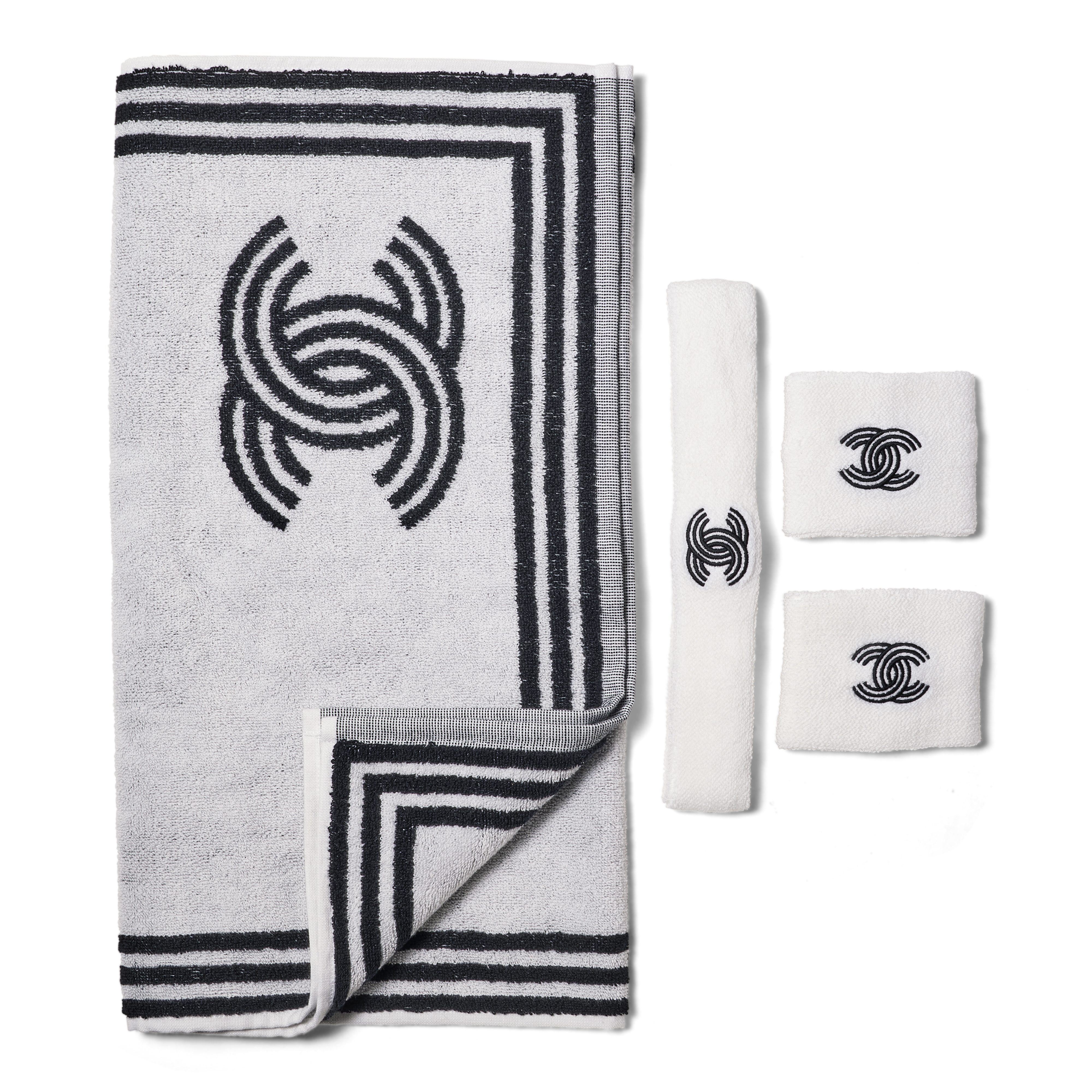 The Chanel CC Monogram Aerobics Set is a playful and stylish nod to retro sport, crafted in soft cotton and adorned with the iconic interlocking Cs. The set includes two wristbands, a coordinating headband, and a matching towel, all designed in a cohesive monogram motif. Fun, functional, and distinctly Chanel, it brings elevated charm to any fitness or leisure routine.