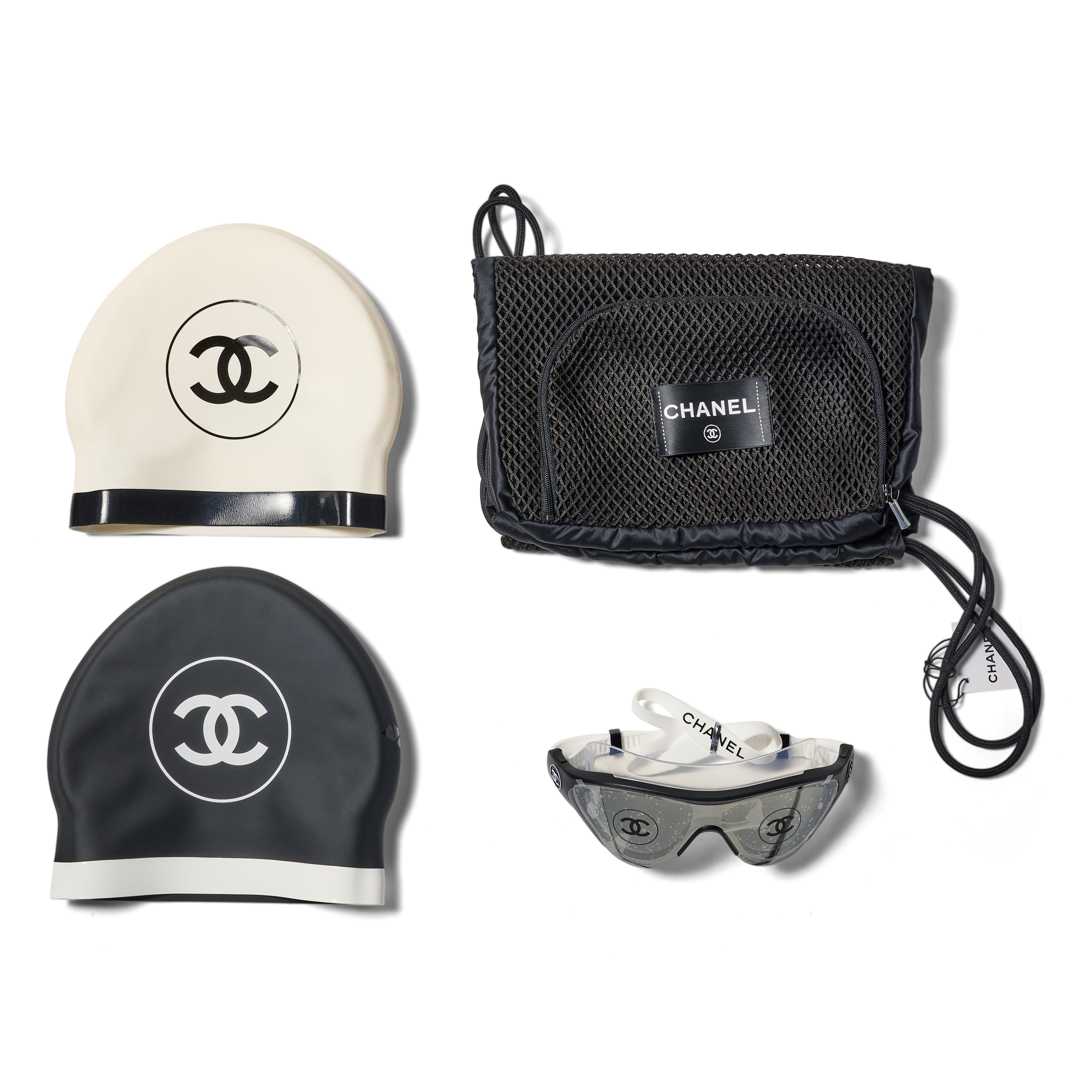 The Chanel CC Monogram Swimwear Collection is a sleek and stylish set that brings refined elegance to aquatic leisure. It includes two swim caps—one in white with a bold black interlocking CC logo and one in black with a striking white CC logo—along with chic Chanel swim goggles designed for both form and function. A lightweight drawstring mesh swim bag completes the ensemble, offering effortless portability. Modern, polished, and unmistakably Chanel, this collection elevates swimwear essentials with iconic sophistication.