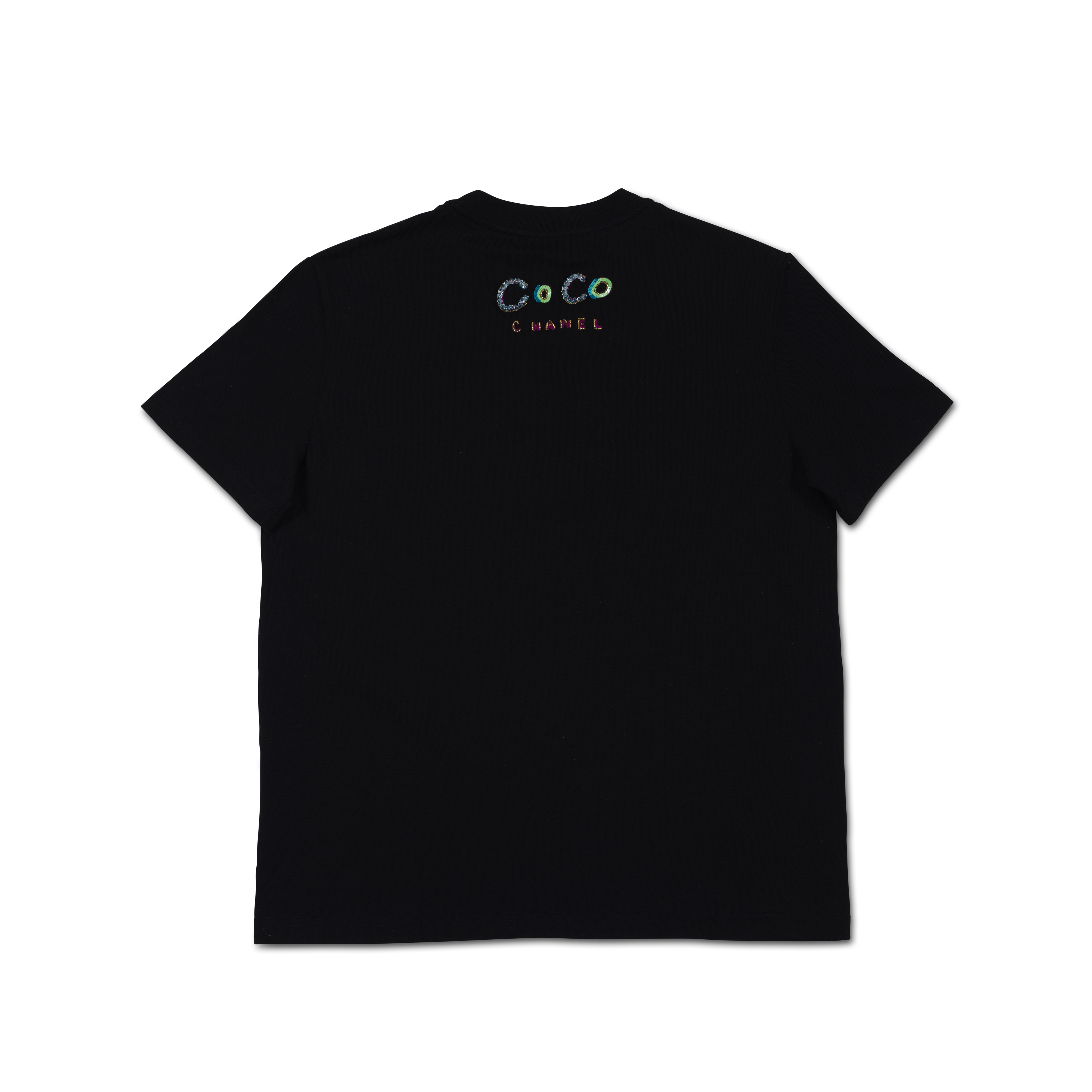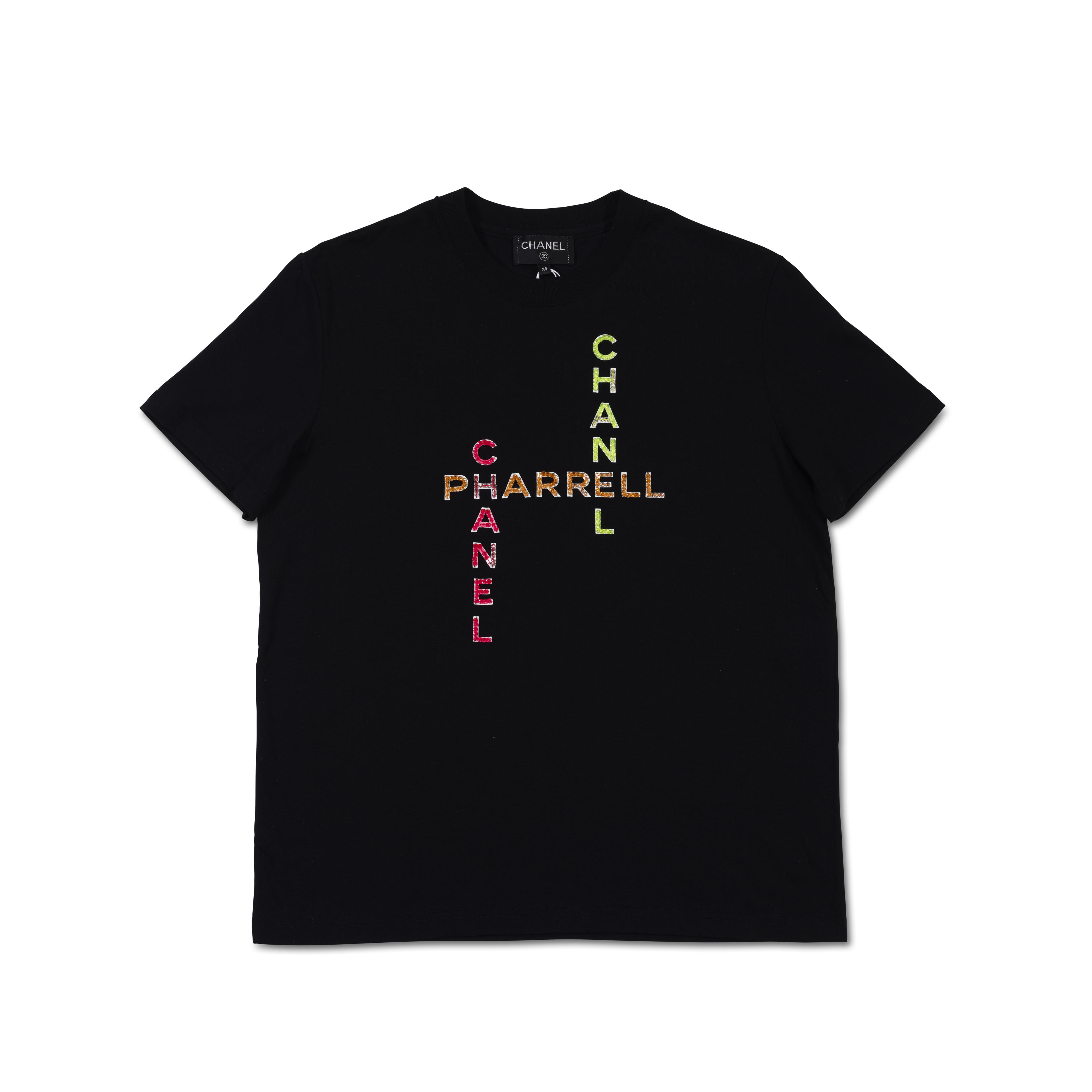This black cotton t-shirt from the Chanel x Pharrell capsule balances effortless wearability with distinctive design. Featuring beaded writing across the front, the piece elevates a classic tee into a statement of modern luxury. Sleek, versatile, and emblematic of the collection’s blend of streetwear attitude and Chanel refinement.