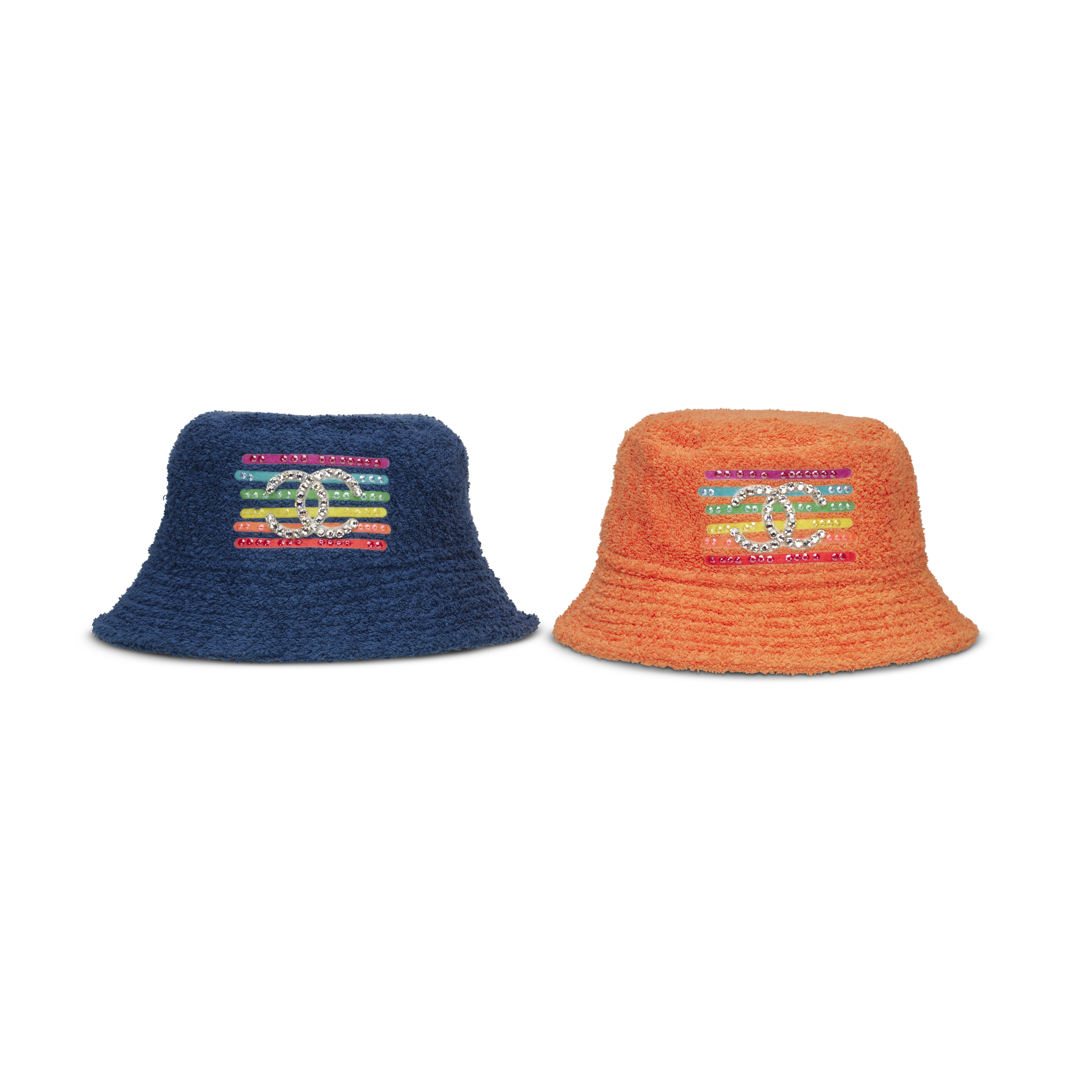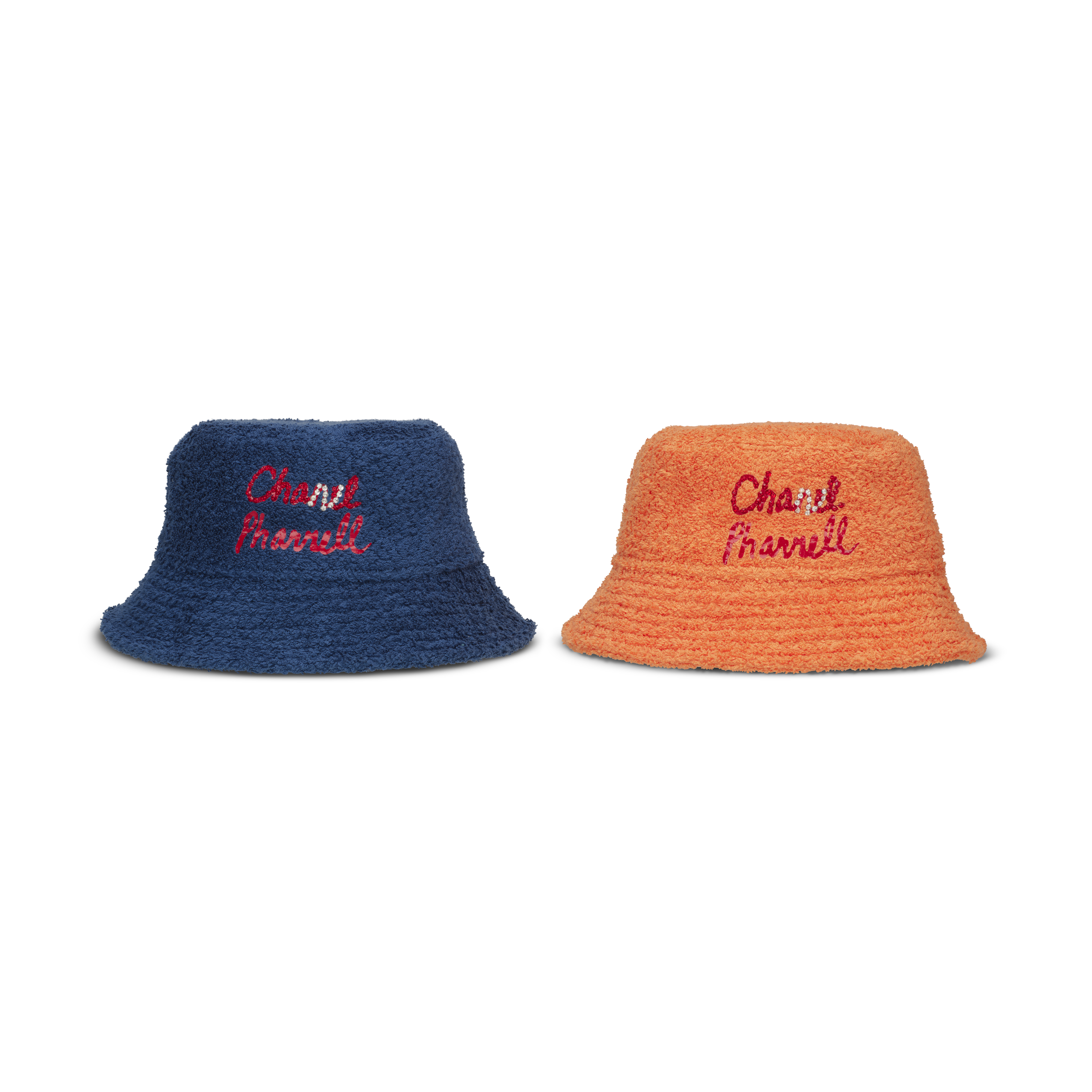 From the vibrant Chanel x Pharrell capsule, this pair of terry cloth hats showcases the collection’s playful, street-inspired aesthetic. One crafted in bold orange the other in a warm blue, each hat features soft, plush texture and the signature Chanel branding reimagined through Pharrell’s energetic lens with colorful beadwork. Highly collectible and produced in limited quantities, the duo captures the spirit of the collaboration—youthful, expressive, and effortlessly elevated.