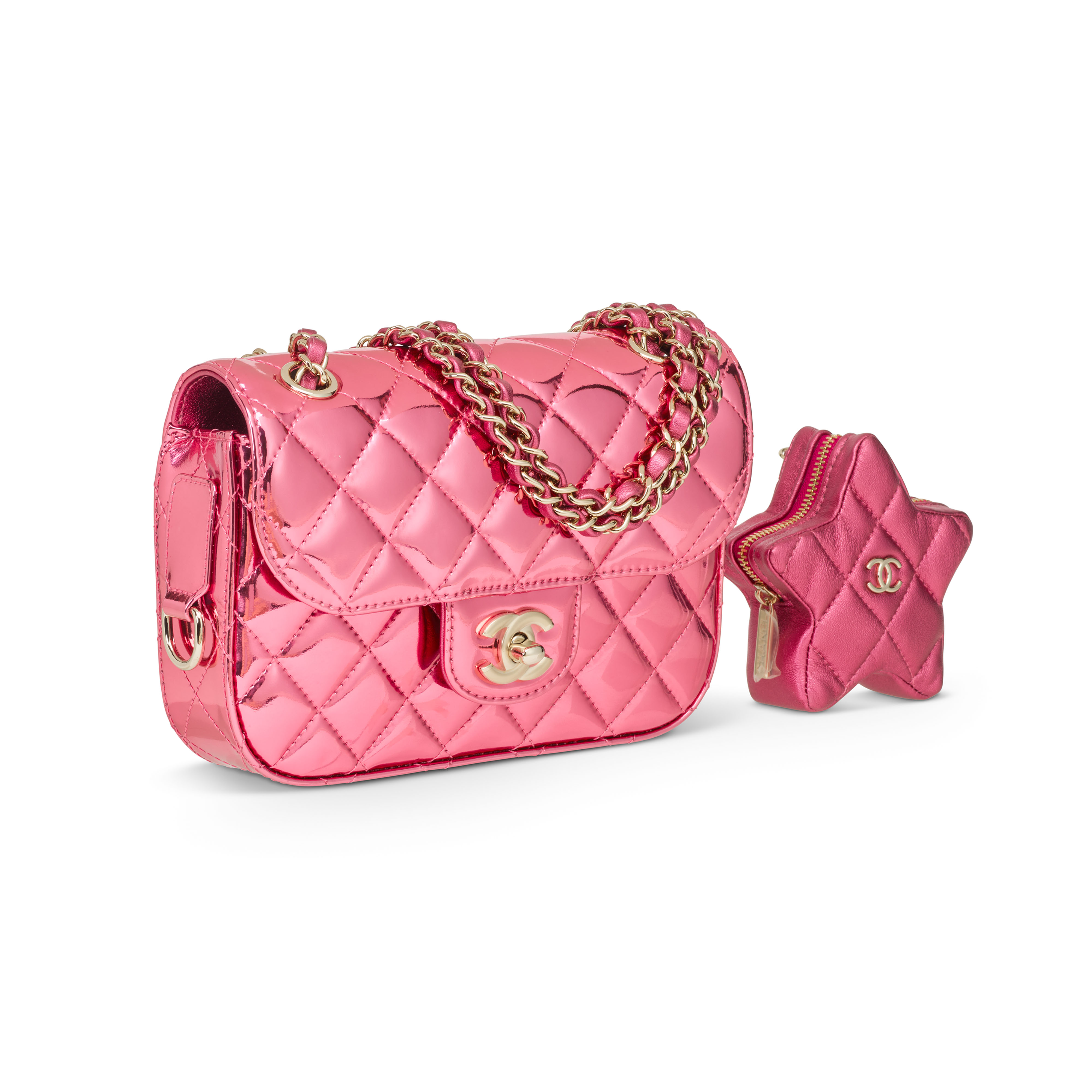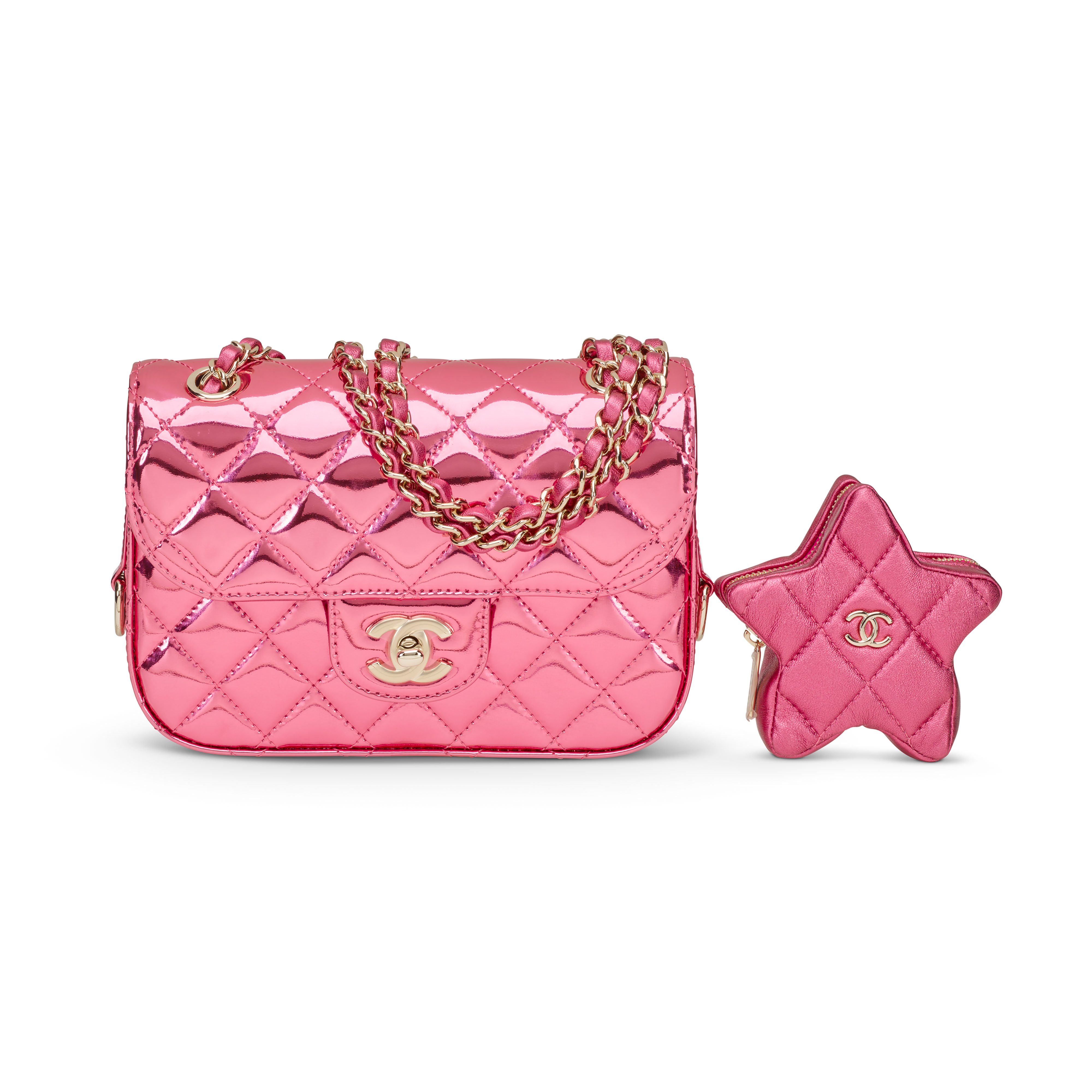 Bold, glamorous and full of personality, this Chanel Barbie Pink Metallic bag captures the playful spirit of Hollywood style. The vibrant metallic pink finish reflects the light beautifully and gives the piece an irresistible sense of fun. A charming star shaped removable key pouch adorns the bag and adds an extra touch of whimsy that enhances its pop inspired appeal. Sought after for its radiant finish and youthful attitude, this limited Chanel creation is a dream accessory for collectors who appreciate pieces that are bright, joyful and full of character.