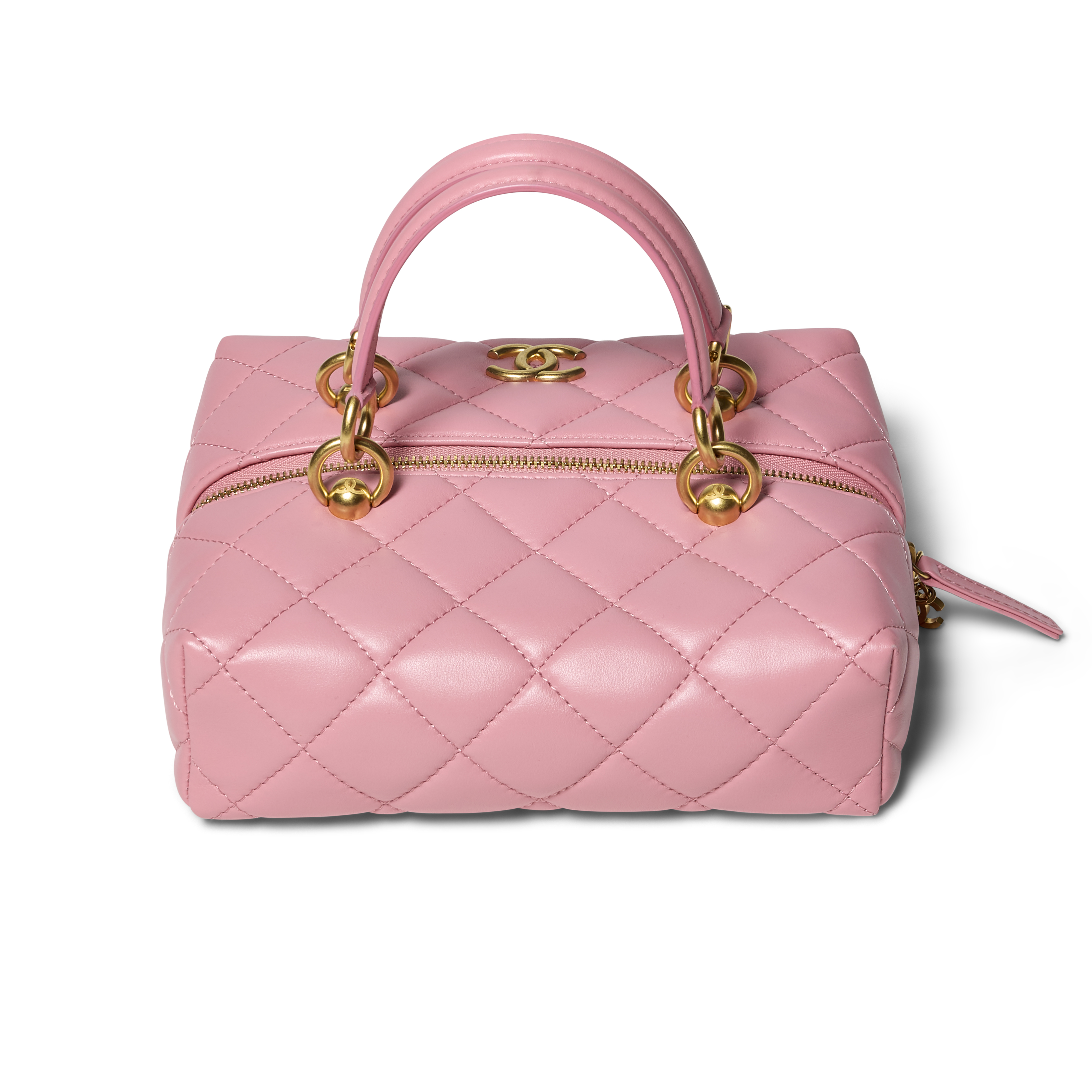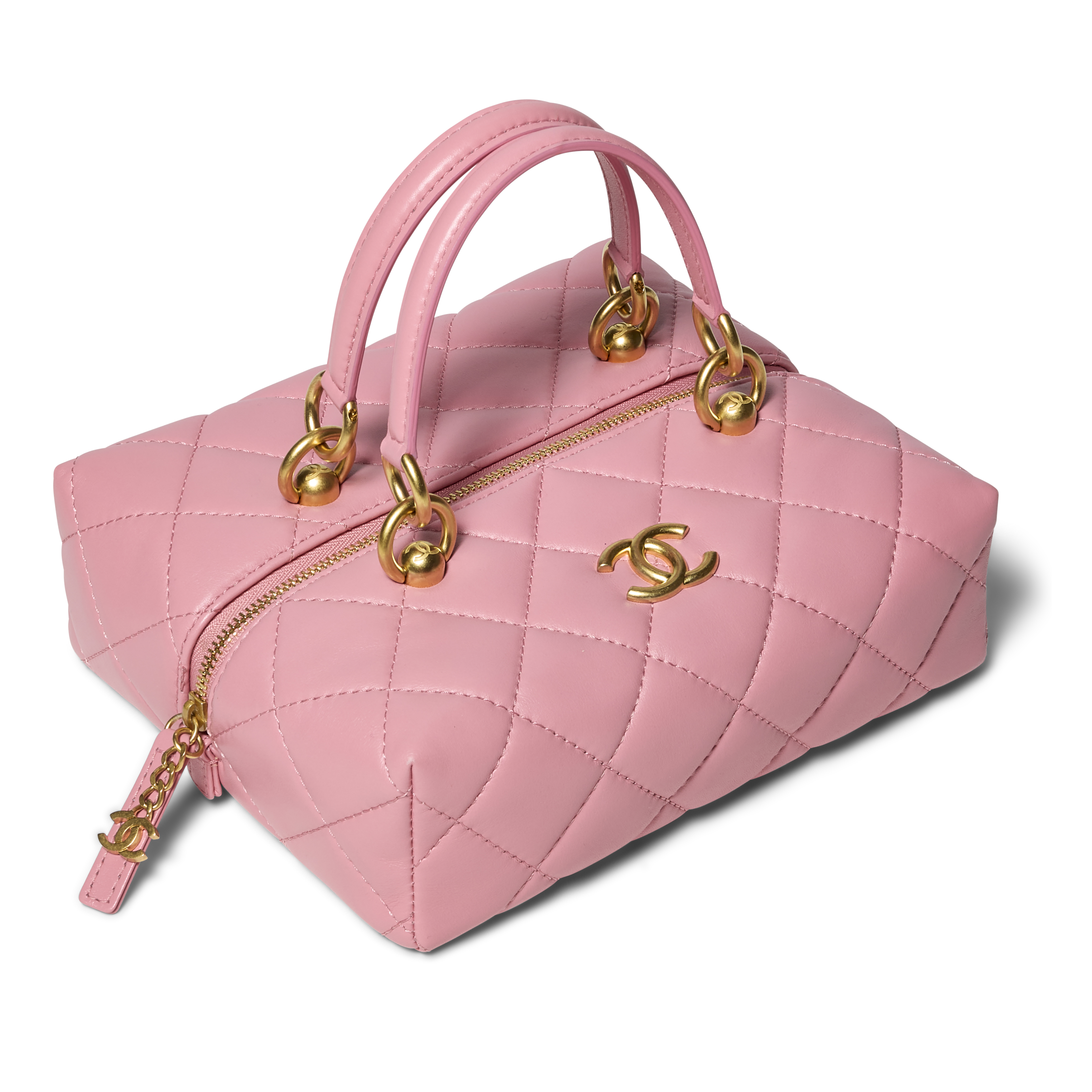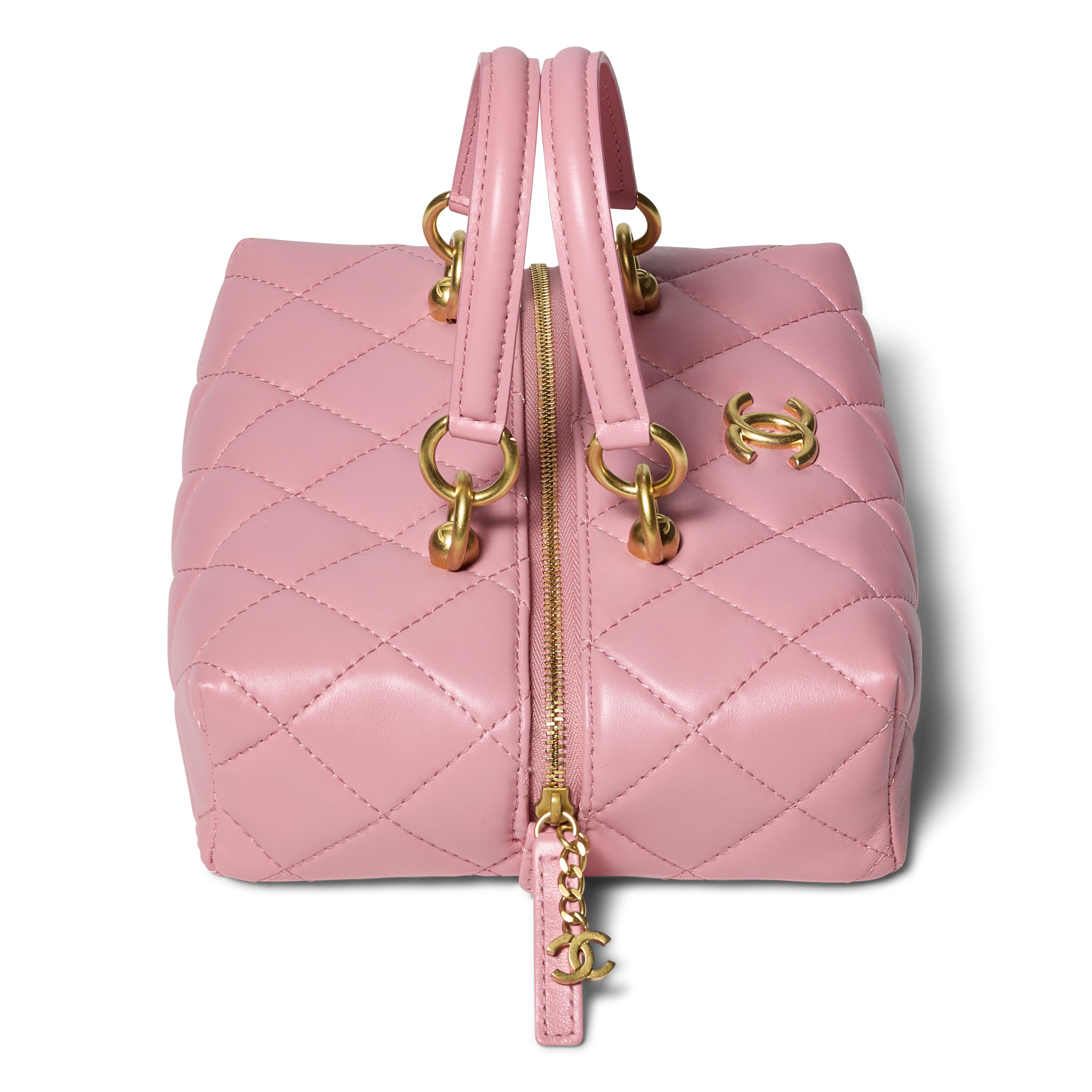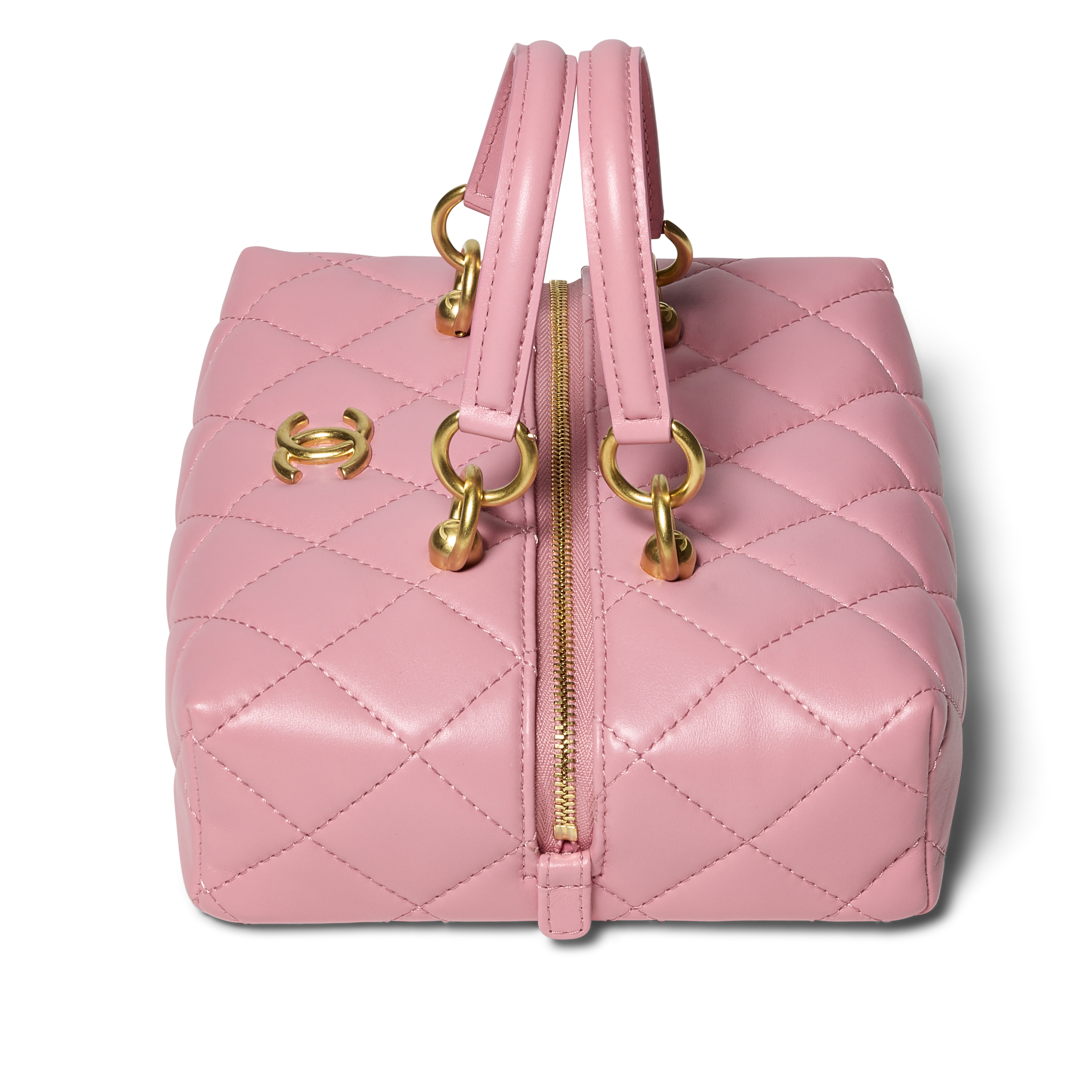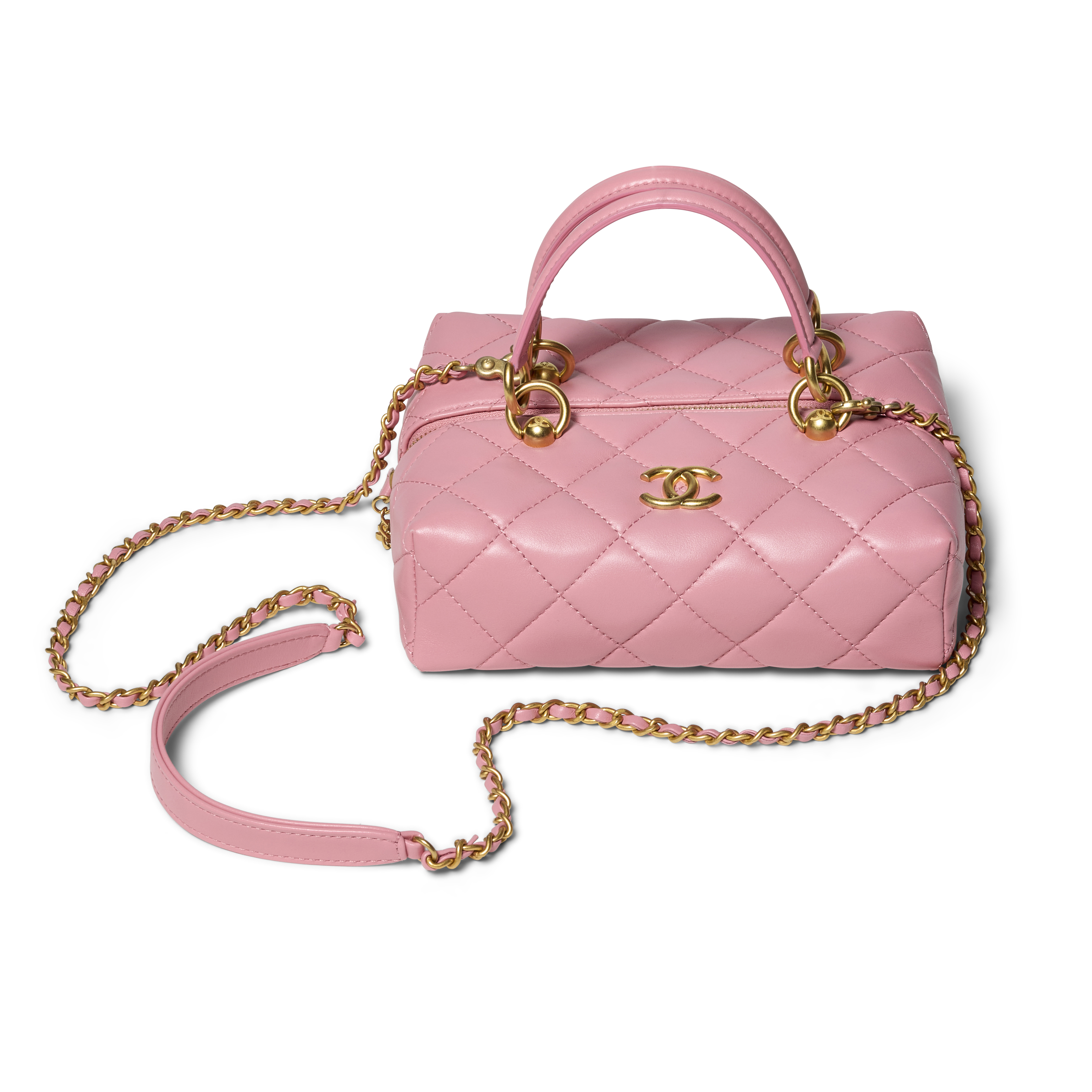 The Chanel Pink Quilted Lambskin Leather Bag is a charming and distinctive design, crafted in soft lambskin with radiant gold hardware. Its unique flattened box silhouette sets it apart, offering a fresh reinterpretation of classic Chanel structure. Featuring two pink leather top handles and a longer strap for versatile carry, it blends playful elegance with everyday practicality.
