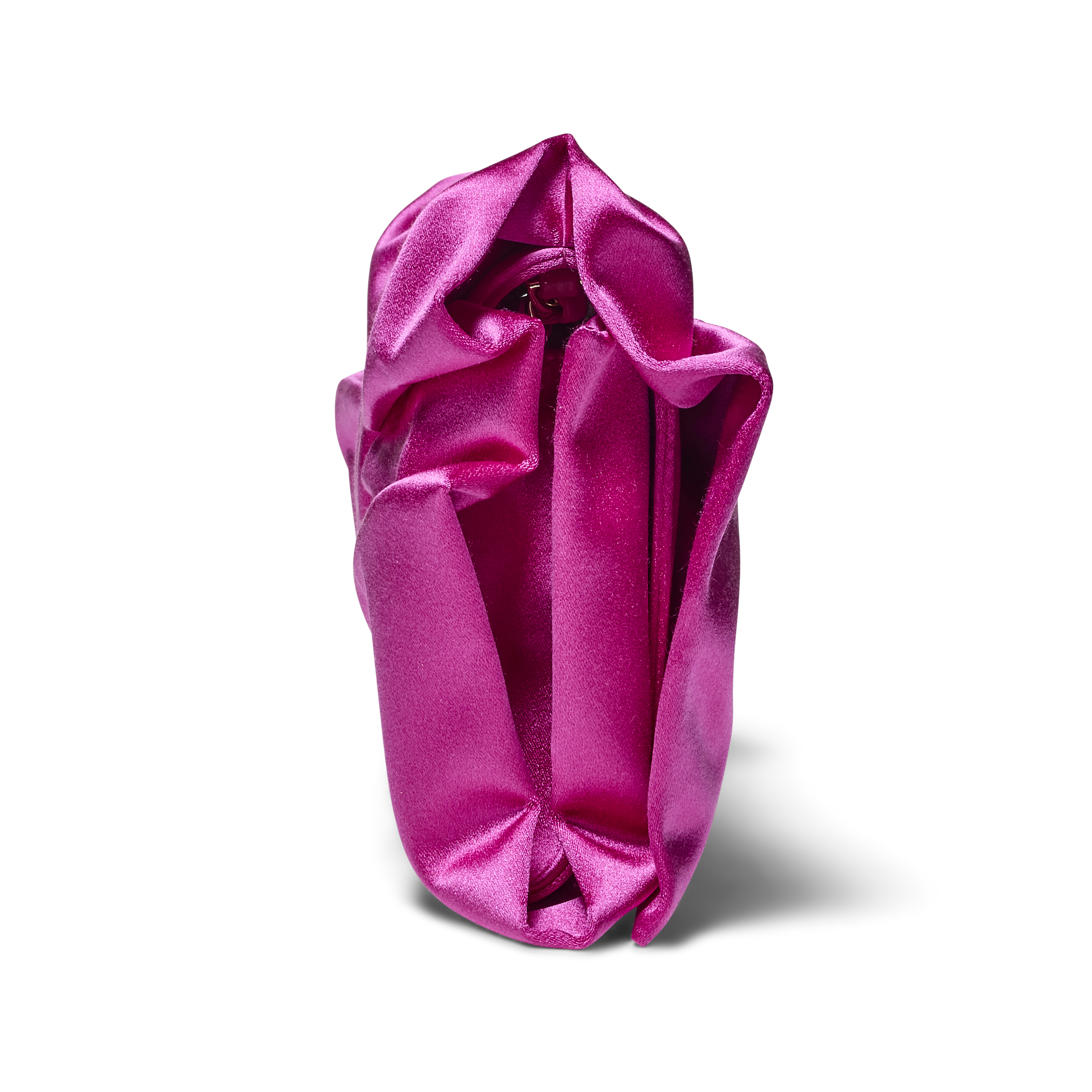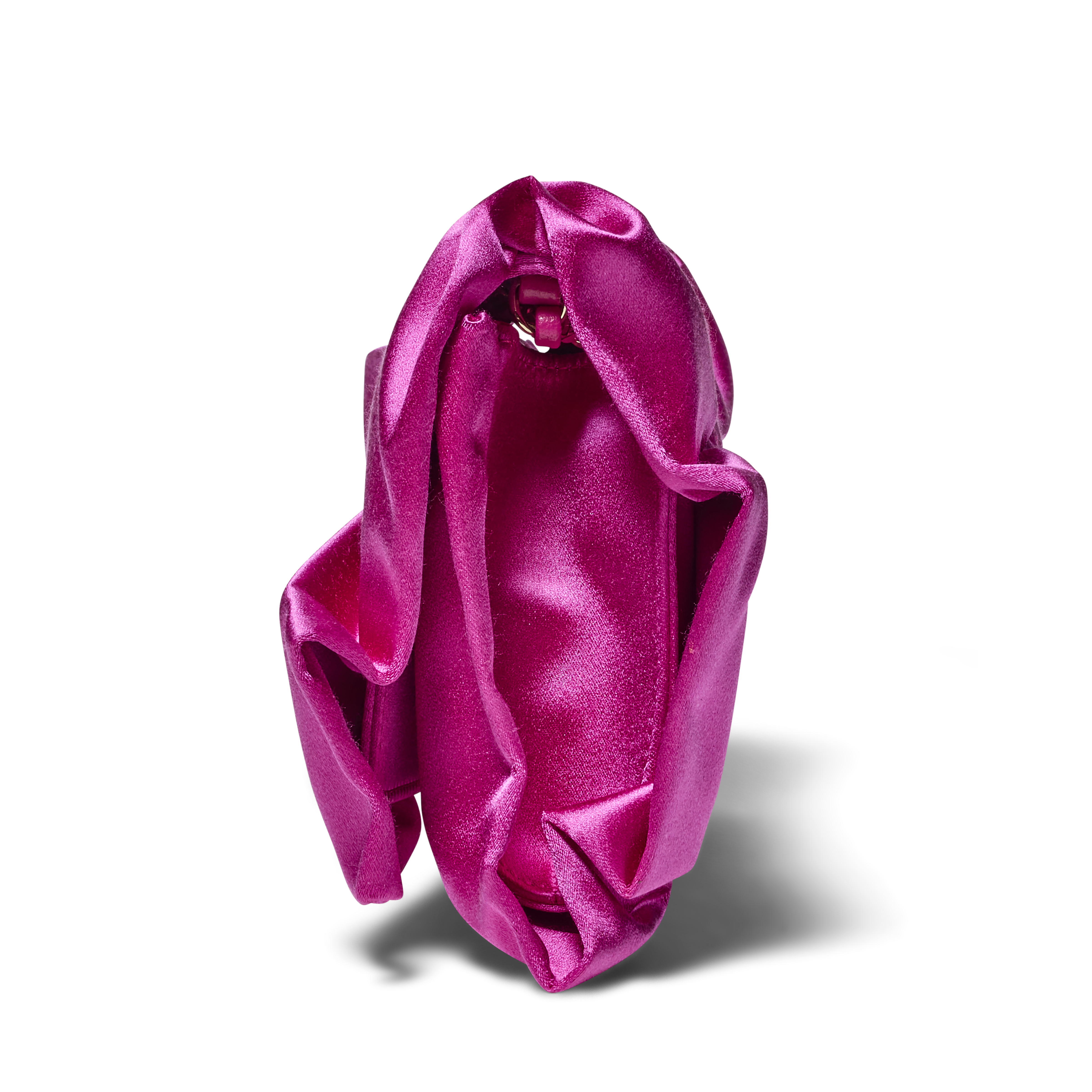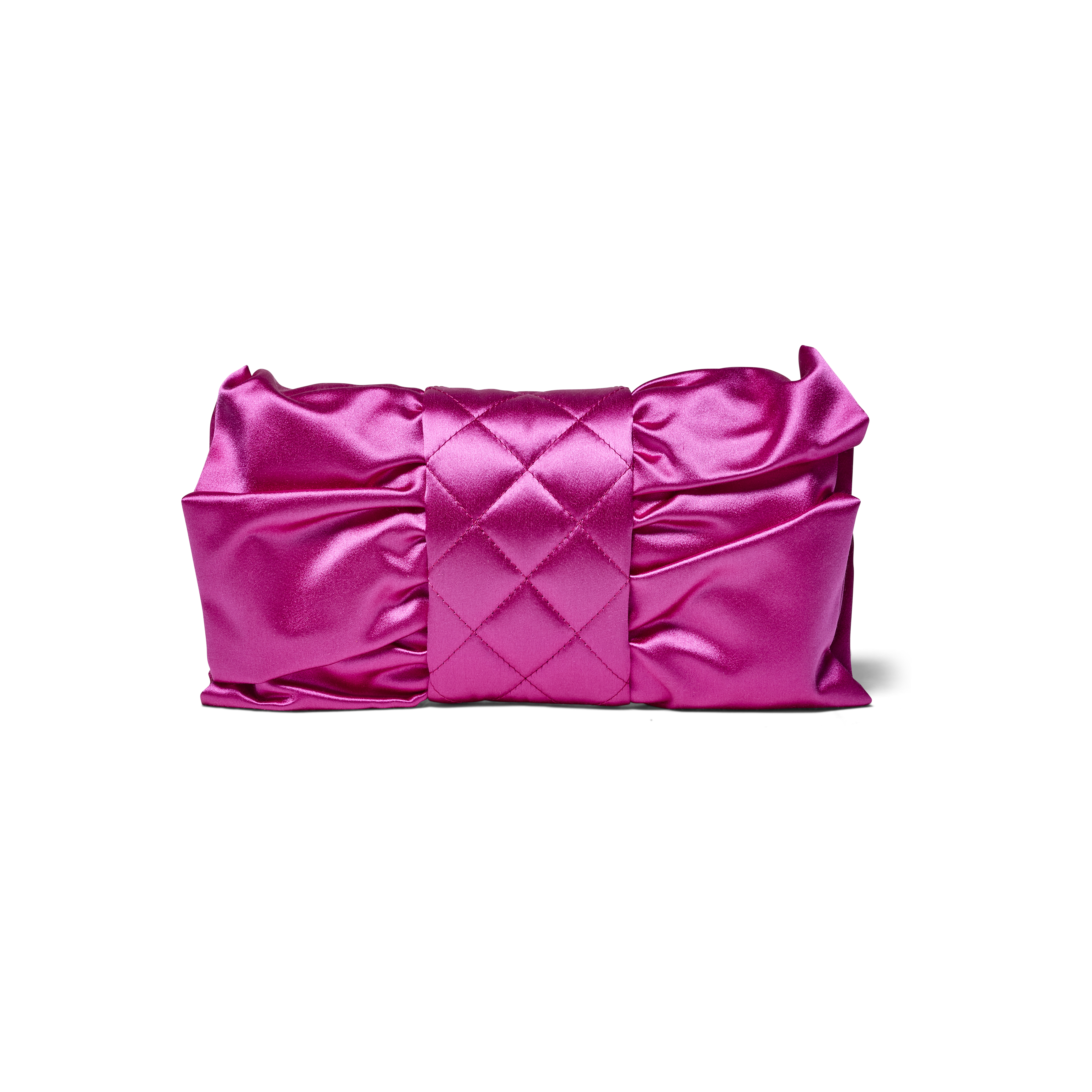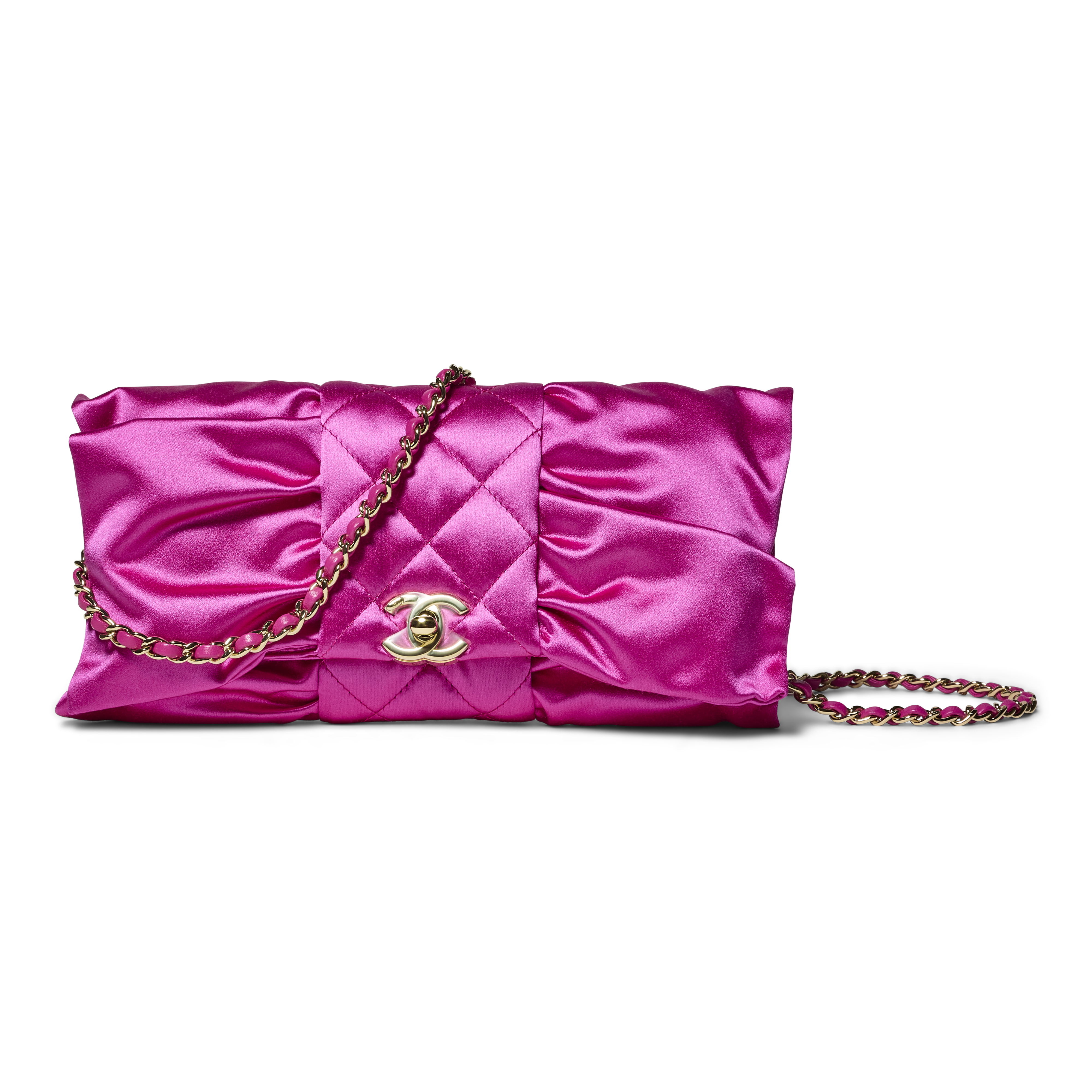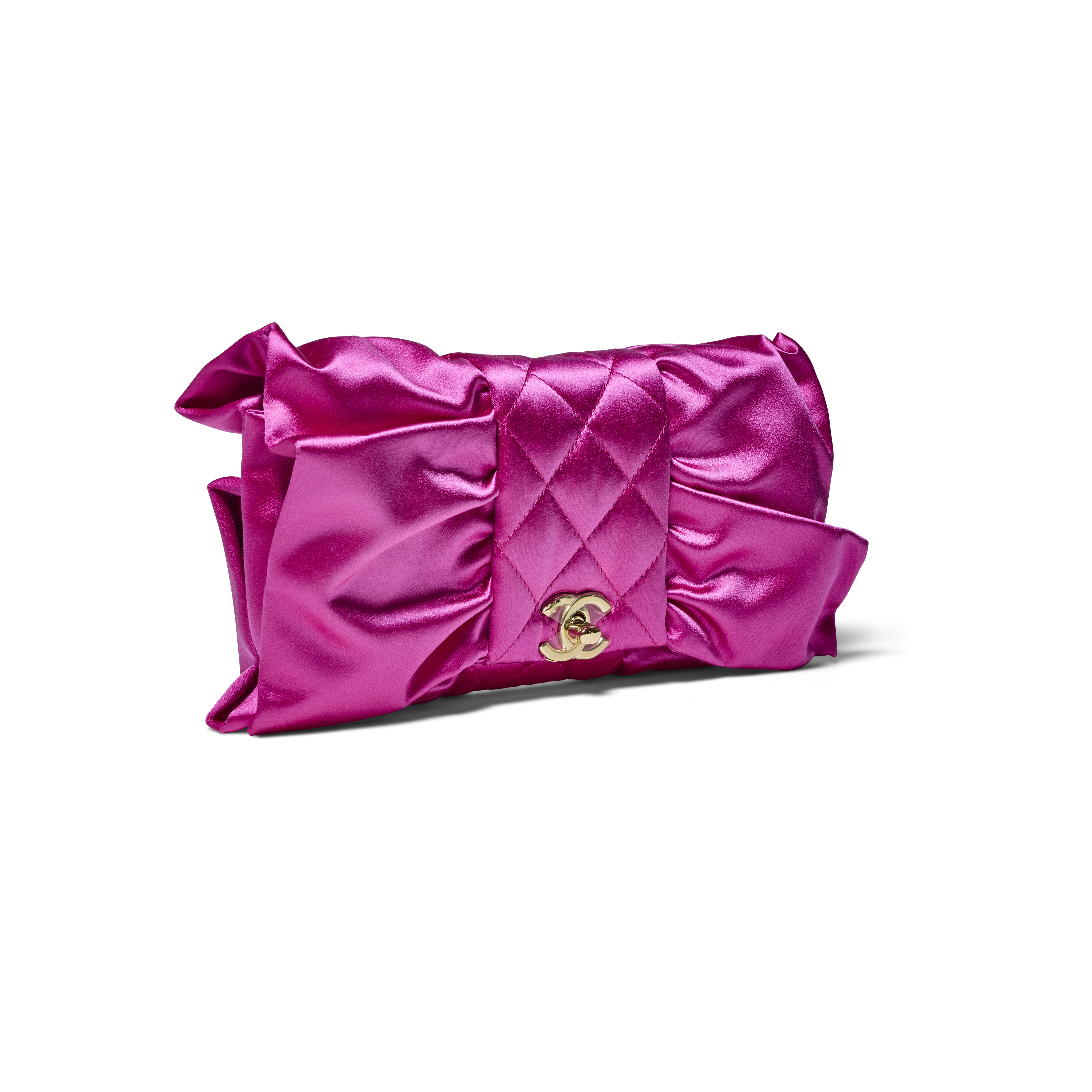 The Chanel Fuschia Satin Bow Bag is a striking statement piece crafted in a vivid fuchsia satin, shaped like an elegant bow cinched at the center with a quilted detail. Accented with radiant gold-toned hardware and lined in supple leather, it blends playful couture styling with luxurious craftsmanship. Bold, feminine, and runway-worthy, it is an eye-catching accessory for any refined ensemble.