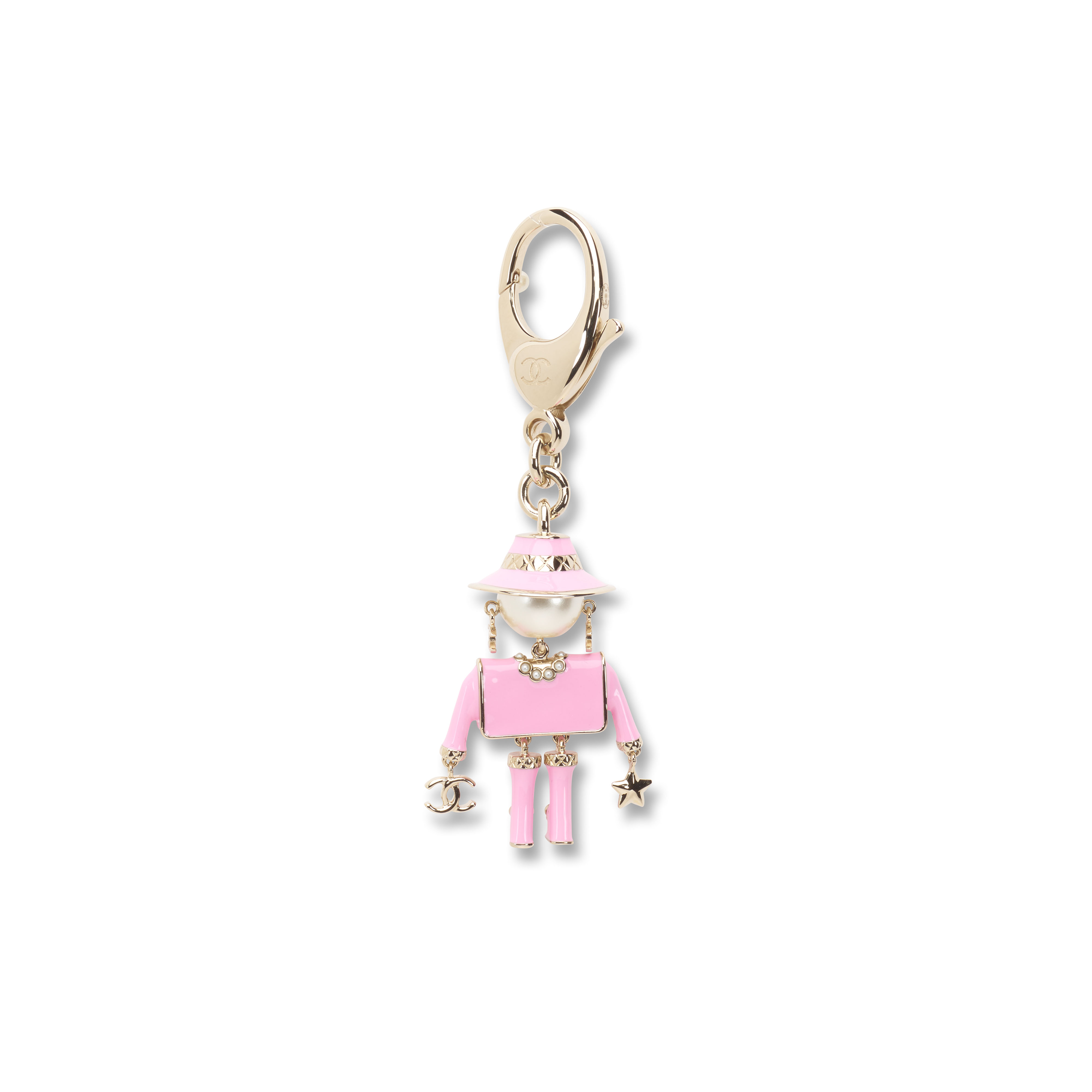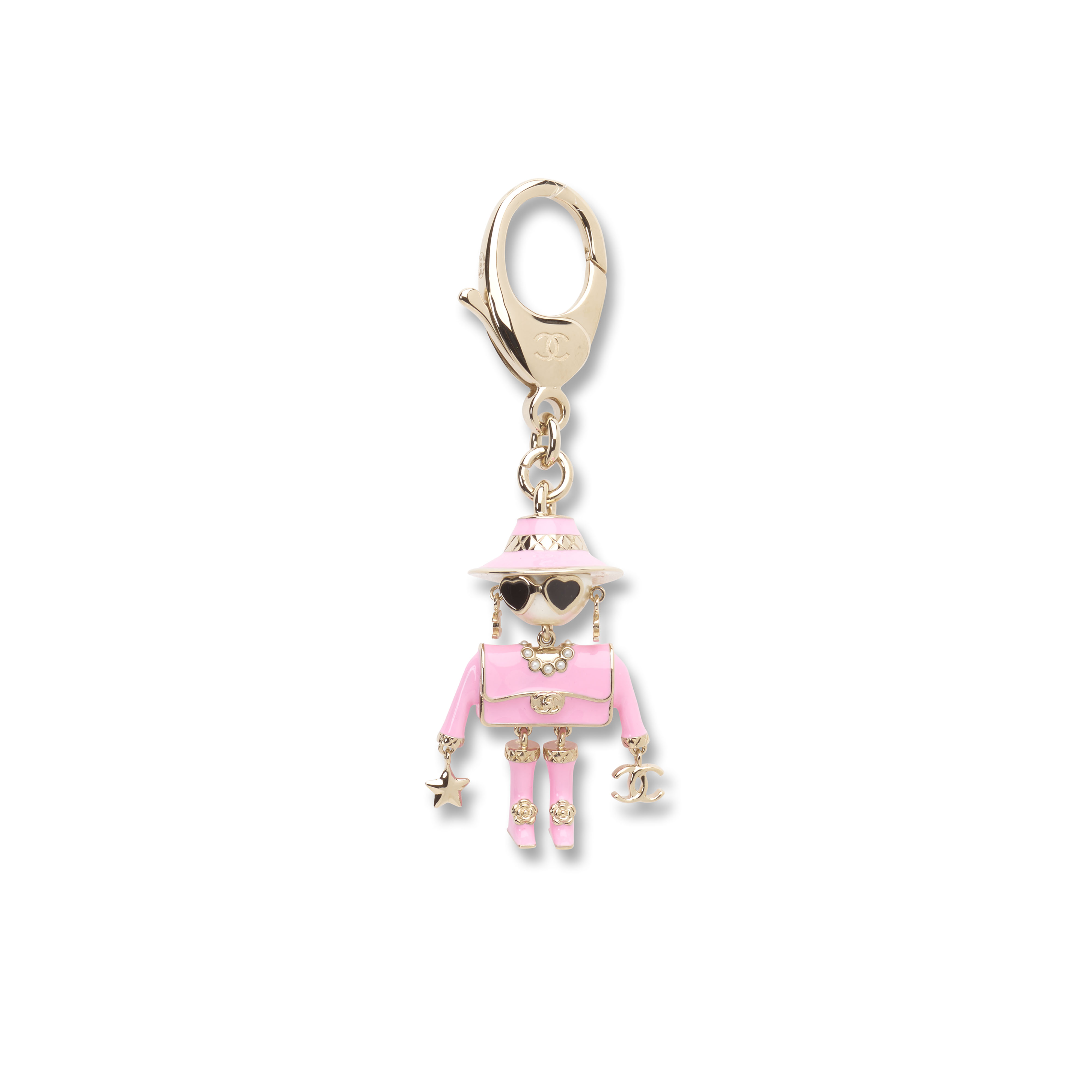 This charming duo of Chanel Gabrielle keychains showcases the Maison’s playful spirit and unmistakable attention to detail. The first charm features Gabrielle dressed in soft pink with whimsical black heart-shaped sunglasses, a classic Chanel hat, CC earrings, a faux pearl necklace and dangling arms and legs that give the piece lively movement. One hand holds a gold star while the other carries a miniature CC, adding signature house iconography to her characterful silhouette.