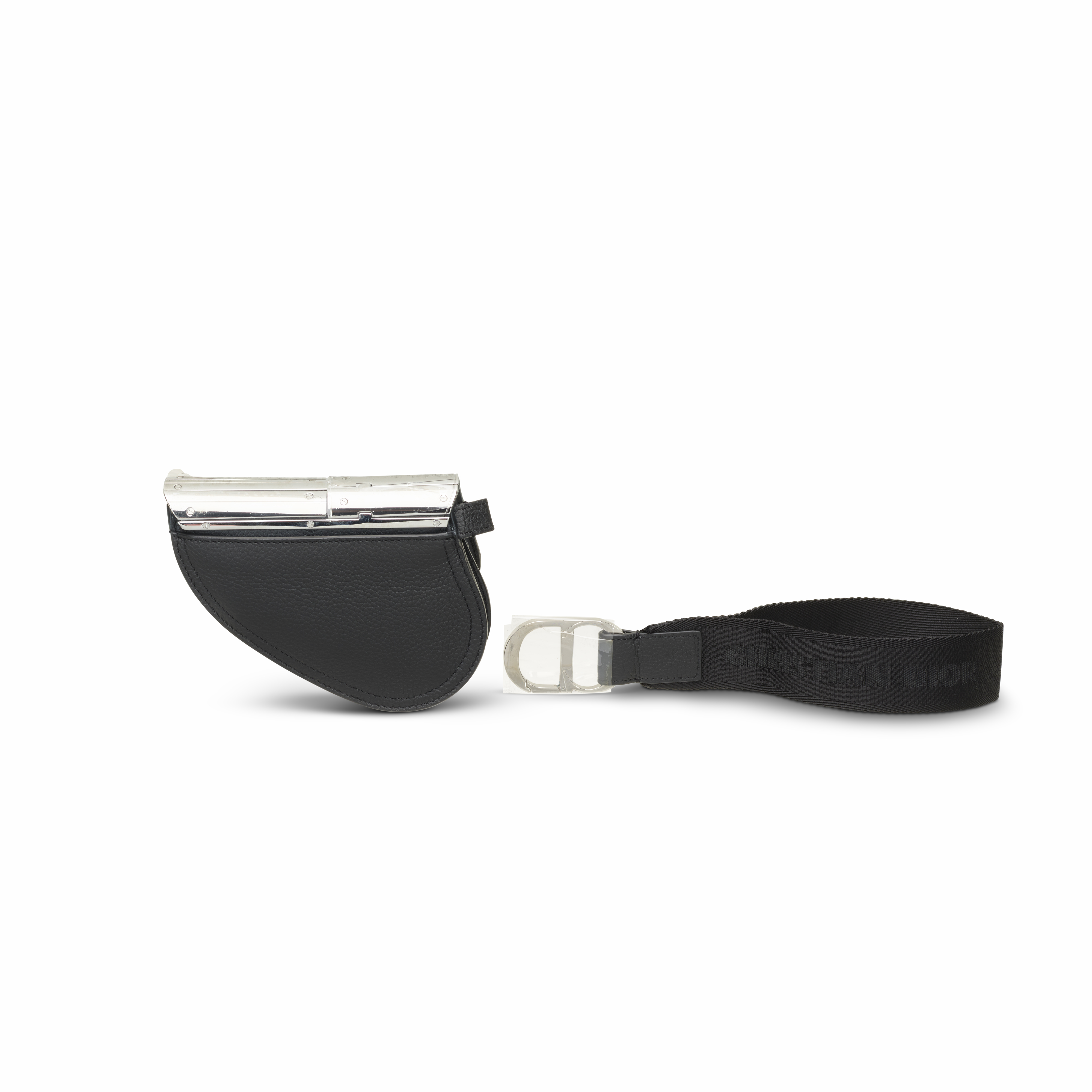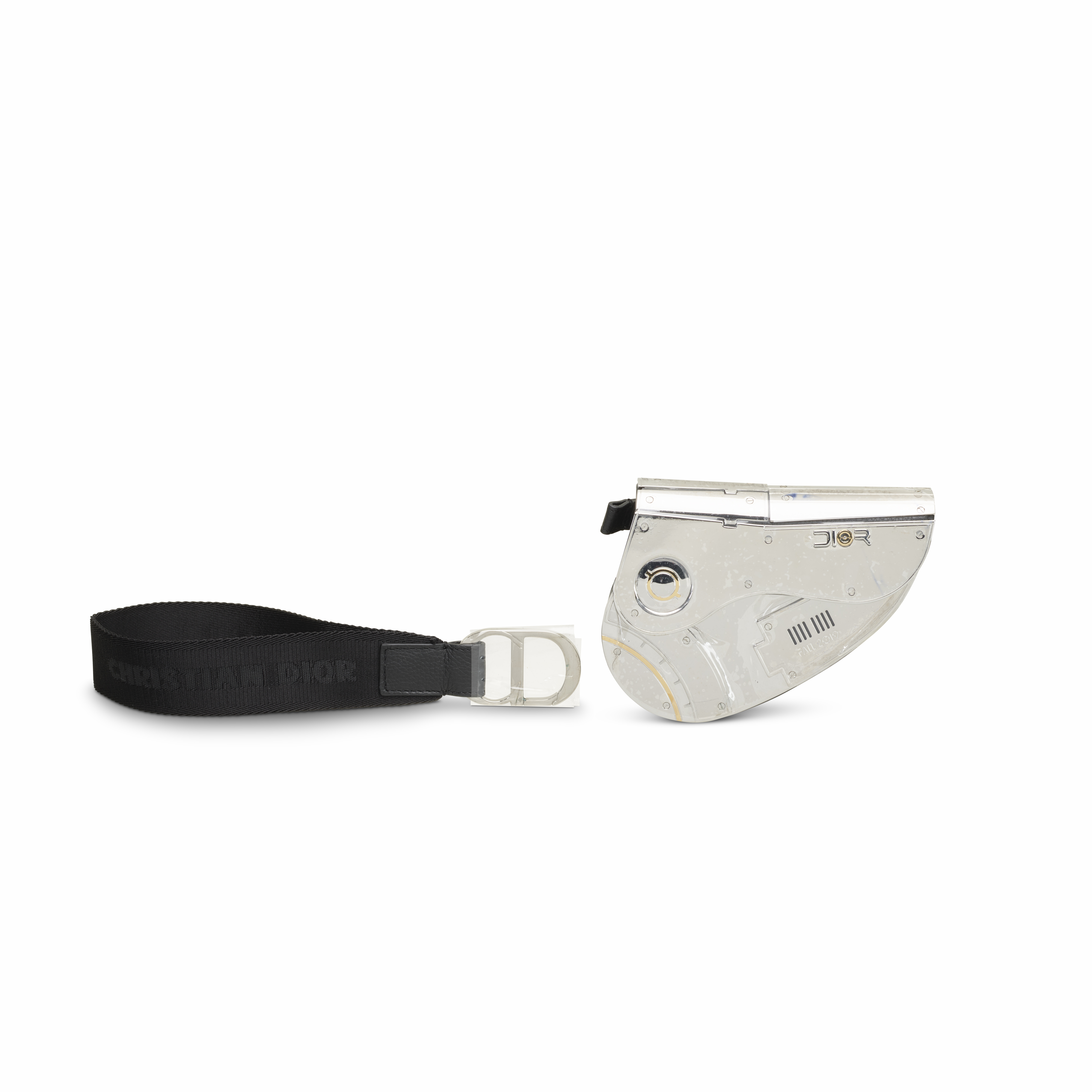 This rare small-format Saddle Bag from the groundbreaking Dior x Hajime Sorayama collaboration reimagines one of the house’s most iconic silhouettes as a gleaming sculptural object. Executed entirely in reflective silver-toned metal, the piece showcases Sorayama’s signature futuristic aesthetic, accented by thin gold line details that mimic a mechanical, almost robotic precision. The interior tag is marked “LIMITED EDITION No 040,” while the removable shoulder strap adds versatility to its art-object presence. A striking fusion of couture craftsmanship, industrial design, and science-fiction influence, this miniature metal Saddle stands as one of the most collectible creations from Dior Men’s Pre-Fall 2019 under Kim Jones.