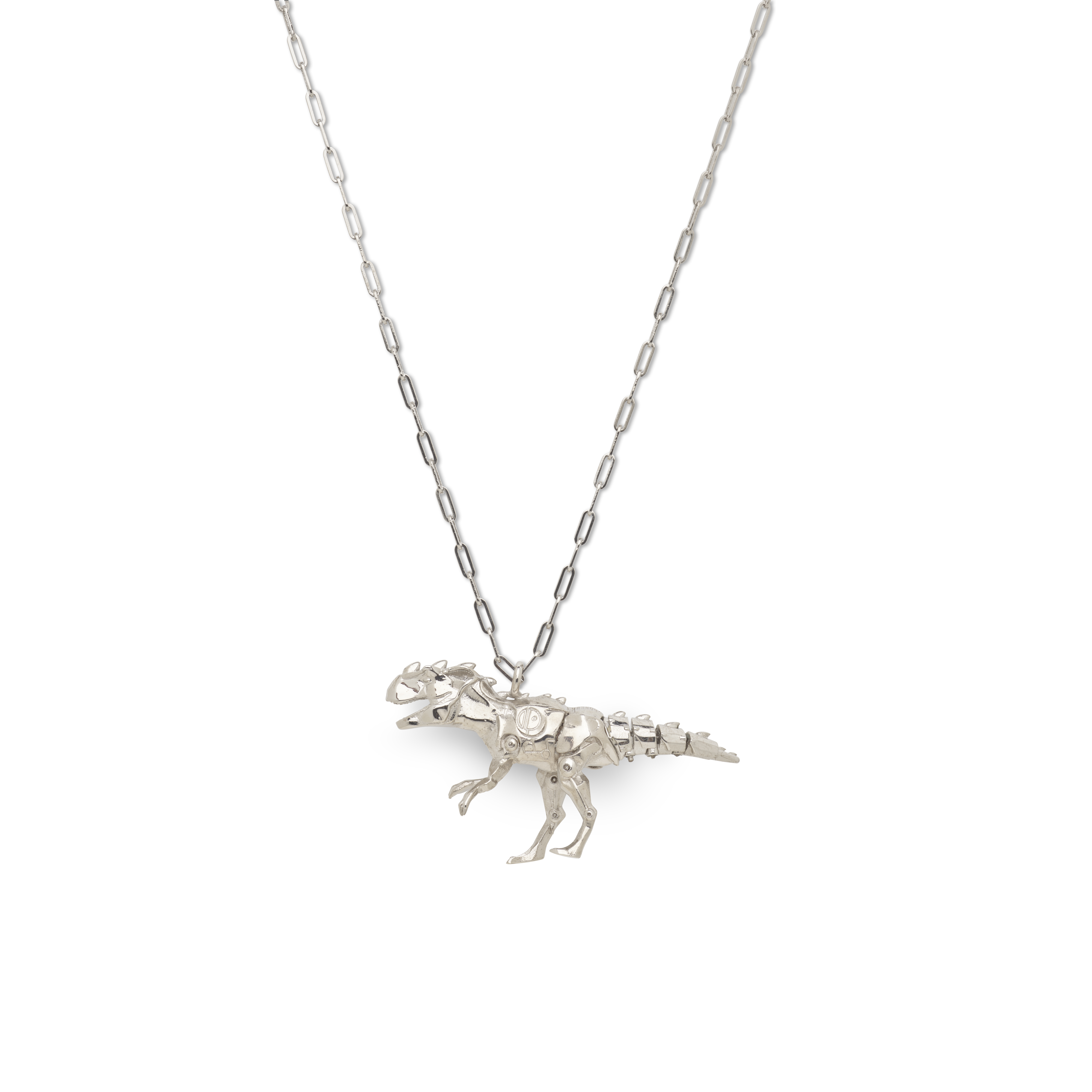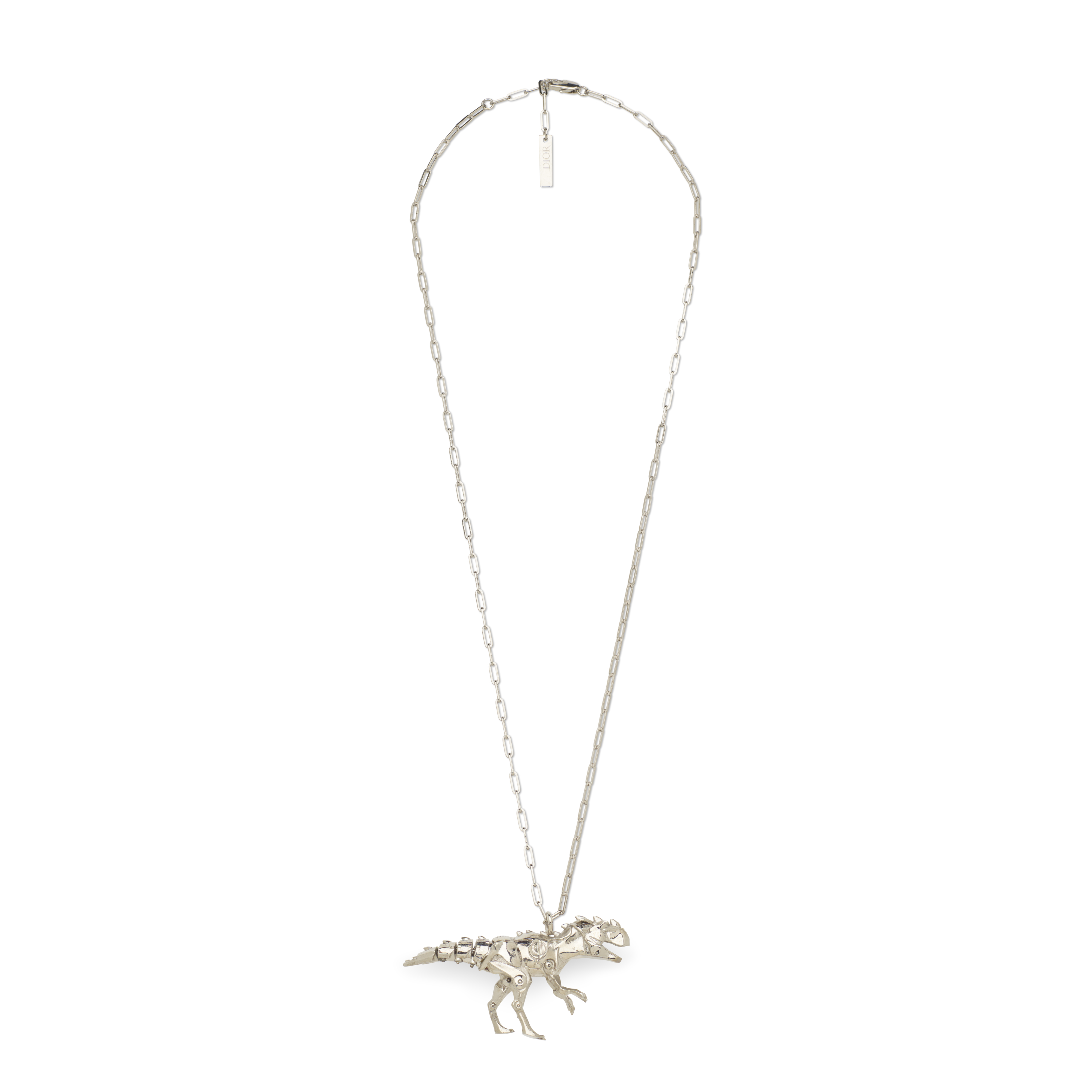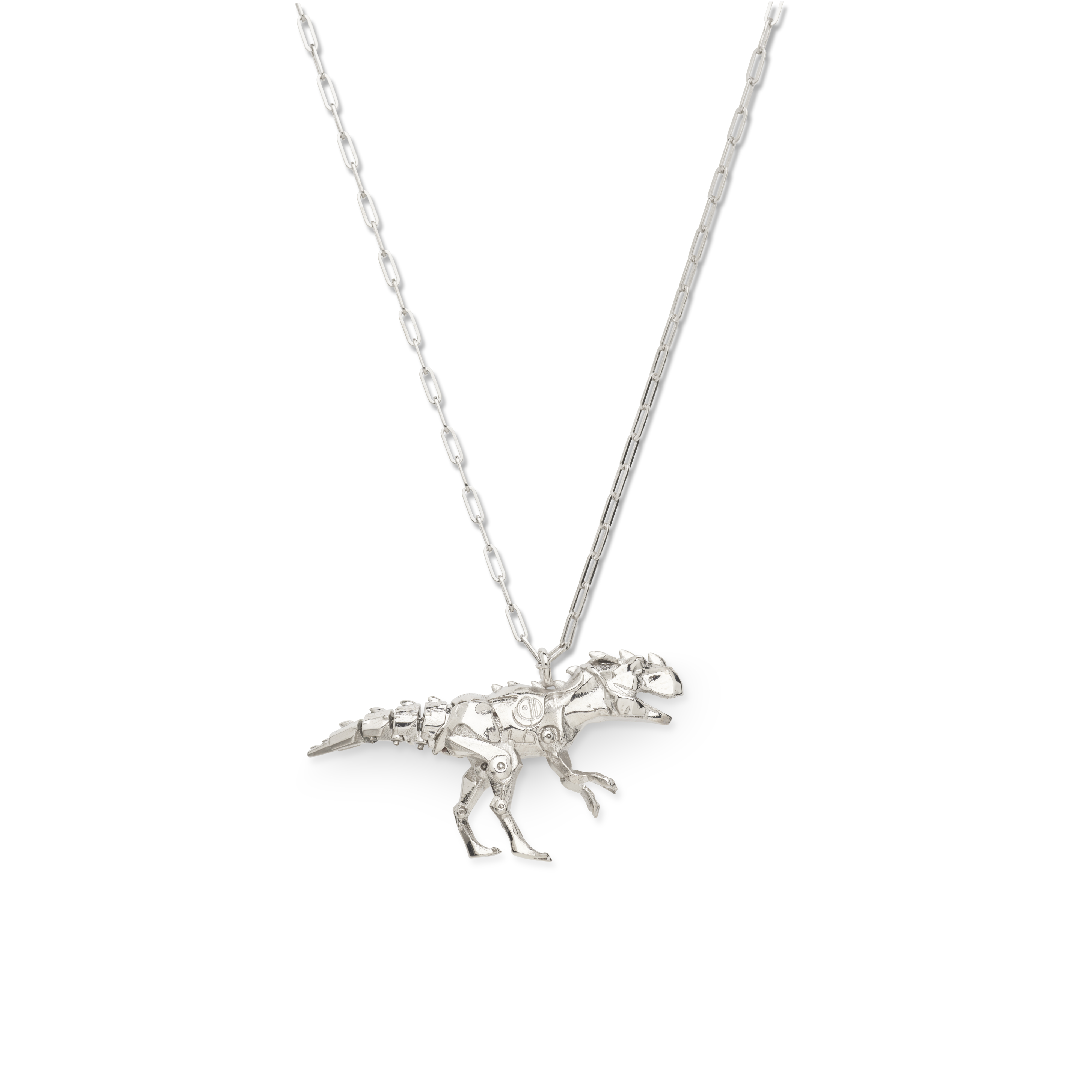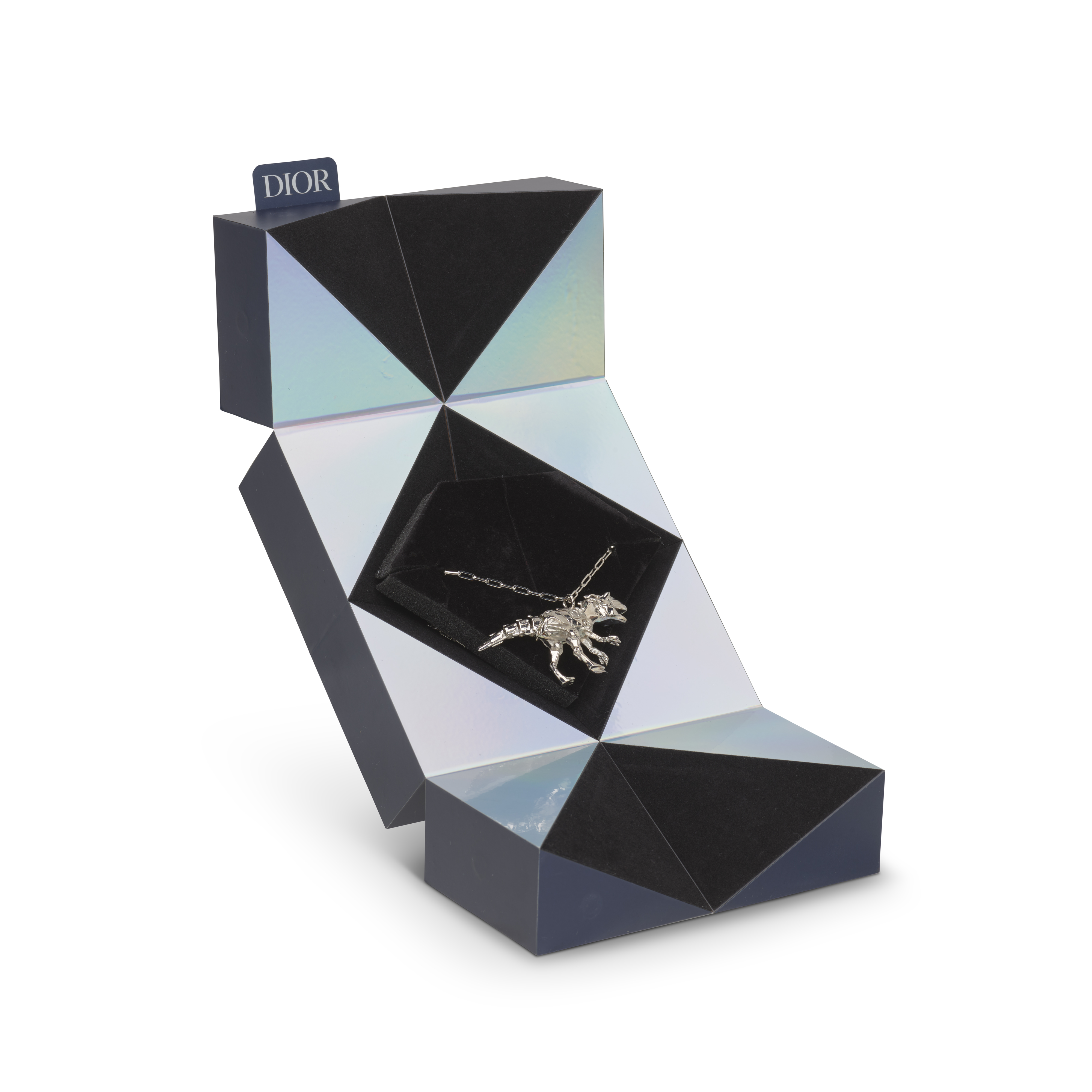 This Dior x Sorayama Dinosaur Necklace from Dior Men’s Pre-Fall 2019 collection captures the seamless blend of couture craftsmanship and futuristic design that defined the collaboration. The sculpturally precise pendant is realized in glistening silver tones with a playful moving tail that adds kinetic charm. The necklace effortlessly encapsulates Hajime Sorayama’s signature fusion of robotics, fantasy and science-fiction.