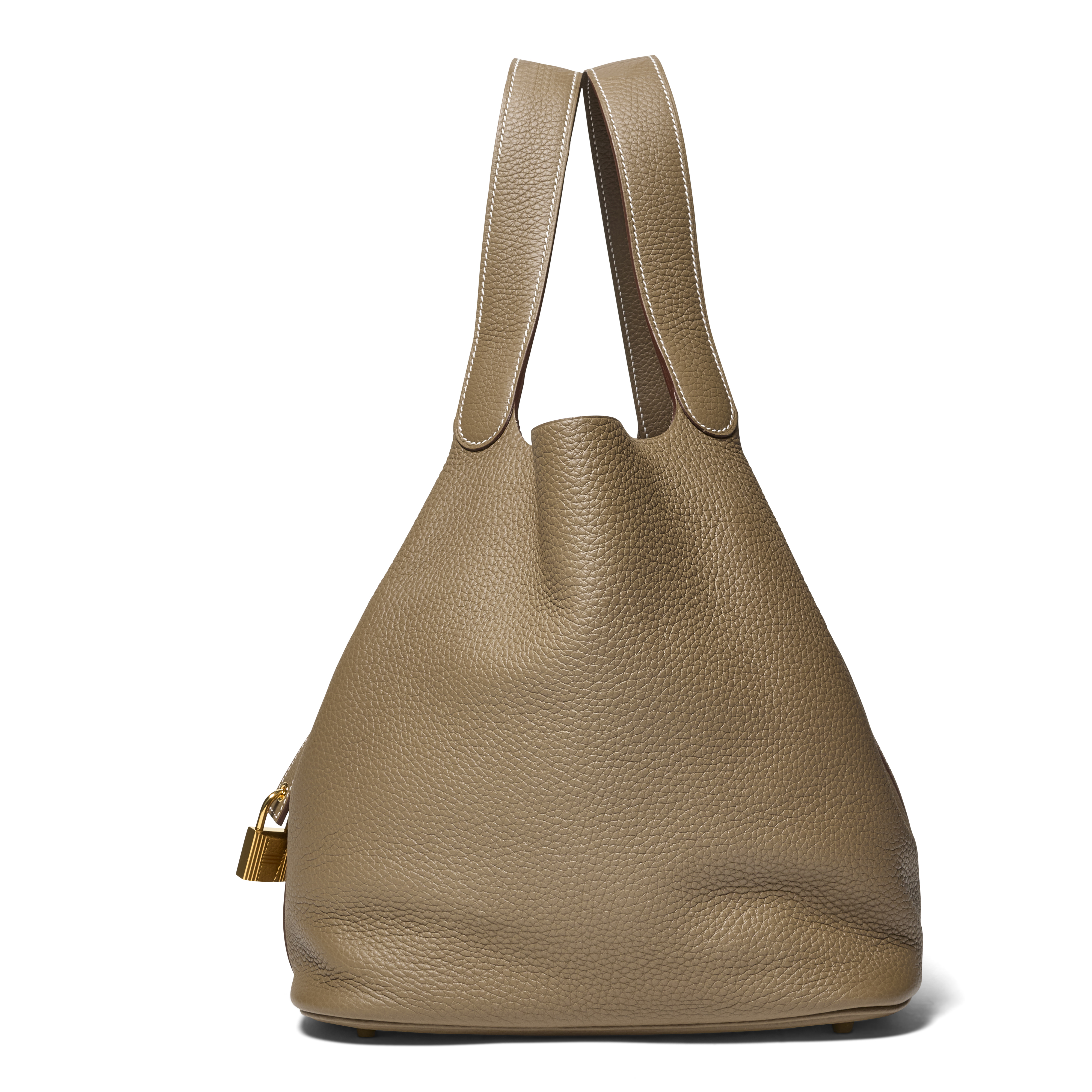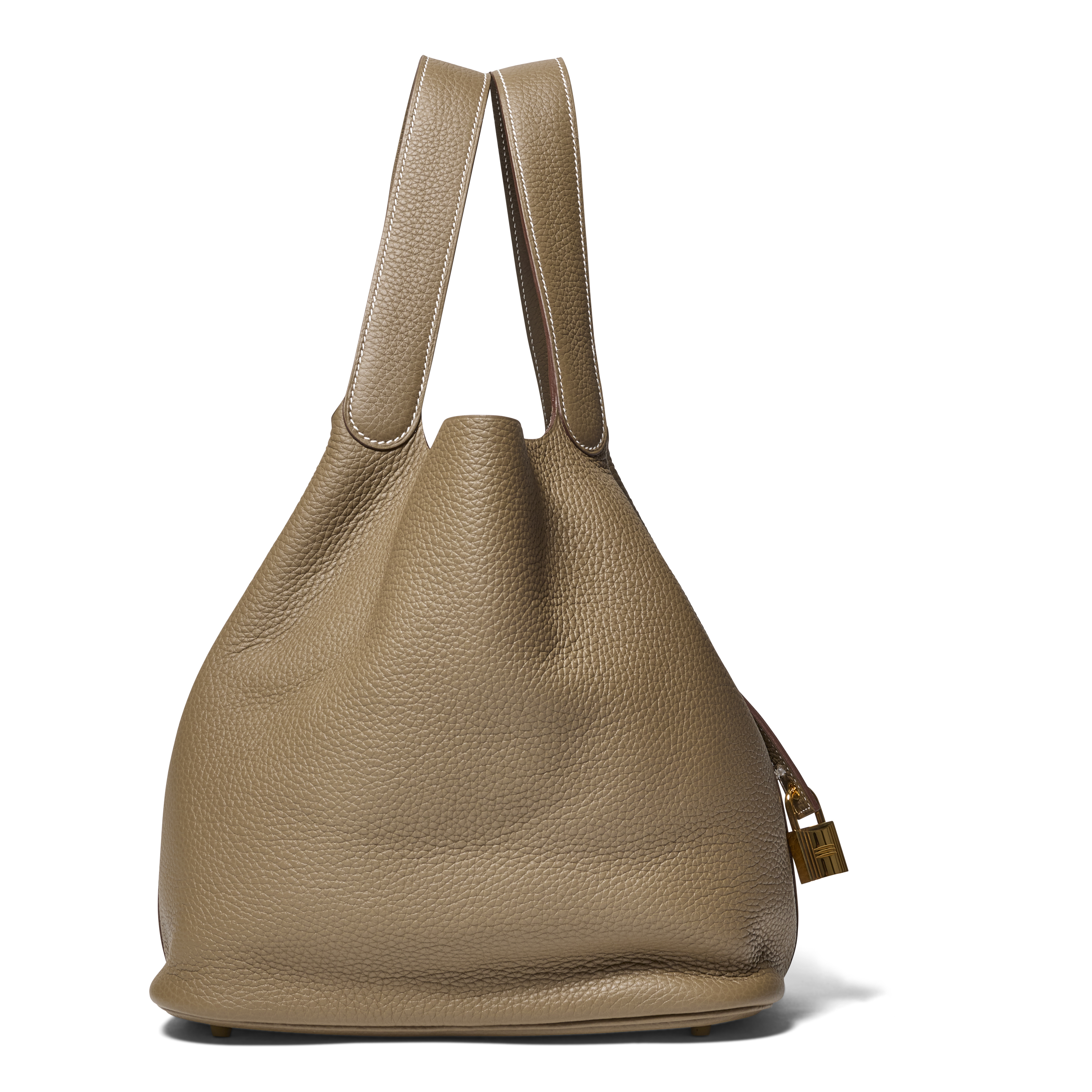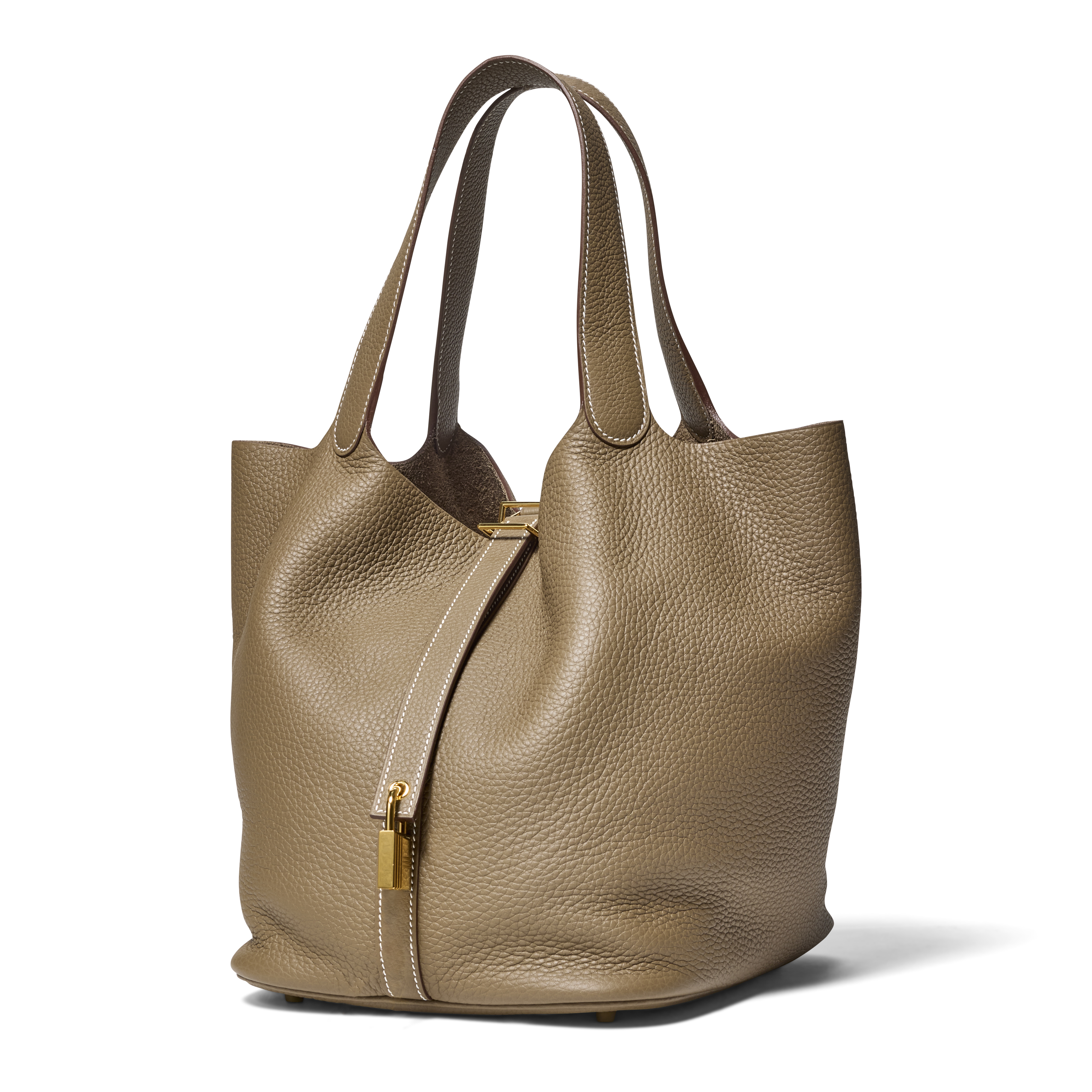 The Hermès Etoupe Clémence Leather Picotin Lock 26 is an elegant expression of the Maison’s understated luxury. Crafted from Clémence leather and accented with gold hardware, it showcases the Picotin’s signature minimalist silhouette and effortless charm, in one of the most beloved colorways. The spacious 26 cm size offers refined practicality, making it an ideal everyday companion.