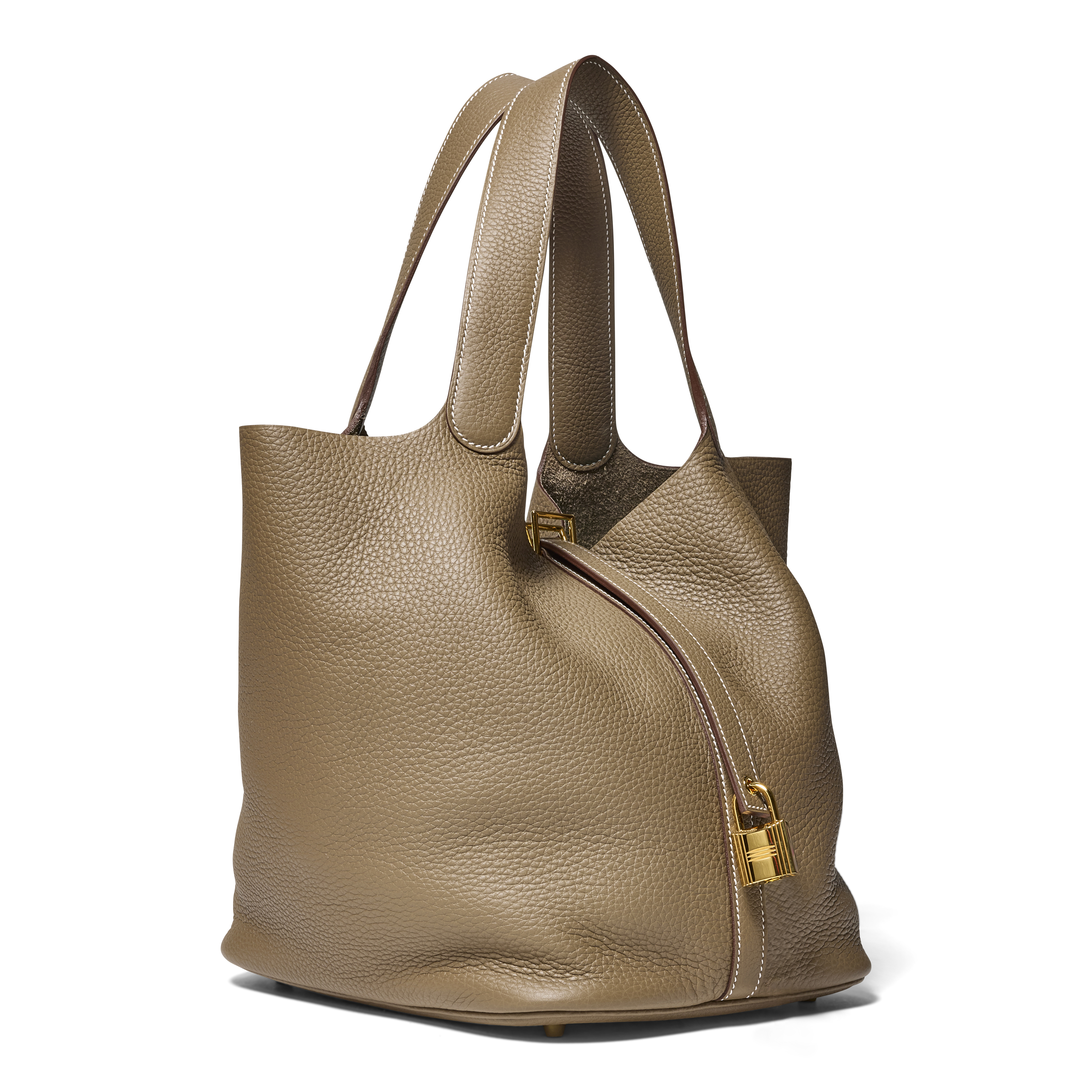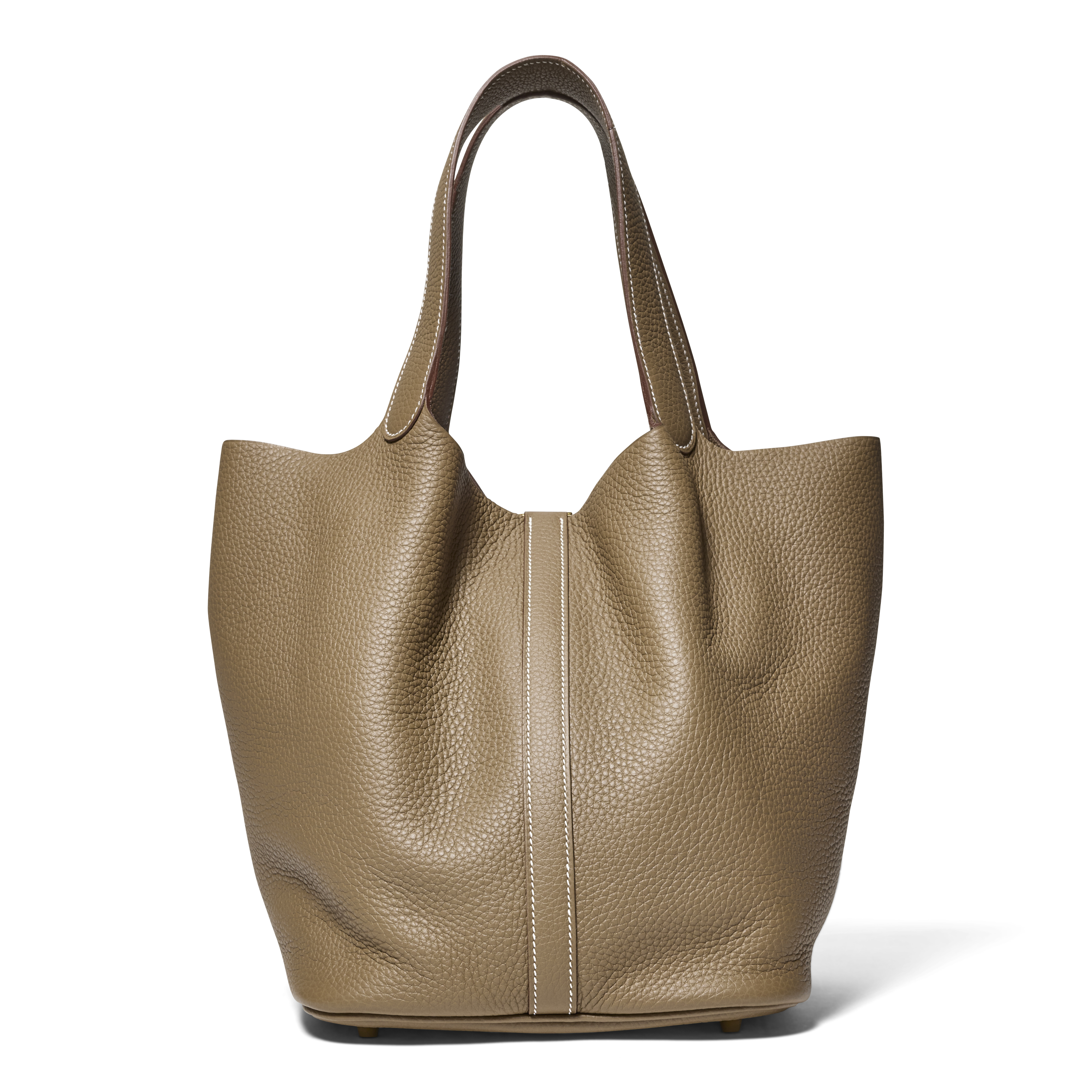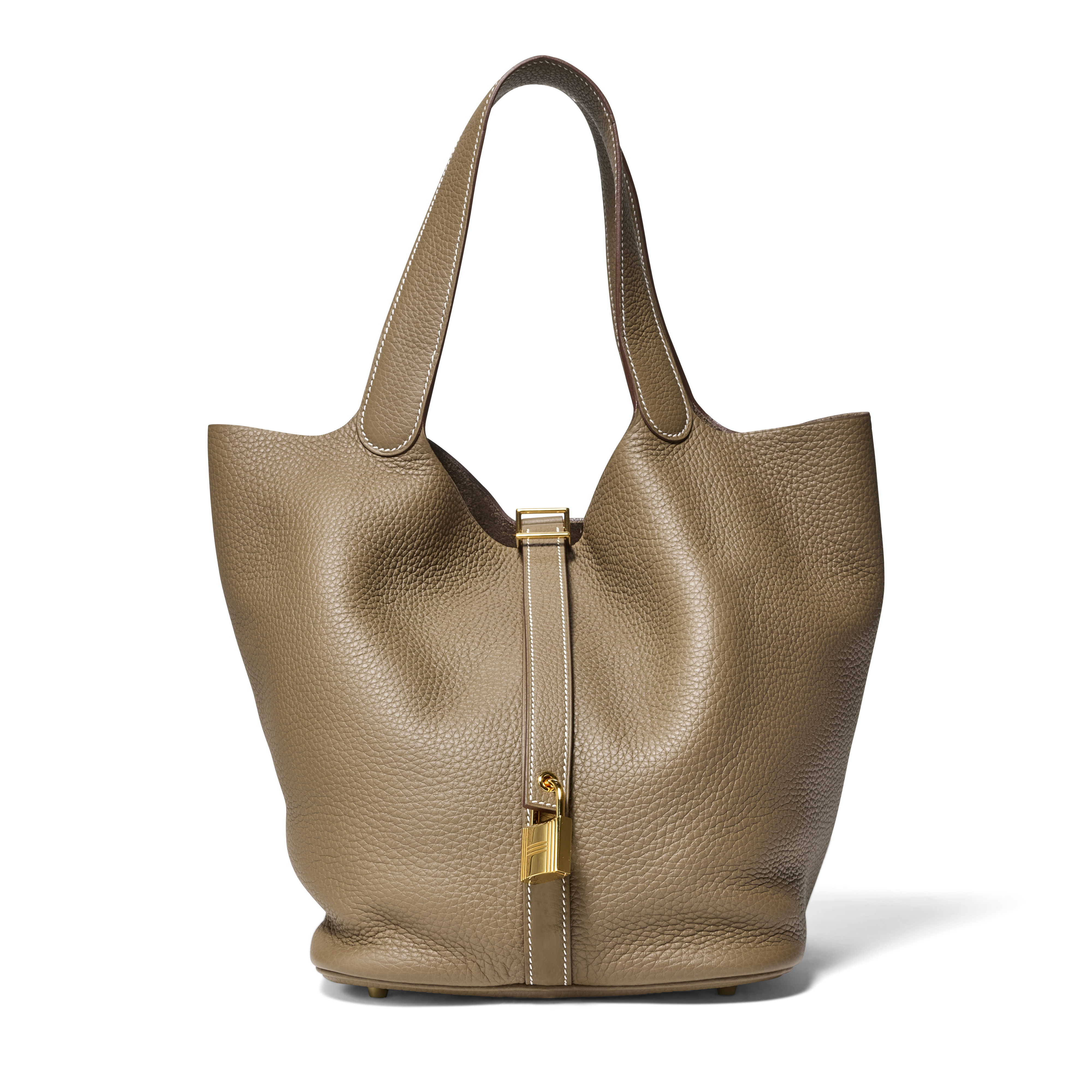 The Hermès Etoupe Clémence Leather Picotin Lock 26 is an elegant expression of the Maison’s understated luxury. Crafted from Clémence leather and accented with gold hardware, it showcases the Picotin’s signature minimalist silhouette and effortless charm, in one of the most beloved colorways. The spacious 26 cm size offers refined practicality, making it an ideal everyday companion.