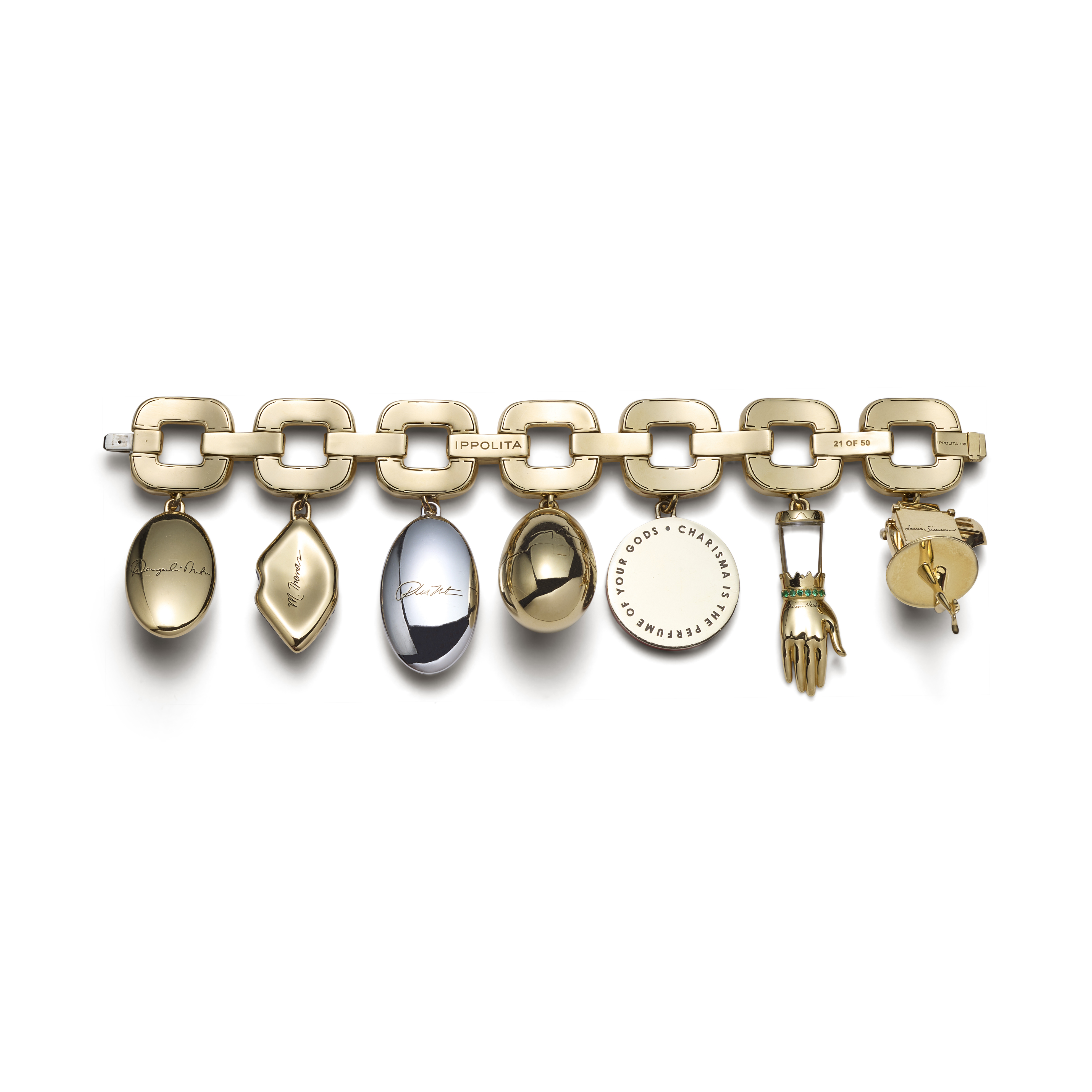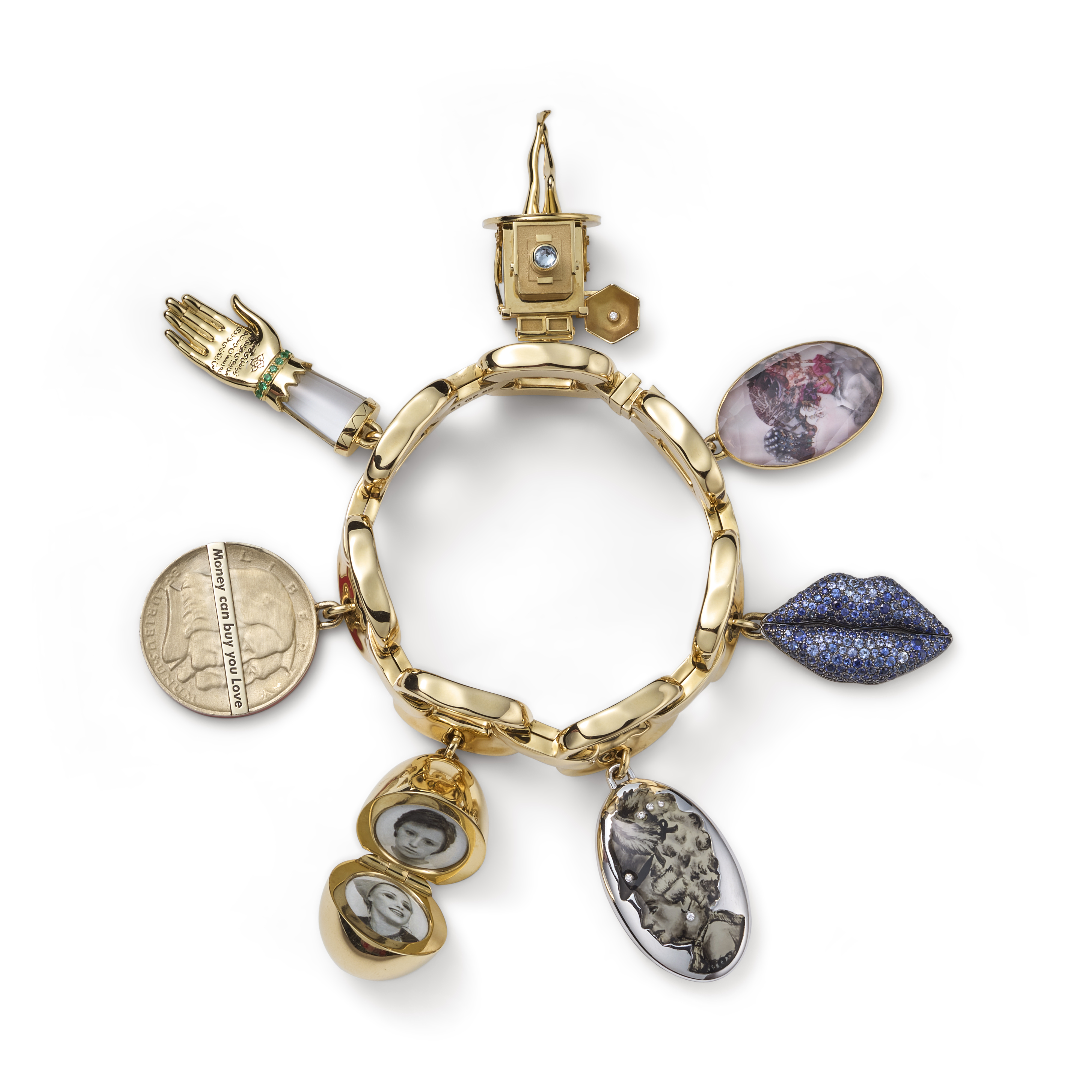 This exceptional “Charmed” bracelet unites fine jewelry with contemporary art through a rare collaboration conceived by Ippolita Rostagno and Liz Swig. Crafted in richly polished 18K gold, the openwork square-link bracelet suspends seven unique charms, each designed by a celebrated artist: Laurie Simmons, Shirin Neshat, Barbara Kruger, Cindy Sherman, Rachel Feinstein, Mickalene Thomas, and Wangechi Mutu. Their individual visions are expressed through sculptural forms and gem-set details, transforming the bracelet into a wearable collection of modern art. Created in 2016 in a strictly limited edition, this example is marked number 21 of 50.