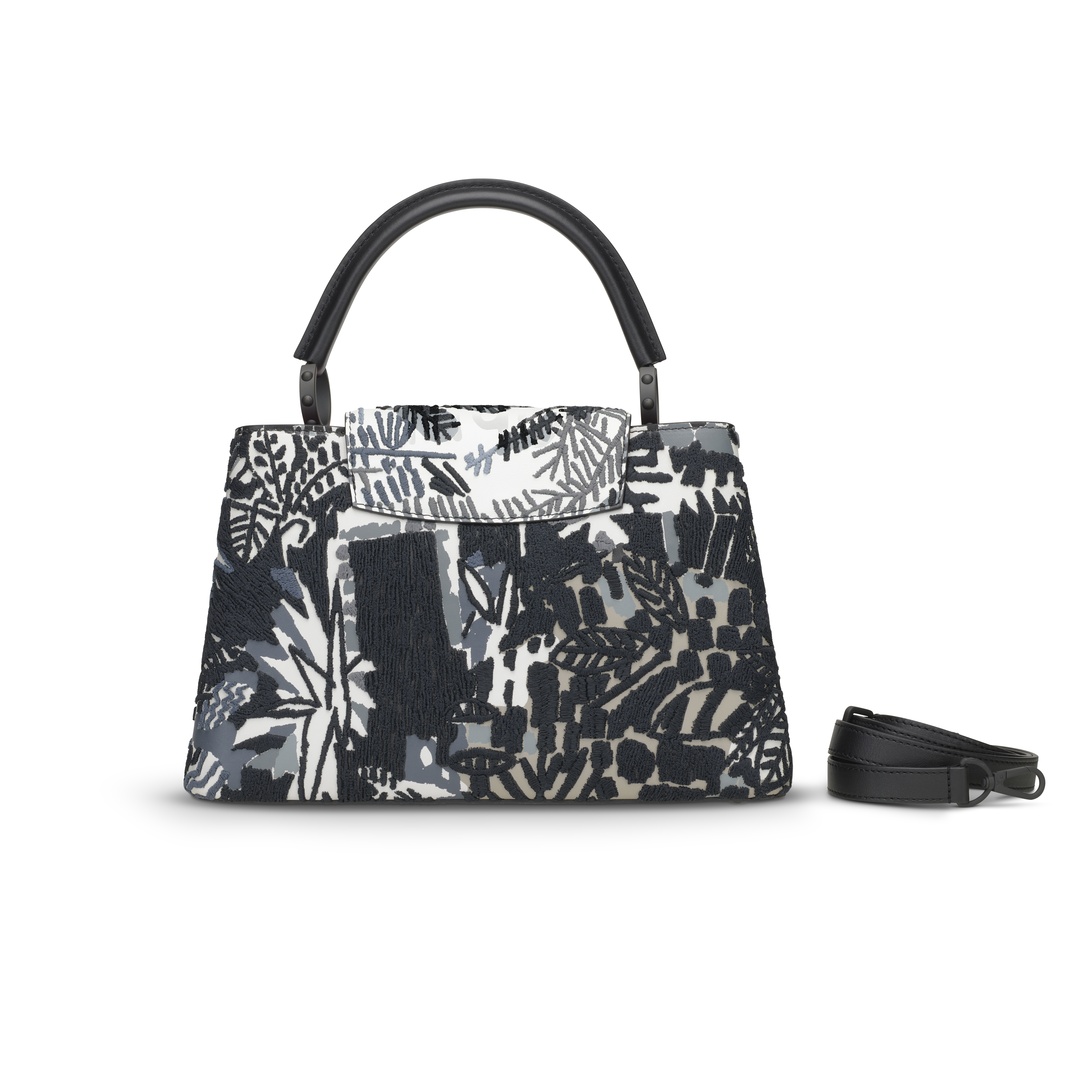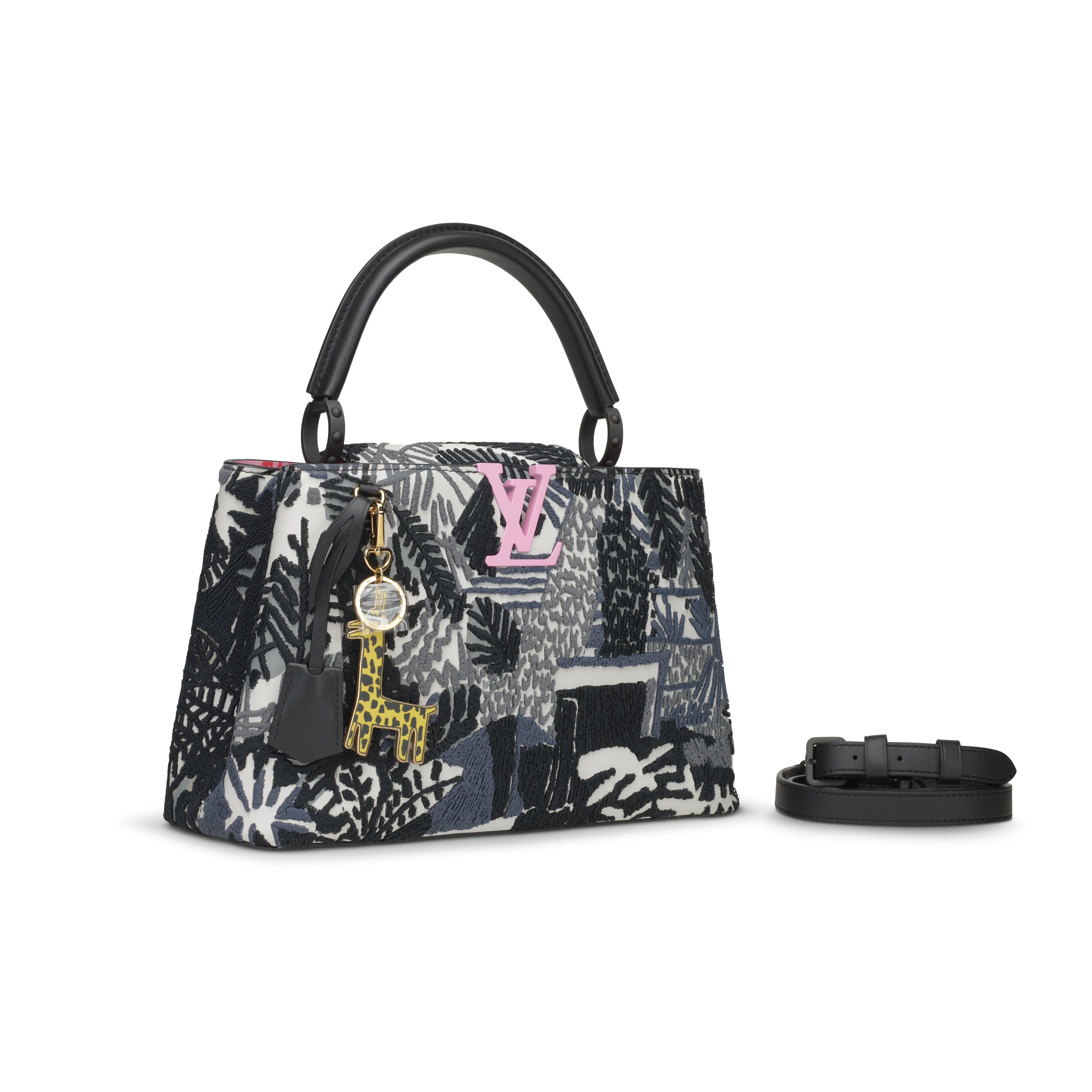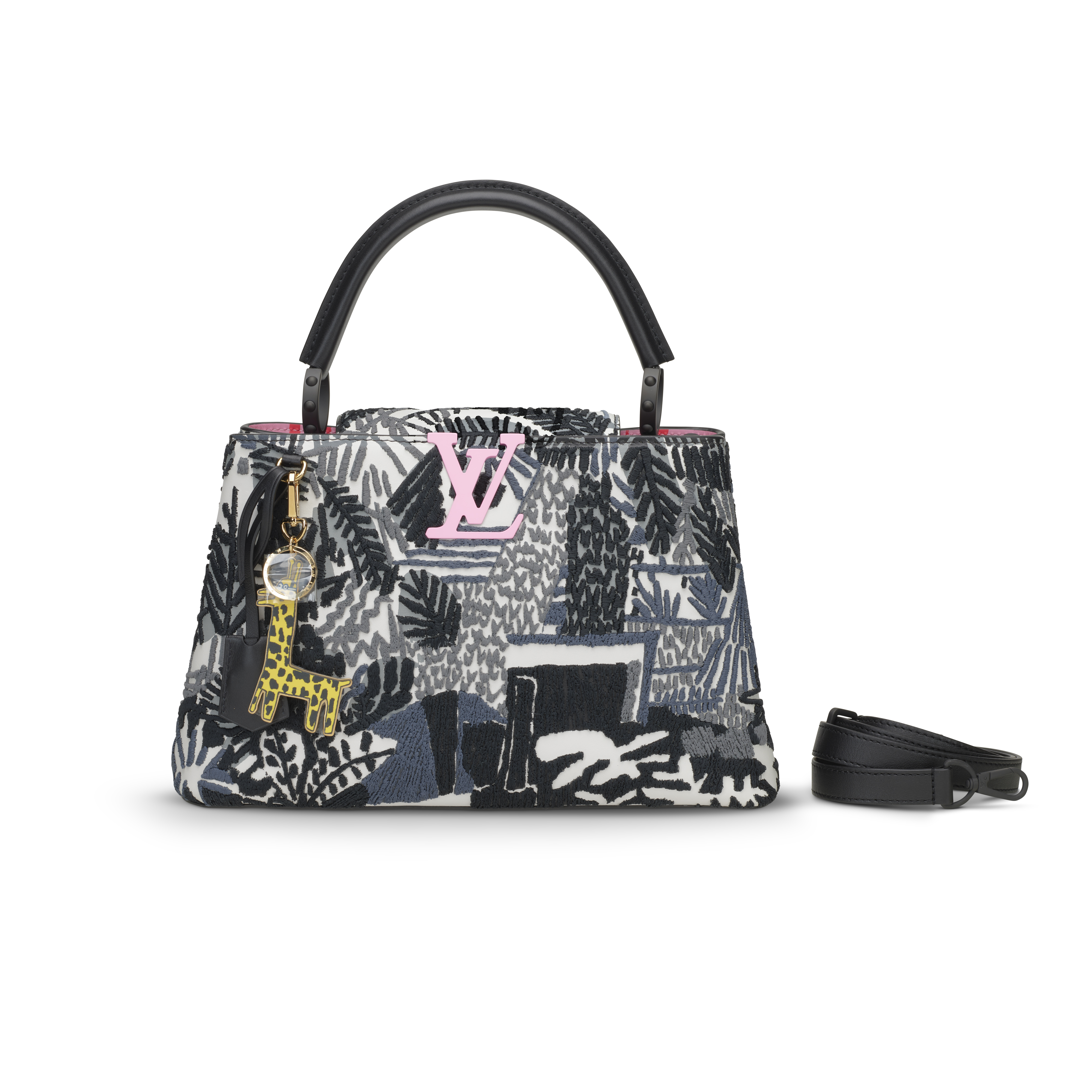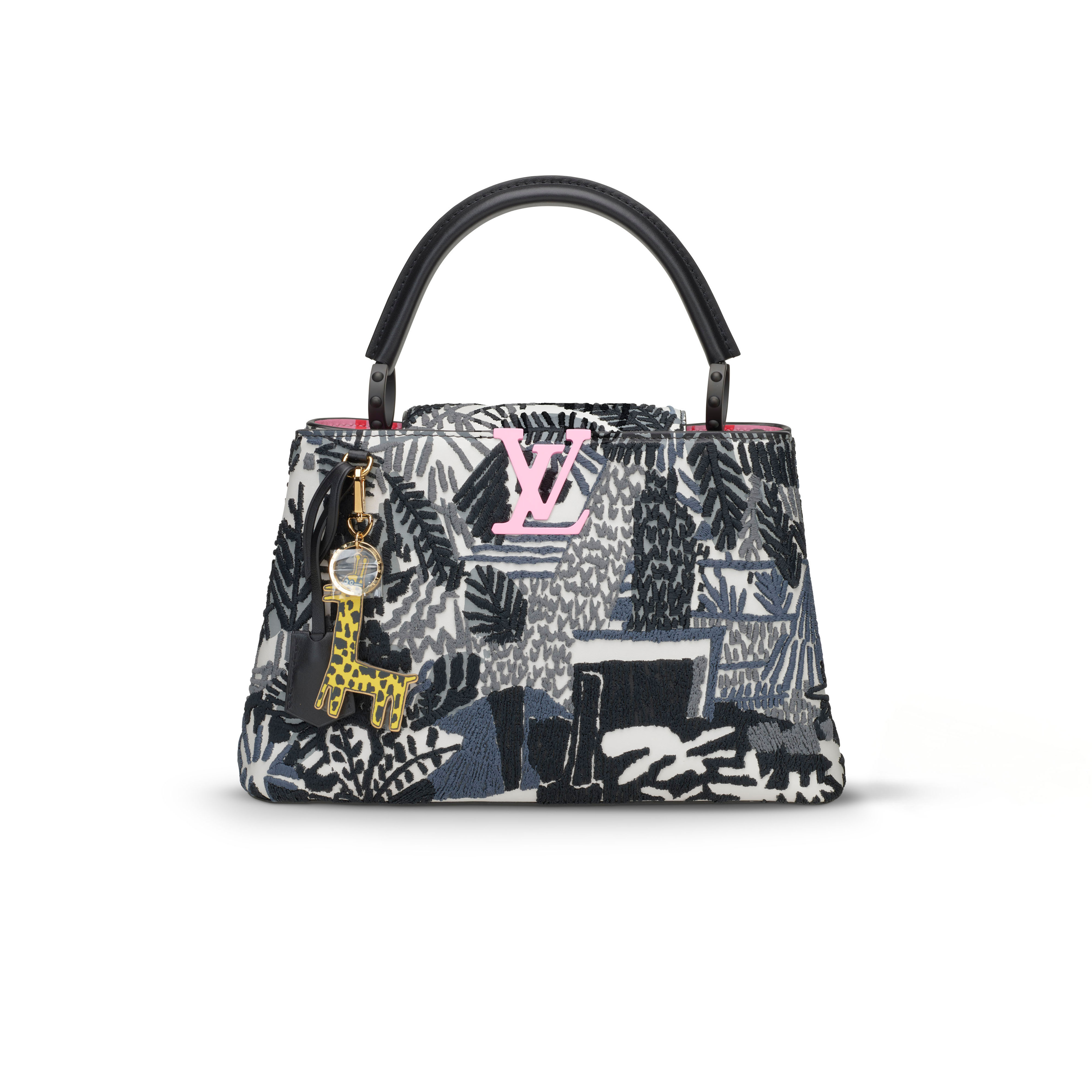 This striking ArtyCapucines PM from the Louis Vuitton x Jonas Wood collaboration transforms the Maison’s iconic silhouette into a vivid, tactile artwork. Presented in a bold black-and-white palette, the bag features Wood’s signature botanical and vegetal motifs rendered through a meticulous combination of printed leather and richly textured embroidery, creating a dynamic, layered surface. A contrasting pink LV closure adds a playful pop of color, echoed within the bag’s bright pink interior, which is thoughtfully divided into two compartments for refined organization. Finishing the piece is a gold-toned zebra charm drawn from Wood’s graphic universe and offering an additional touch of whimsy. A masterful blend of craftsmanship and contemporary art, this limited edition bag stands as one of the most imaginative interpretations in the ArtyCapucines series.