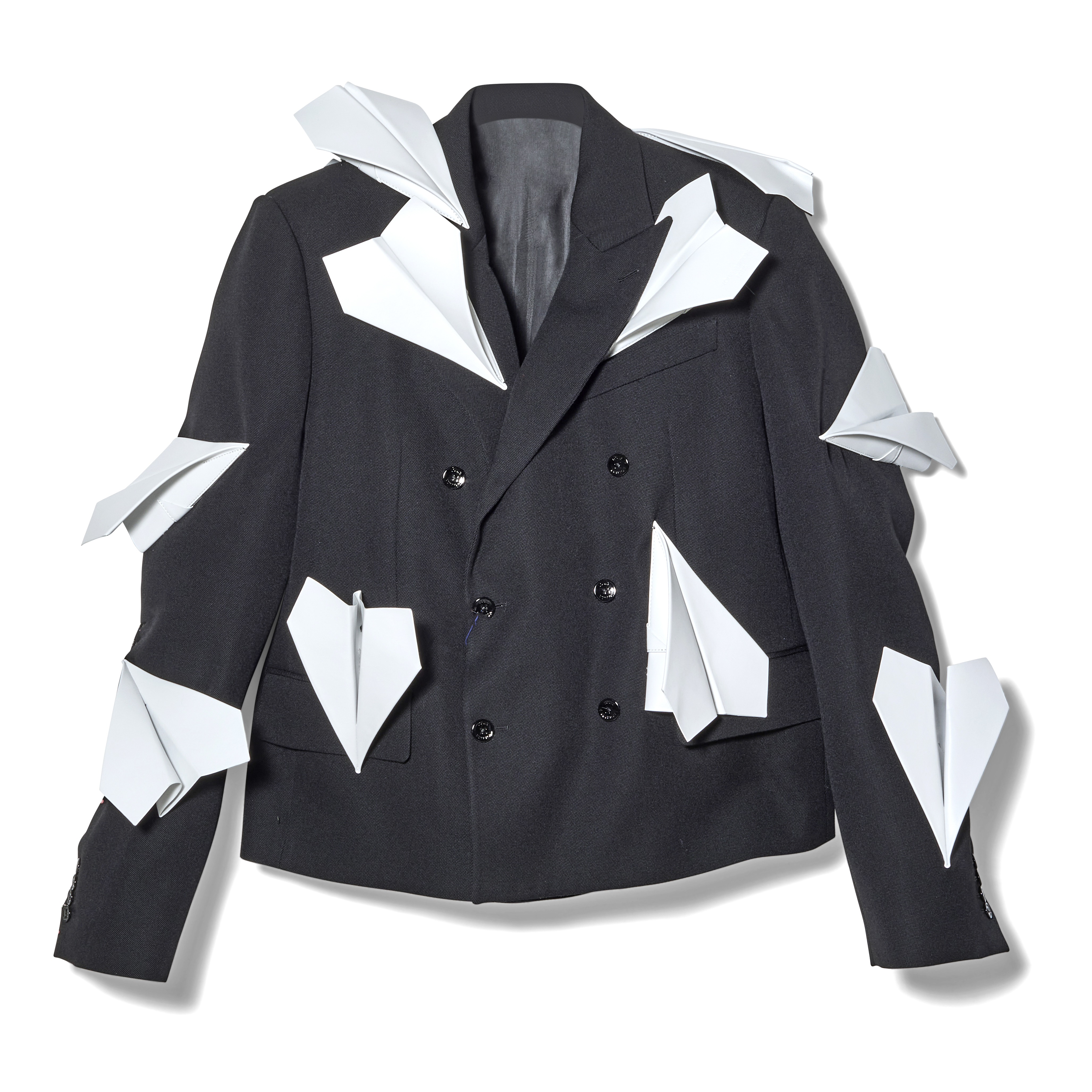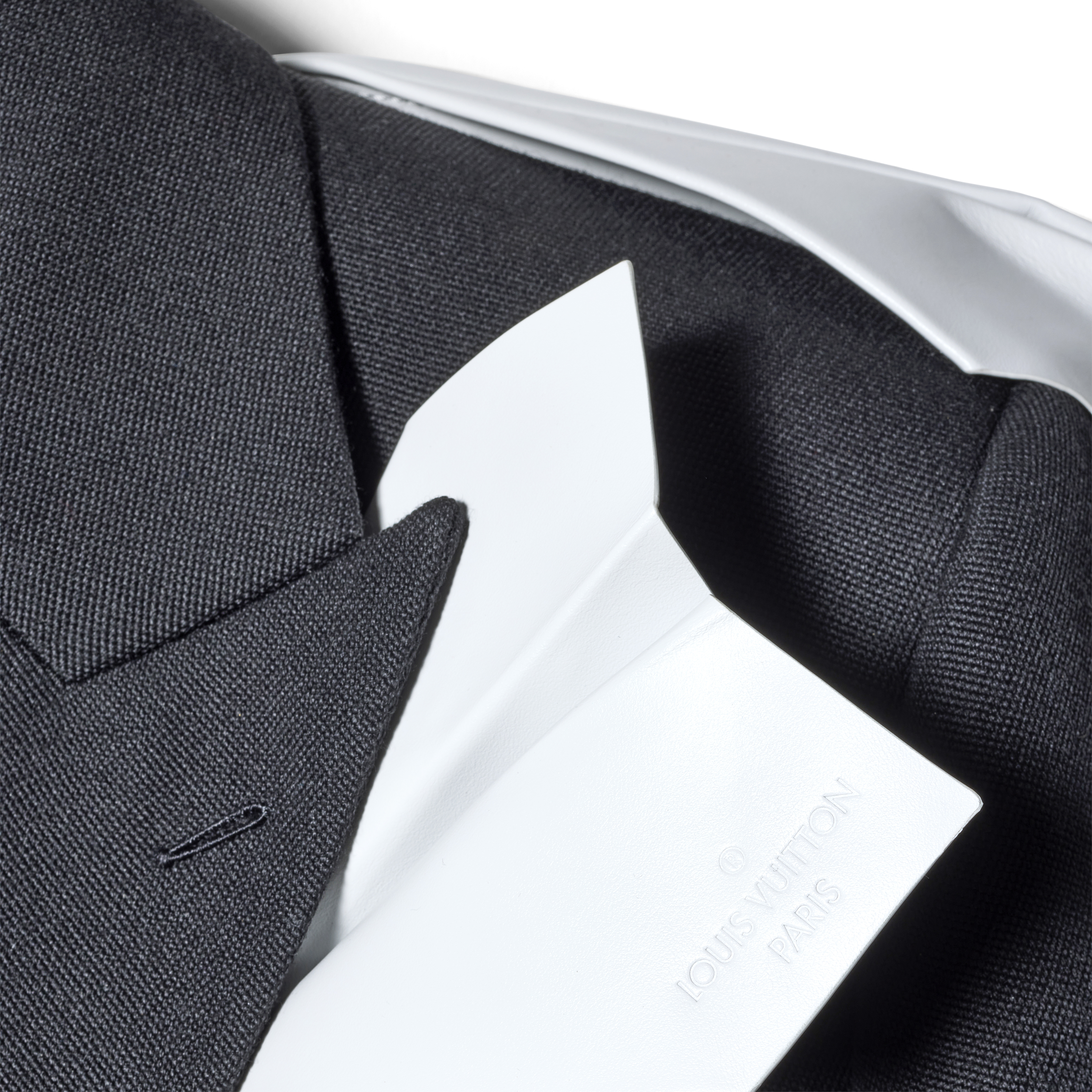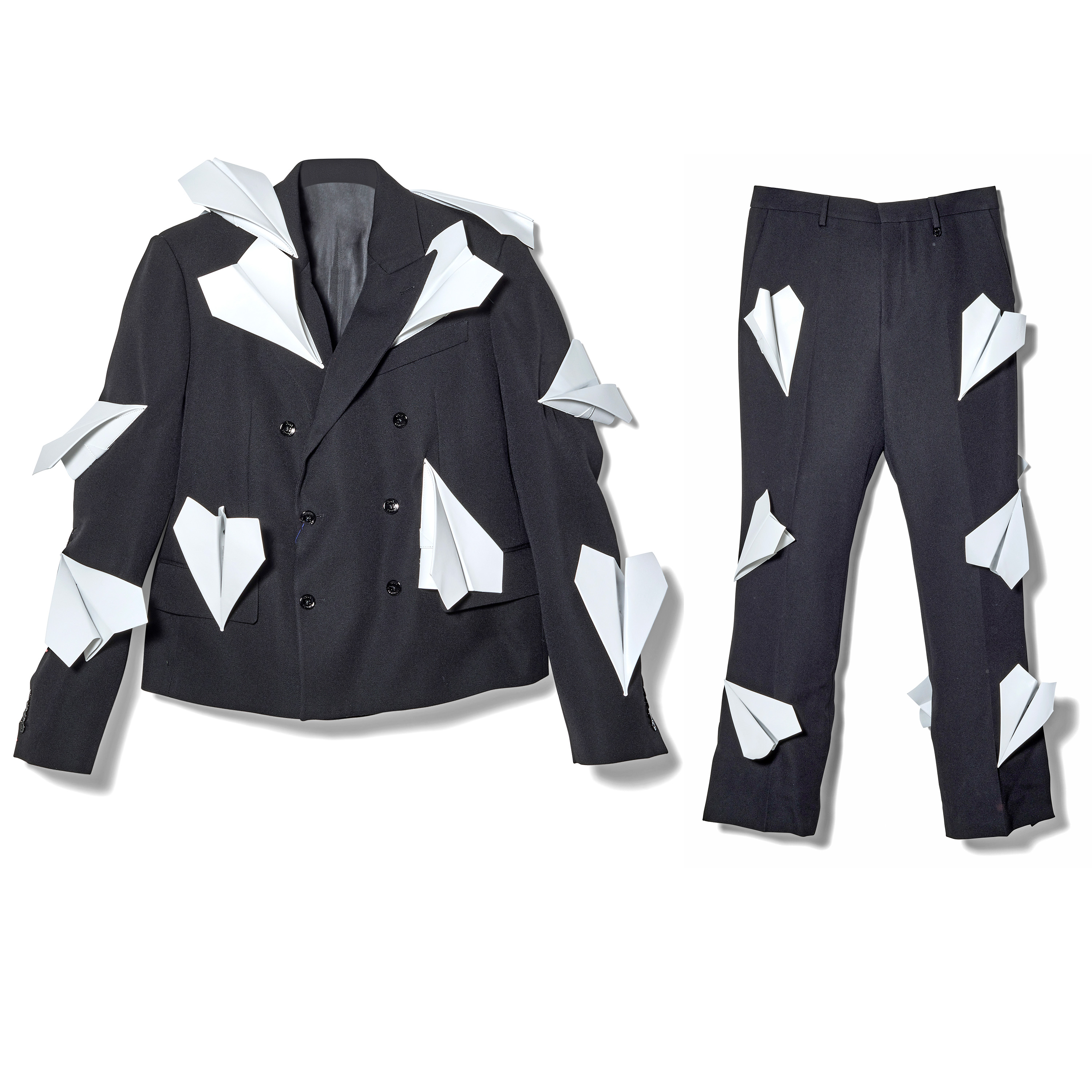 This Louis Vuitton Paper Airplane Double-Breasted Suit is a whimsical and impeccably crafted statement piece from the Spring Summer 2023 collection. Artfully placed across the silhouette are leather paper airplanes exquisitely crafted by hand. The jacket is complete with a cropped cut and refined lapel collar and pairs effortlessly with the matching trousers which are tailored with a clean, elongated silhouette. The precise construction ensures a polished, tailored fit. Originally available exclusively through custom order, this suit exemplifies the Maison’s blend of boundary-pushing imagination and haute craftsmanship.