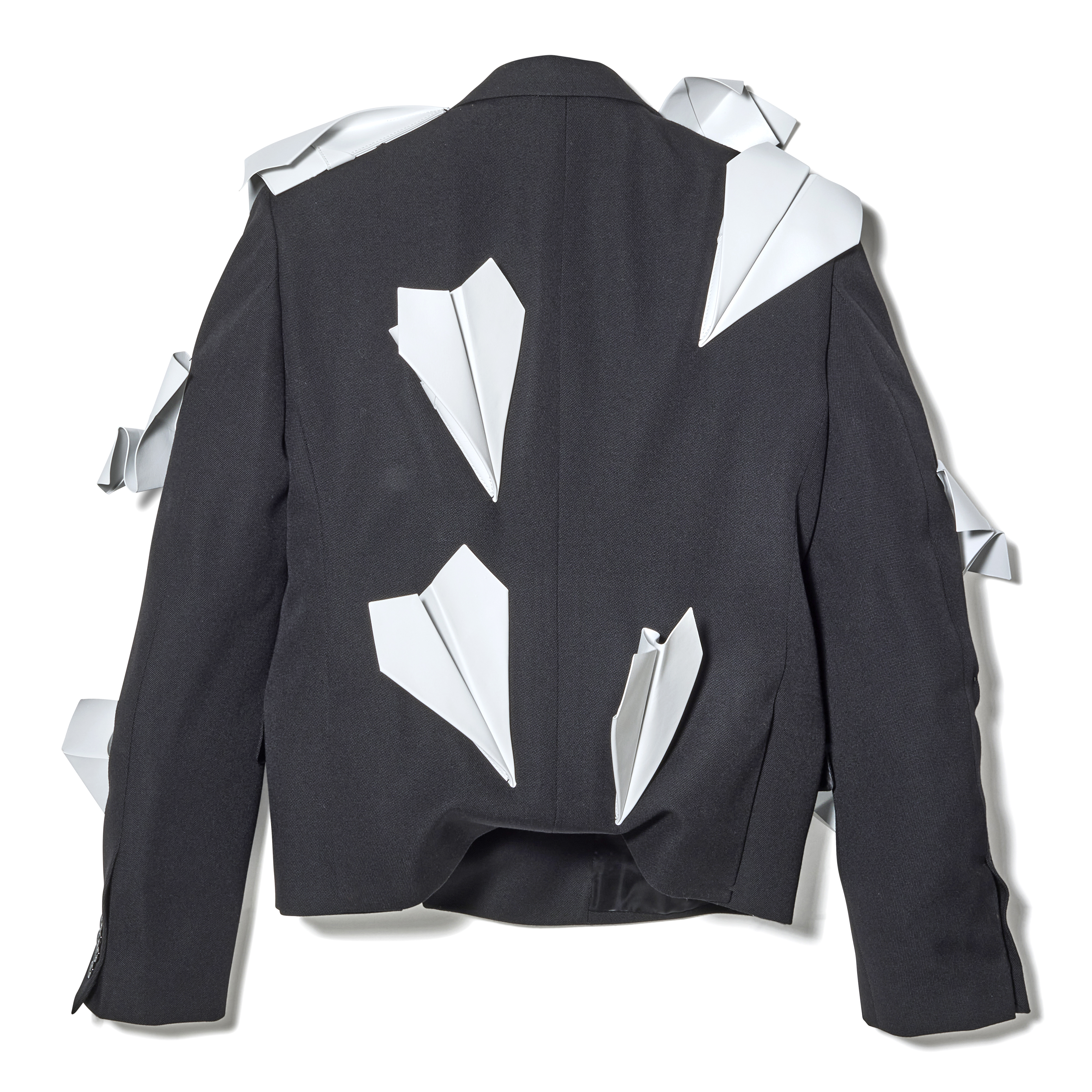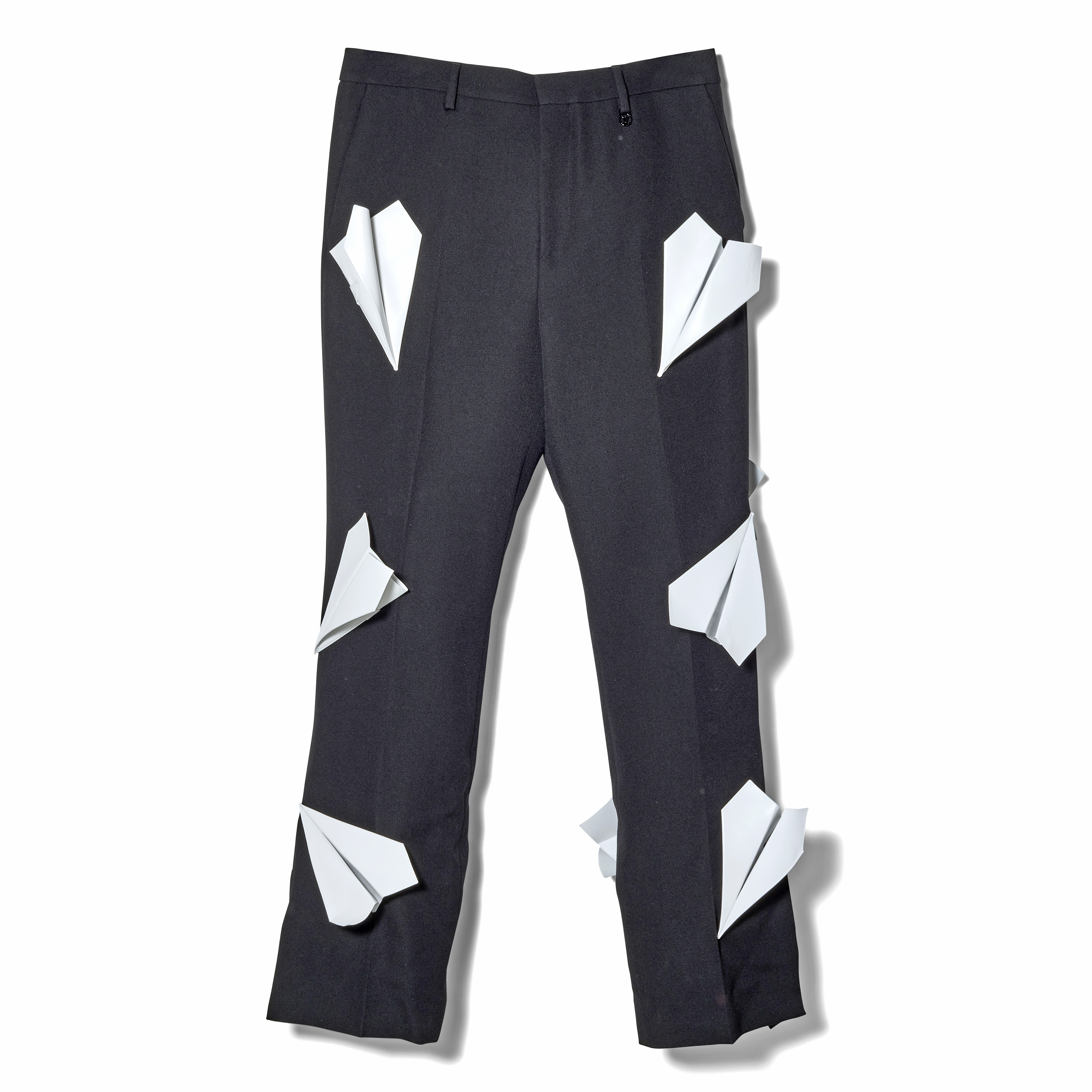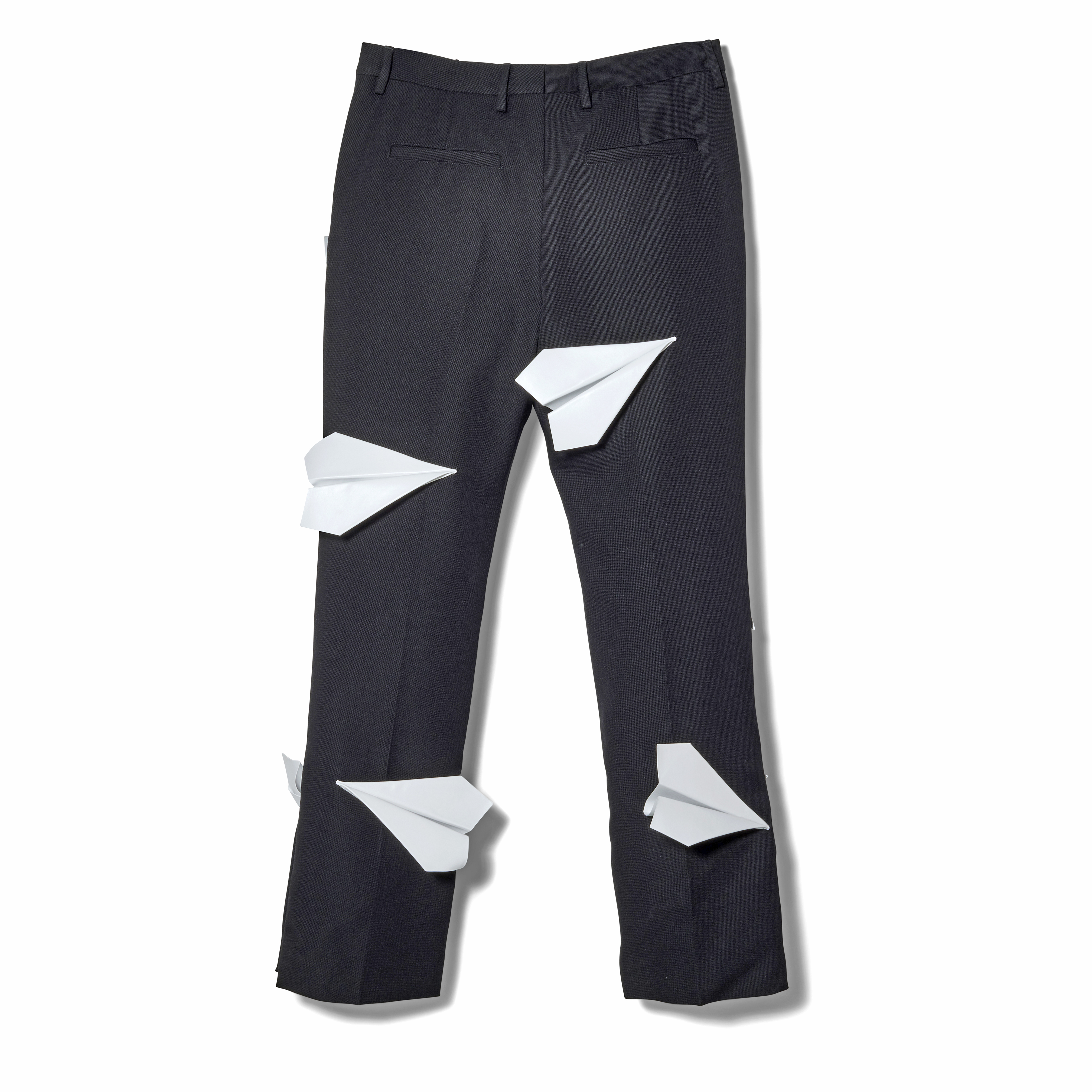 This Louis Vuitton Paper Airplane Double-Breasted Suit is a whimsical and impeccably crafted statement piece from the Spring Summer 2023 collection. Artfully placed across the silhouette are leather paper airplanes exquisitely crafted by hand. The jacket is complete with a cropped cut and refined lapel collar and pairs effortlessly with the matching trousers which are tailored with a clean, elongated silhouette. The precise construction ensures a polished, tailored fit. Originally available exclusively through custom order, this suit exemplifies the Maison’s blend of boundary-pushing imagination and haute craftsmanship.